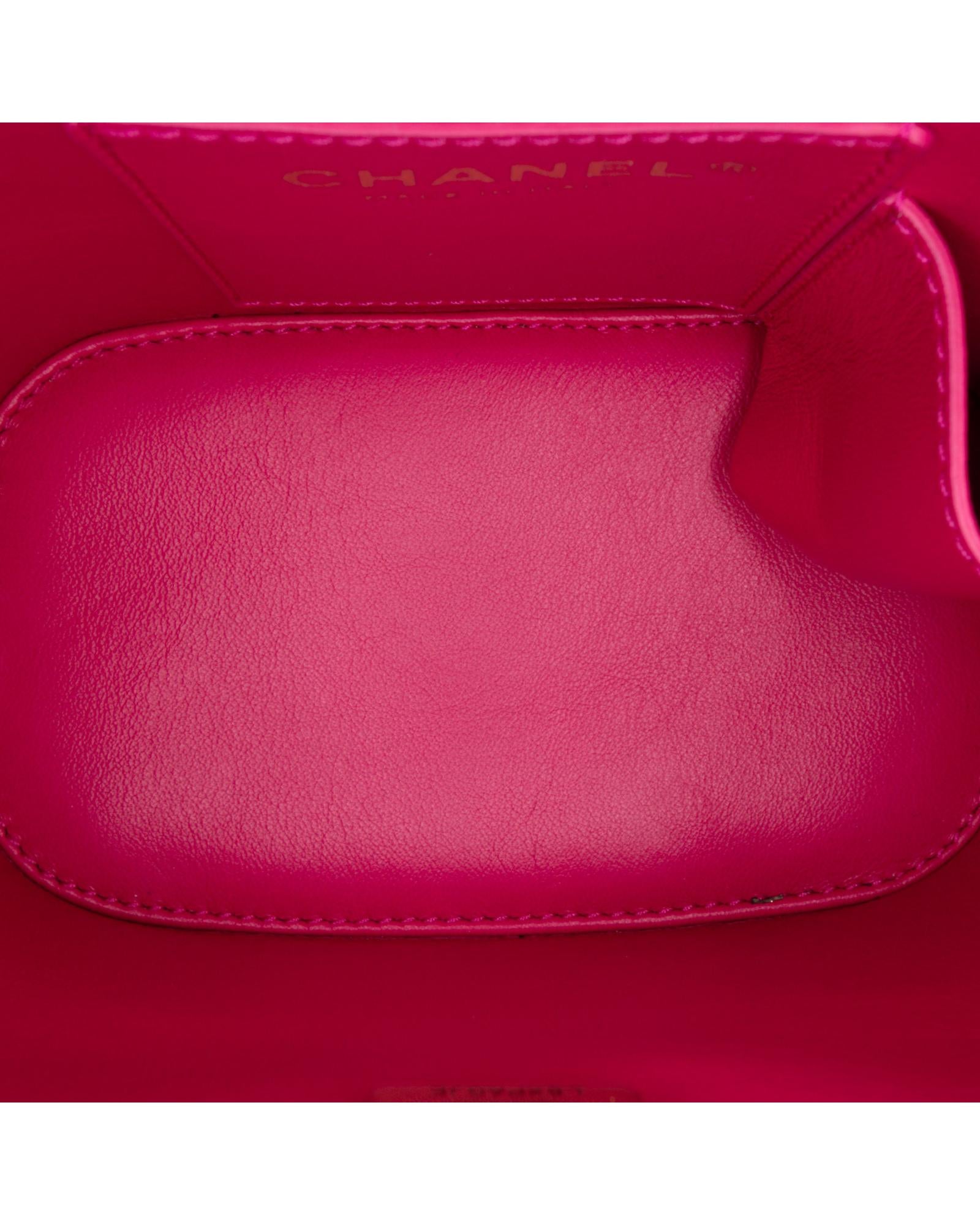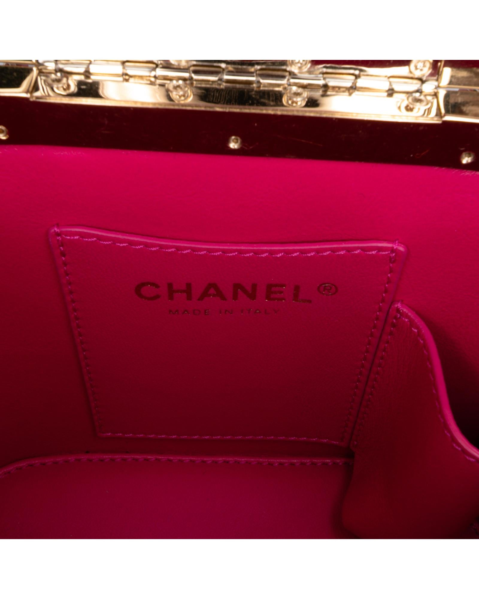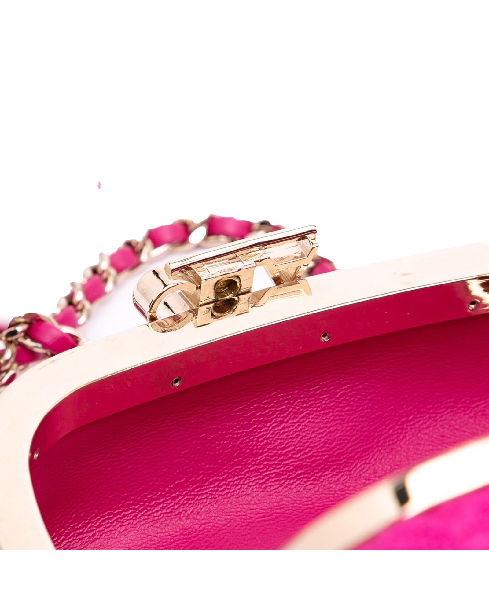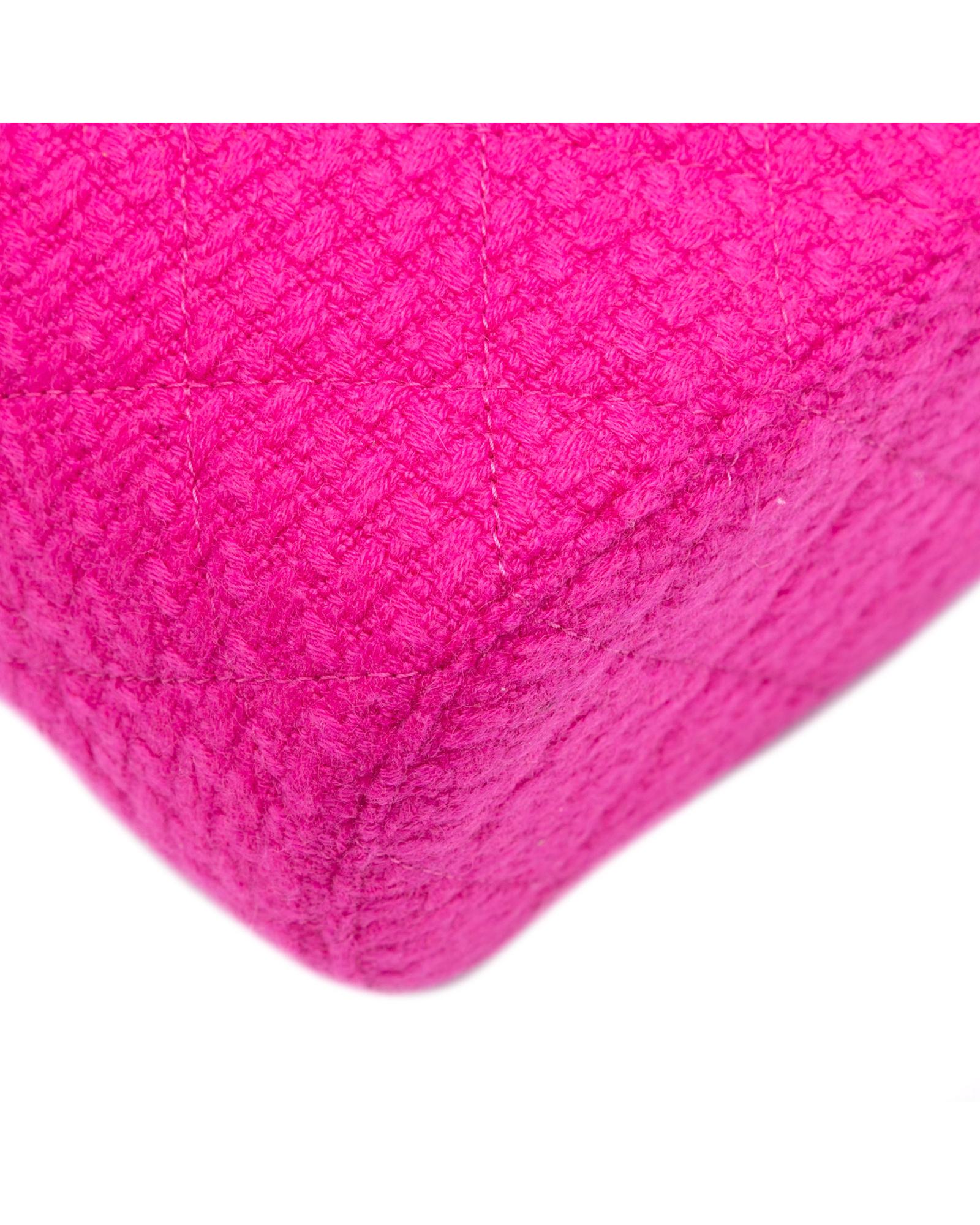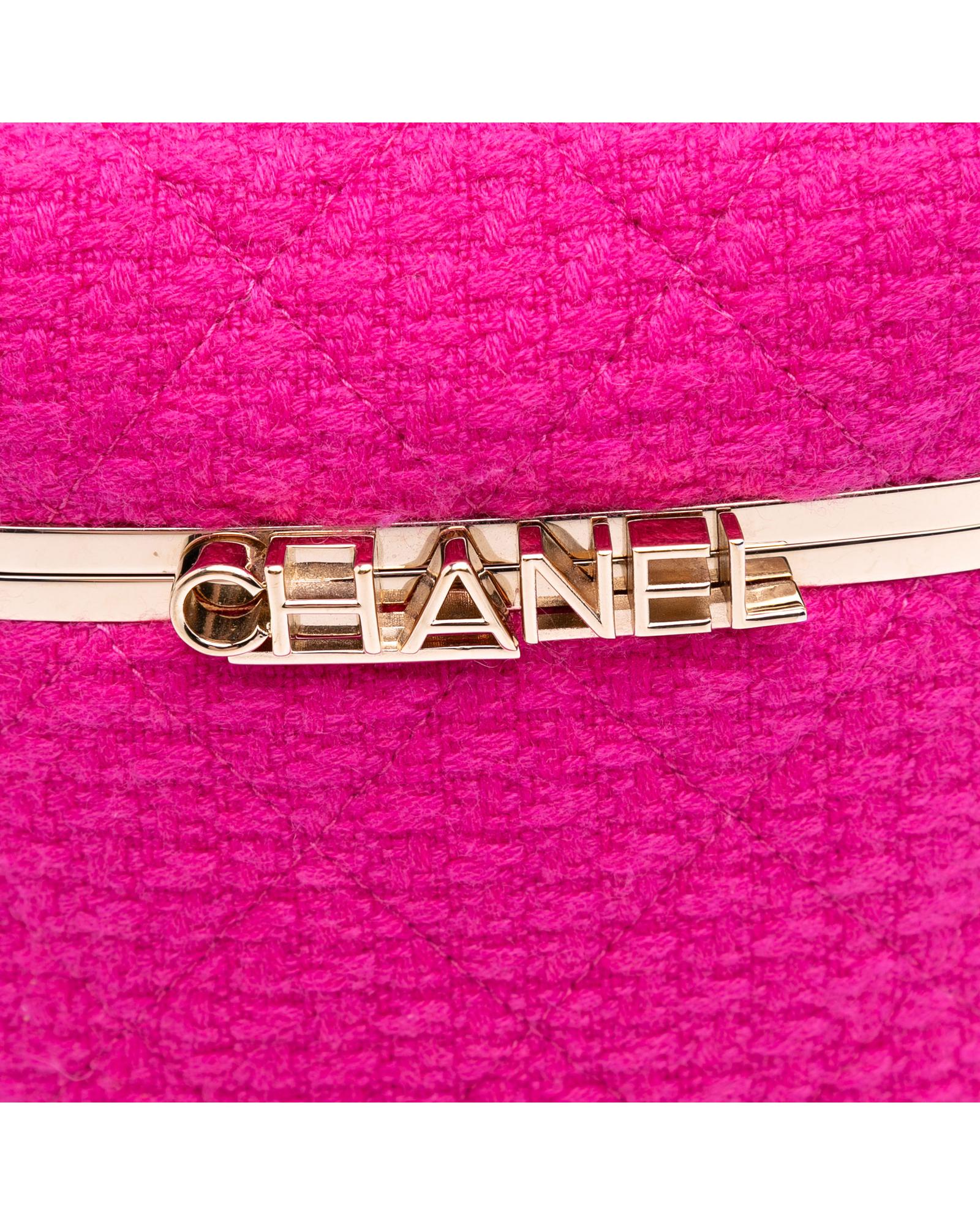 This vanity case features a quilted tweed body with gold tone metal a leather woven chain strap a top flap with push lock closure and interior slip pockets.