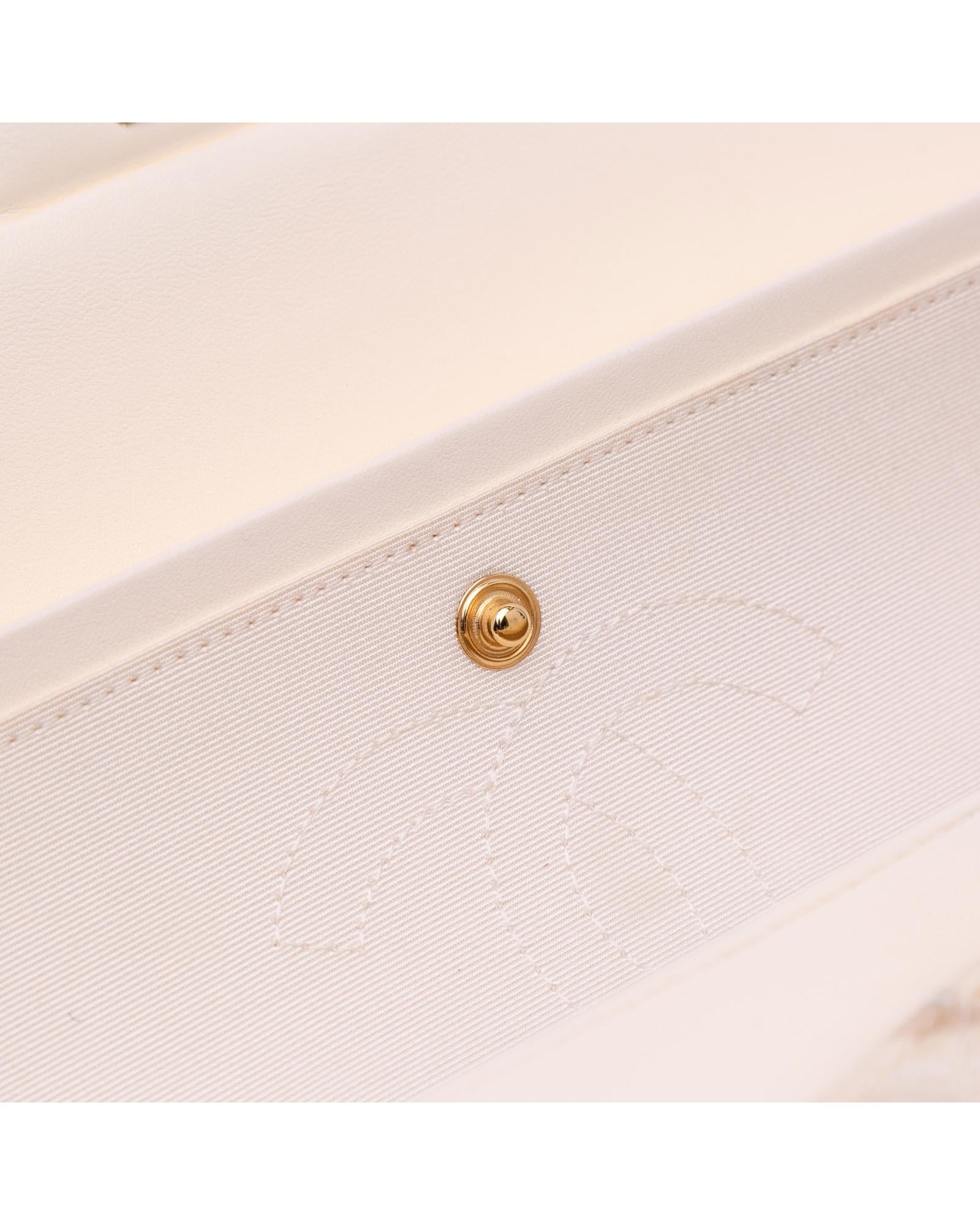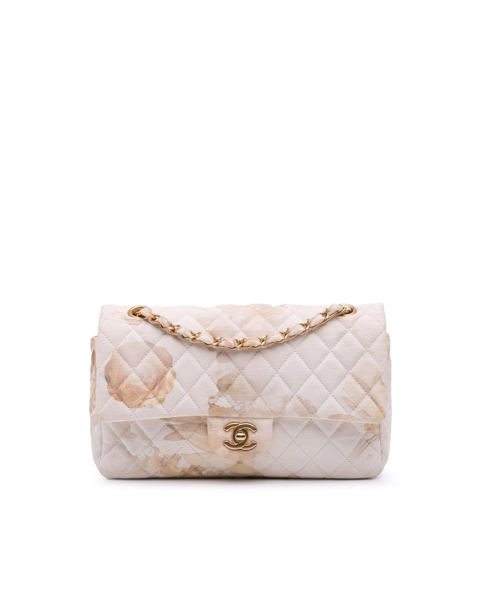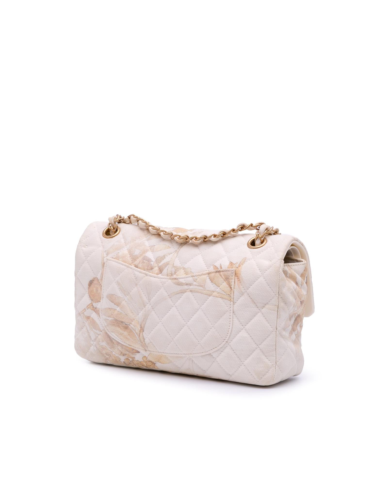 This shoulder bag features a floral printed denim body leather-woven chain shoulder straps double flaps with CC turn-lock closure an exterior back slip pocket and interior zip and slip pockets.Brand: Chanel Vintage