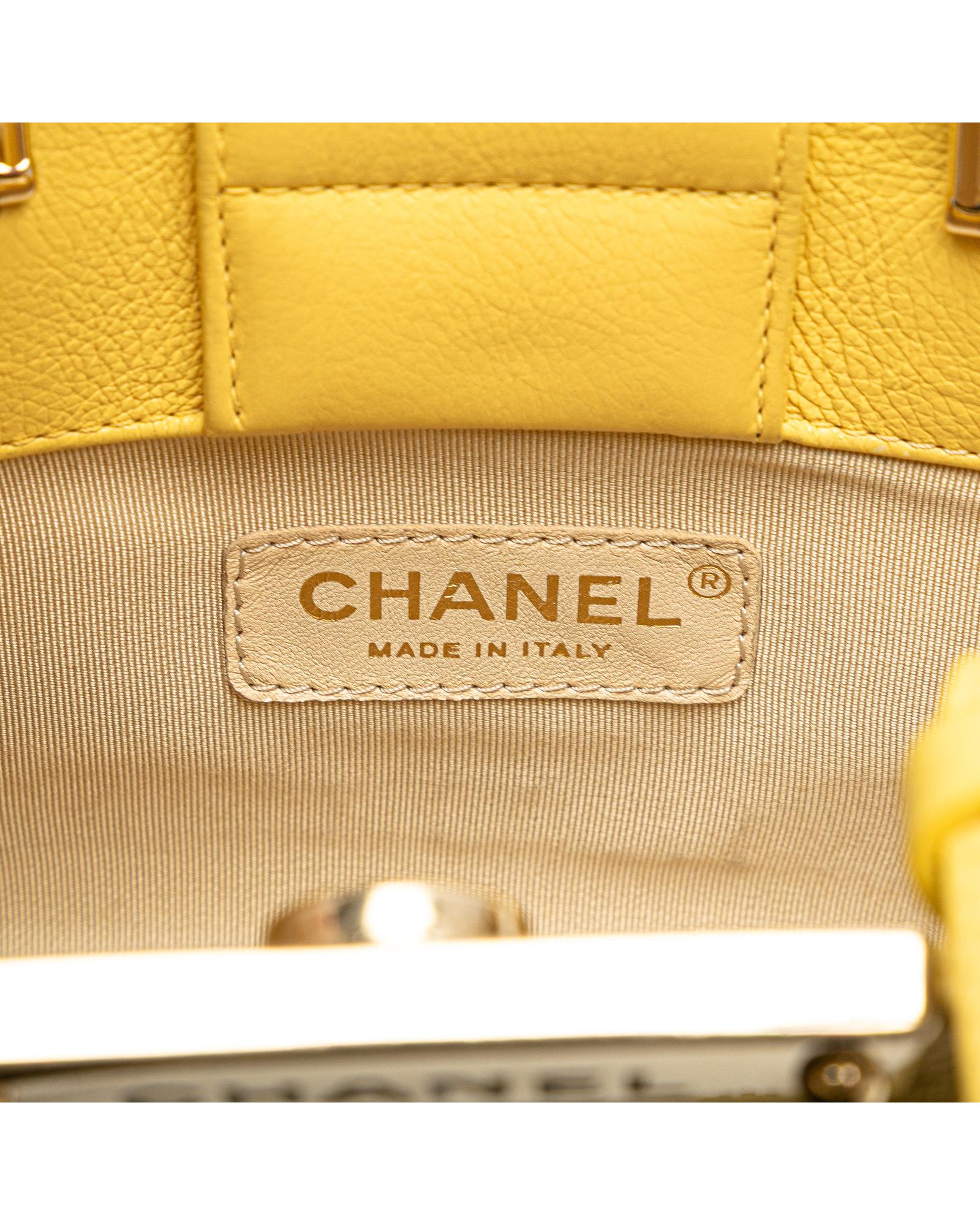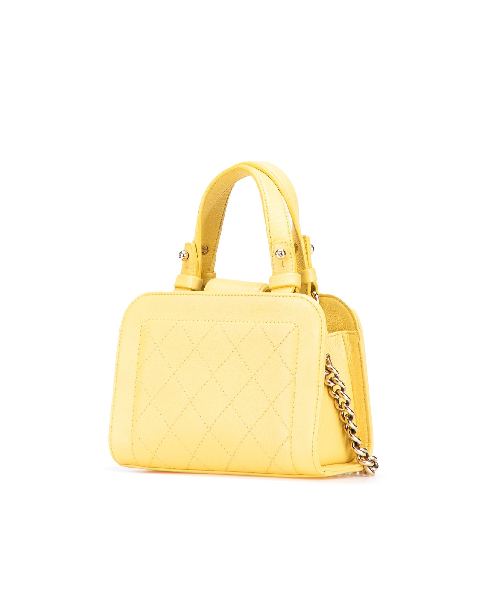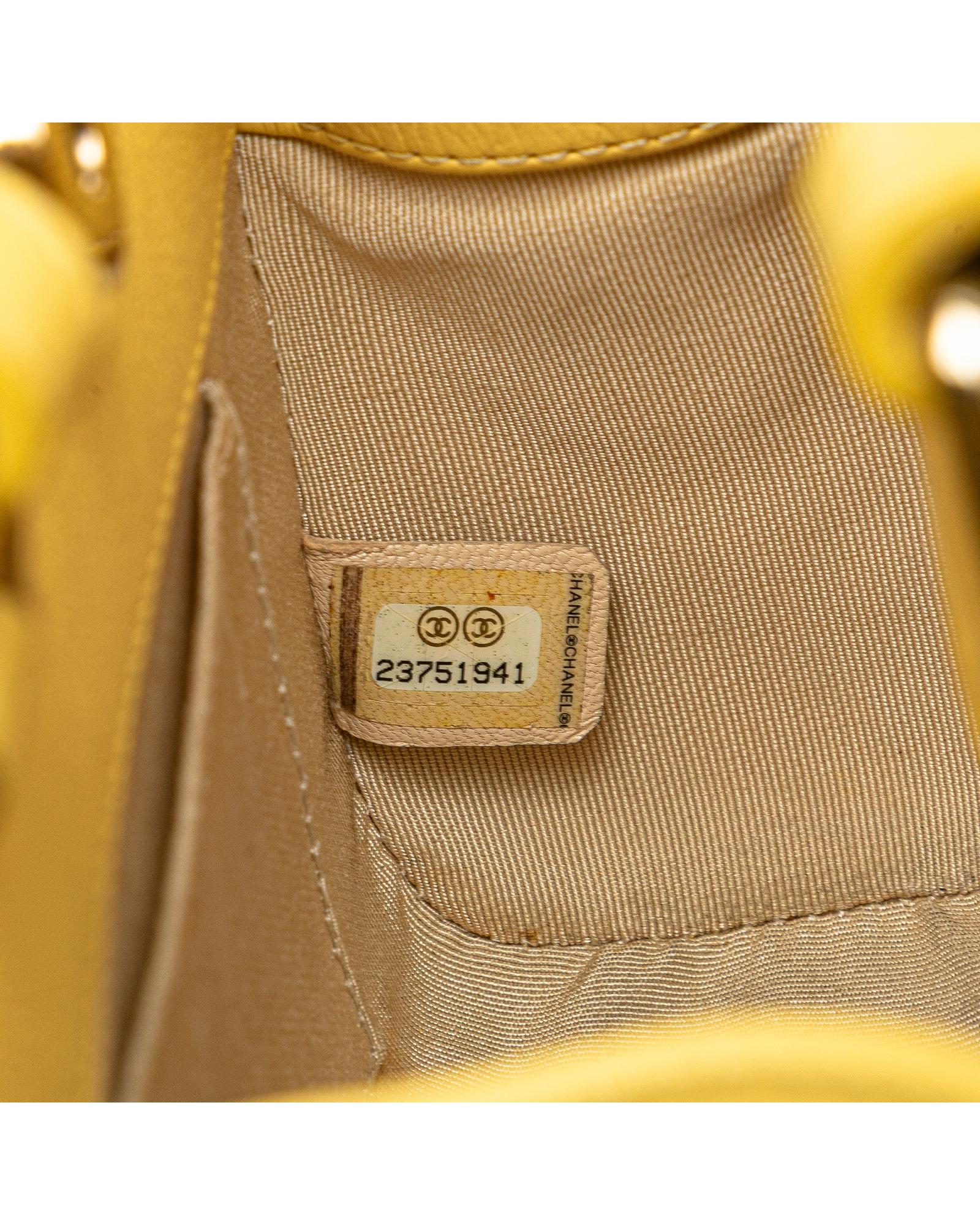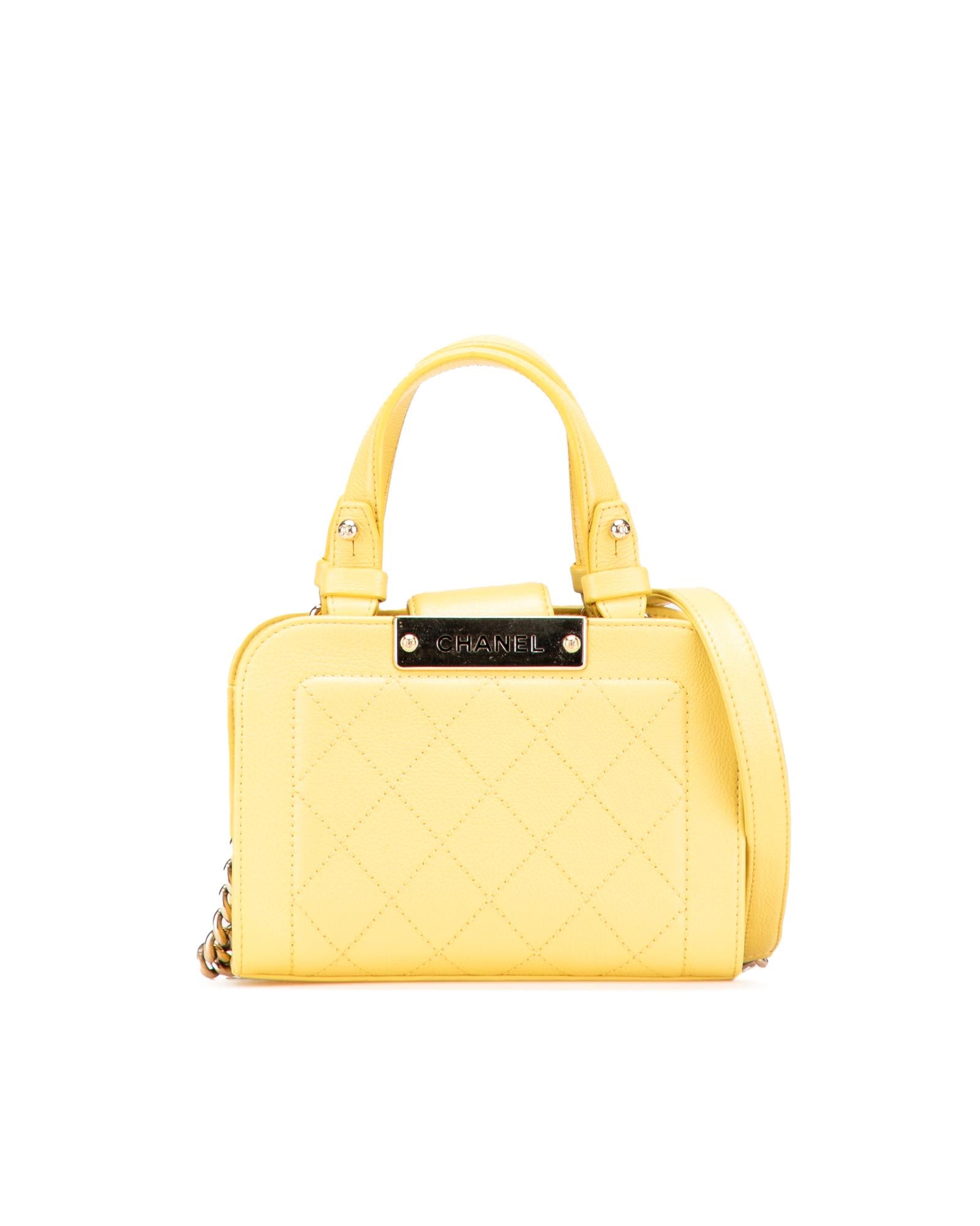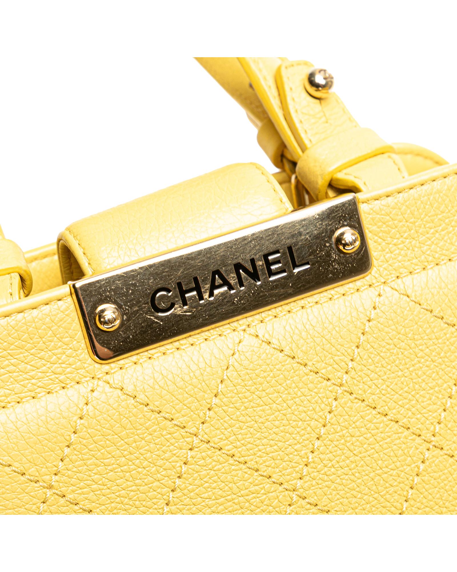 This satchel features a quilted calfskin leather body flat leather handles a chain link shoulder strap with leather shoulder guard an open top with strap and magnetic snap closure and an interior slip pocket.Brand: Chanel Vintage