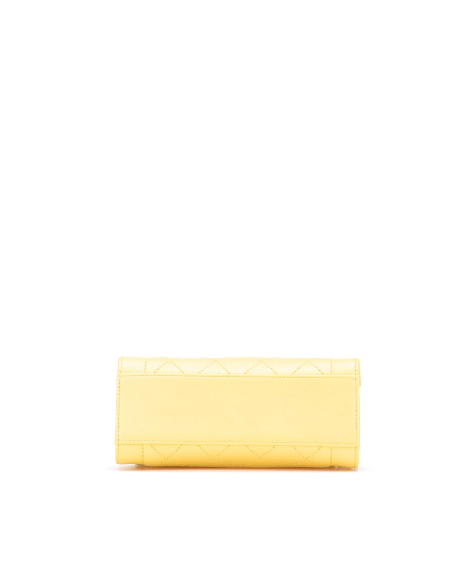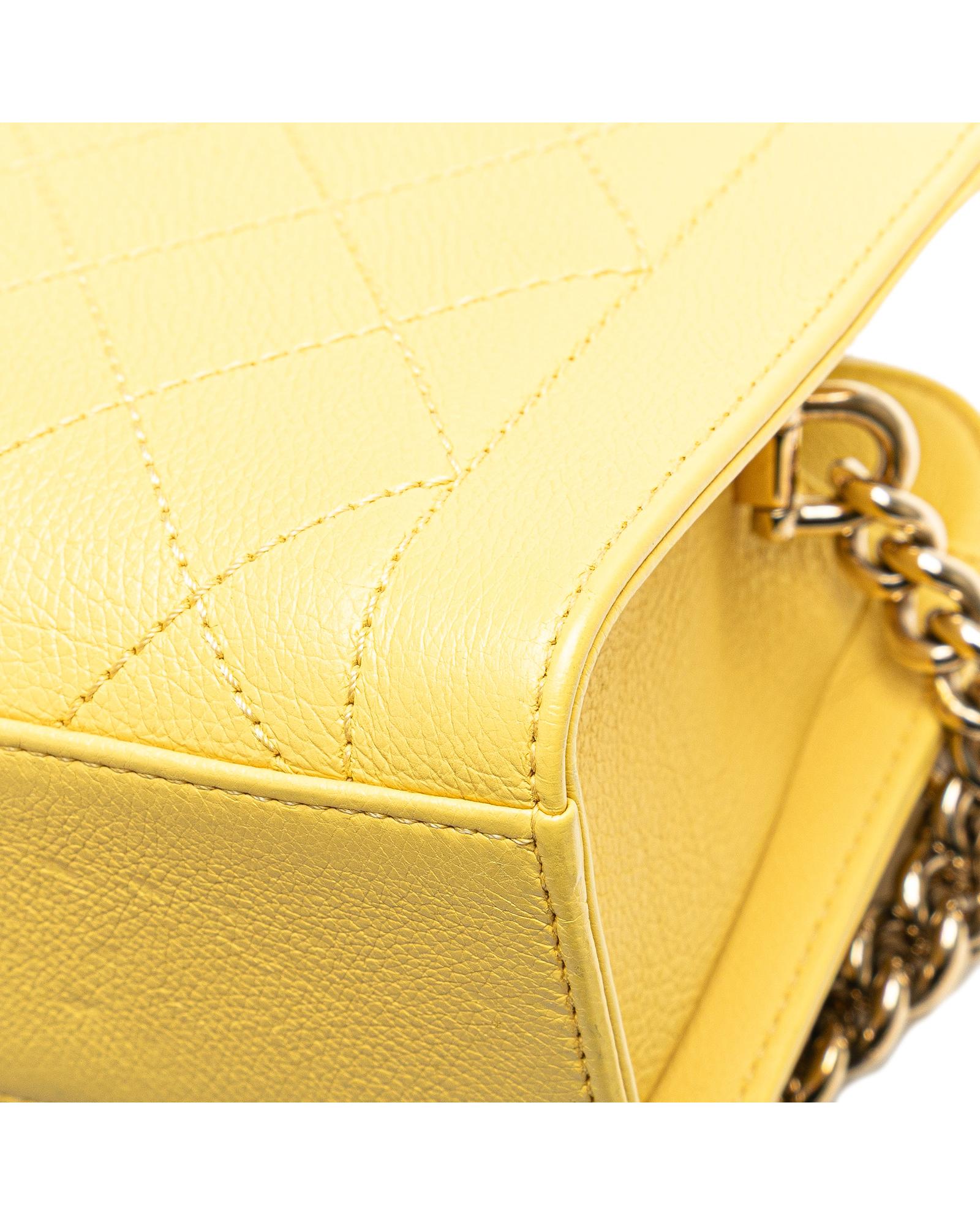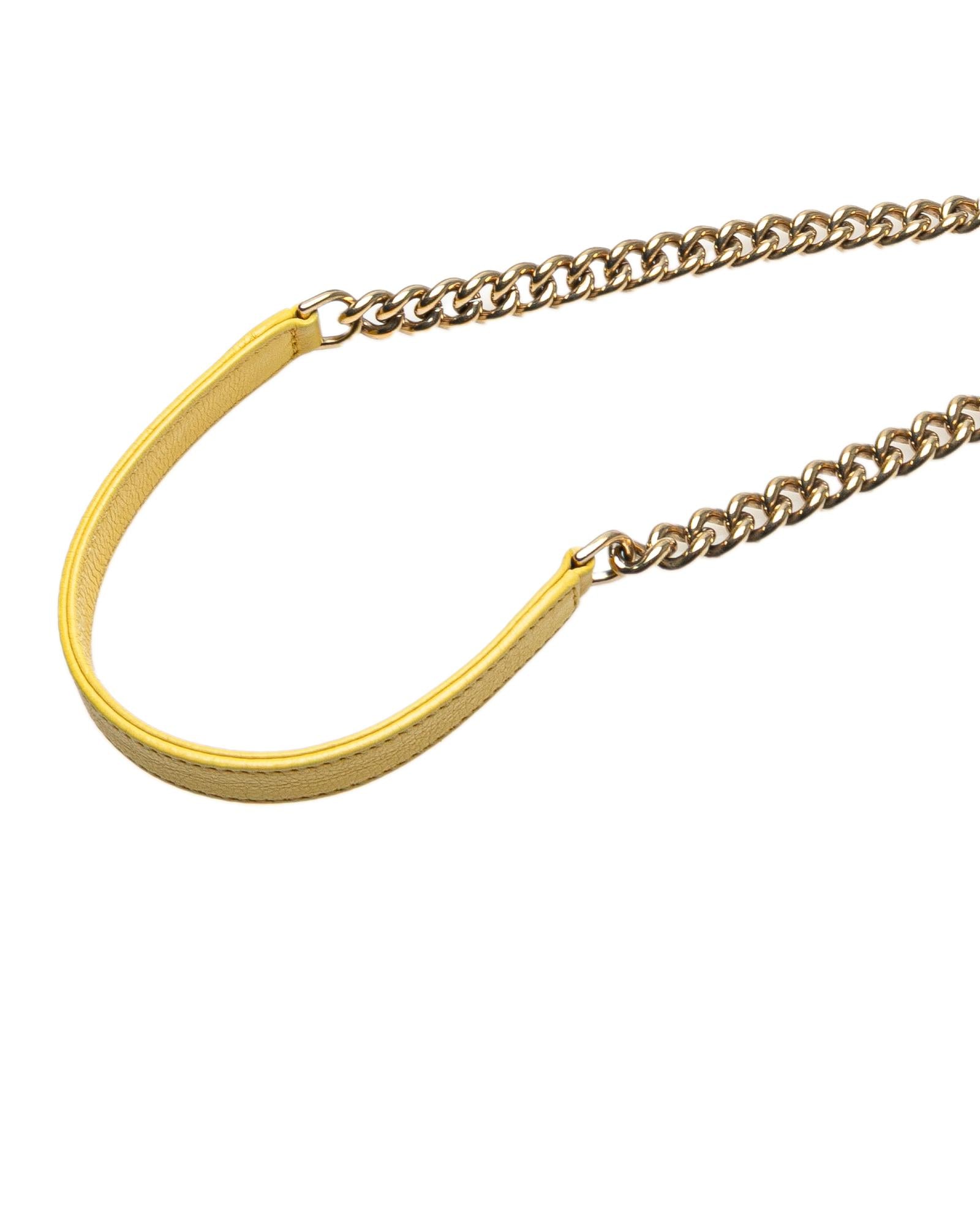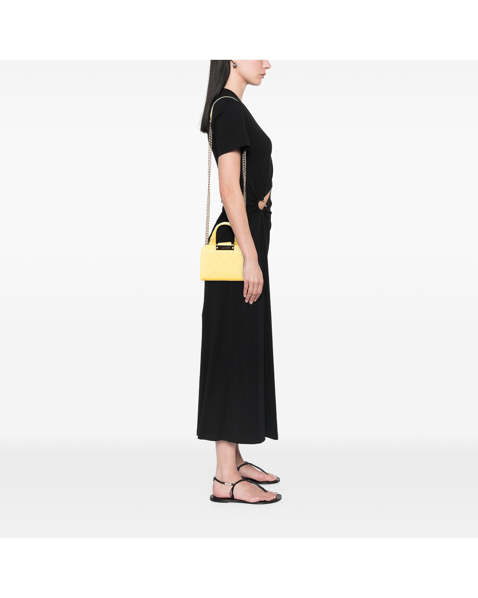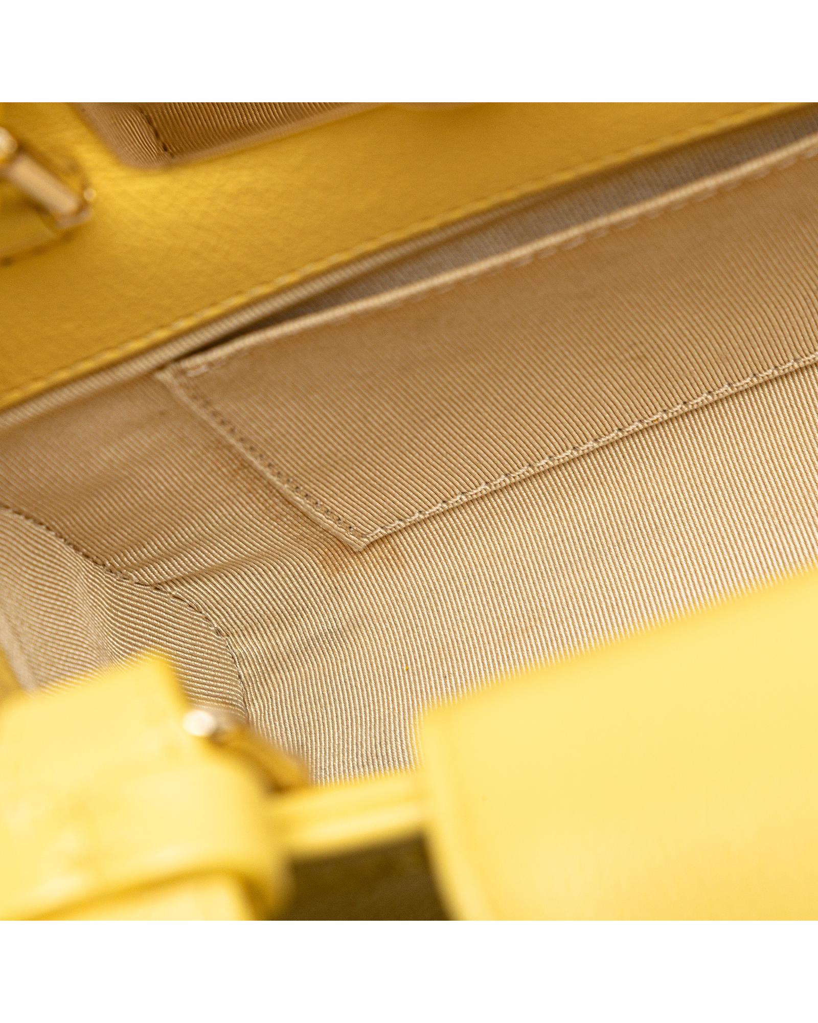 This satchel features a quilted calfskin leather body flat leather handles a chain link shoulder strap with leather shoulder guard an open top with strap and magnetic snap closure and an interior slip pocket.Brand: Chanel Vintage