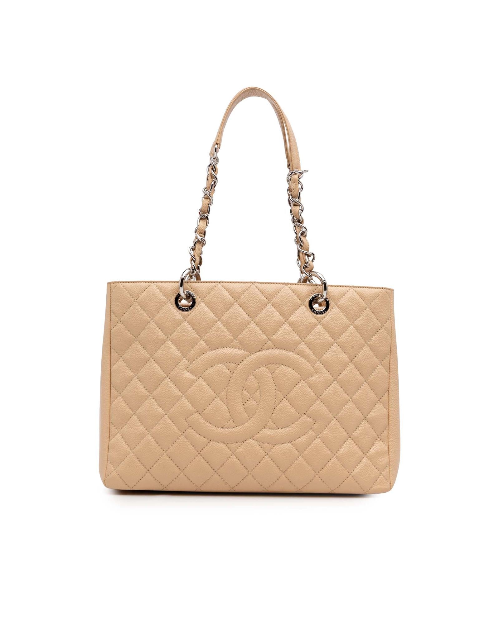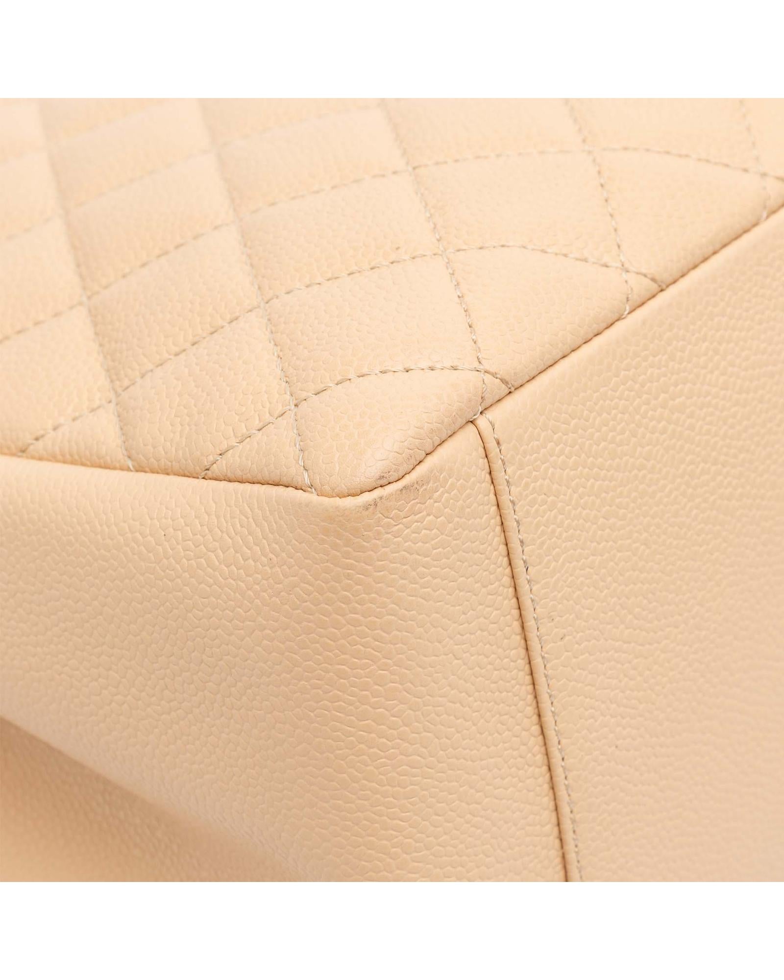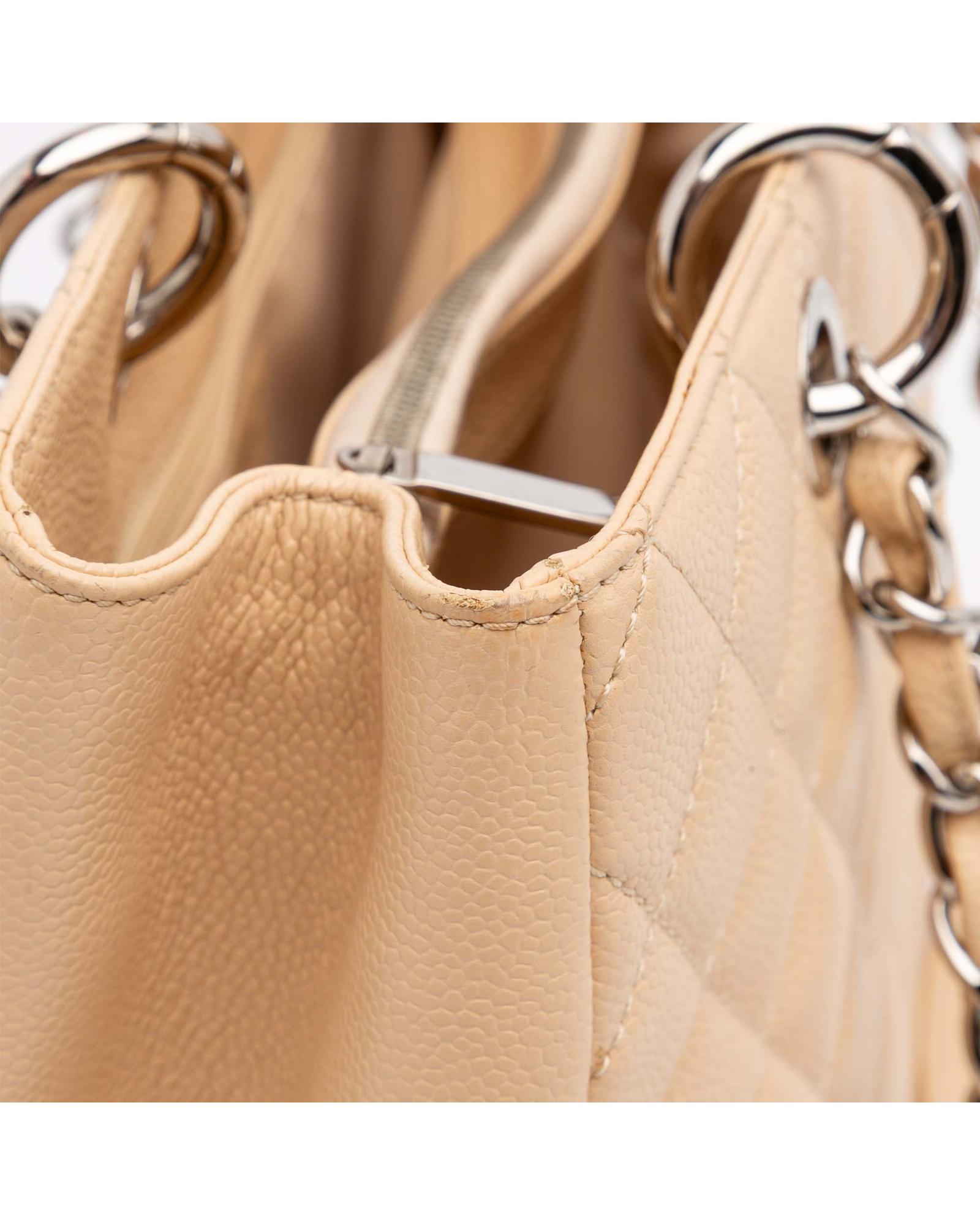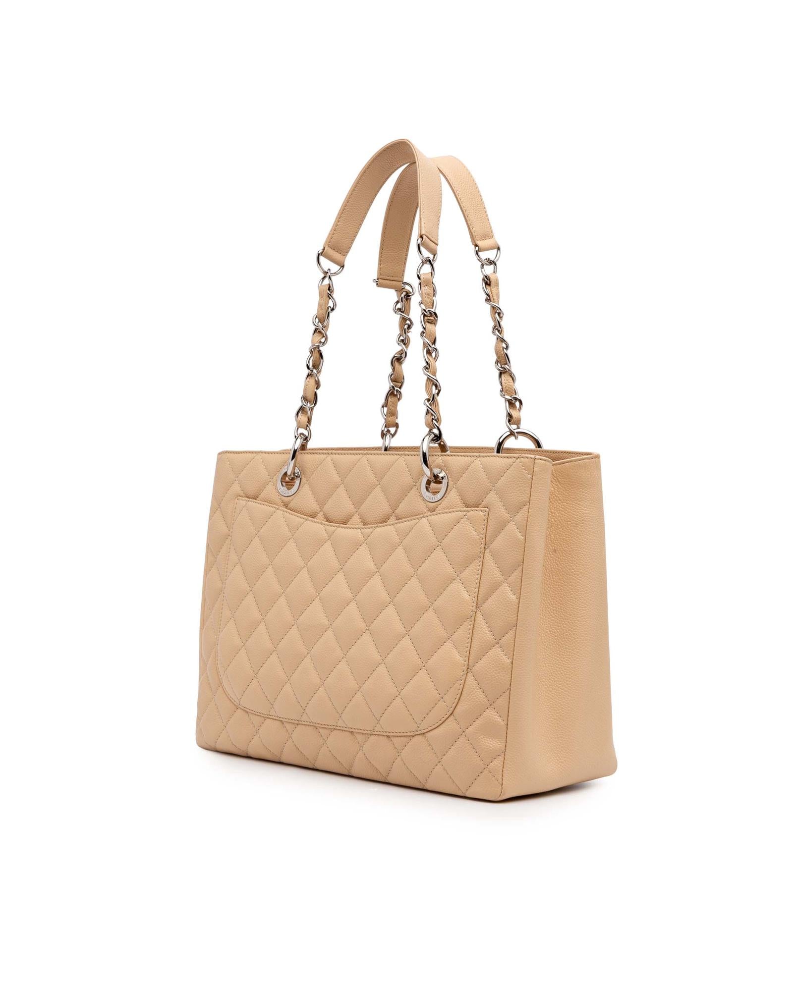 The Grand Shopping Tote features a quilted caviar leather body leather woven chain shoulder straps an open top an exterior slip pocket and interior zip and slip pockets.Brand: Chanel Vintage