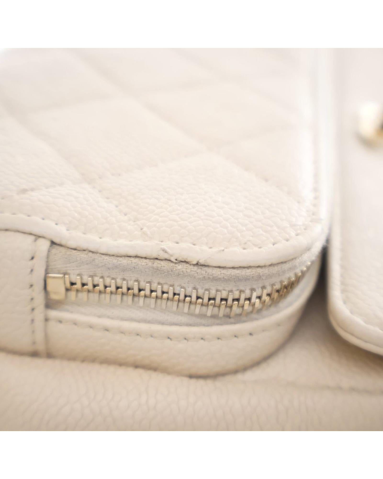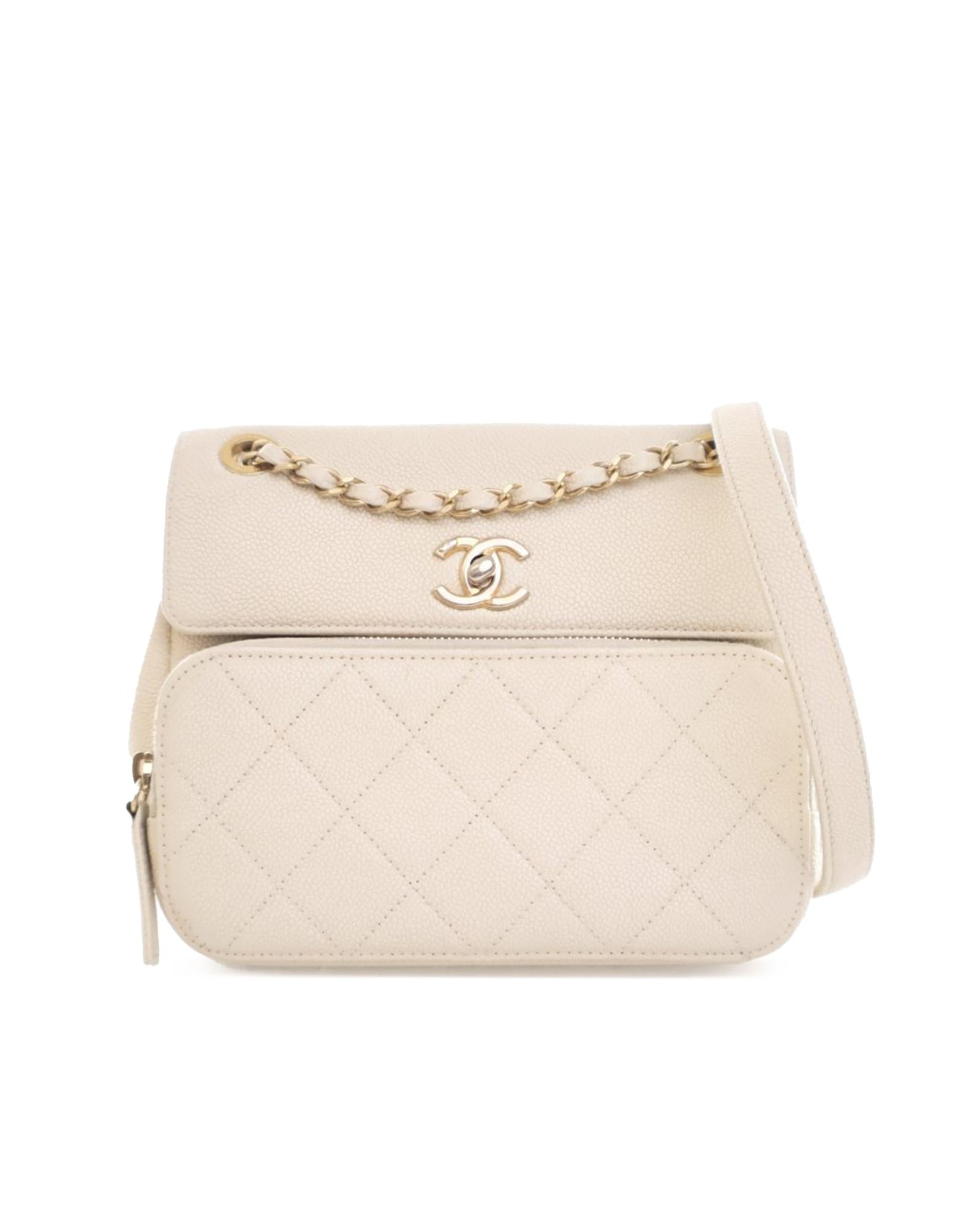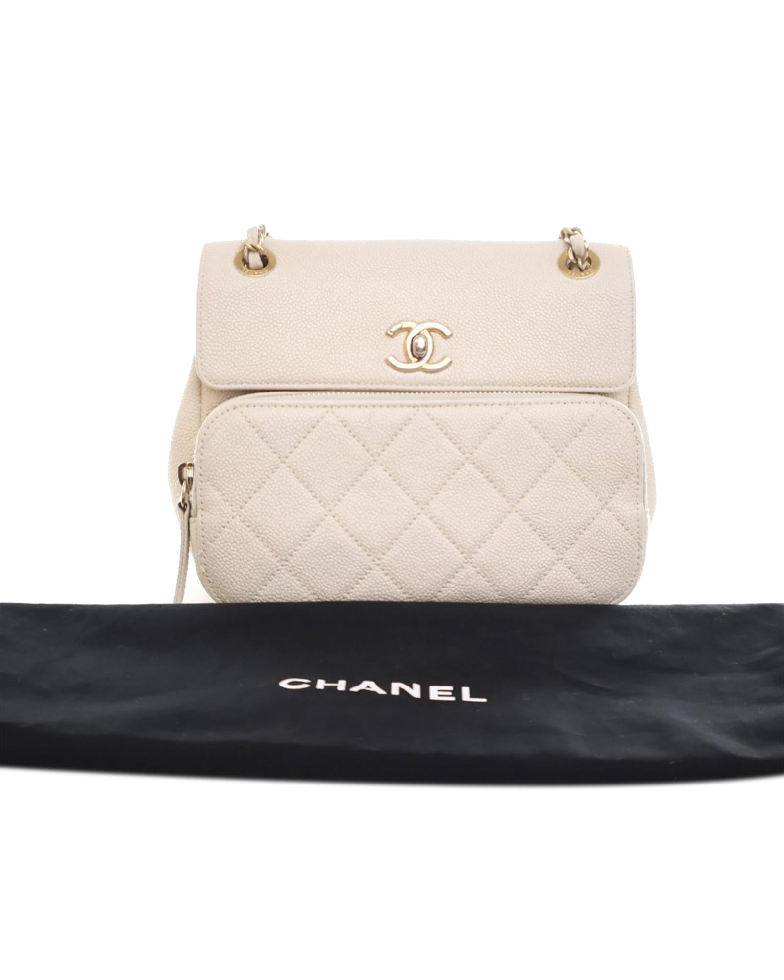 This crossbody bag features a quilted caviar leather body a leather-woven chain strap with leather shoulder guard a top flap with CC turn lock closure an exterior front zip pocket an exterior back slip pocket and an interior zip pocket.Brand: Chanel Vintage