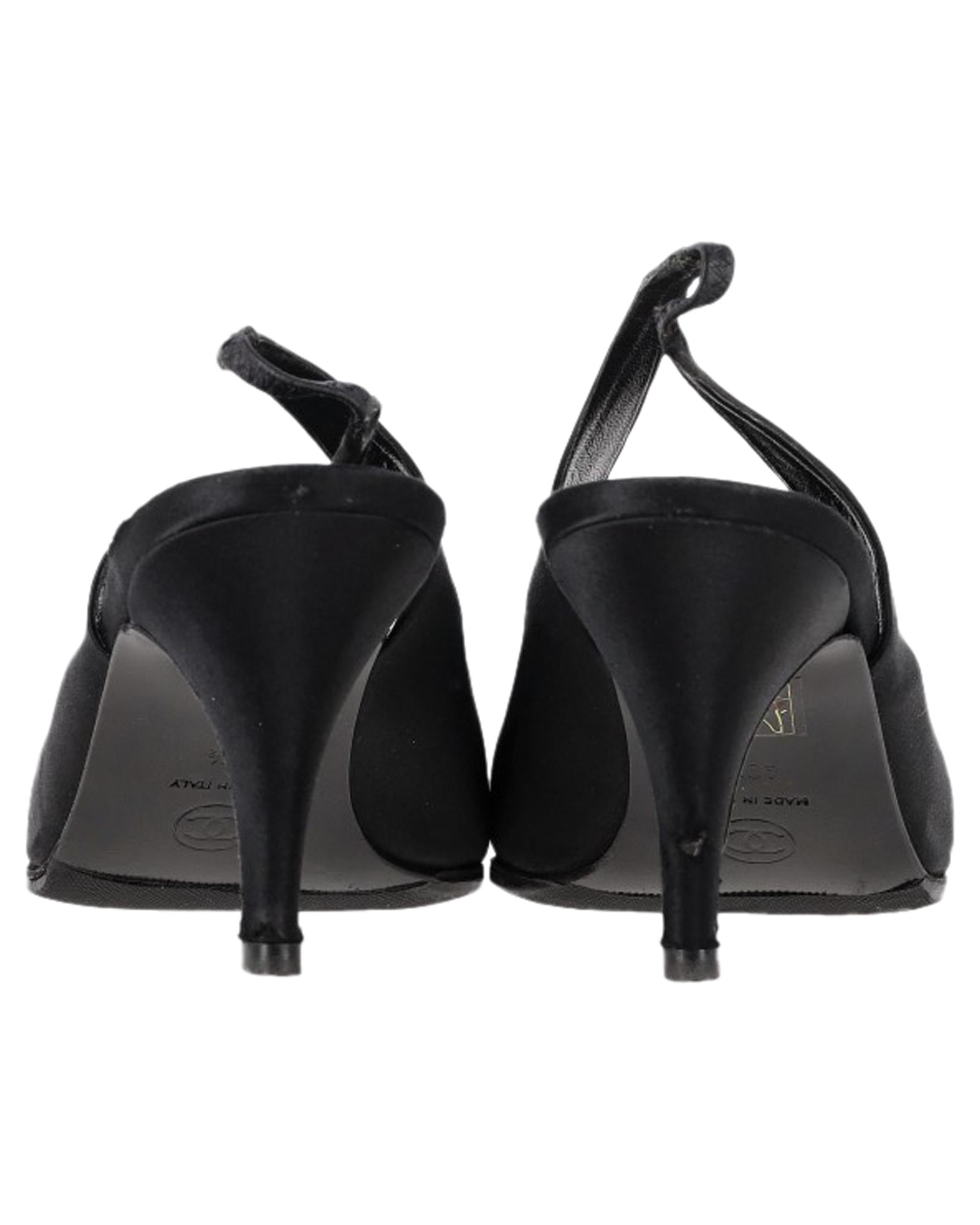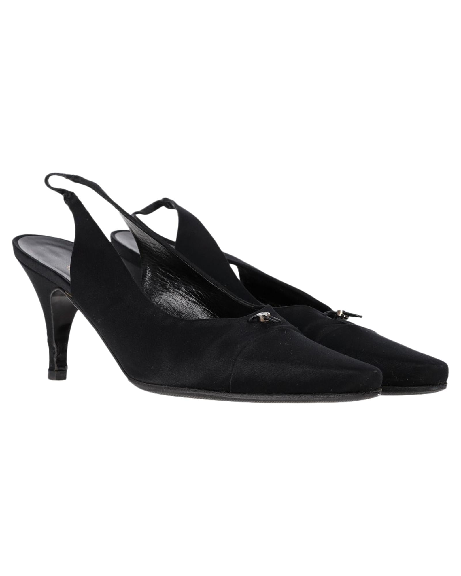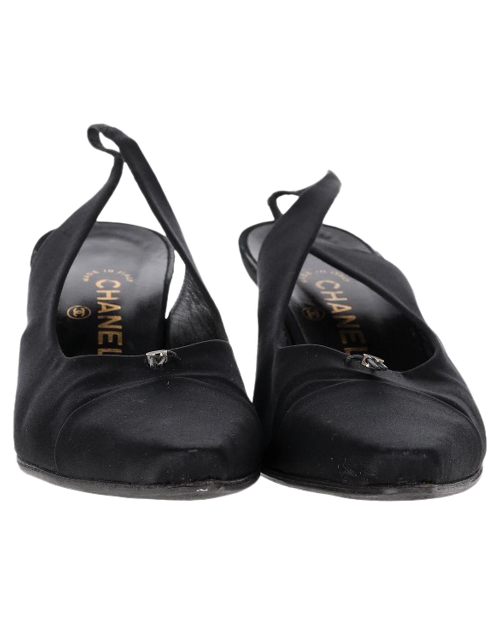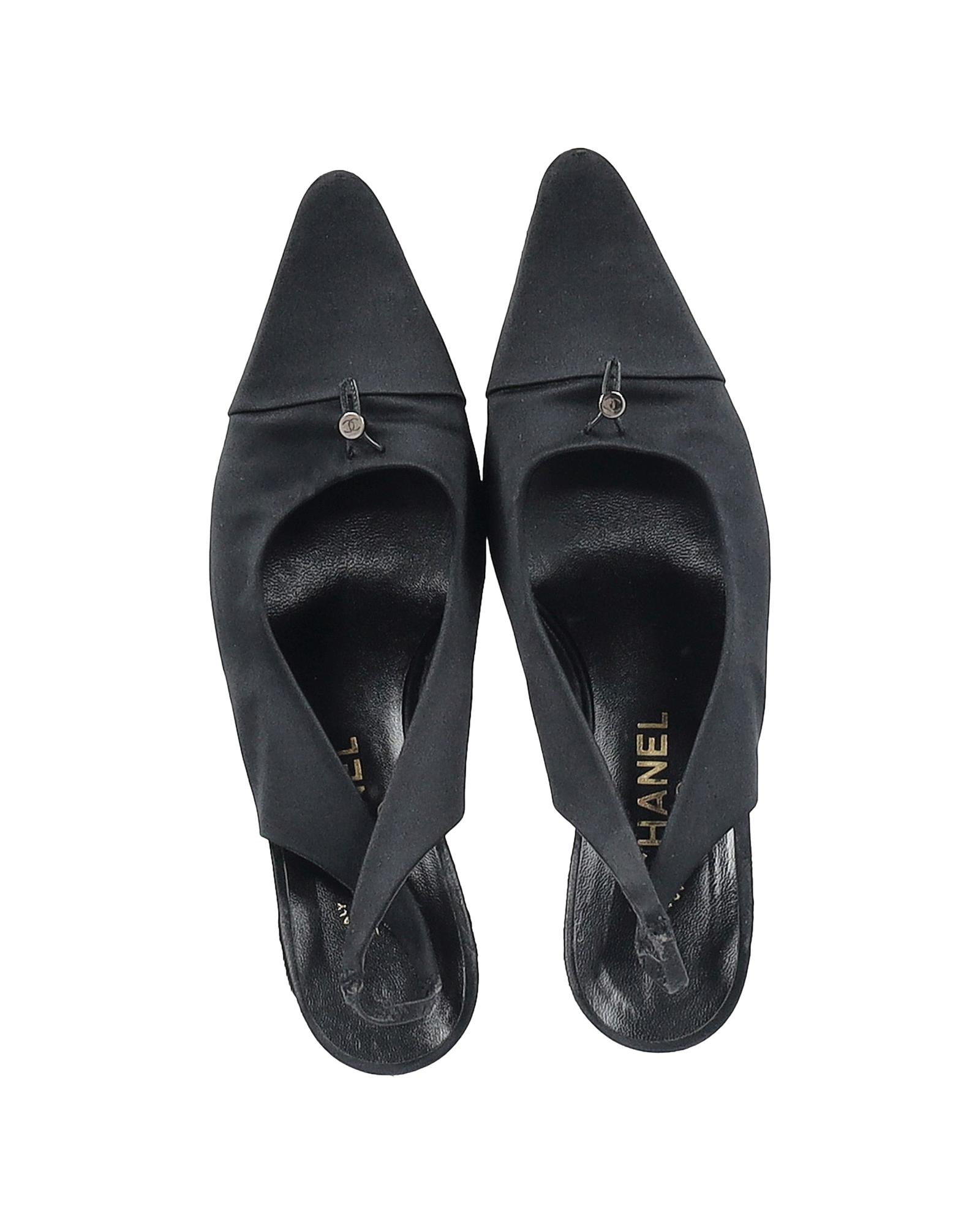 - Chanel CC Pointed Kitten Heel Slingback Pumps in Black Satin