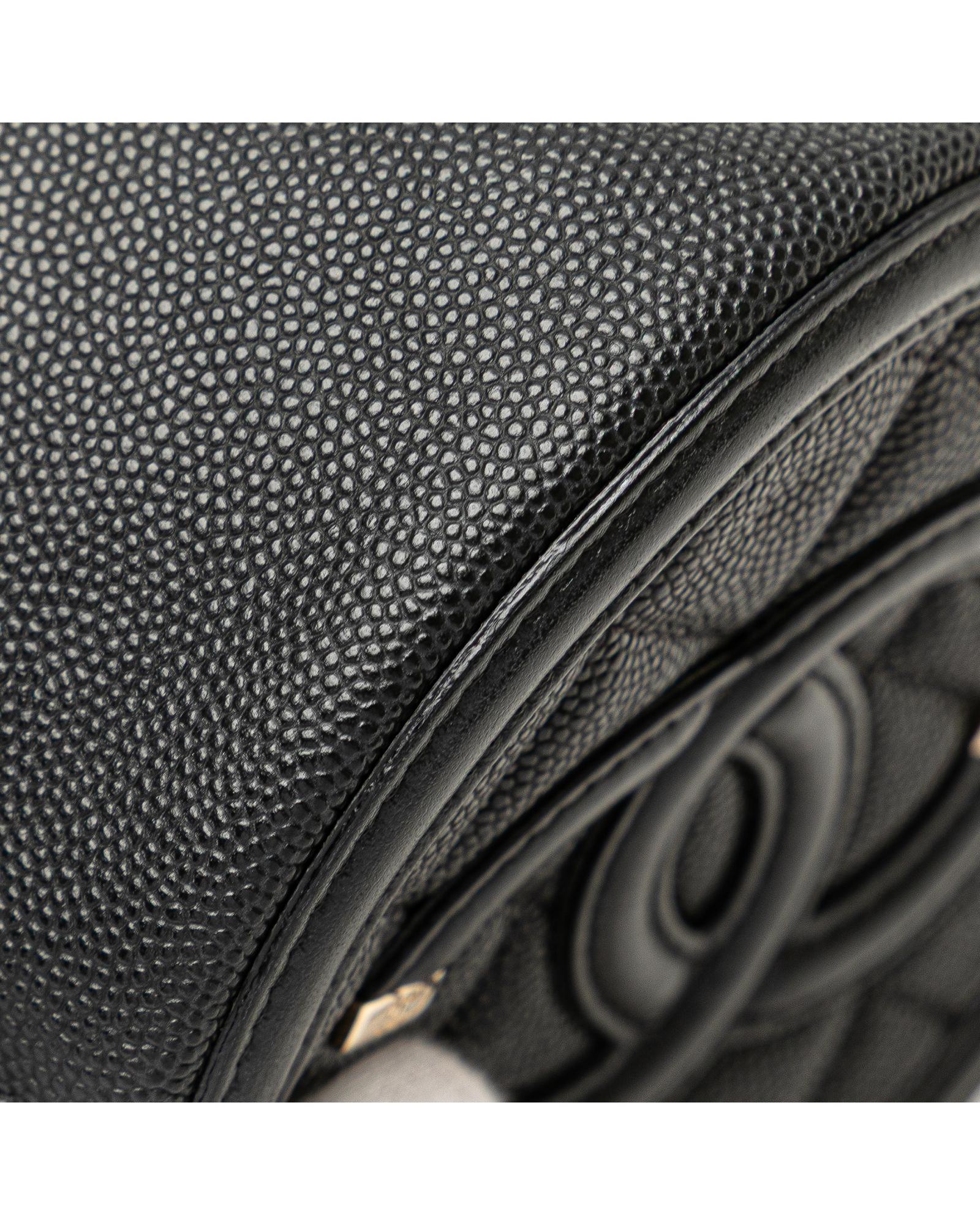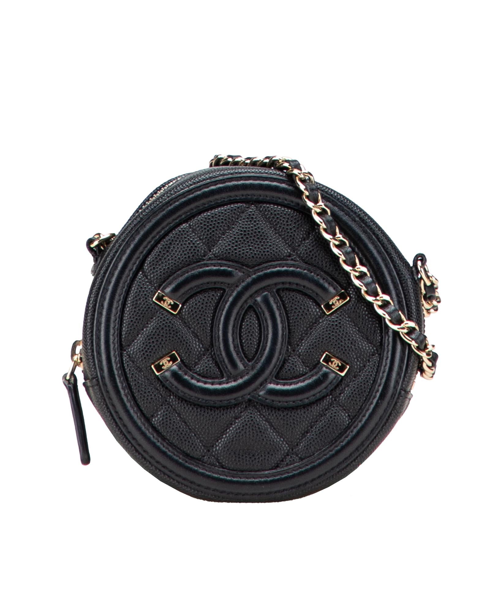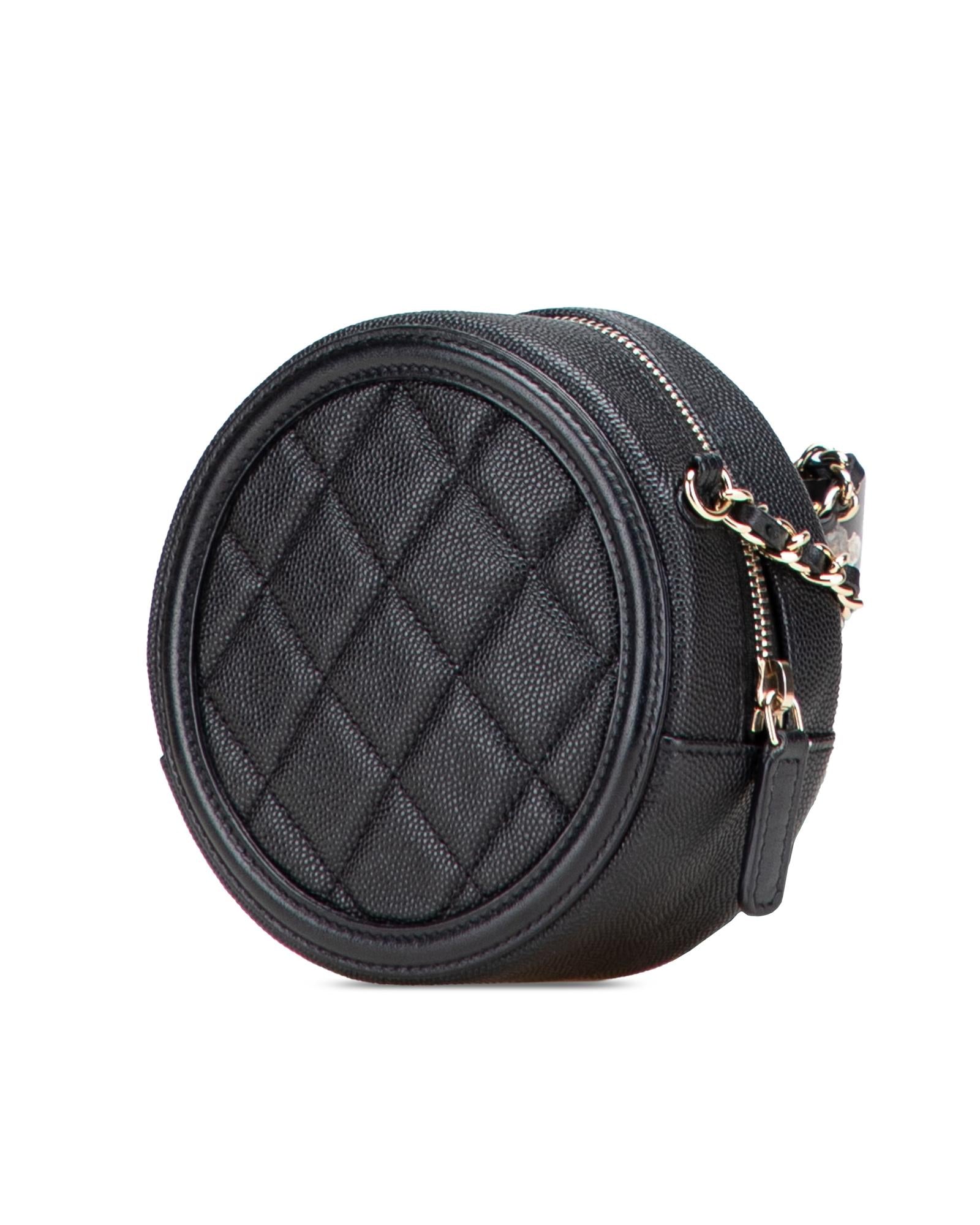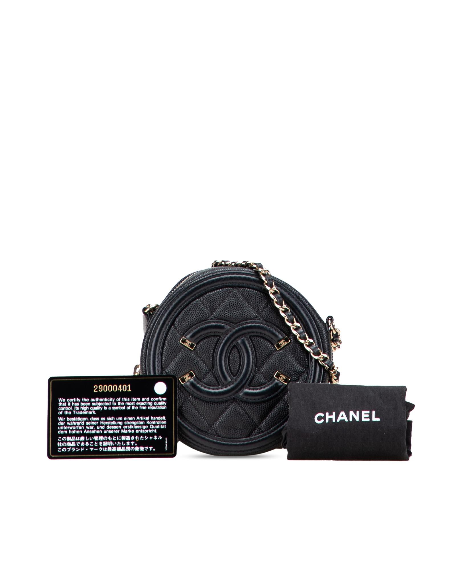 The Filigree features a quilted caviar leather body a leather woven chain strap a top zip closure and interior slip pockets.Brand: Chanel Vintage