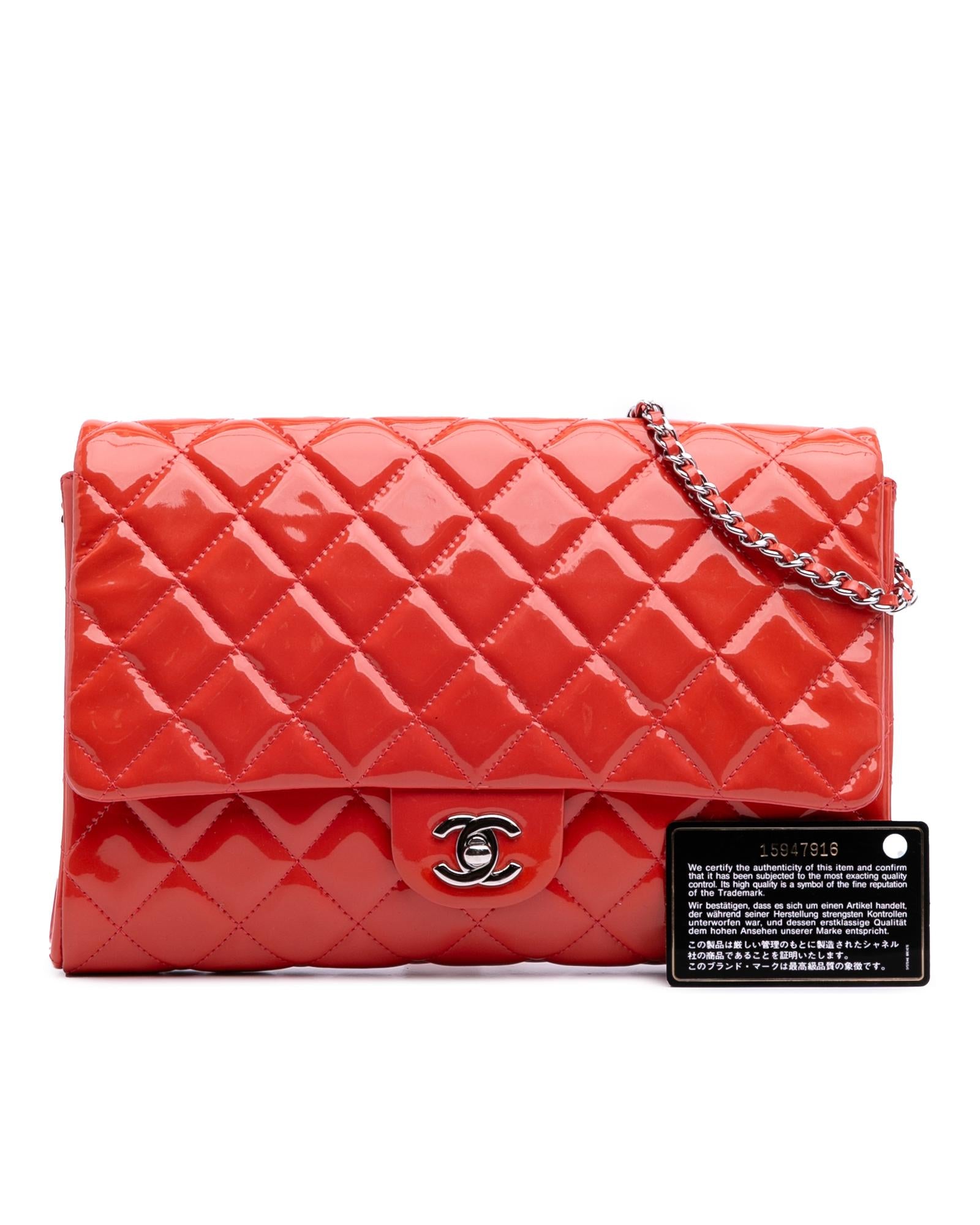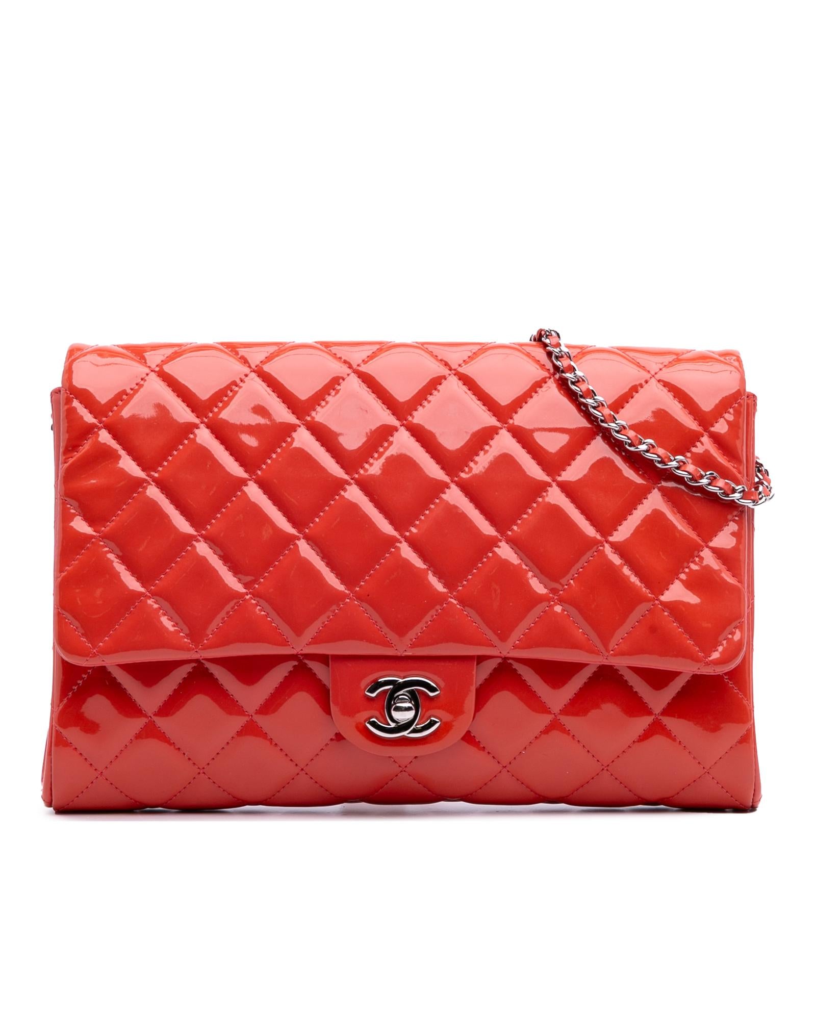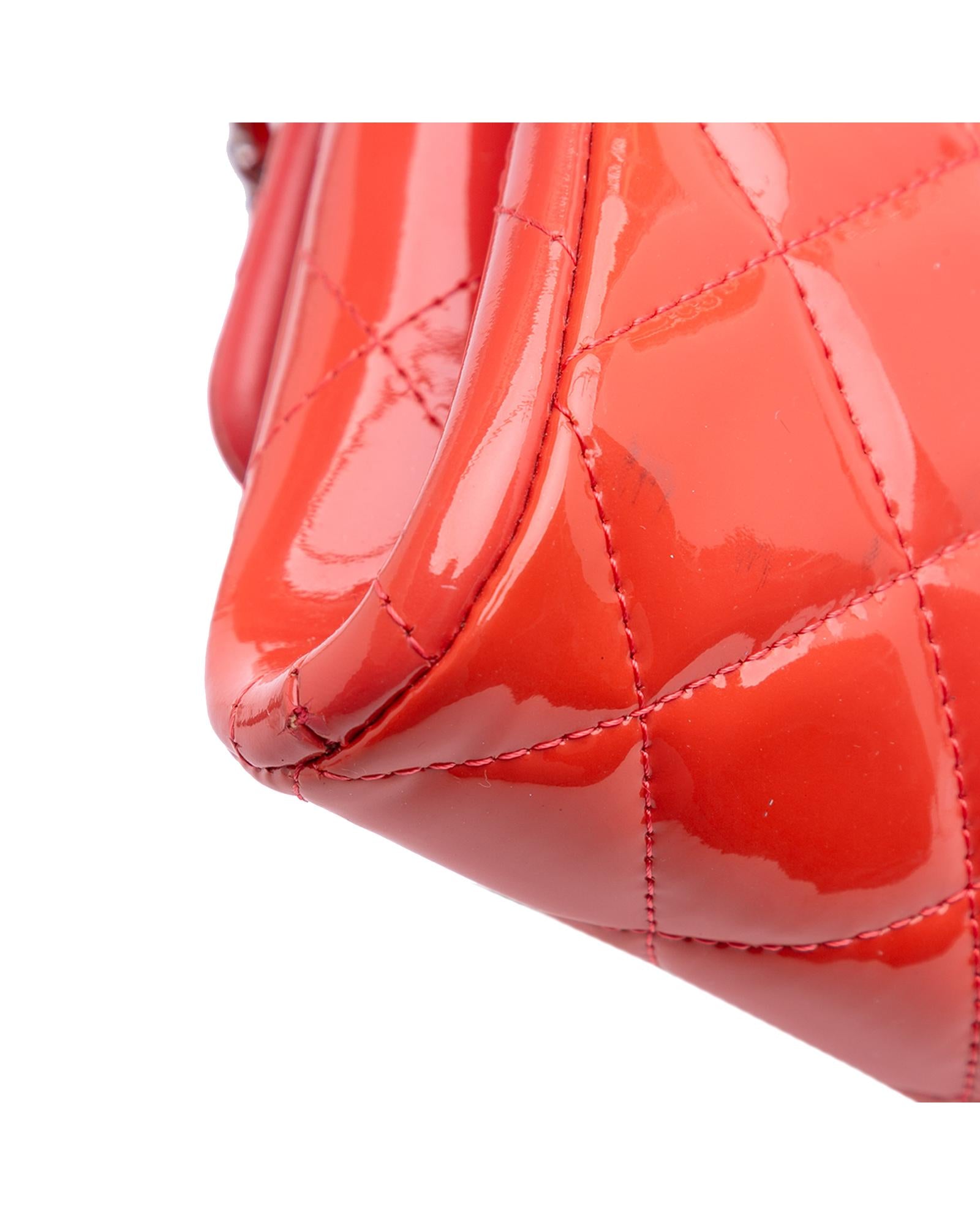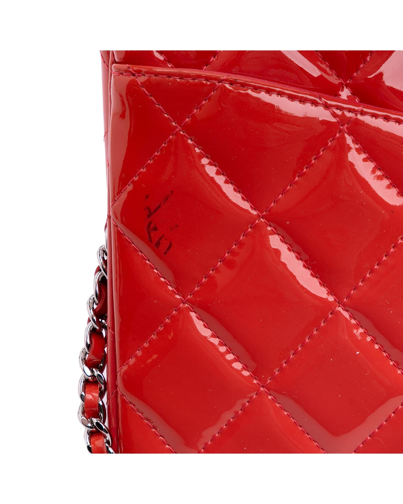 This shoulder bag features a quilted patent leather body a woven leather chain strap a front flap with CC turn-lock closure an exterior back slip pocket and an interior slip pocket.Brand: Chanel Vintage