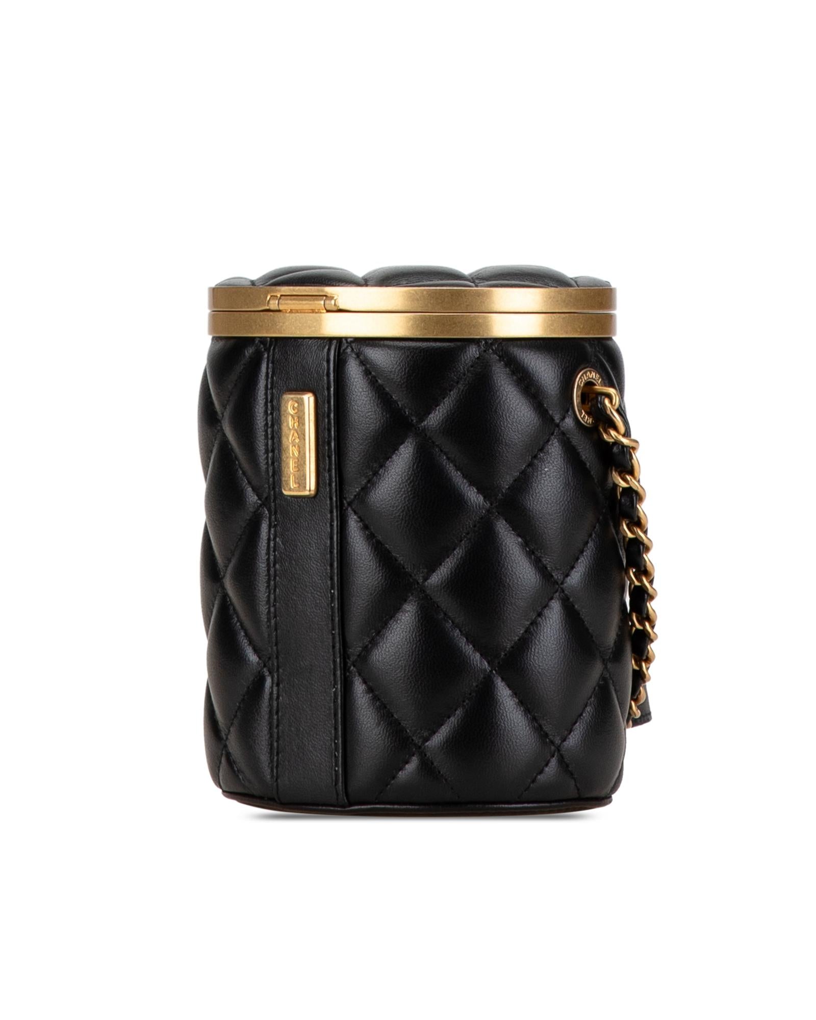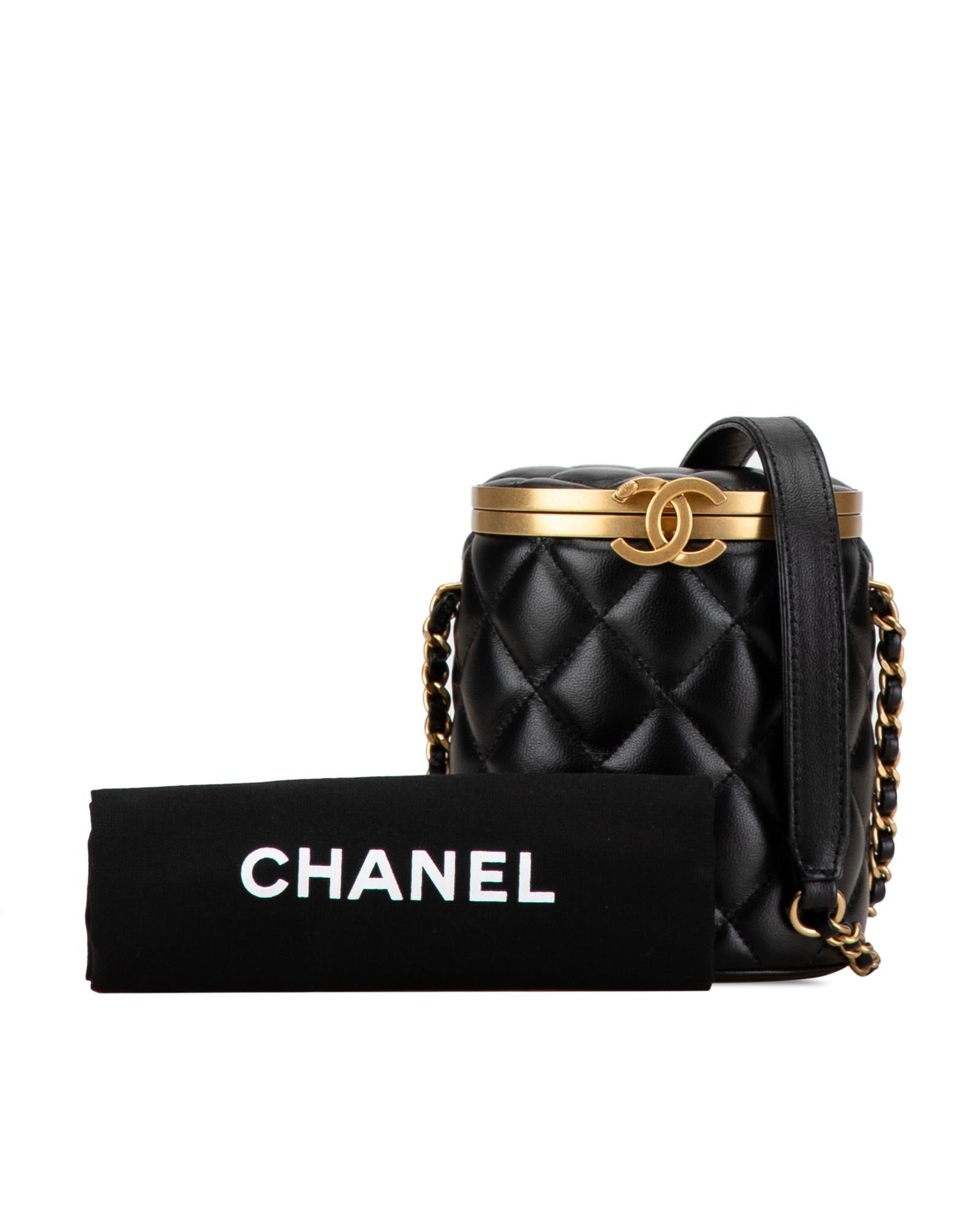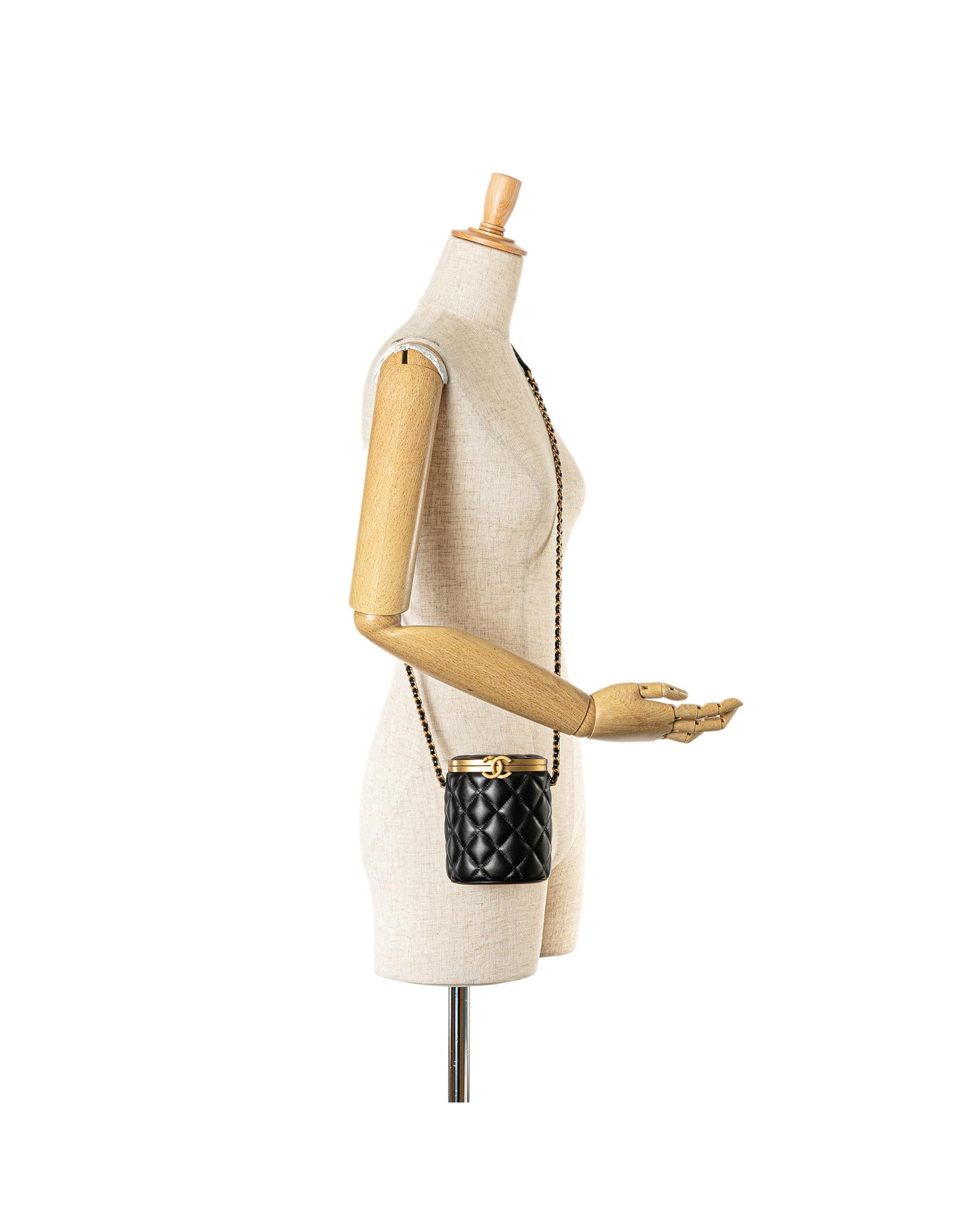 This crossbody bag features a quilted lambskin leather body a woven leather chain strap a top clasp closure and an interior mirror.Brand: Chanel Vintage