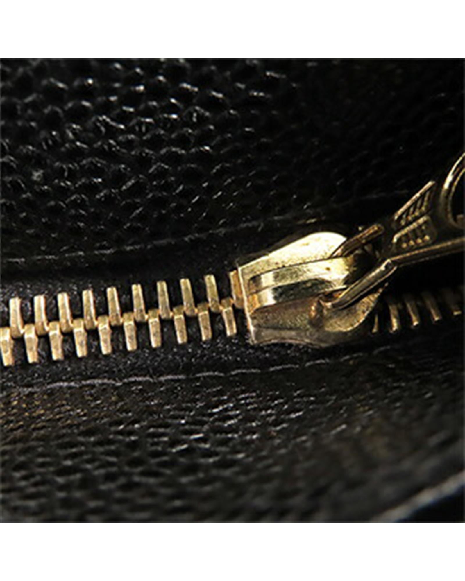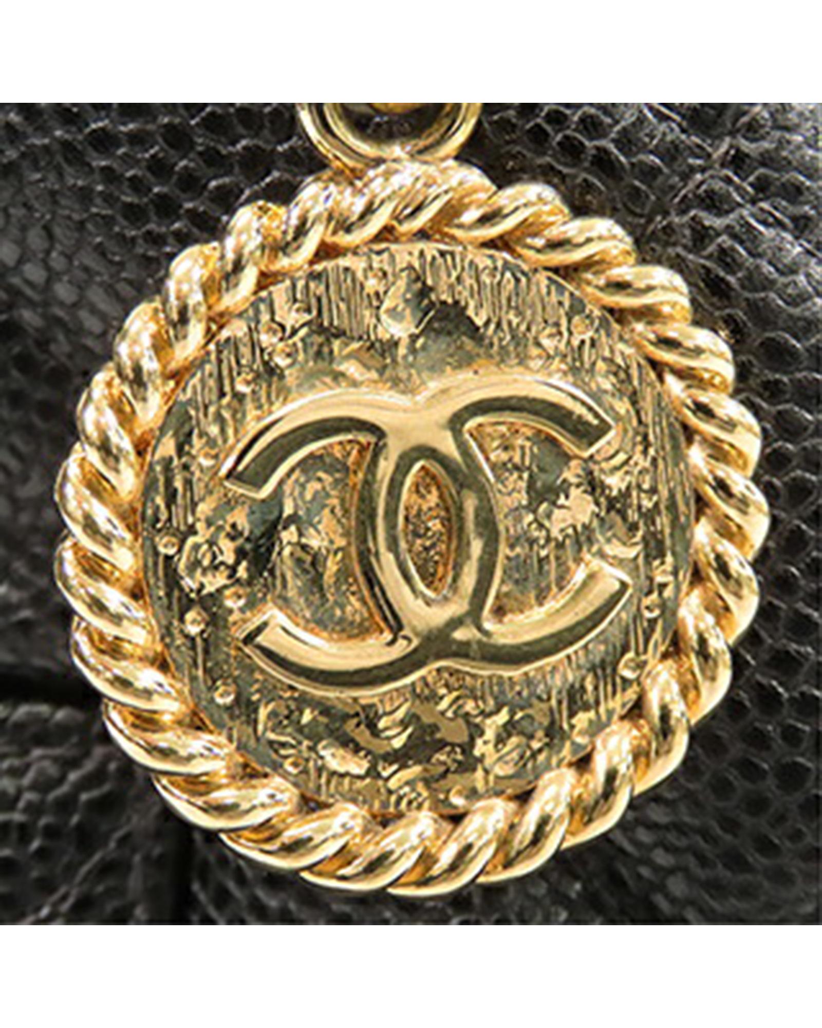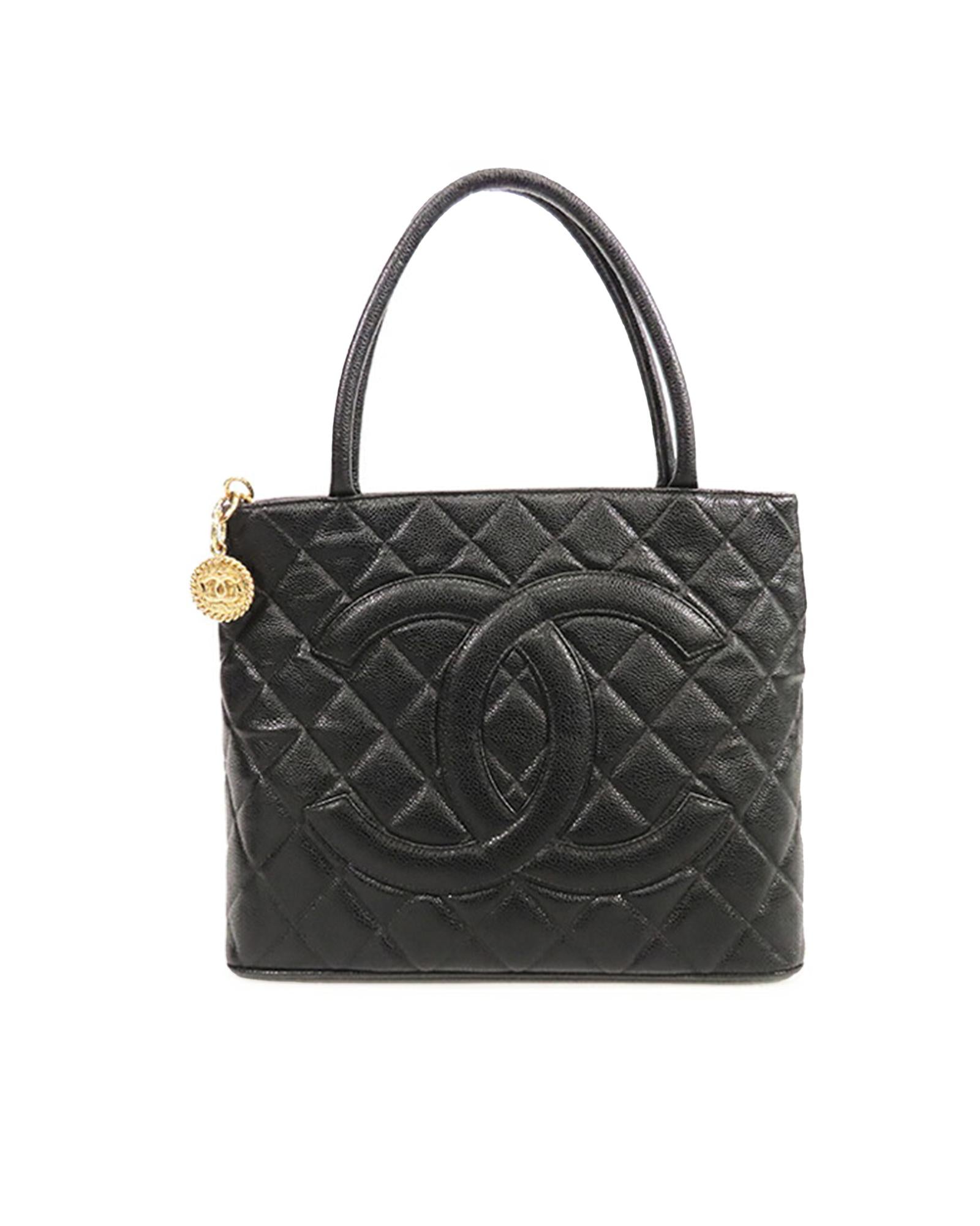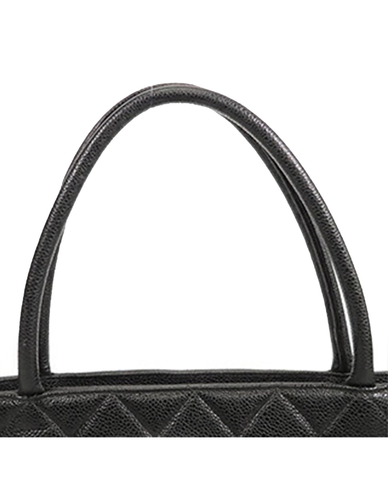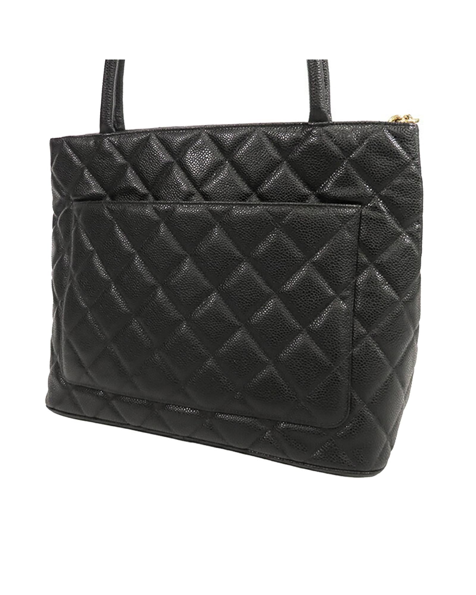 The Medallion tote bag features a quilted caviar leather body rolled leather handles a top zip closure an exterior back slip pocket and interior zip and slip pockets.Brand: Chanel Vintage