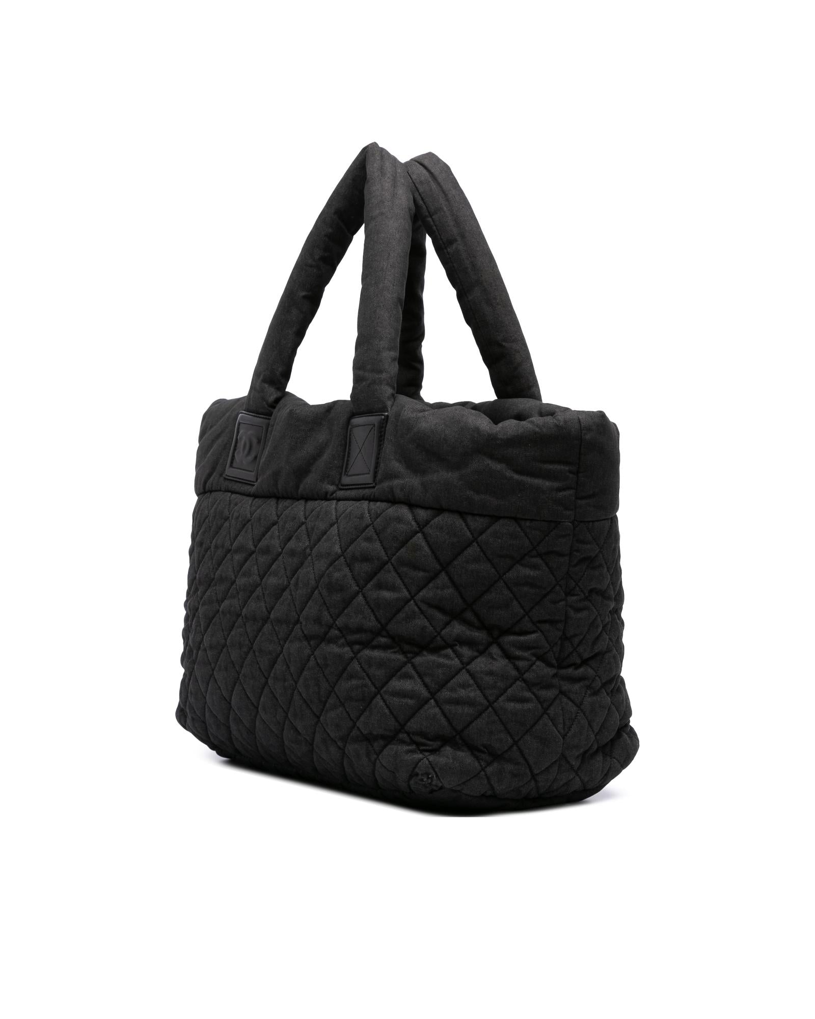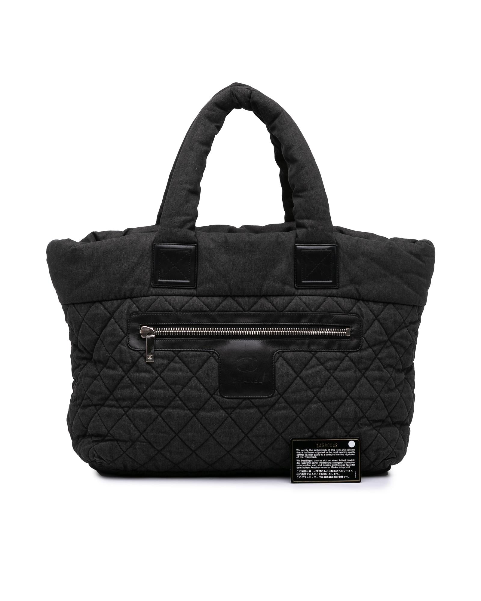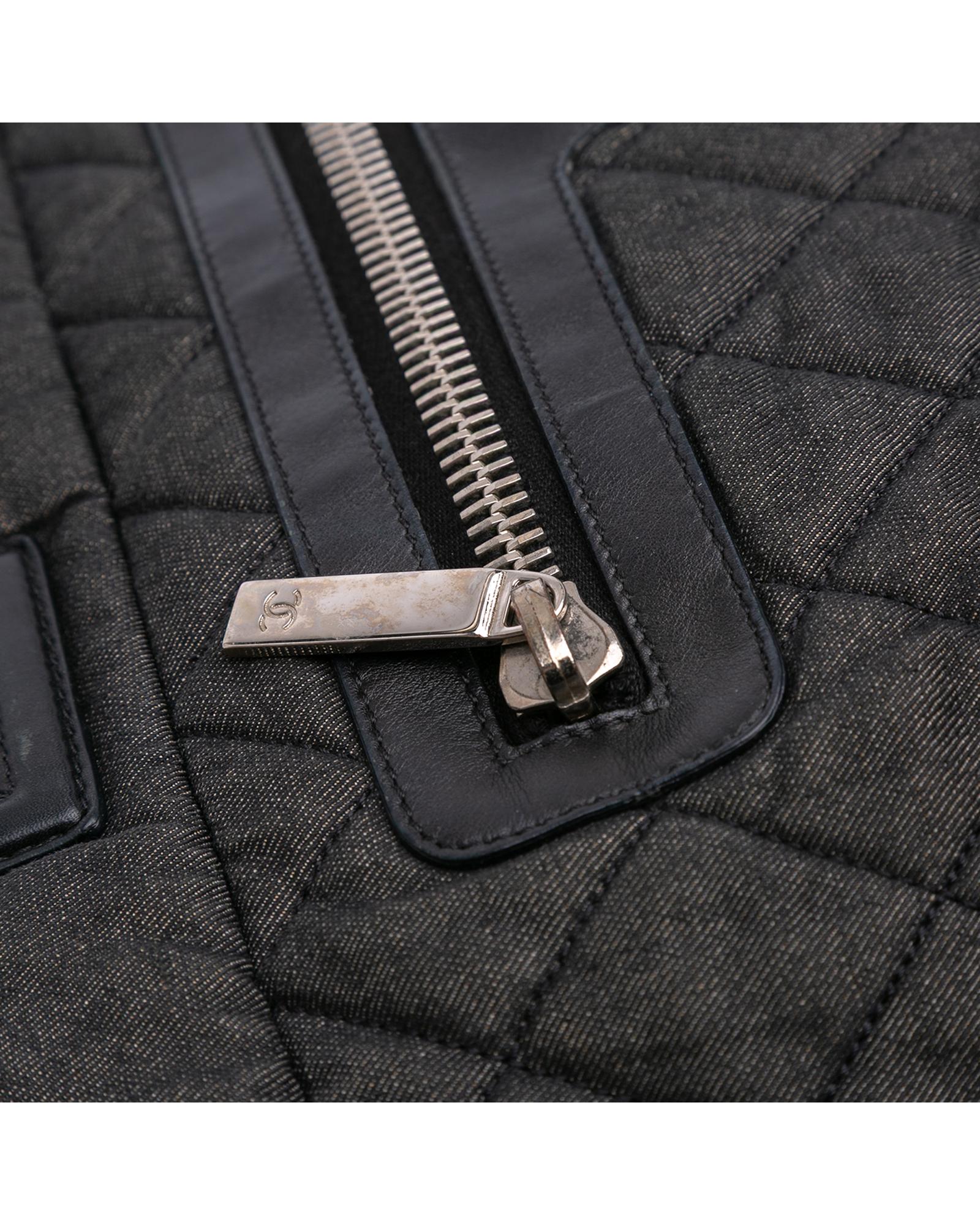 The Coco Cocoon tote features a quilted denim body rolled denim handles an exterior front zip pocket a top zip closure and an interior zip pocket.Brand: Chanel Vintage