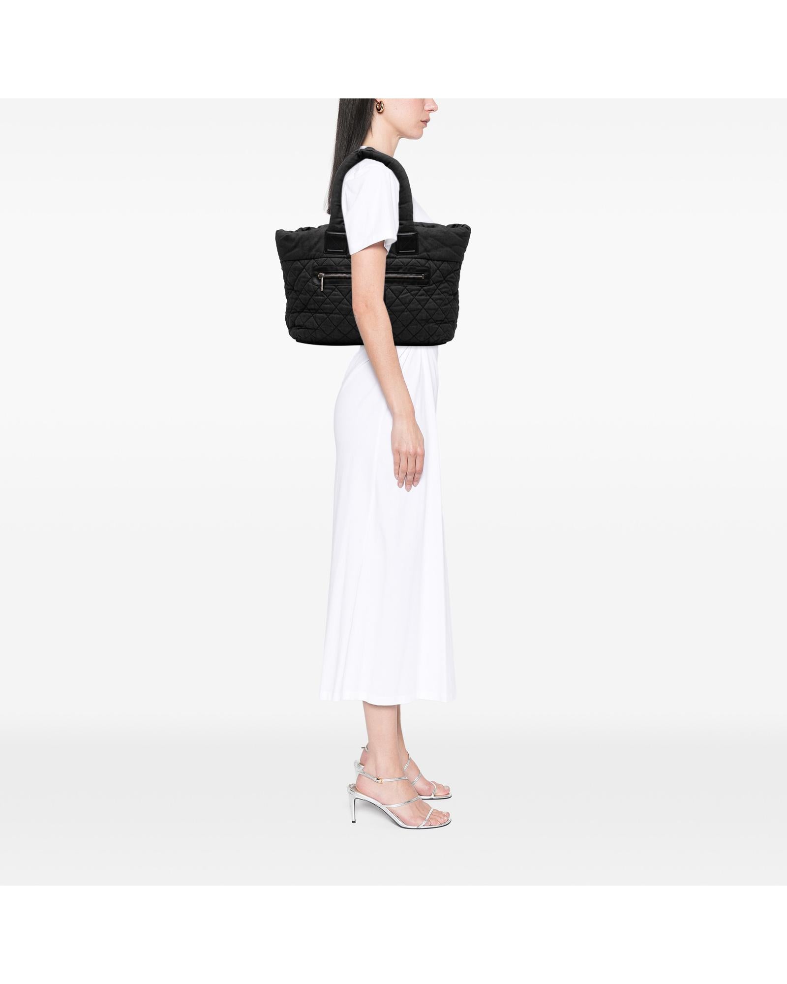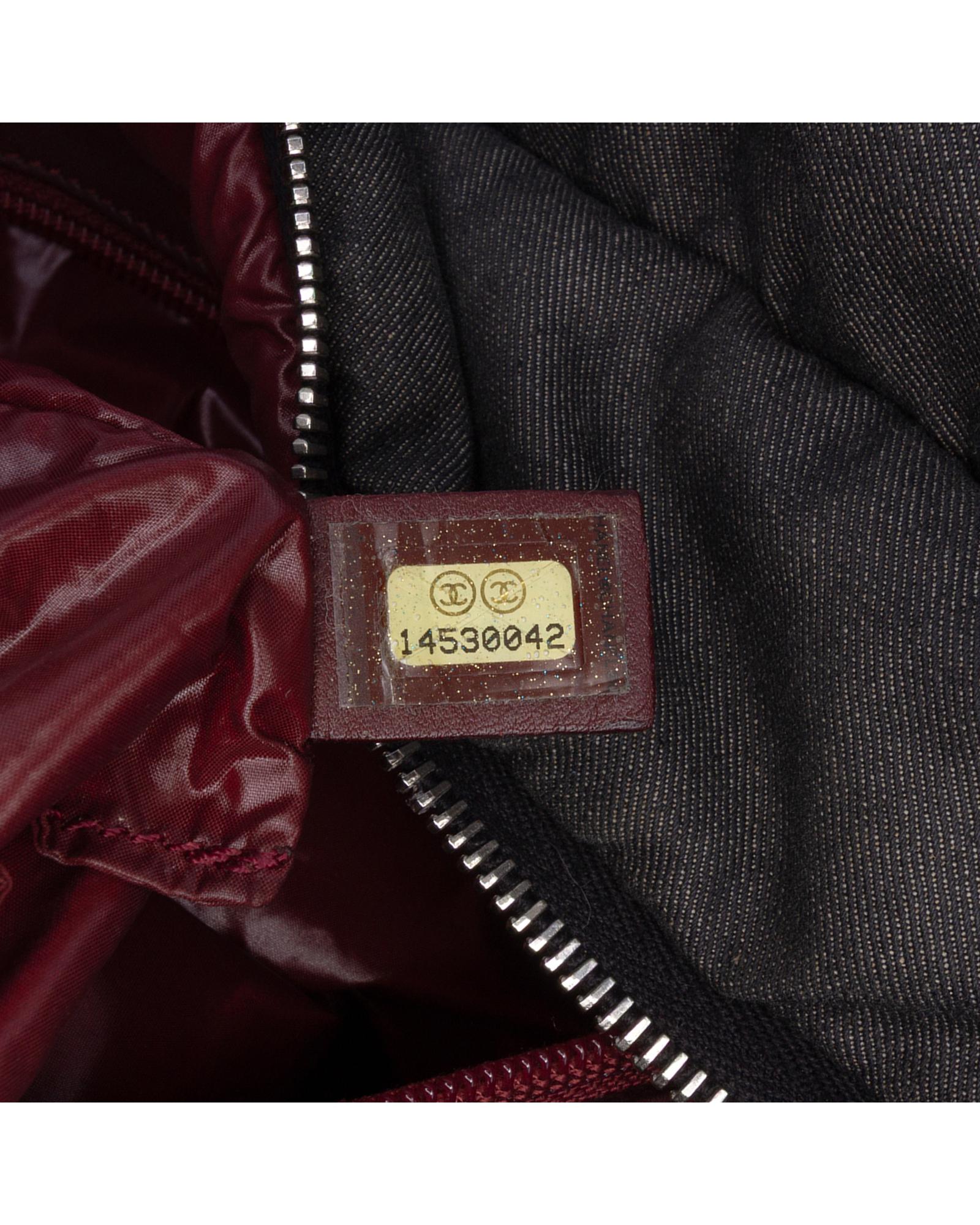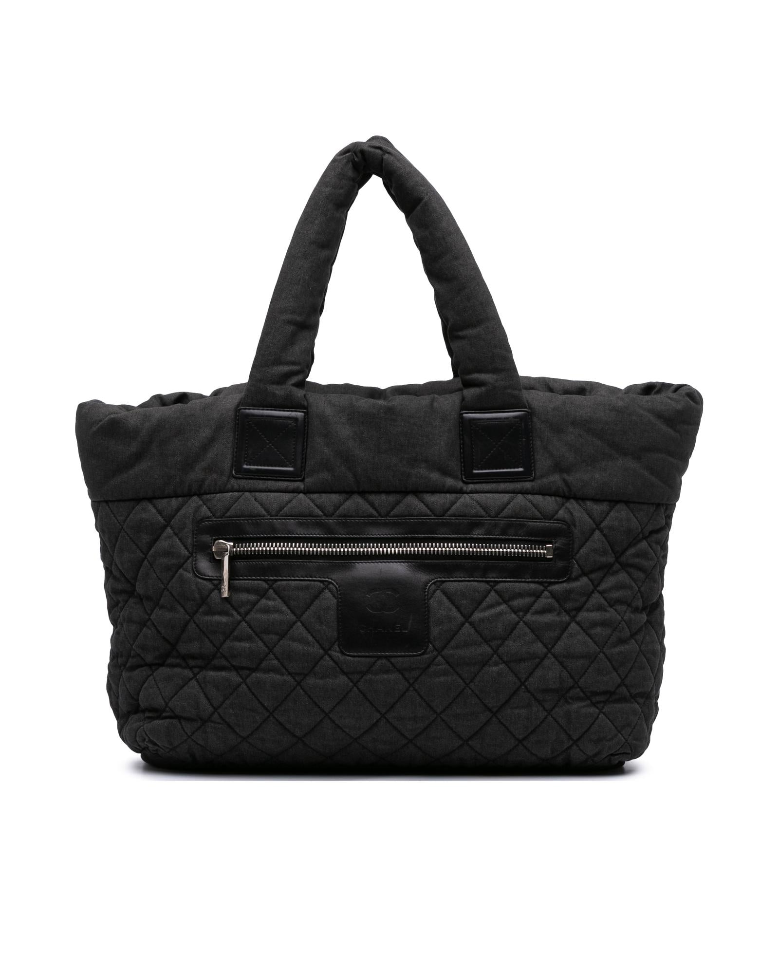 The Coco Cocoon tote features a quilted denim body rolled denim handles an exterior front zip pocket a top zip closure and an interior zip pocket.Brand: Chanel Vintage