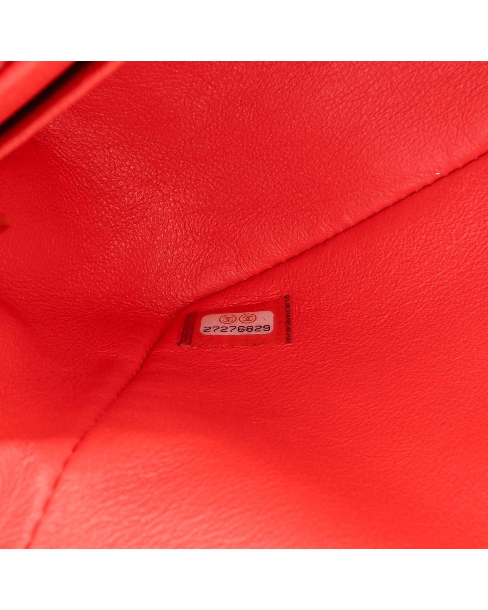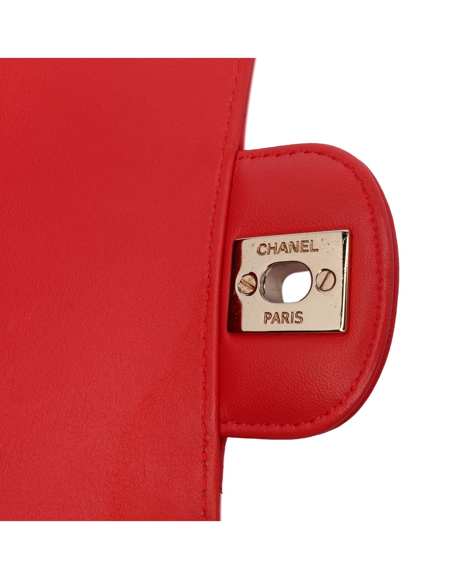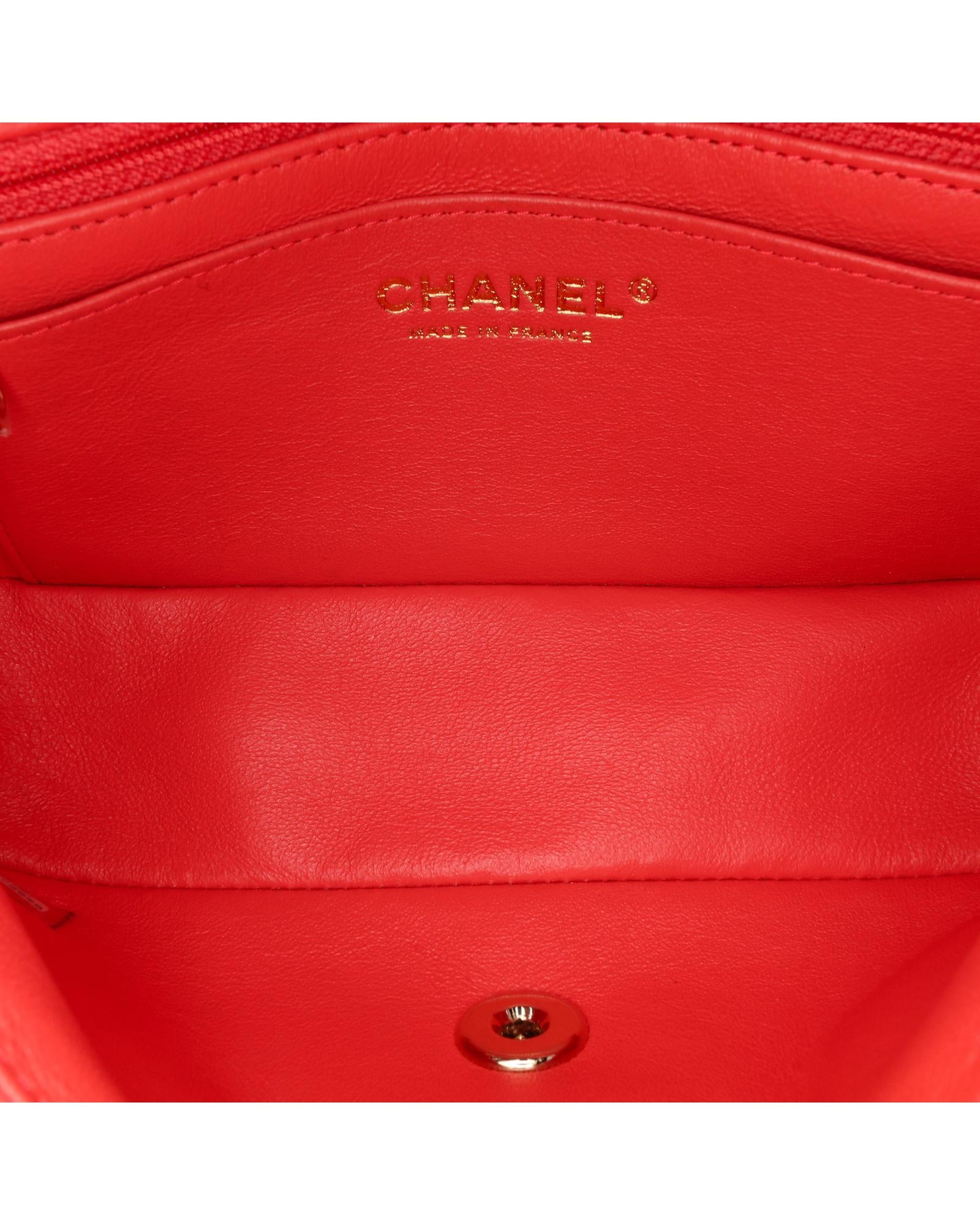 This crossbody bag features a quilted lambskin leather body a leather woven chain strap a front flap with interlocking Cs and a twist lock closure an exterior back slip pocket and interior zip and slip pockets.