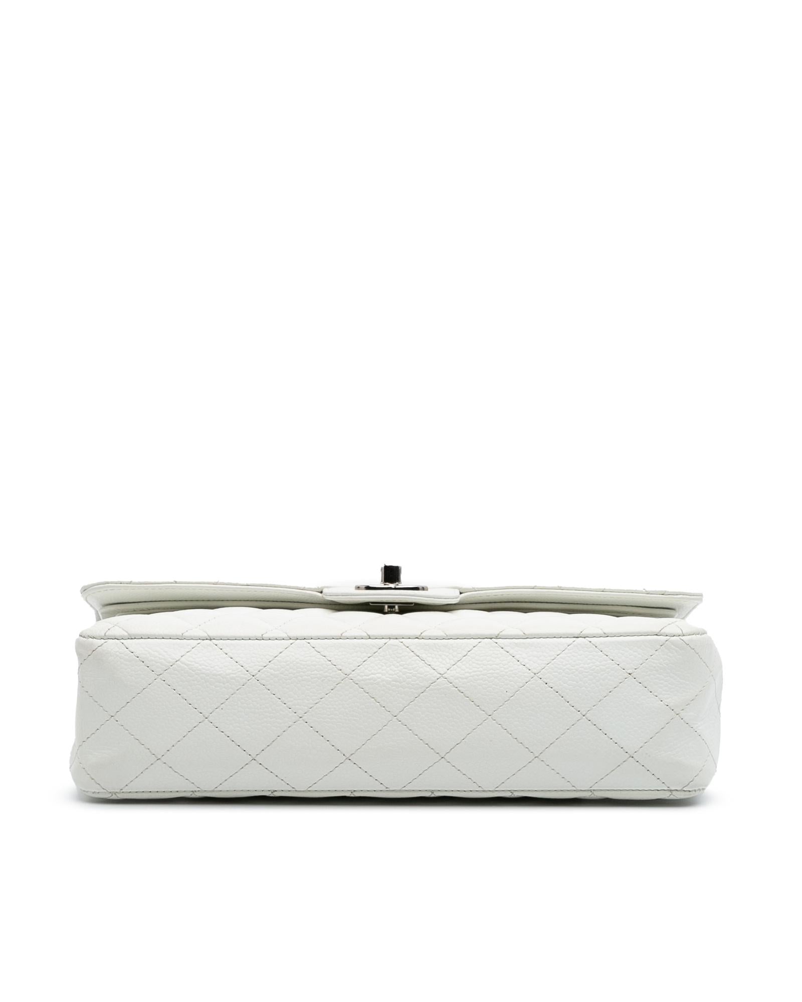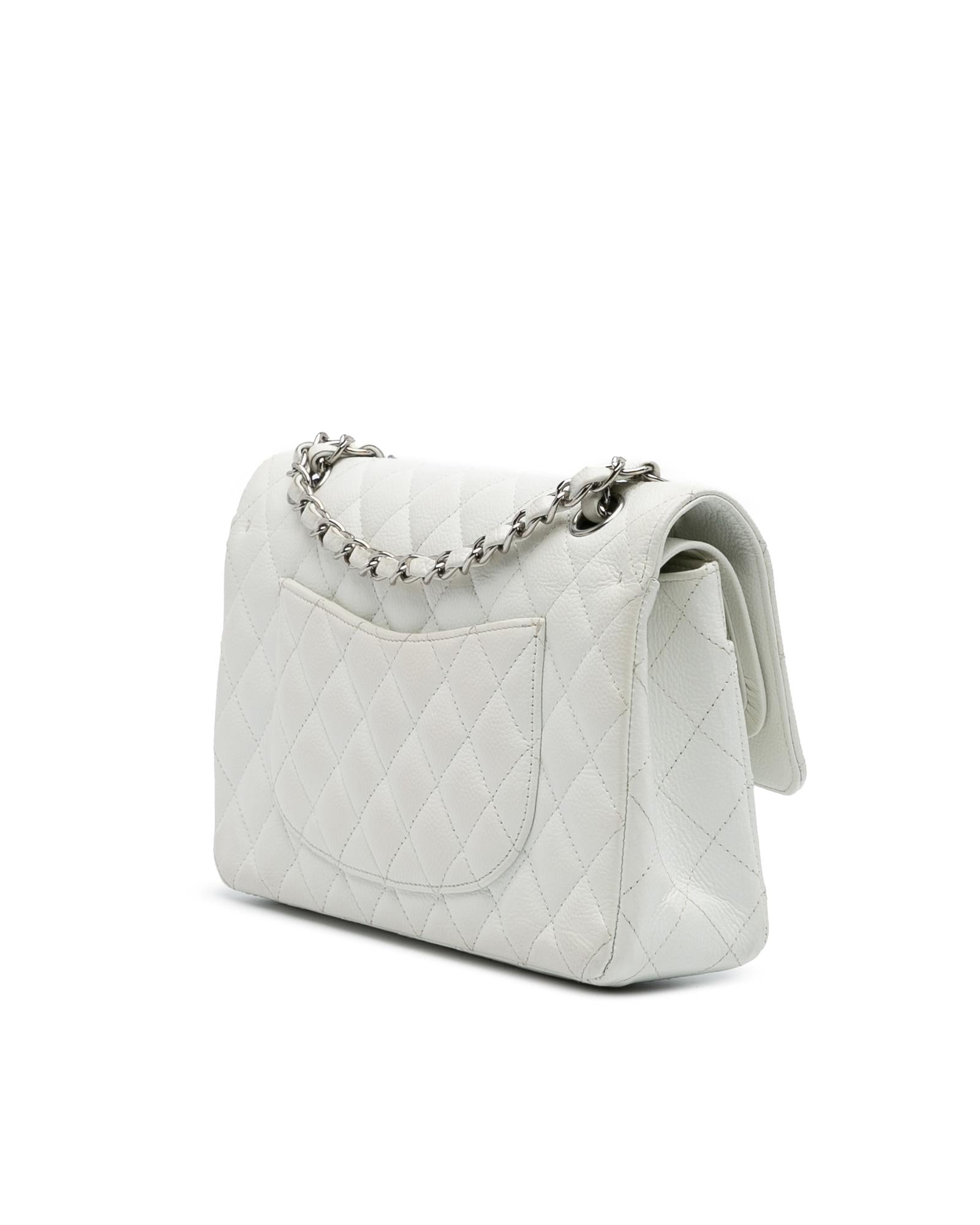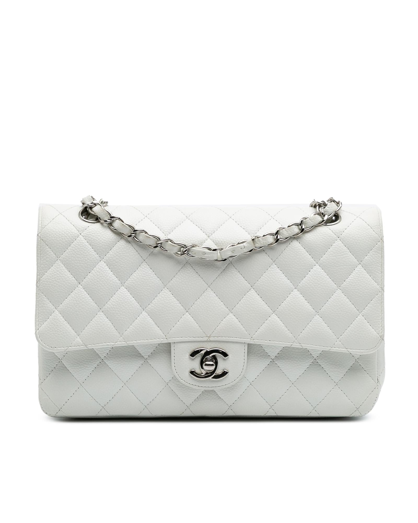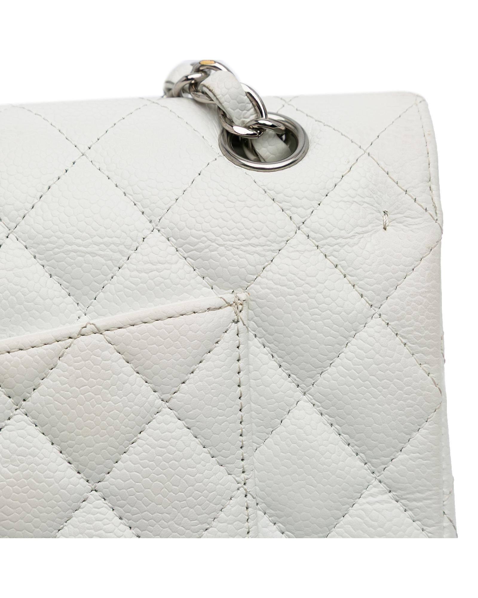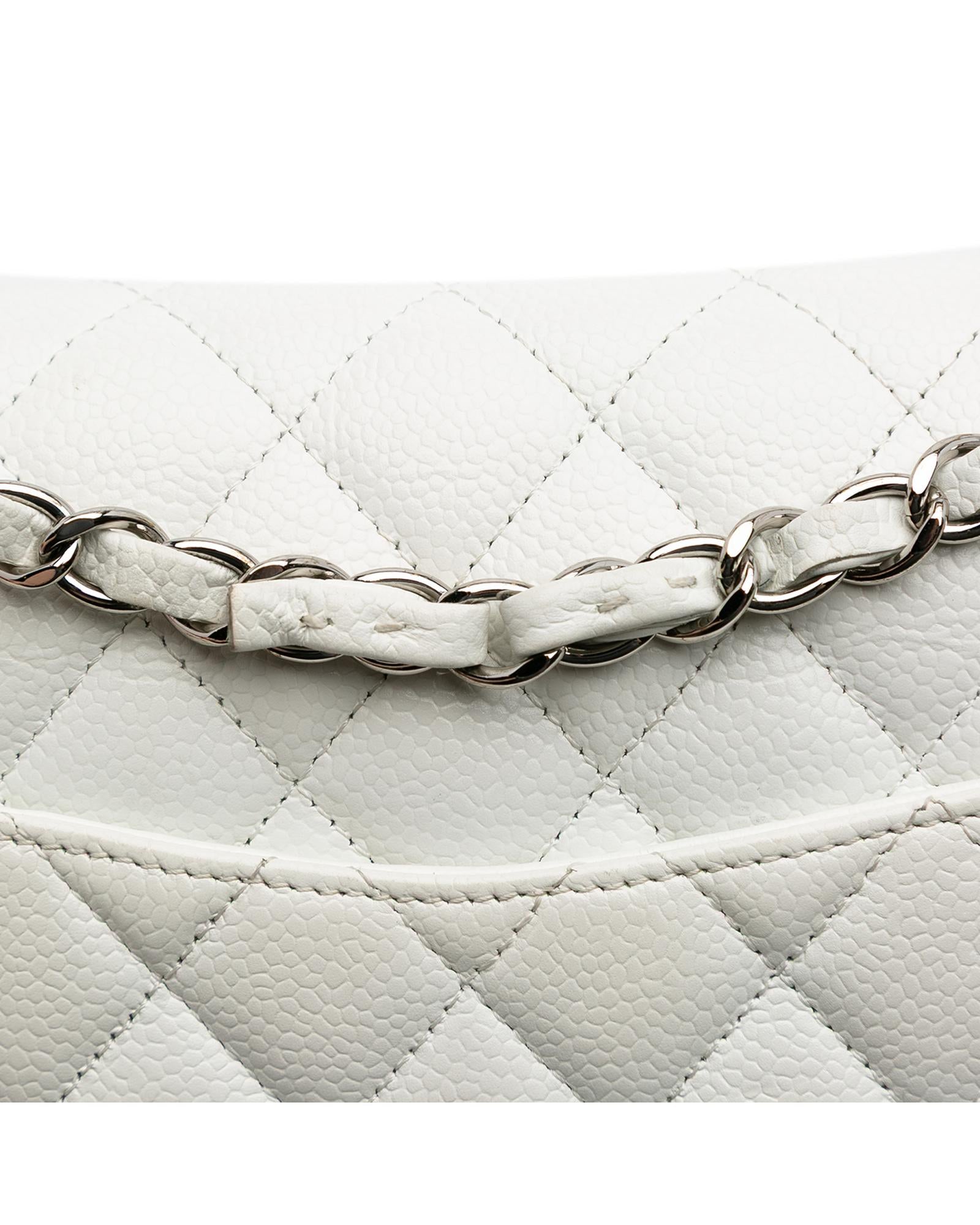 This shoulder bag features a quilted caviar body leather woven chain straps double front flaps with interlocking Cs and a twist lock closure an exterior back slip pocket and interior slip pockets.Brand: Chanel Vintage