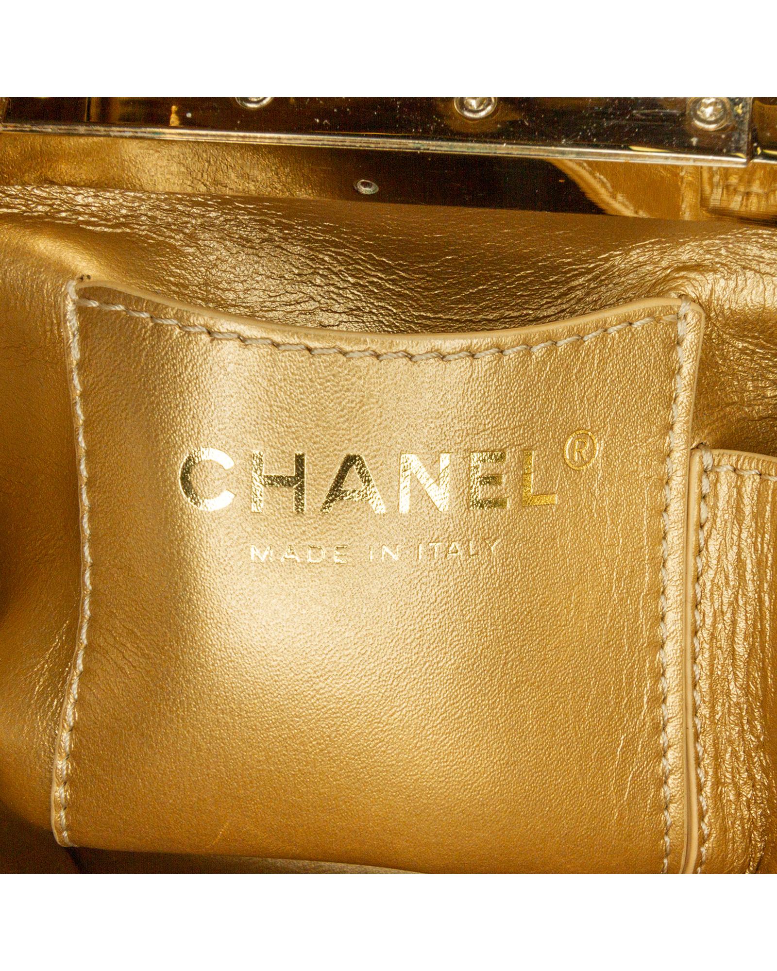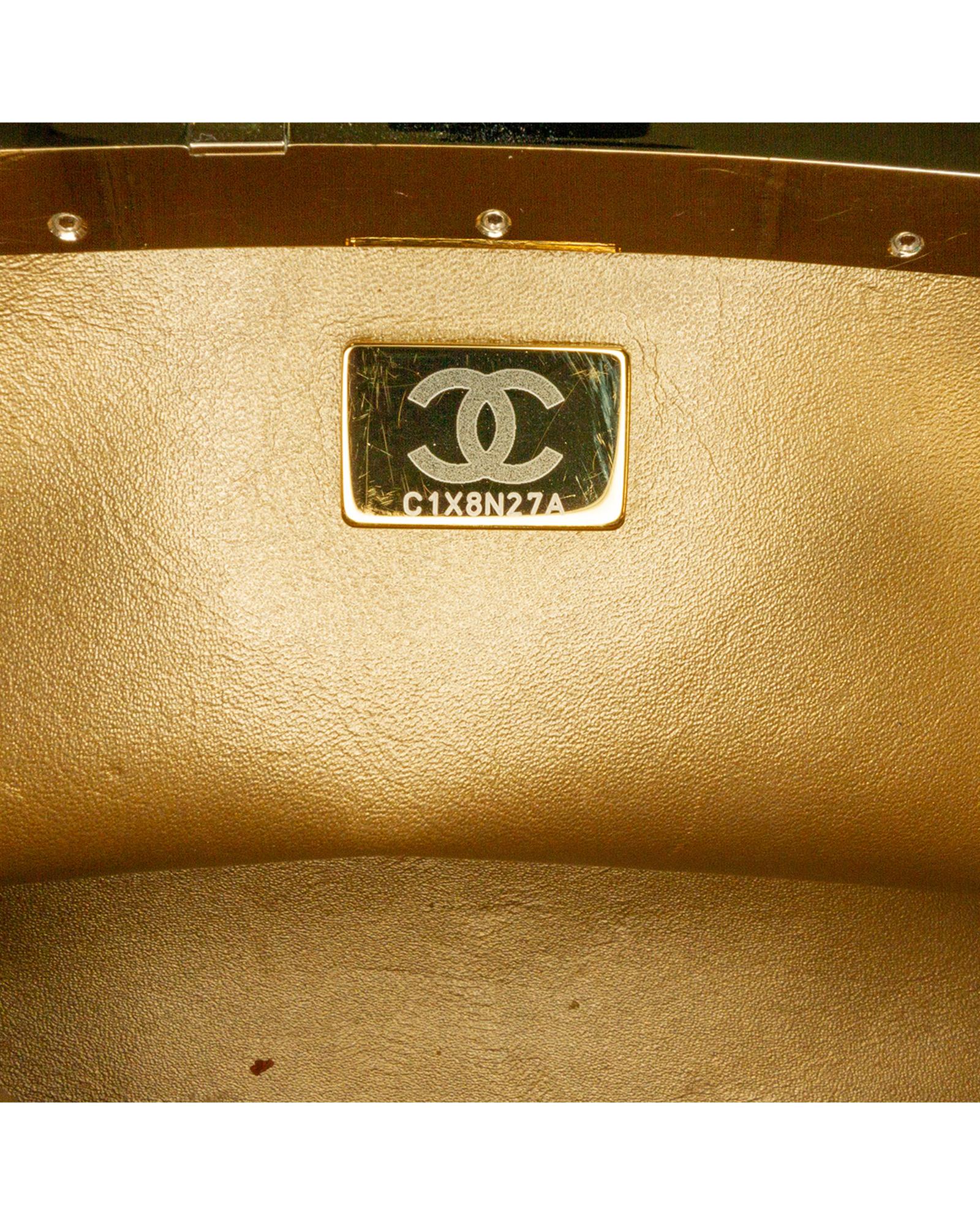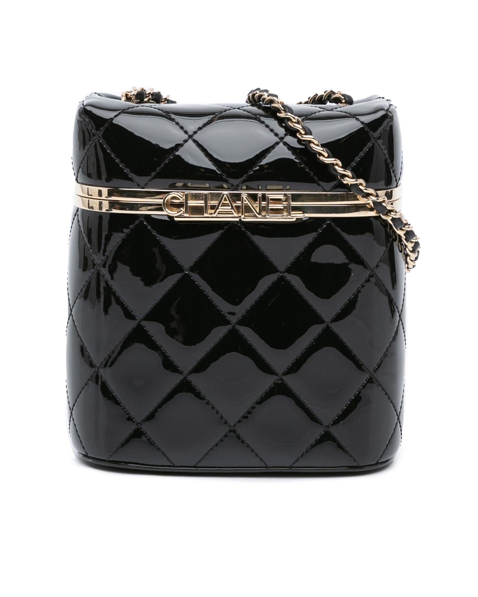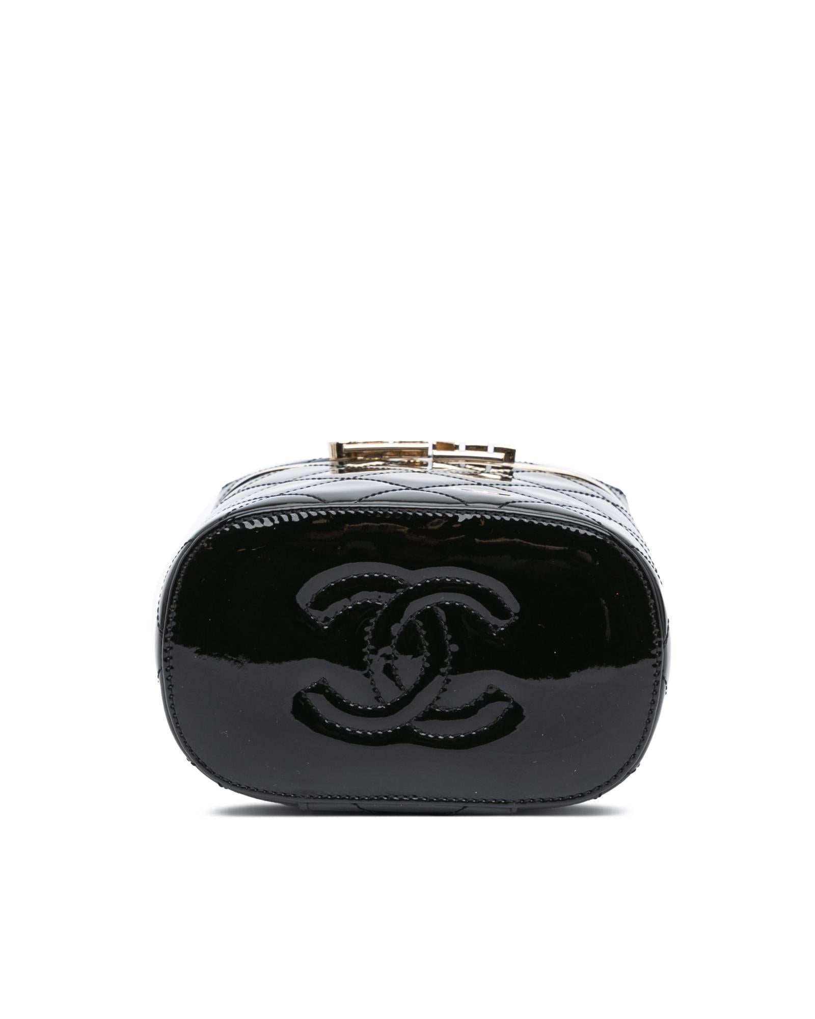 This vanity bag features a quilted patent leather body a leather-woven chain strap a top clasp closure and an interior slip pocket.Brand: Chanel Vintage