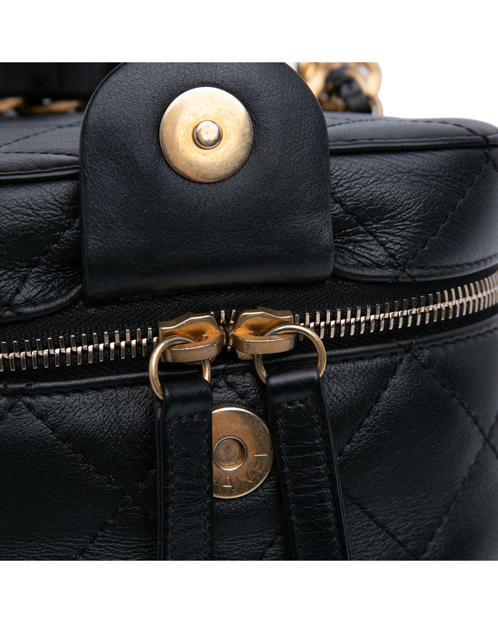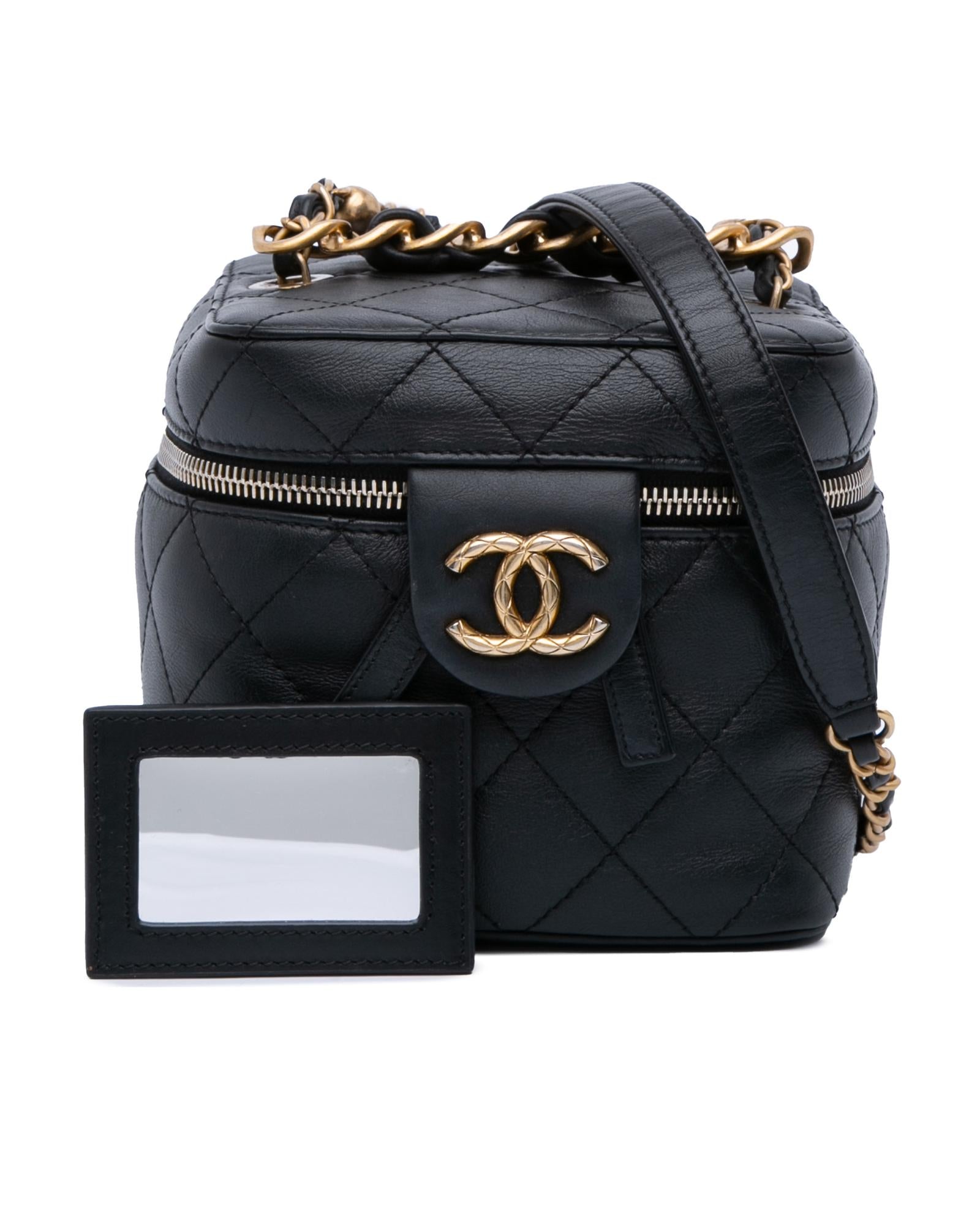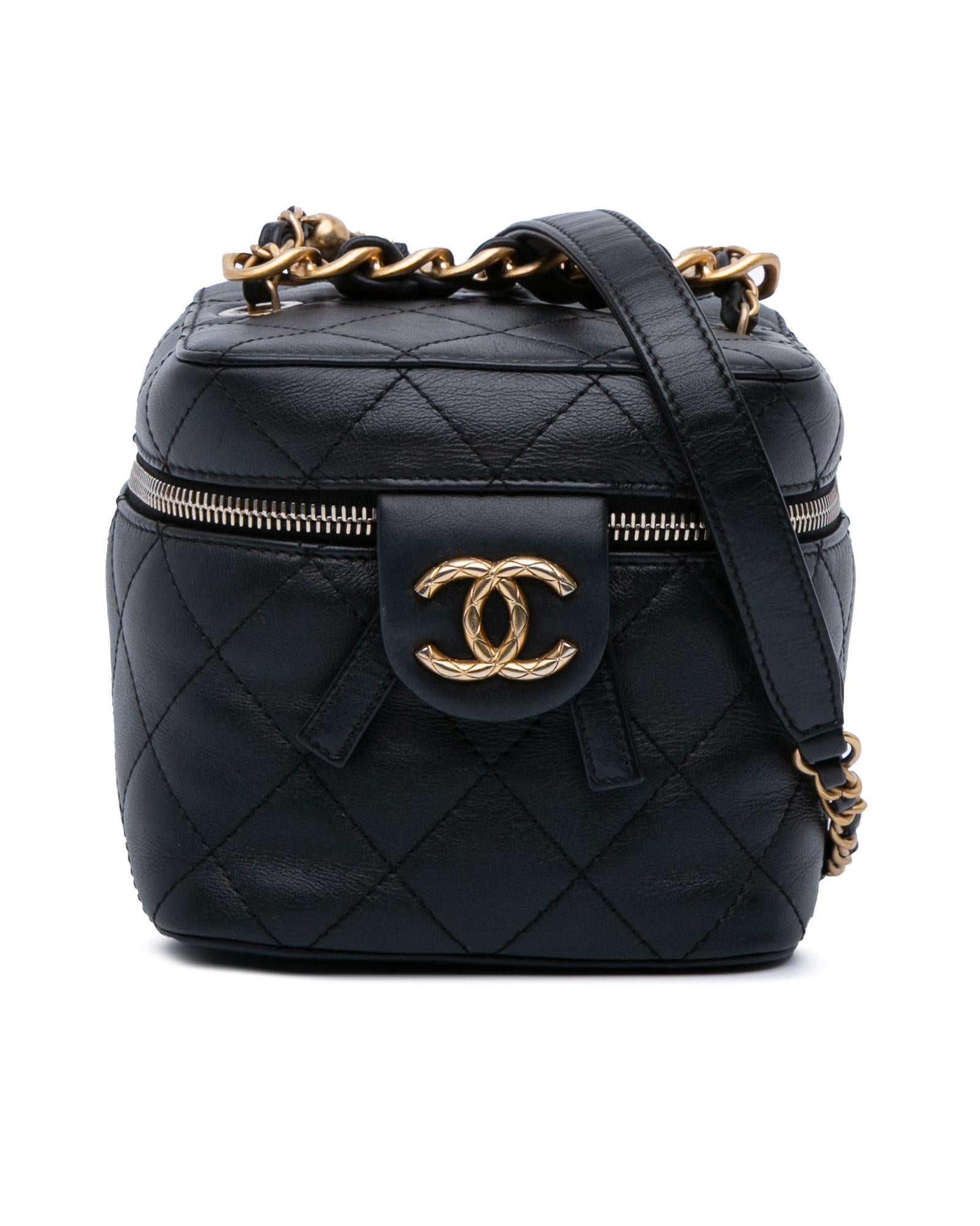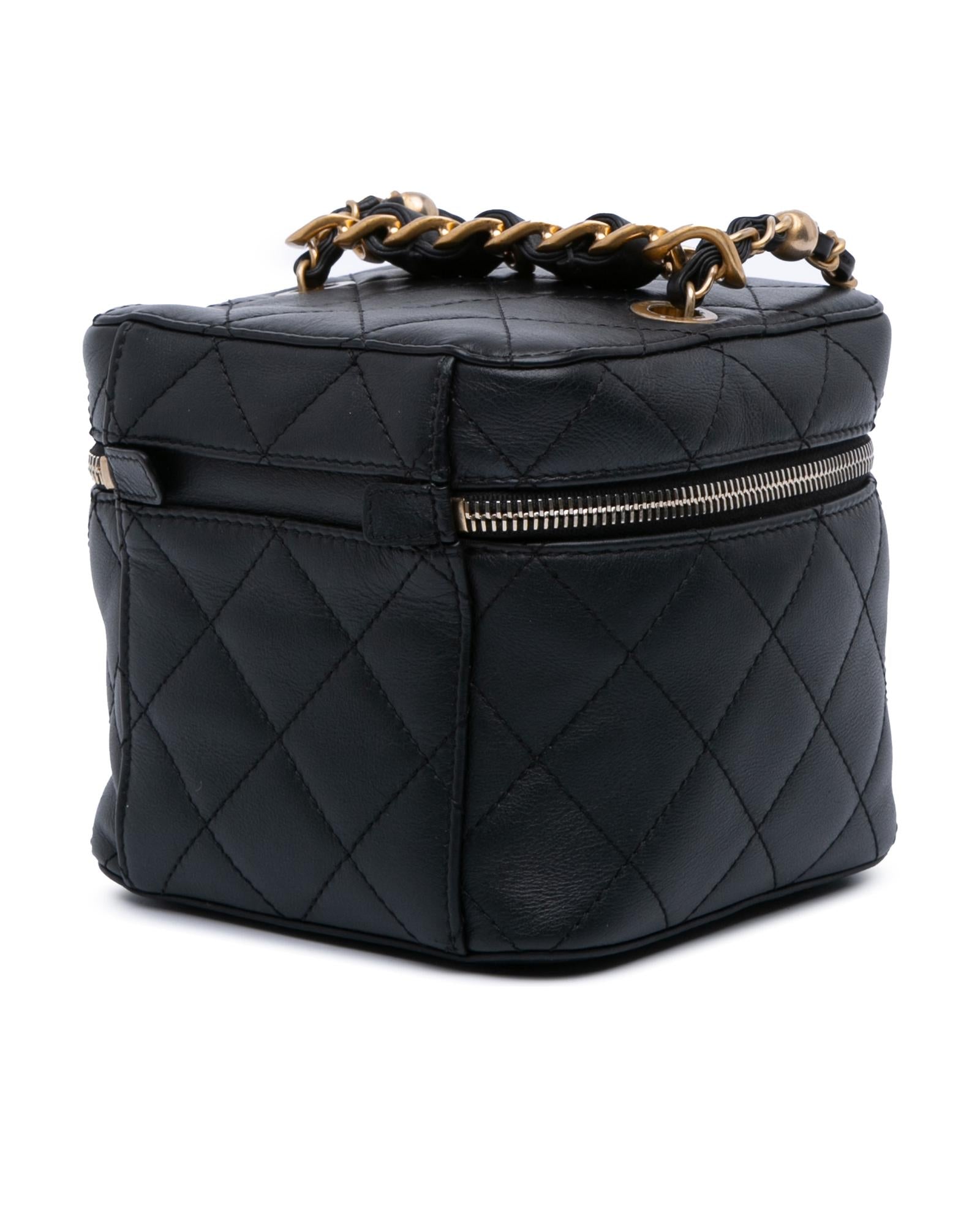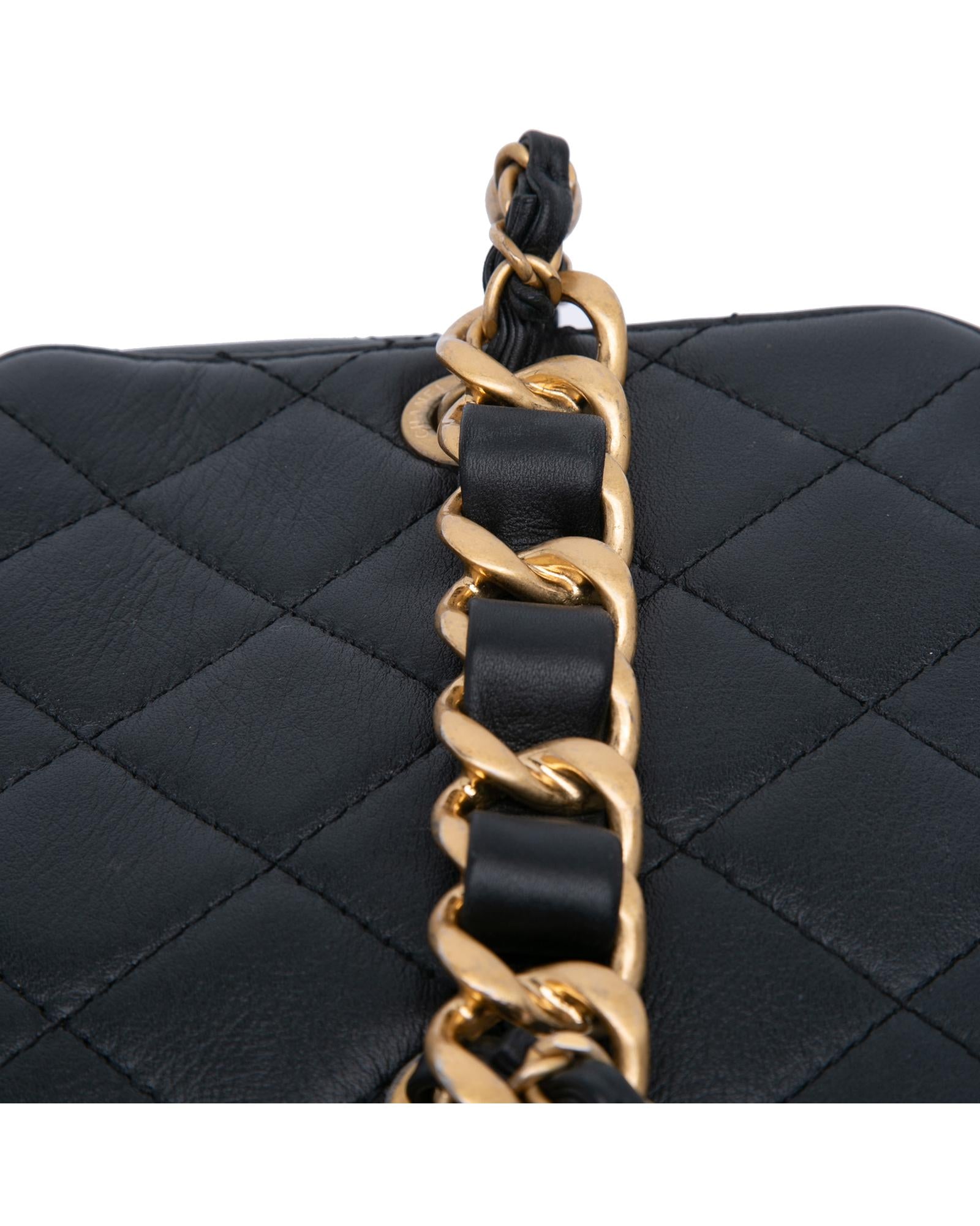 This crossbody bag features a quilted lambskin leather body a leather woven chain strap with leather guard a top flap with magnetic closure and zip around closure.