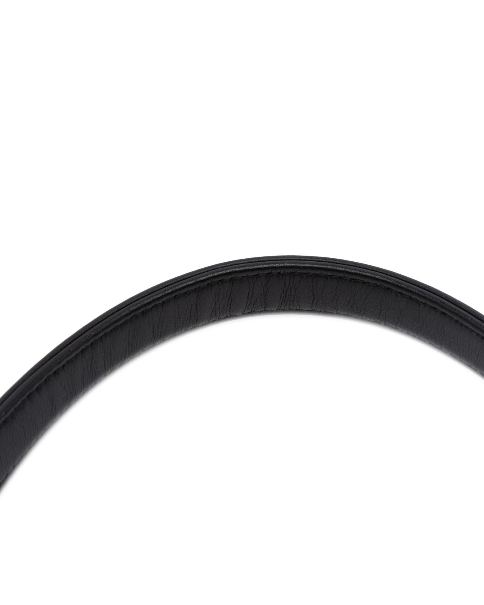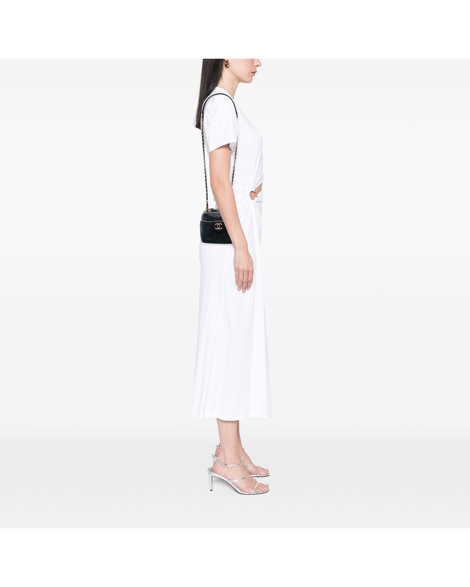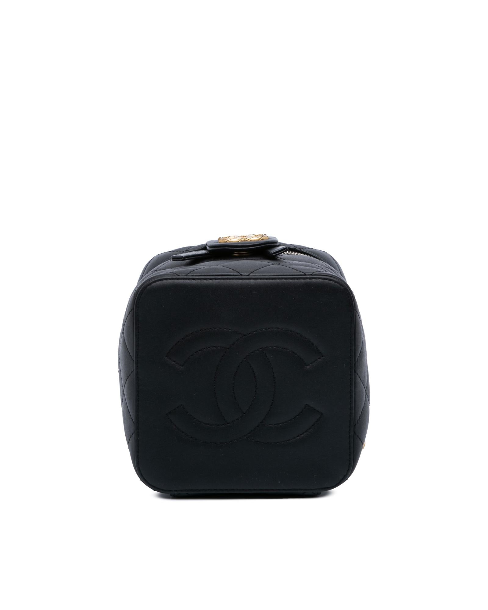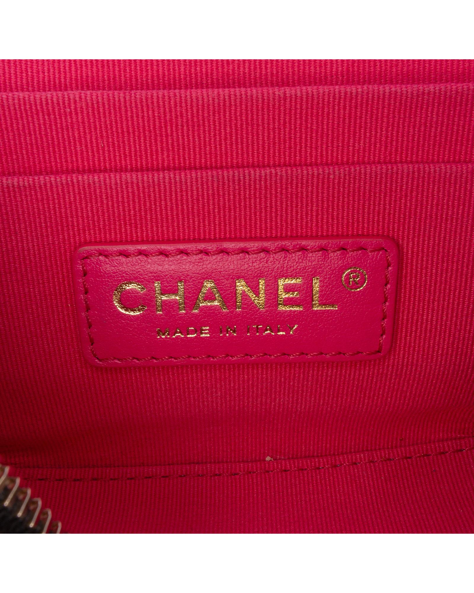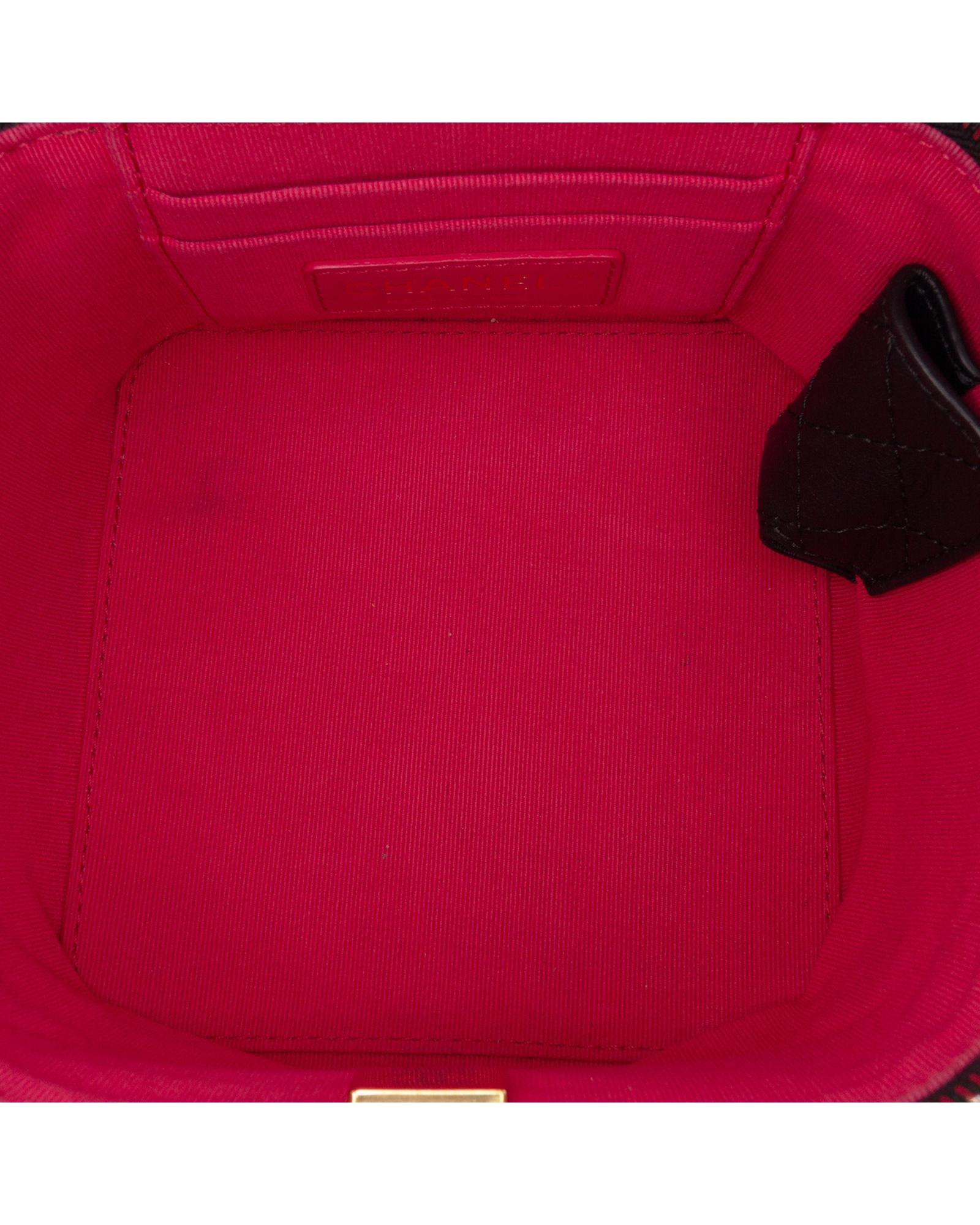 This crossbody bag features a quilted lambskin leather body a leather woven chain strap with leather guard a top flap with magnetic closure and zip around closure.