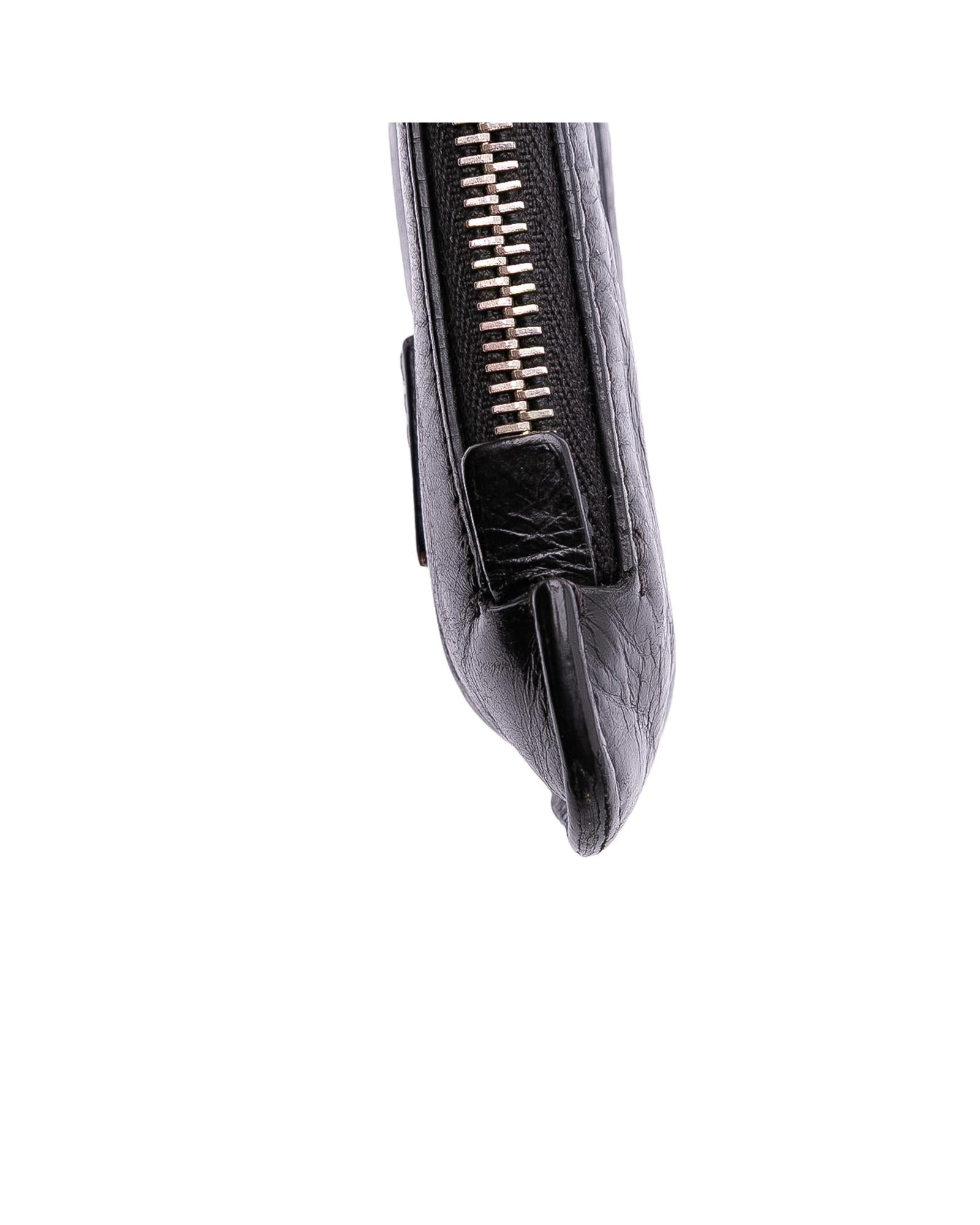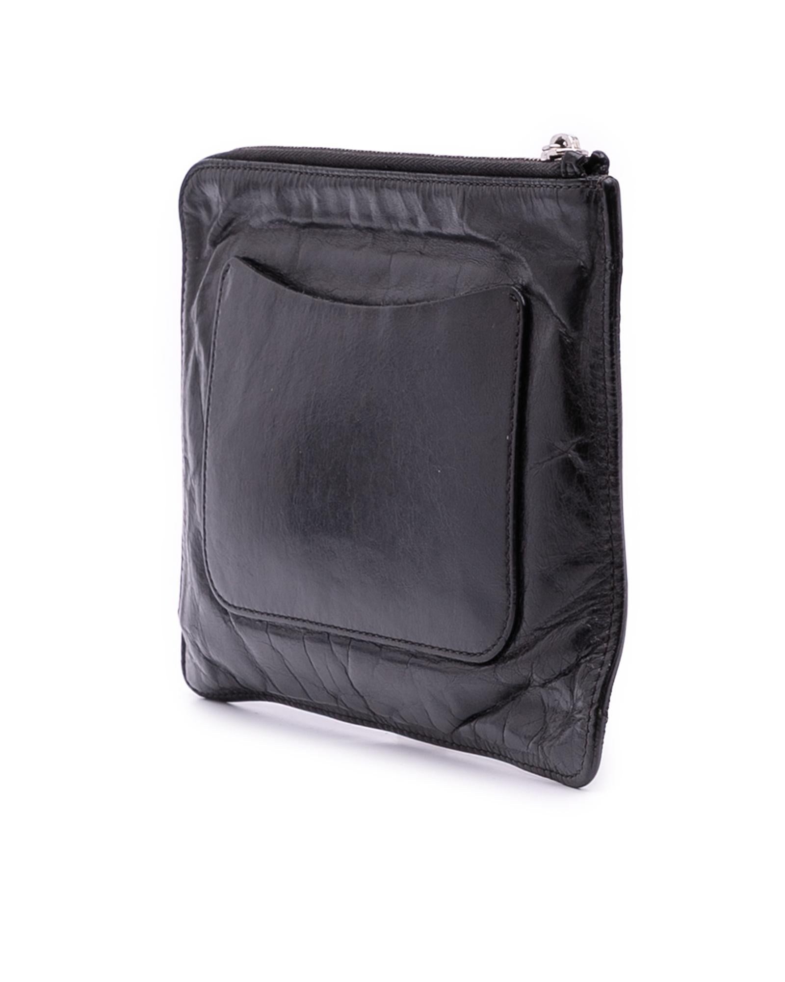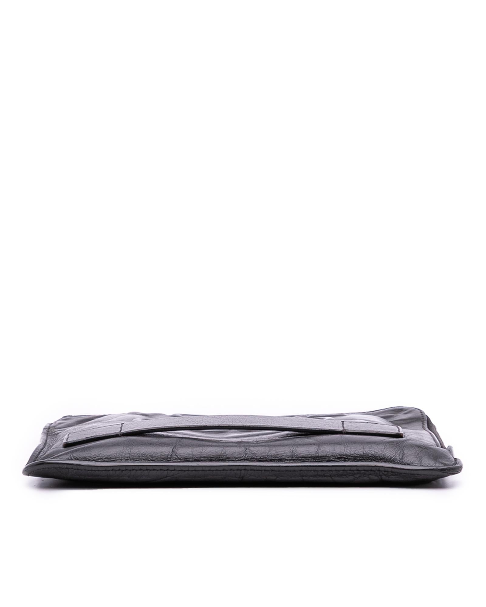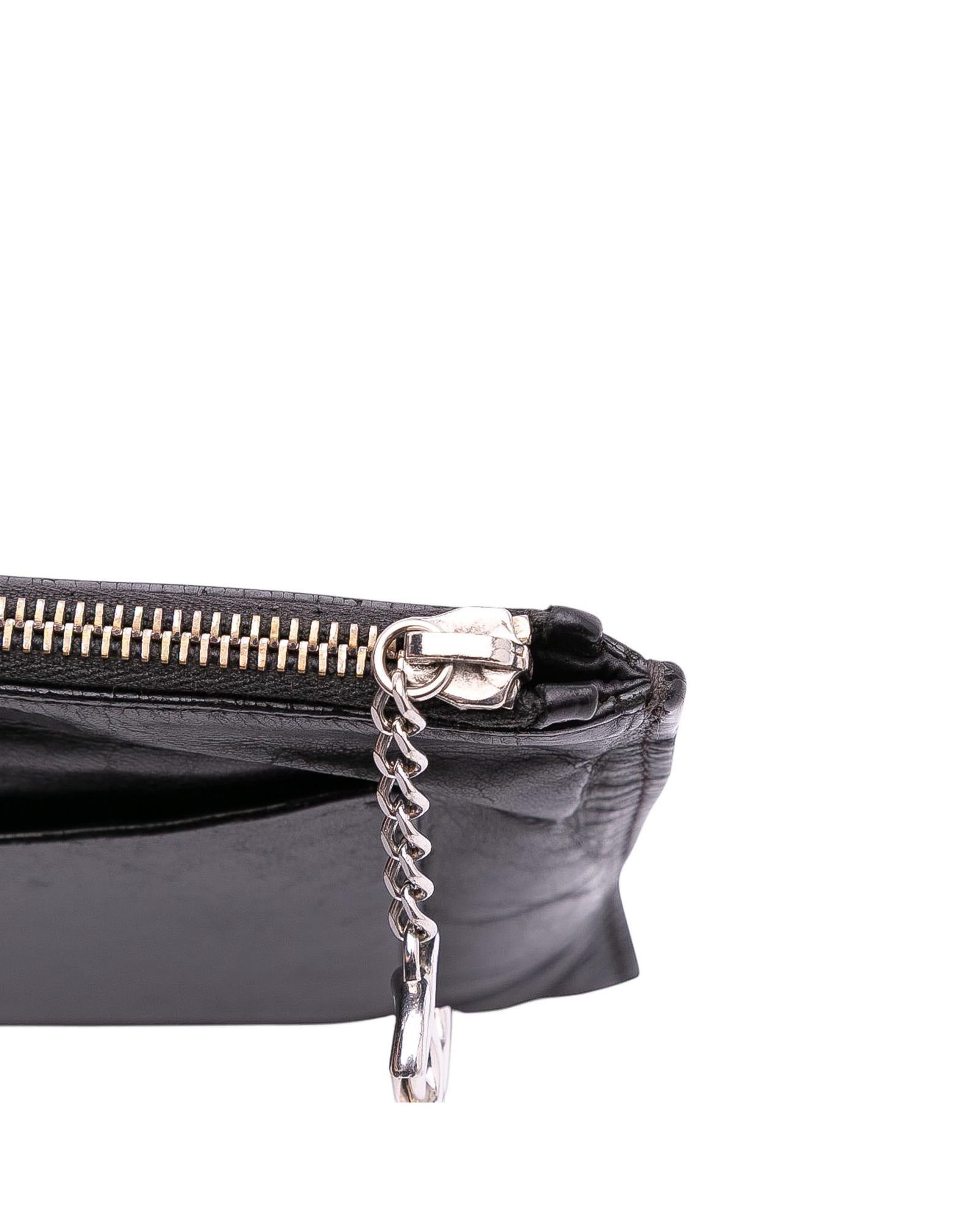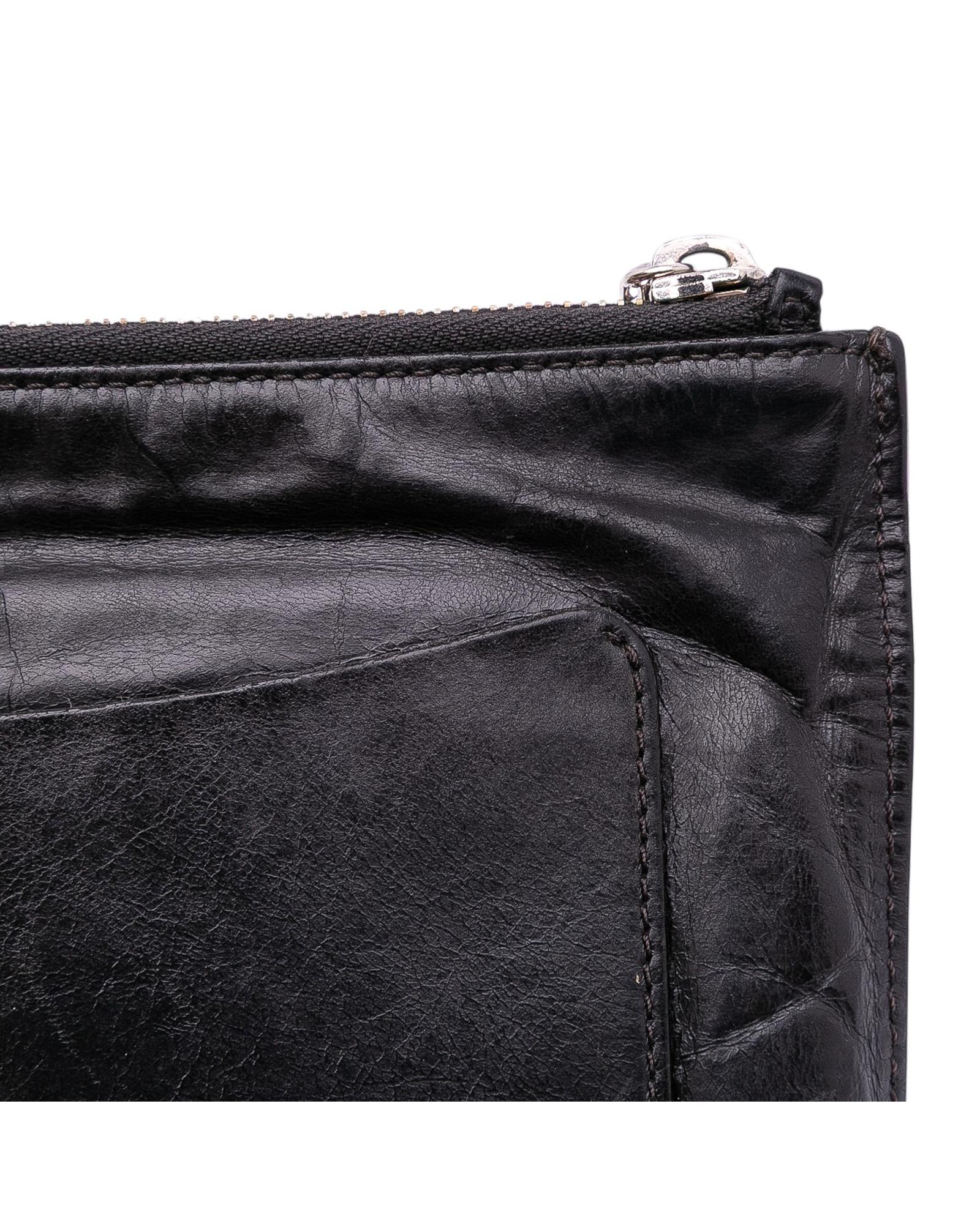 This clutch bag features a lambskin leather body an exterior back slip pocket a top zip closure and interior zip and slip pockets.