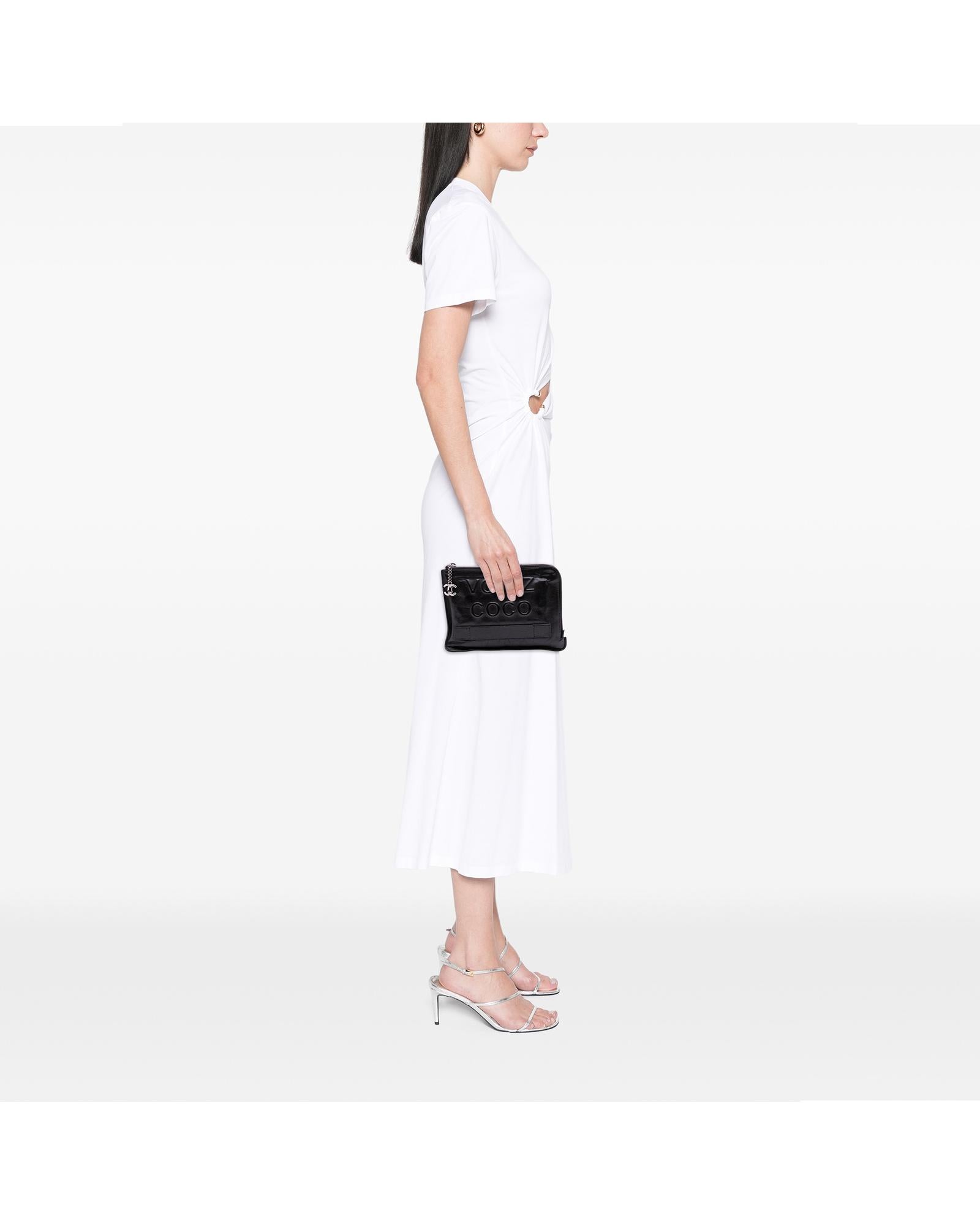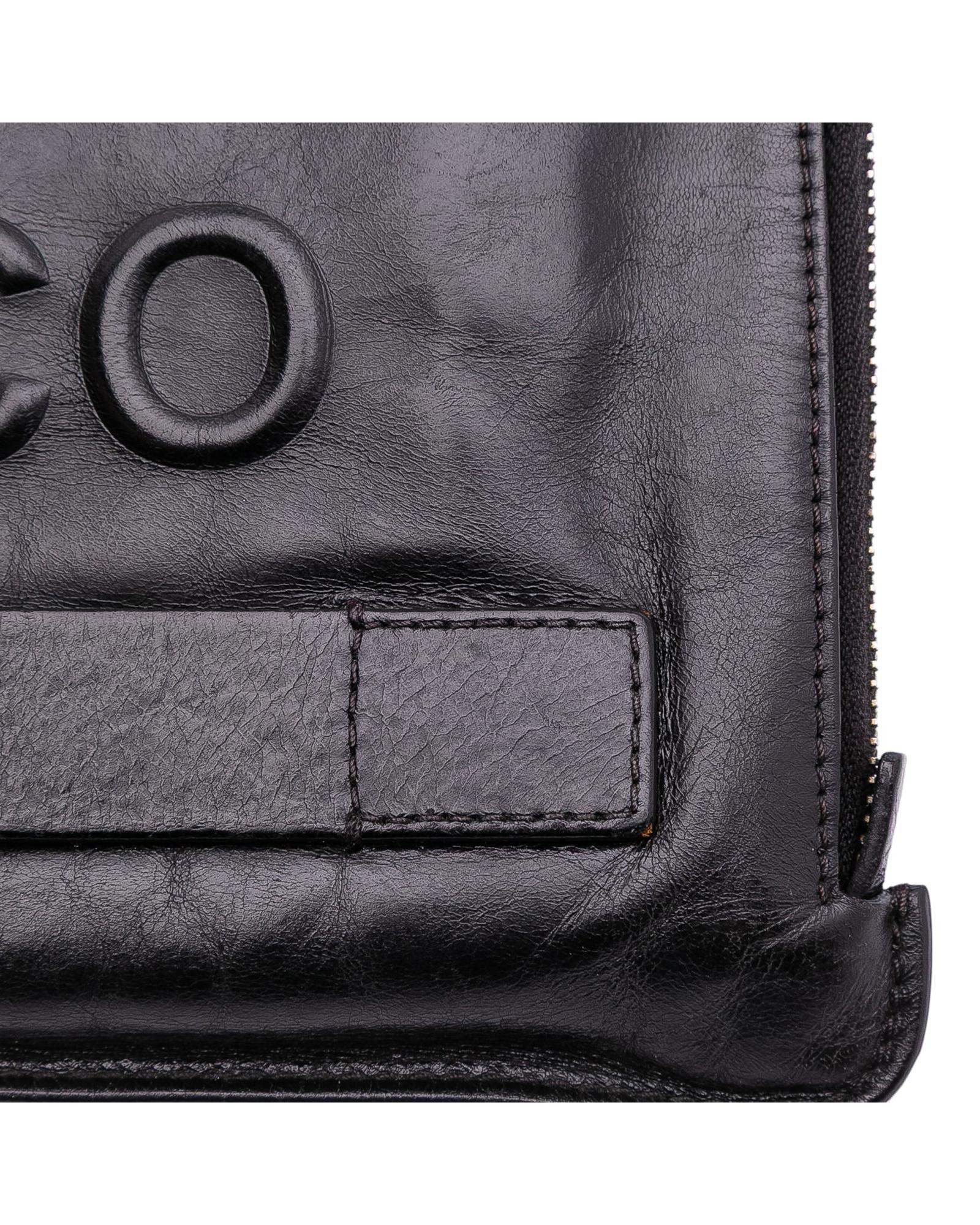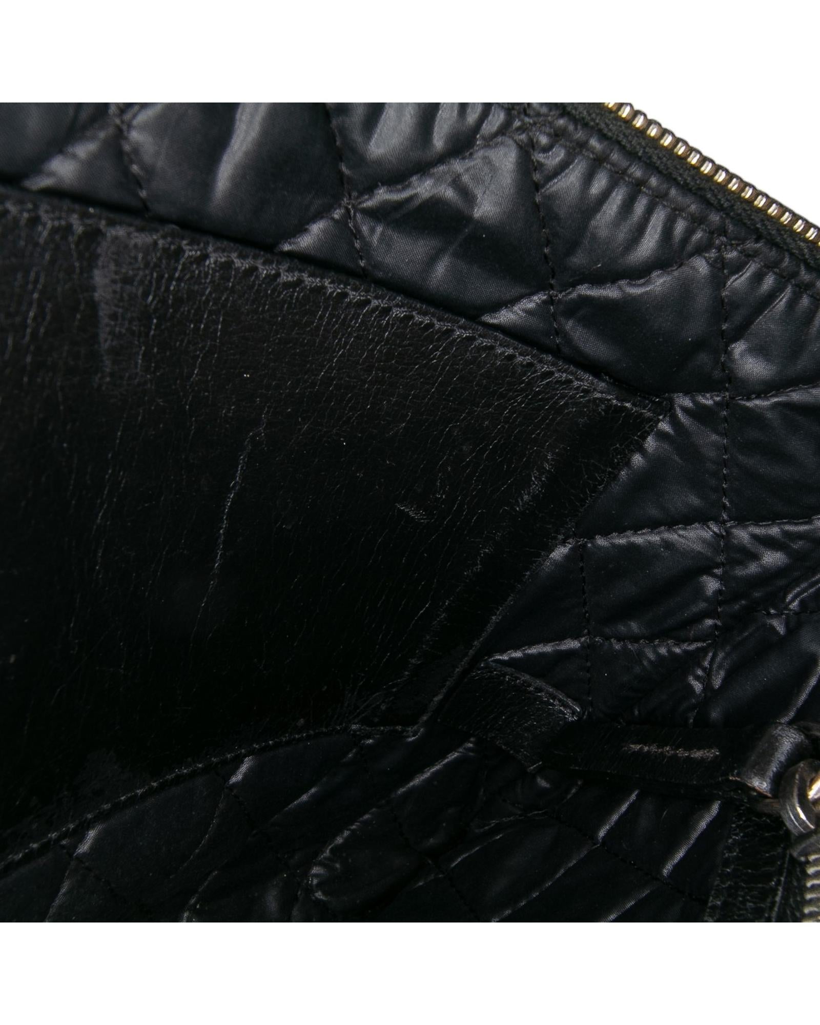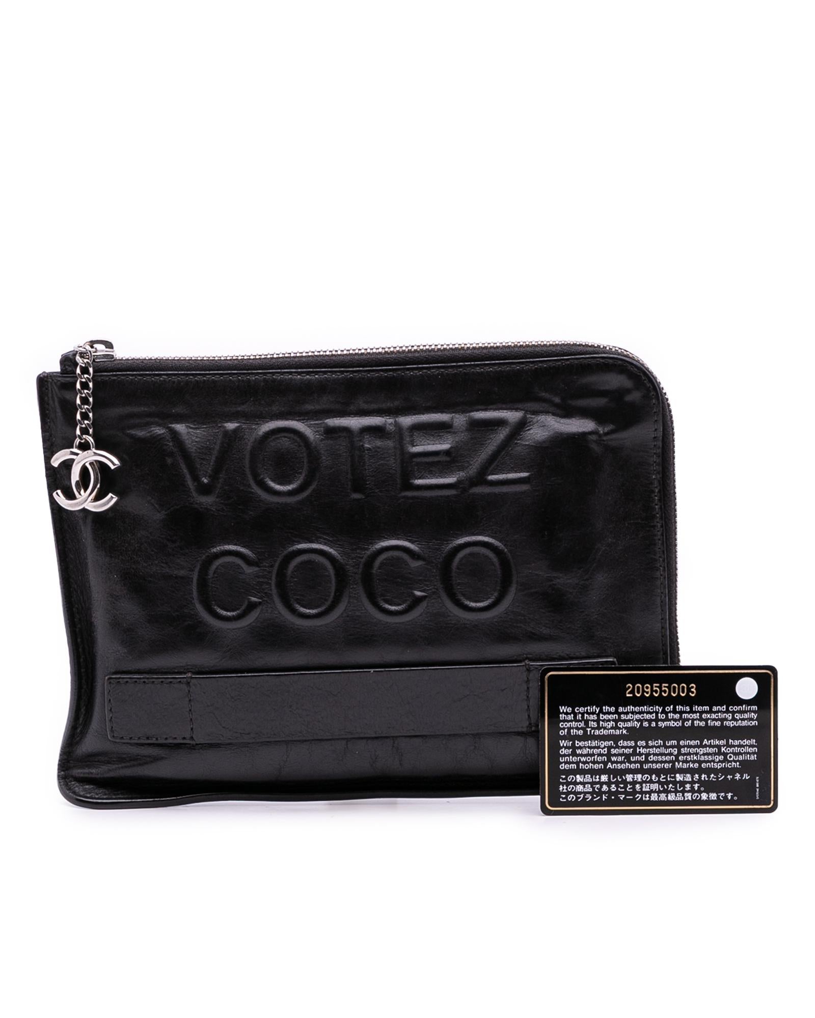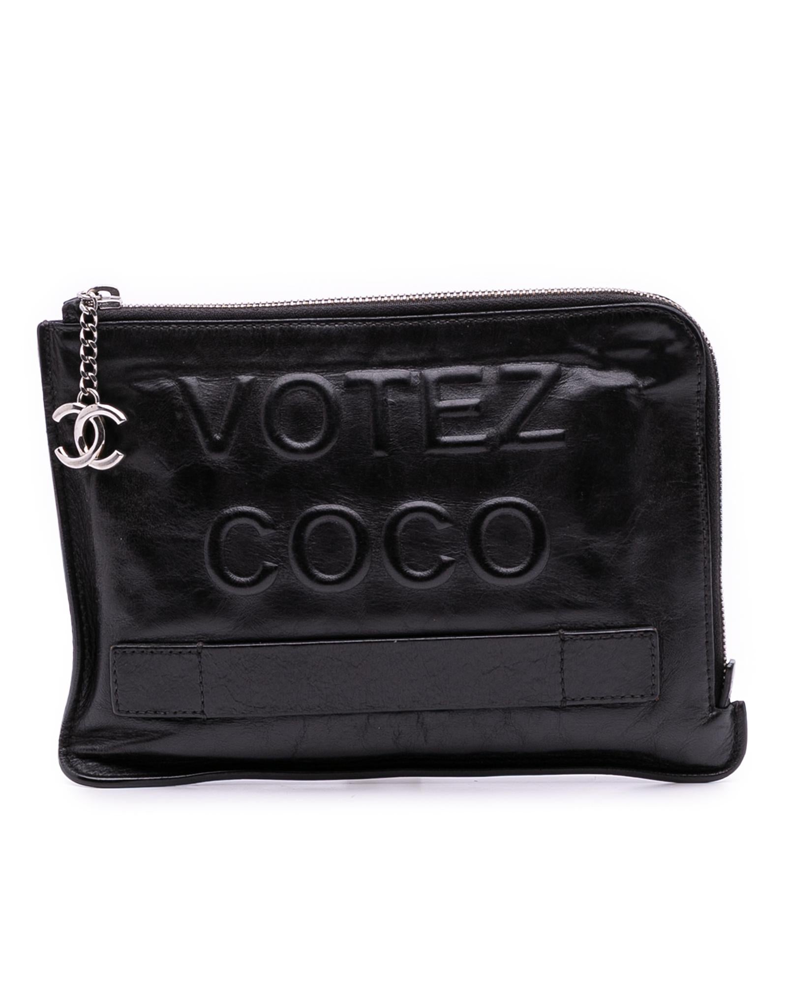 This clutch bag features a lambskin leather body an exterior back slip pocket a top zip closure and interior zip and slip pockets.