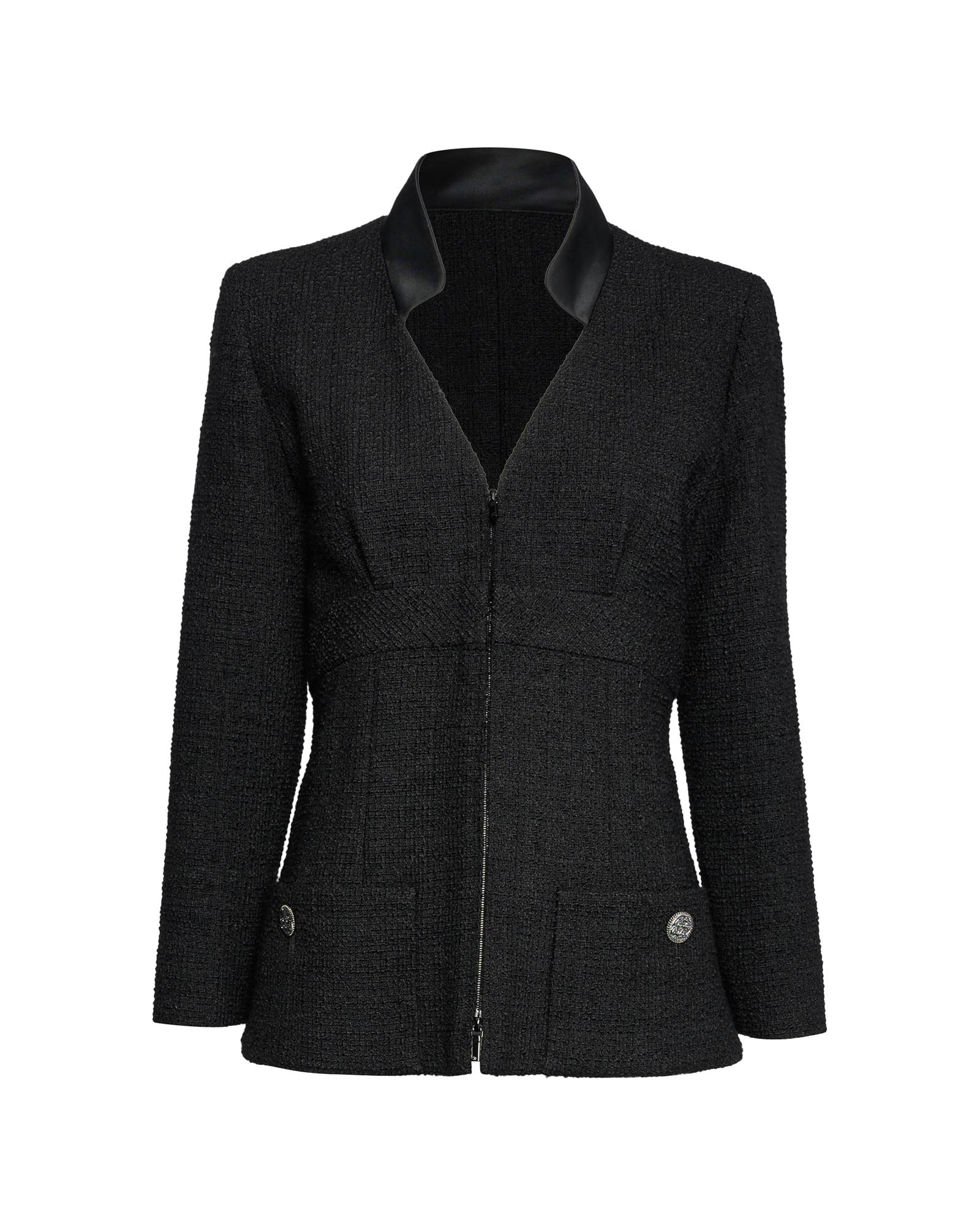 Textured Tweed Blazer with Collar and Front Zip Closure