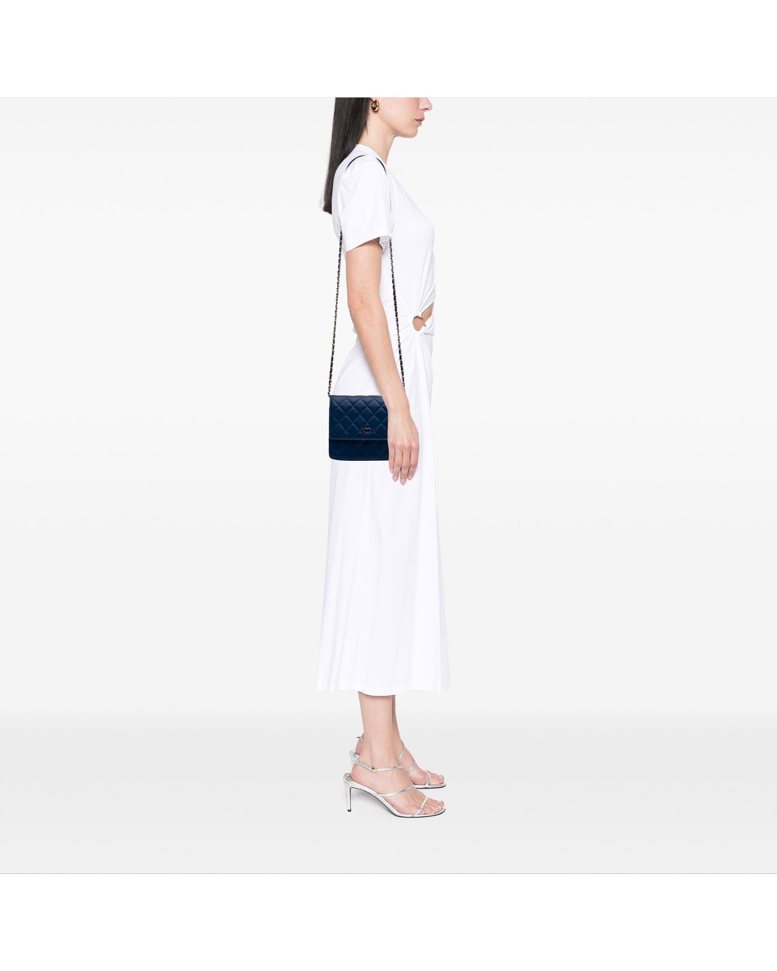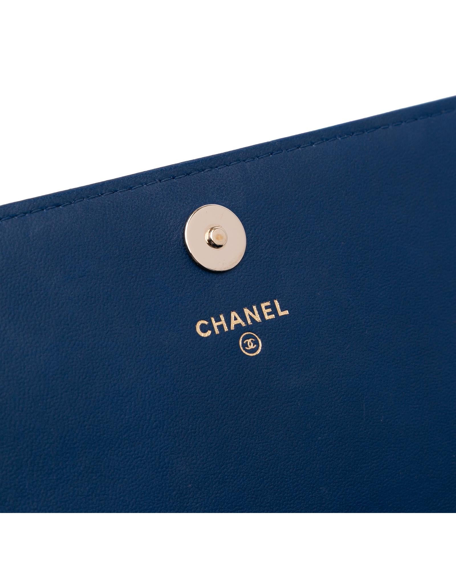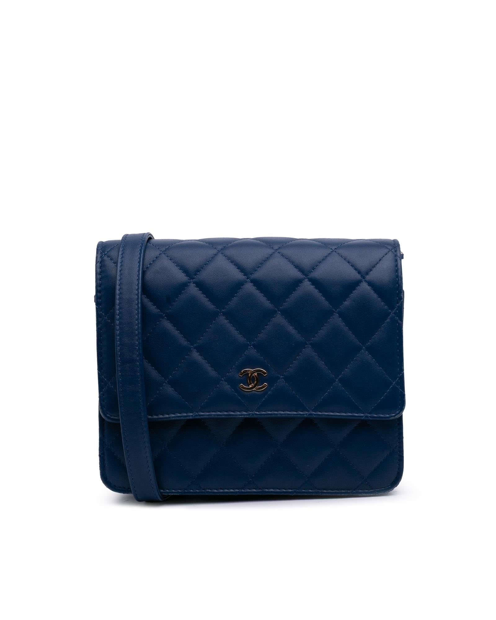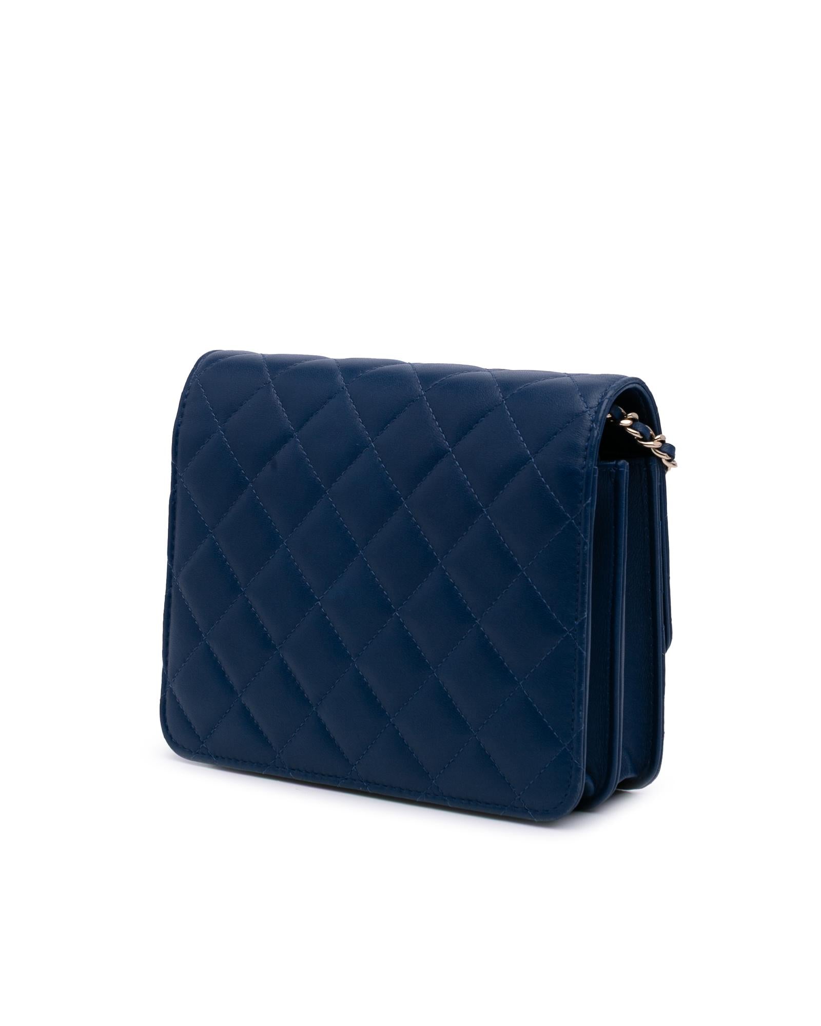 This wallet on chain features a quilted lambskin leather body a leather woven chain strap with leather guard a front flap with magnetic snap closure and interior zip and slip pockets.Brand: Chanel
