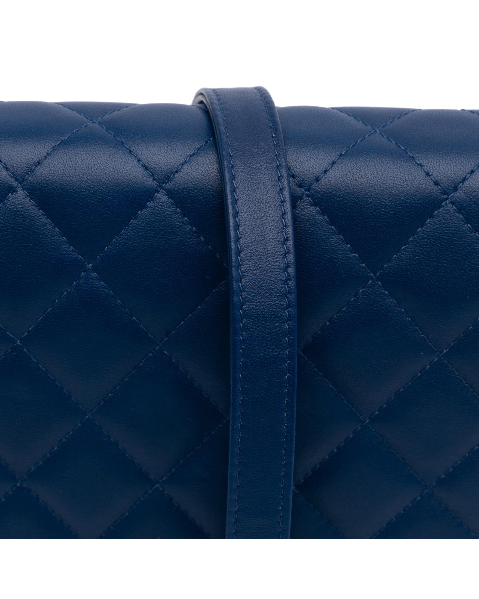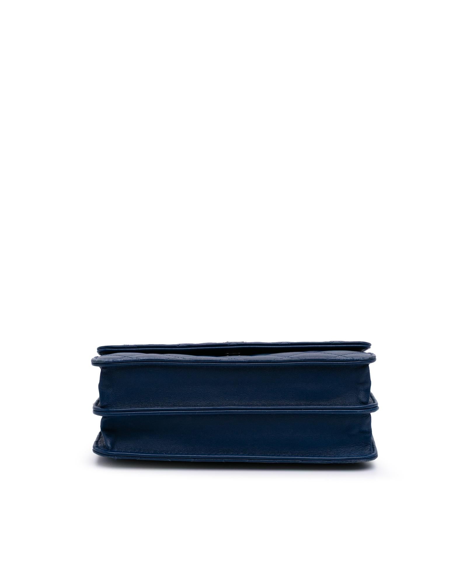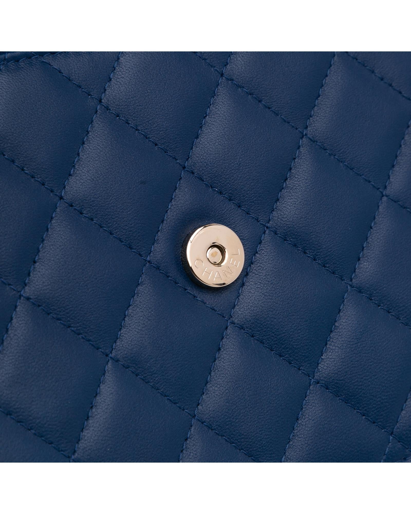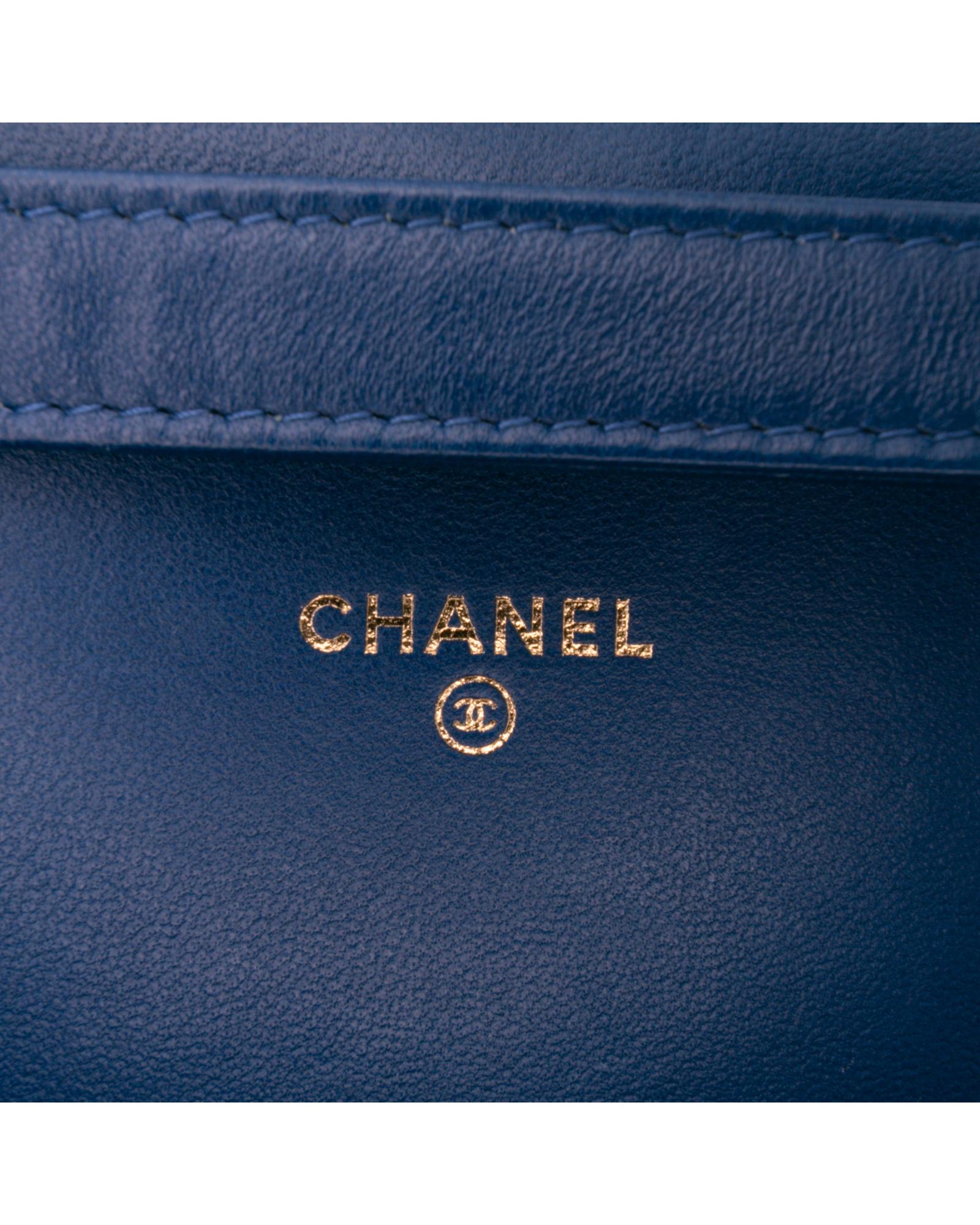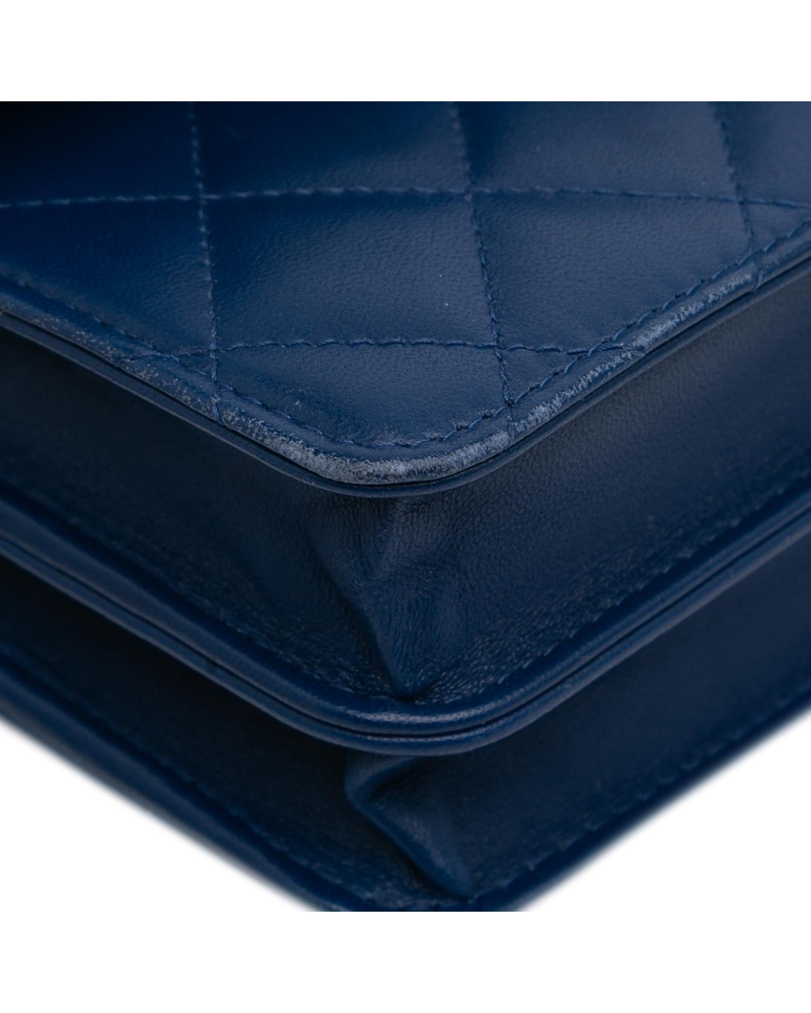This wallet on chain features a quilted lambskin leather body a leather woven chain strap with leather guard a front flap with magnetic snap closure and interior zip and slip pockets.Brand: Chanel