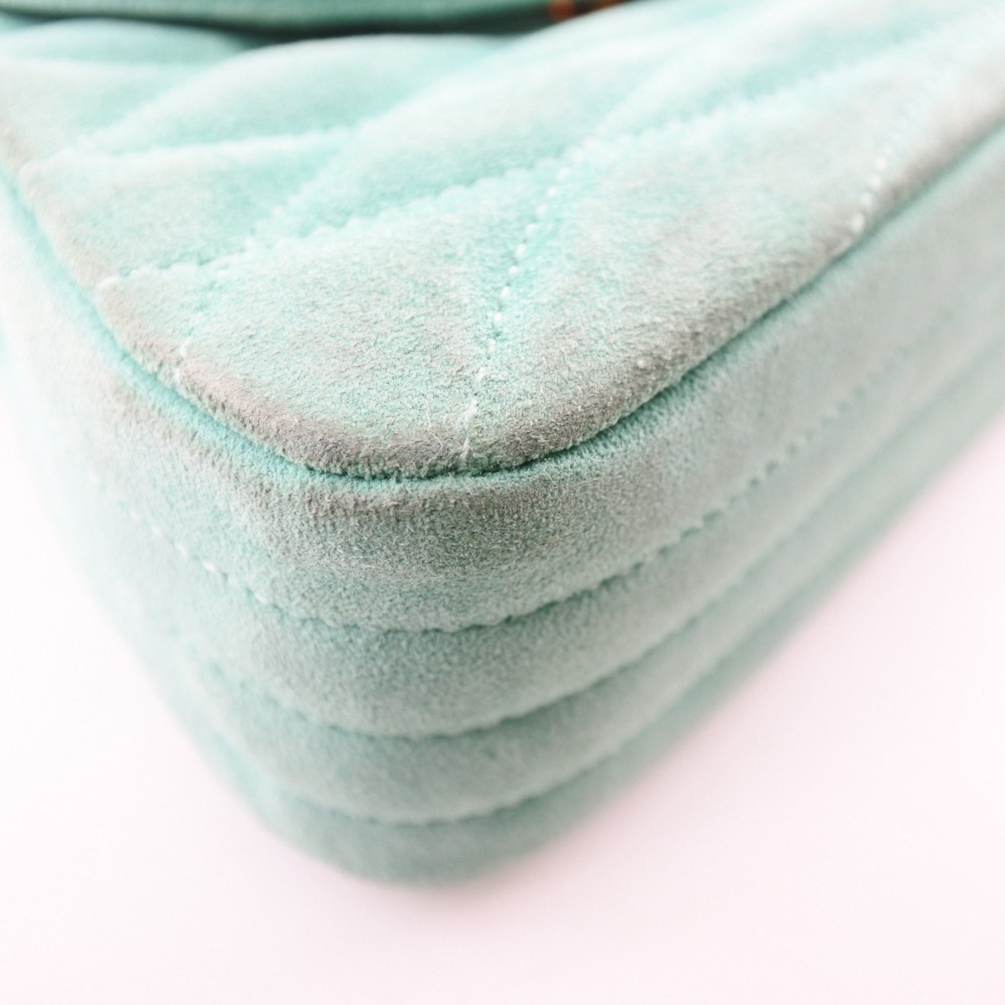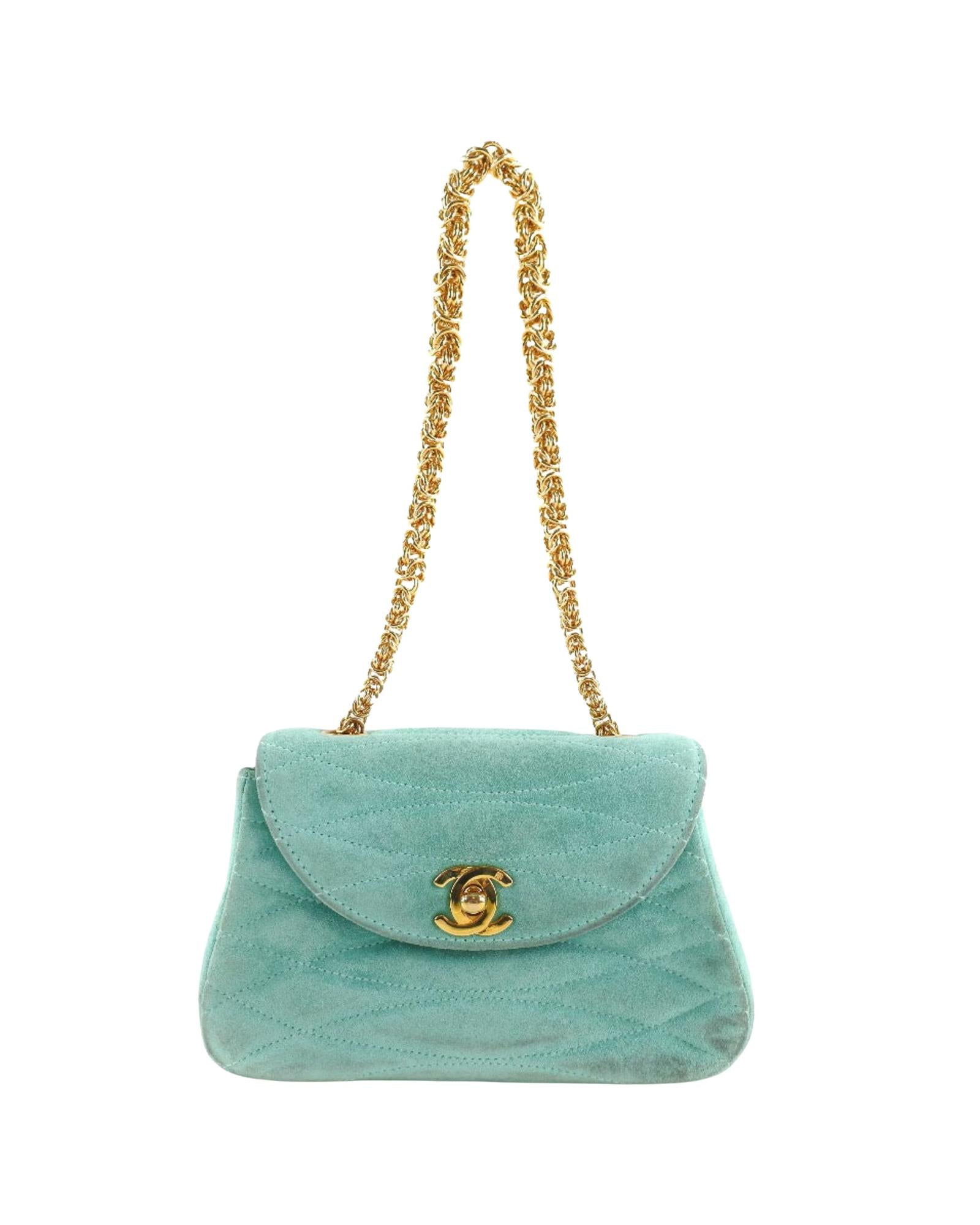 Chanel's Coco Mark handbag originating from France boasts a vintage allure with its green suede exterior and opulent gold hardware. Designed for women this iconic piece features a turn-lock closure.
