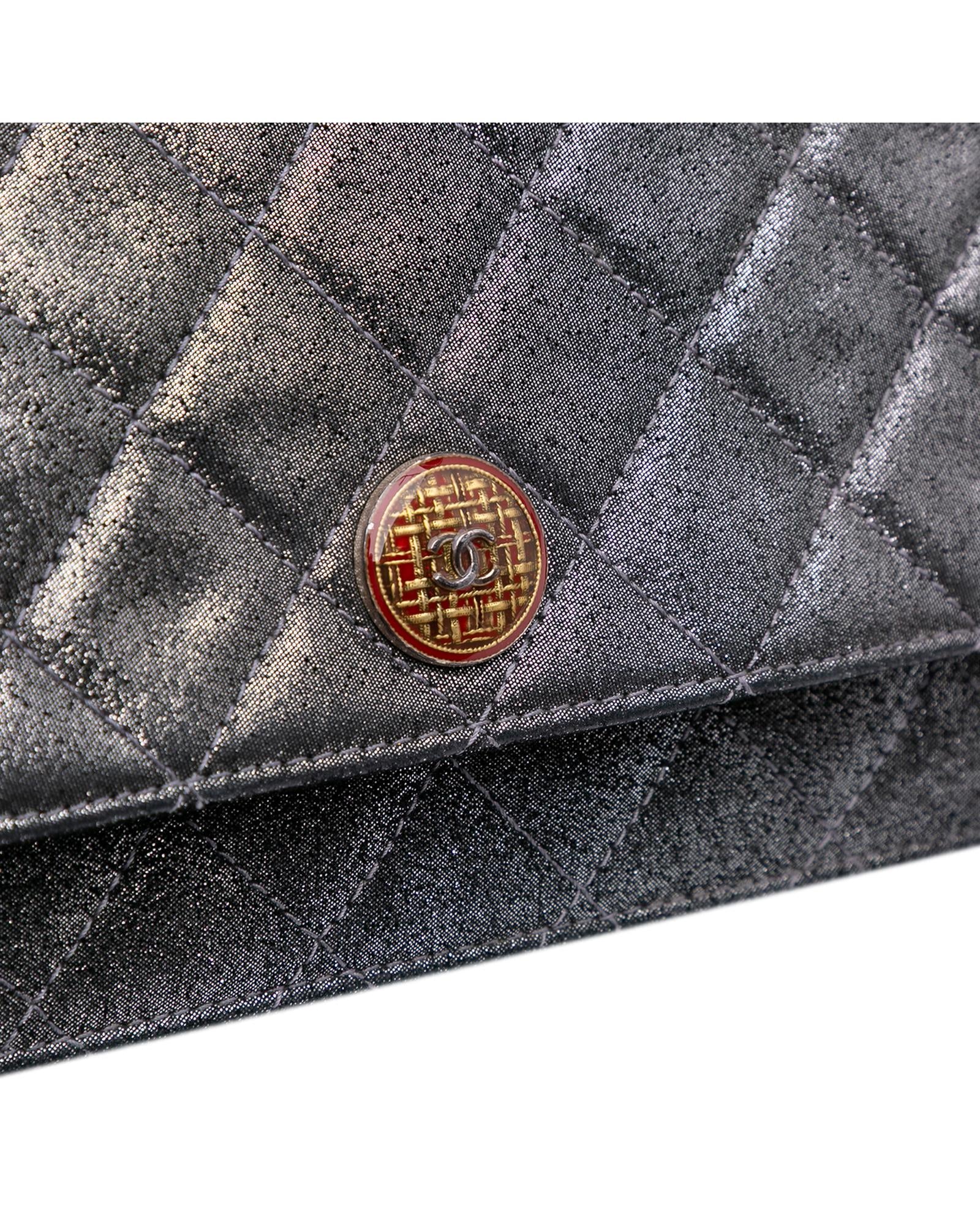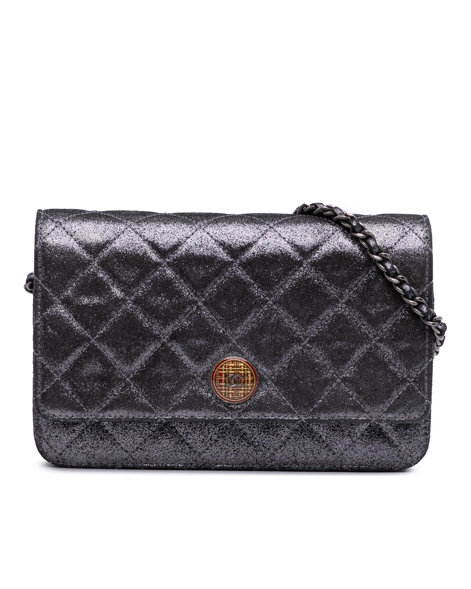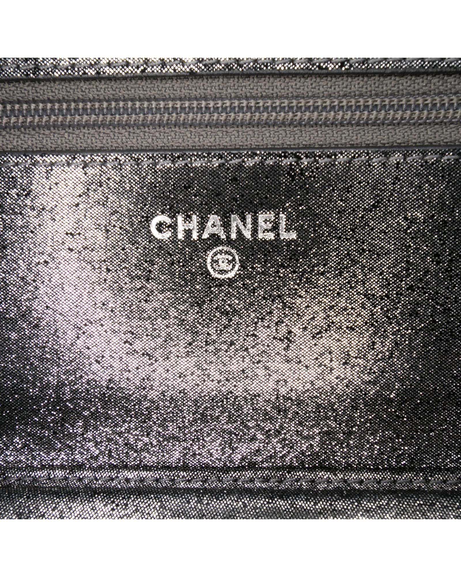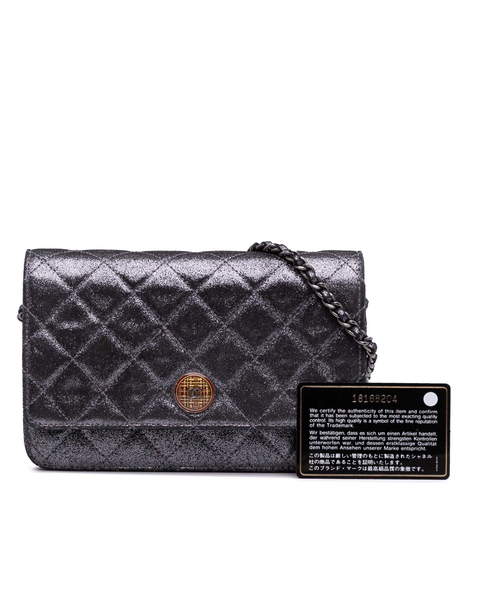 This wallet on chain features a quilted iridescent lambskin body a leather-woven chain link strap a front flap with snap closure and interior zip and slip pockets.Brand: Chanel