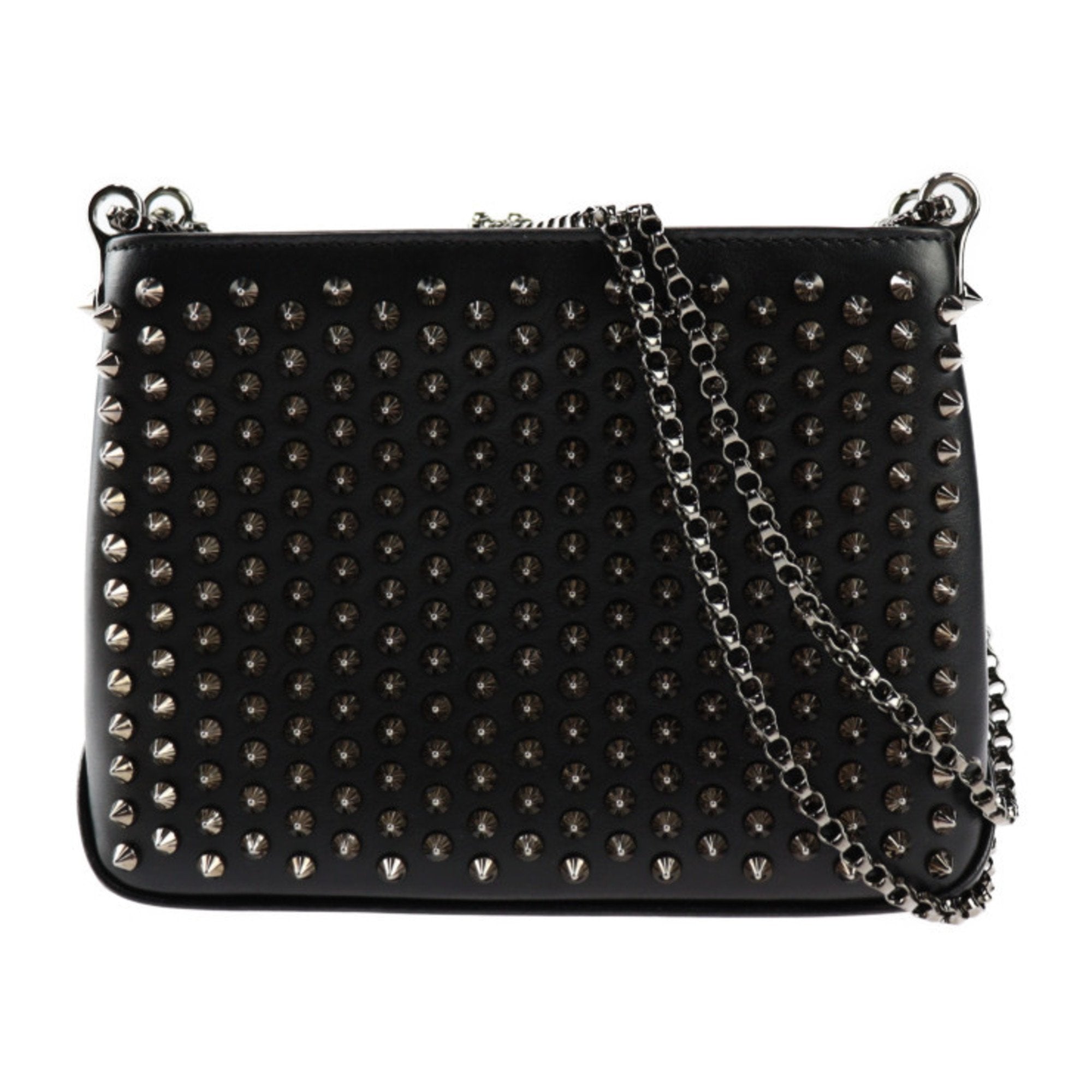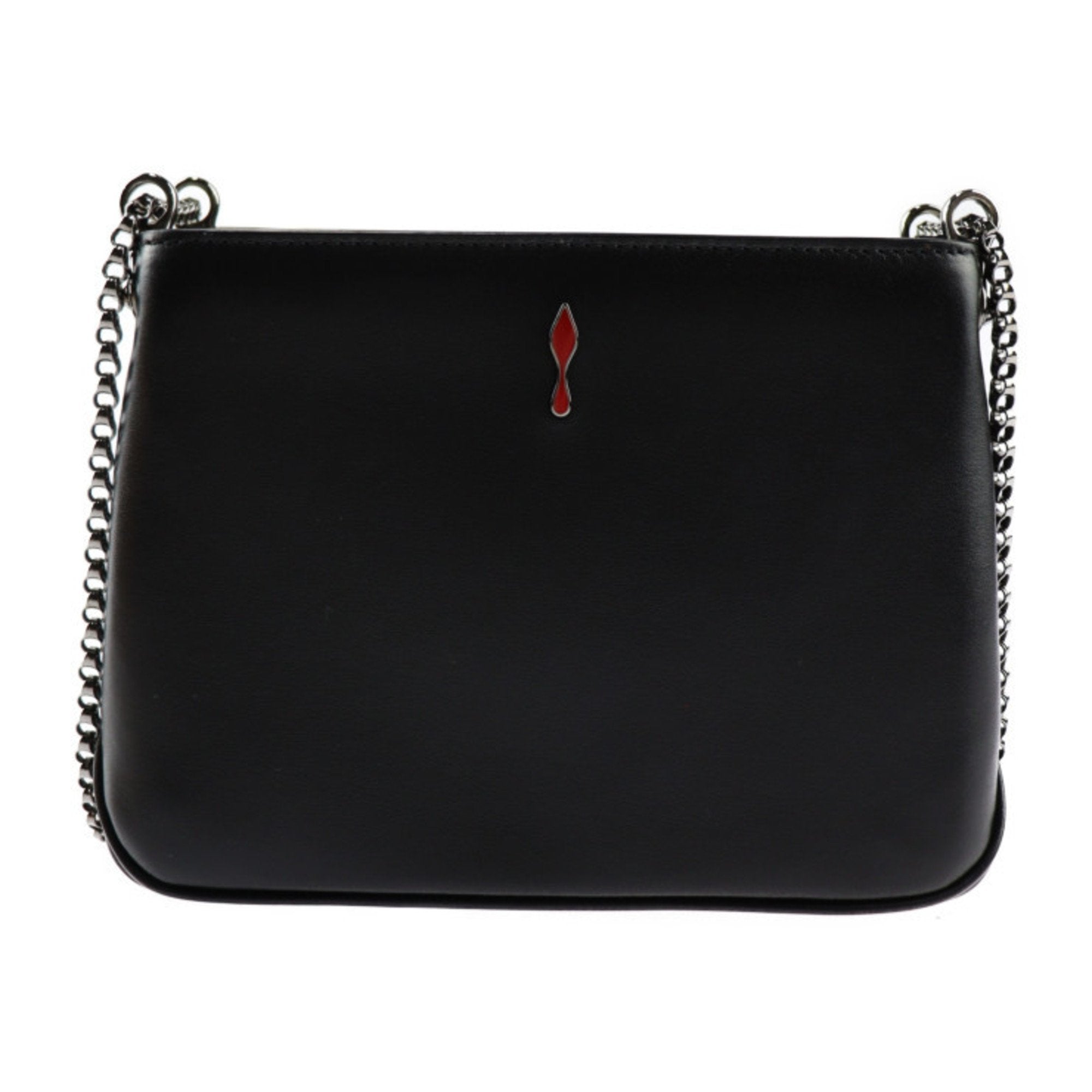 The renowned Christian Louboutin Triloubi shoulder bag crafted in black leather with silver metal accents features a distinctive silver metal chain handle for versatile shoulder or crossbody wear. The bag is secured with a zip closure and its interior is lined with iconic red canvas offering three compartments for organized storage. This stylish accessory combines luxury and functionality showcasing Christian Louboutin's signature design and attention to detail.