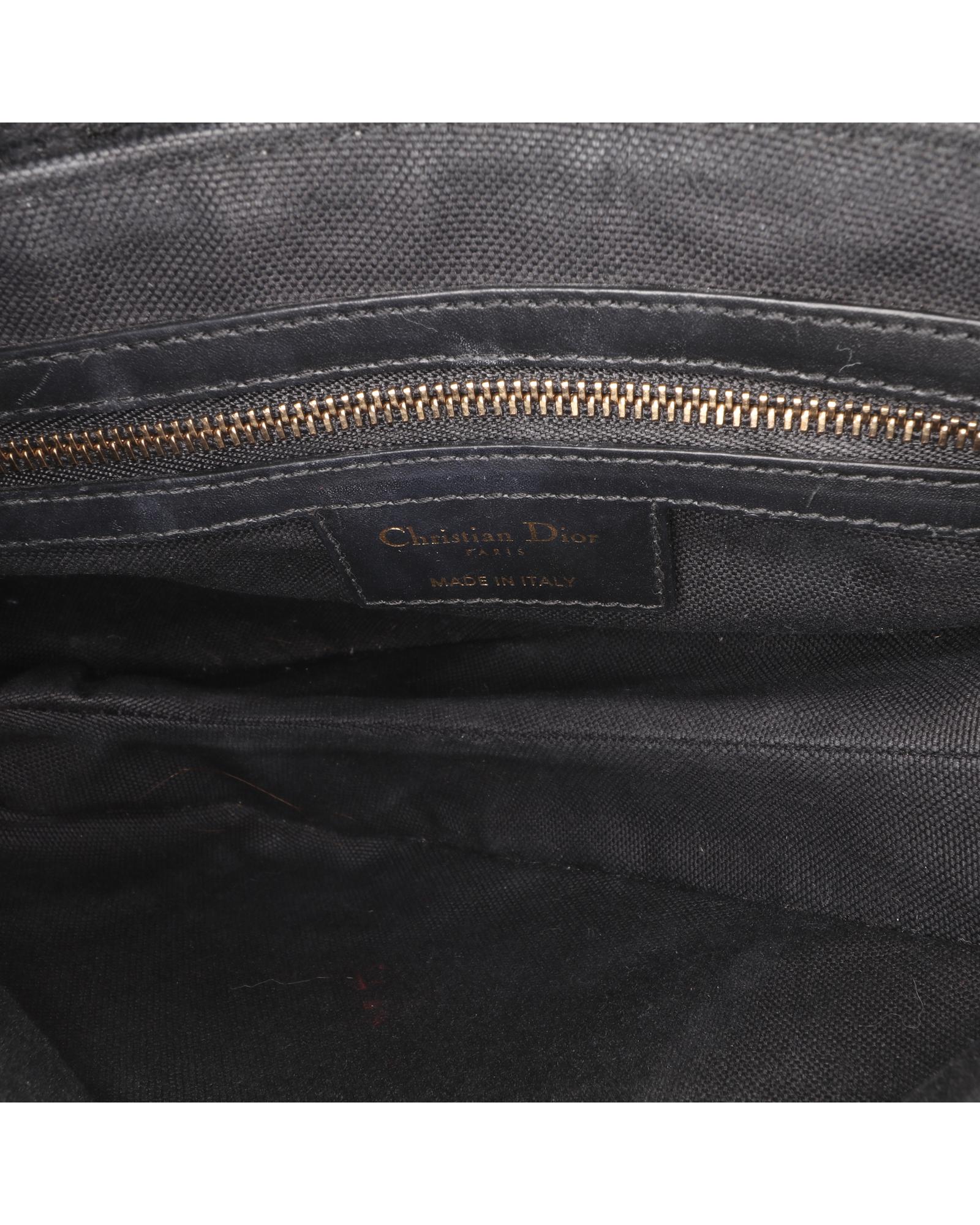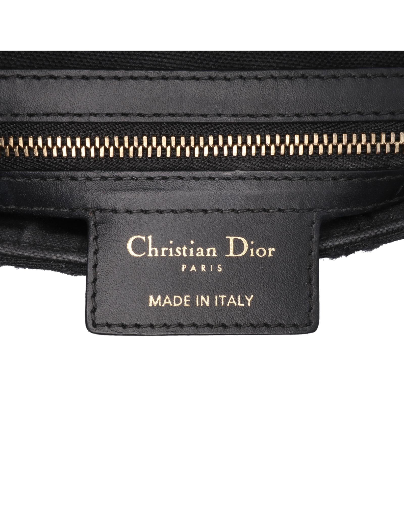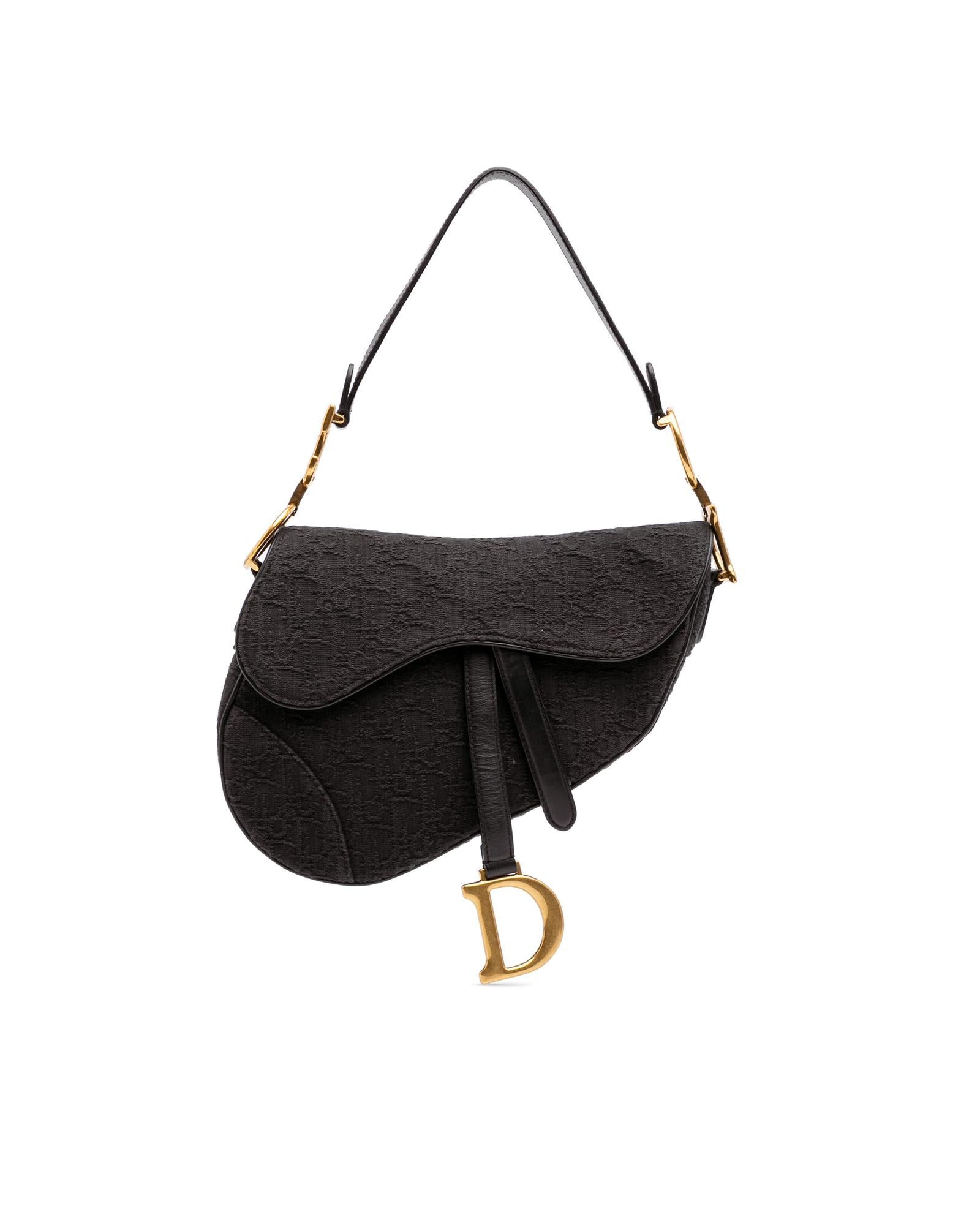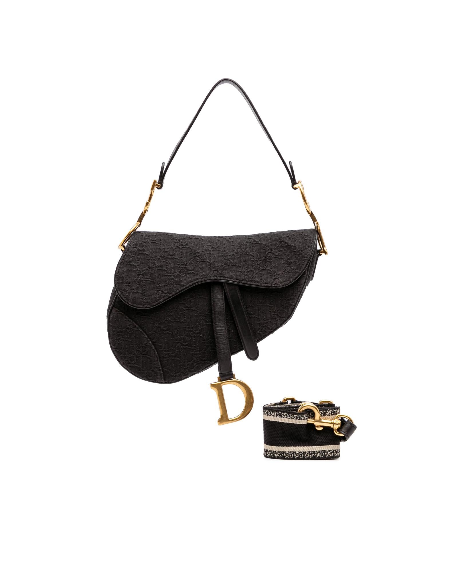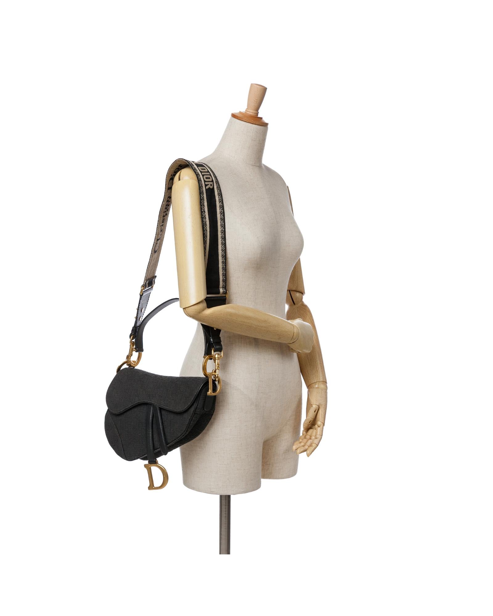 The Saddle features a canvas body with leather trim a flat leather strap with CD hardware a detachable strap a front flap leather tabs with the D charm and an interior zip pocket.