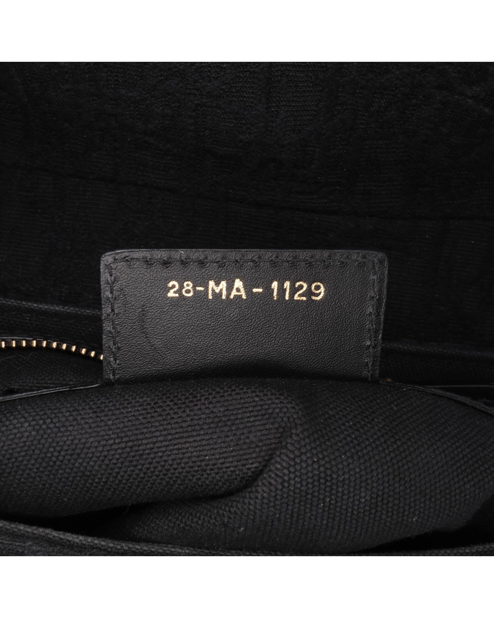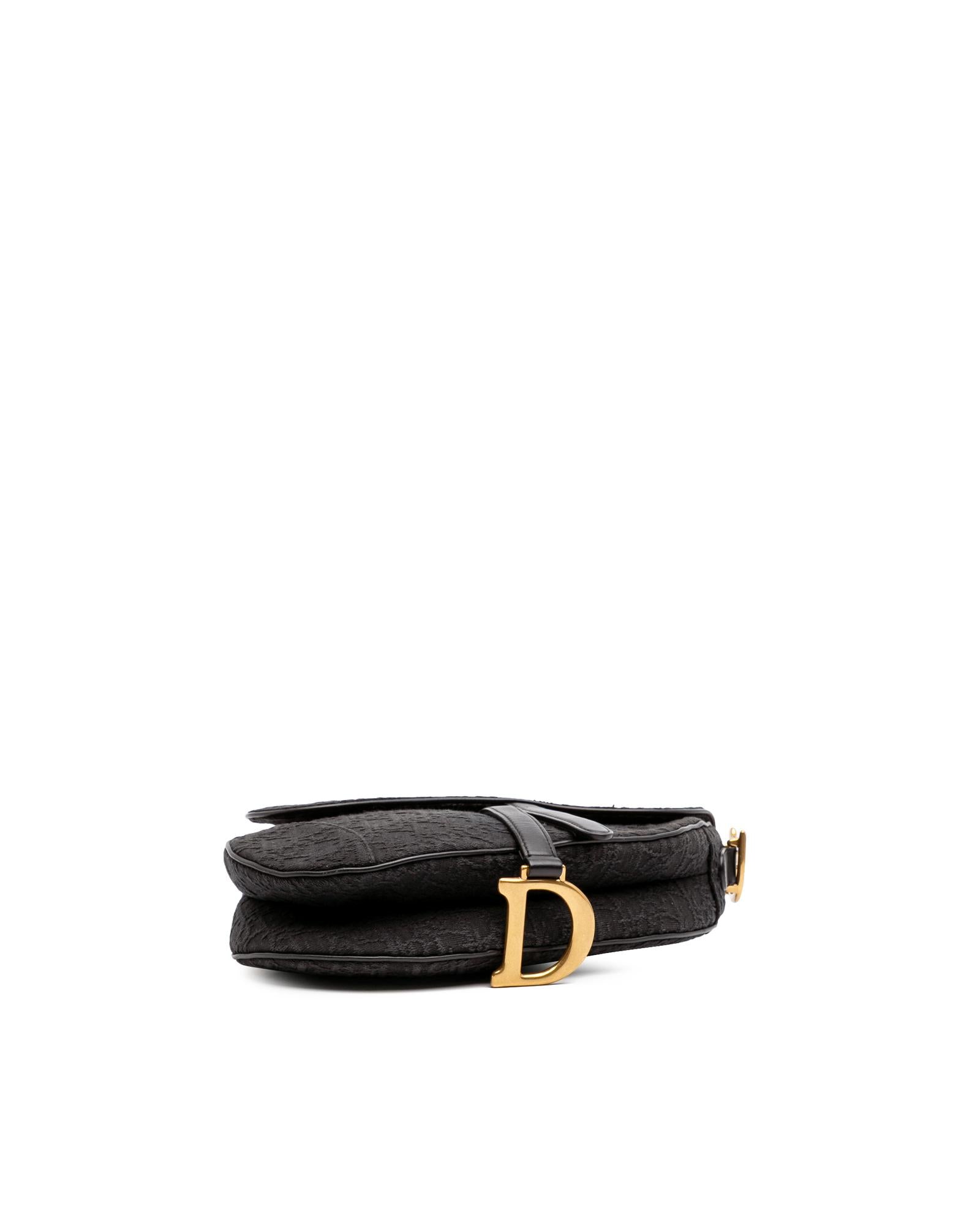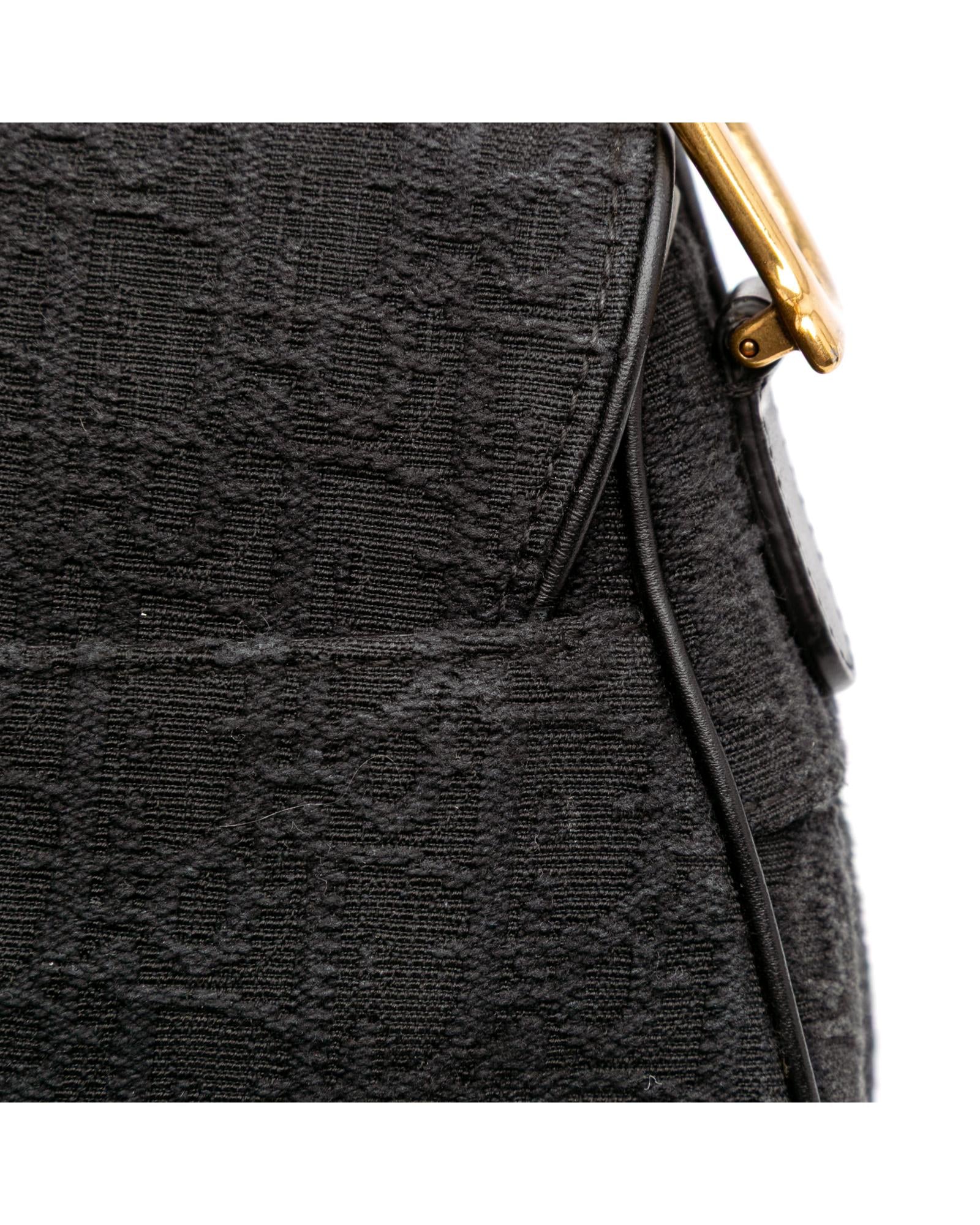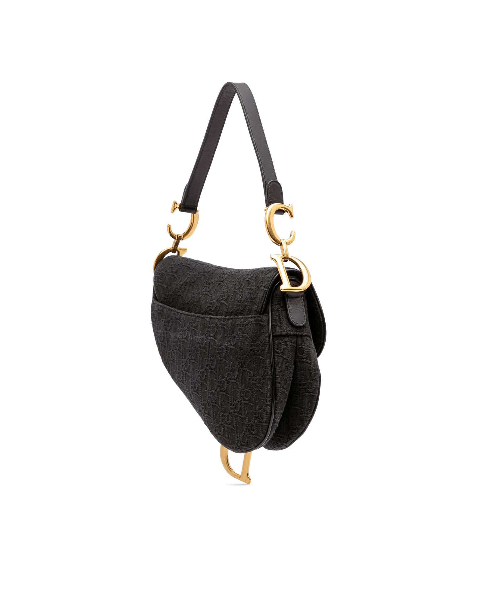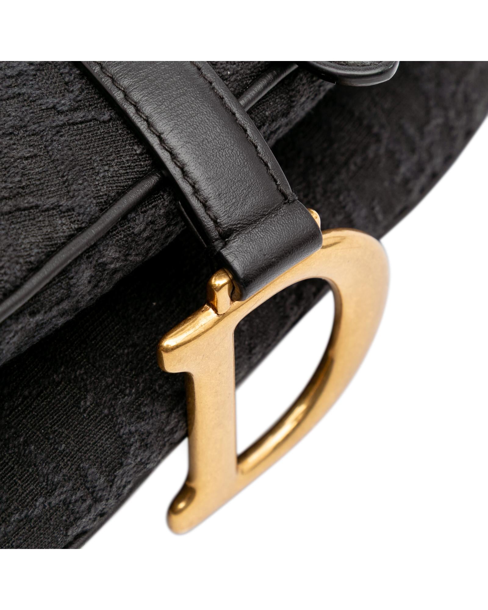 The Saddle features a canvas body with leather trim a flat leather strap with CD hardware a detachable strap a front flap leather tabs with the D charm and an interior zip pocket.