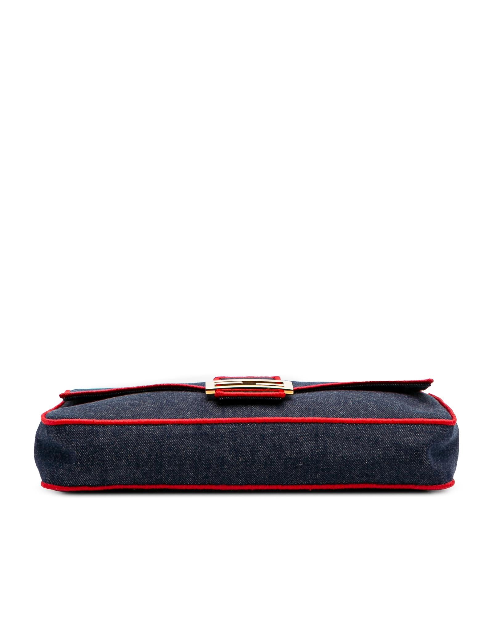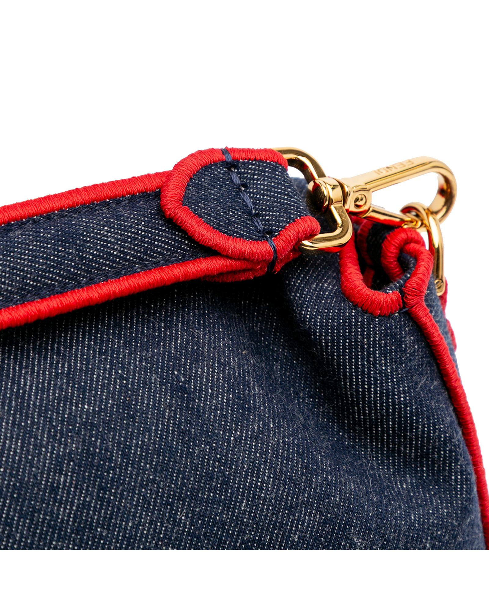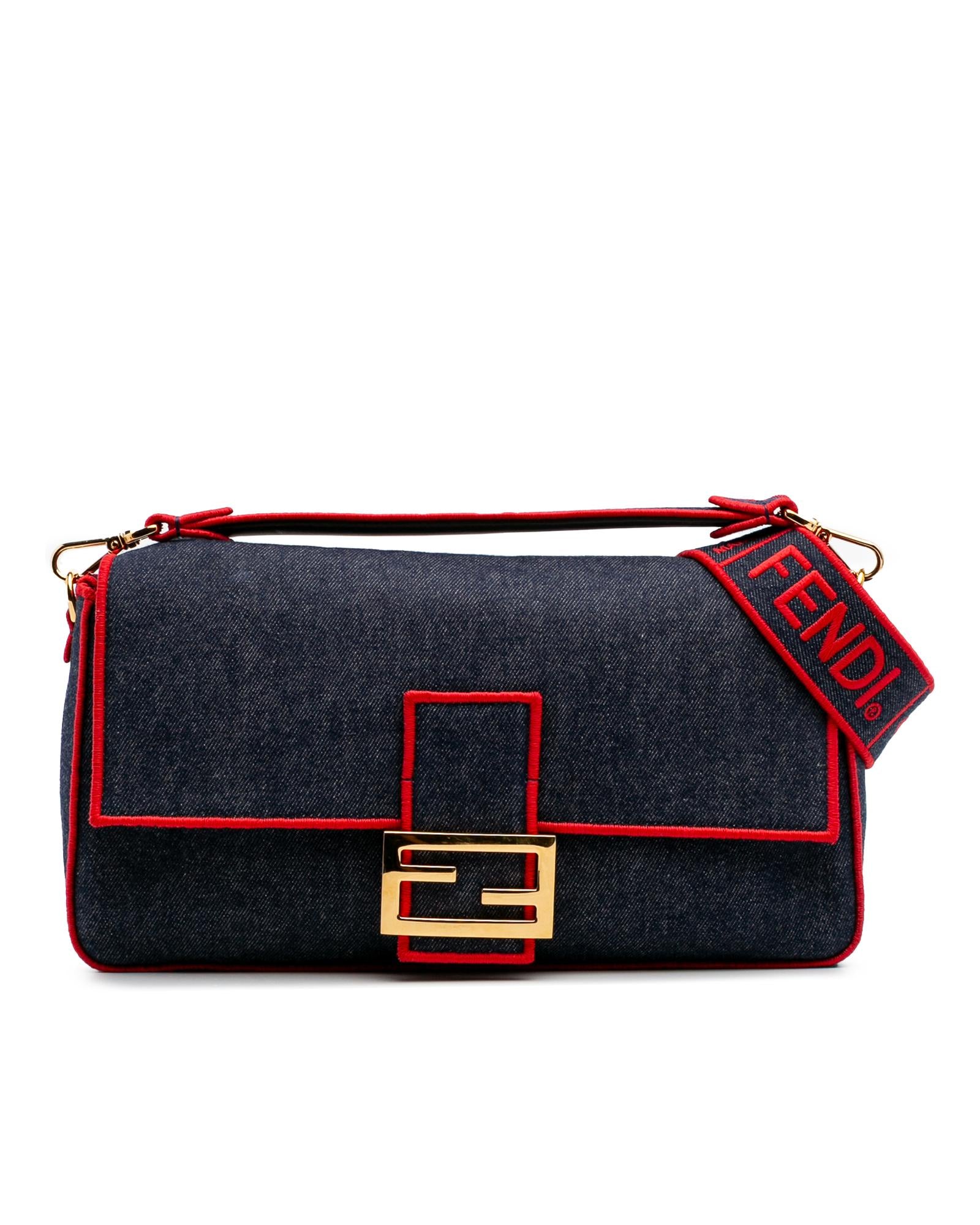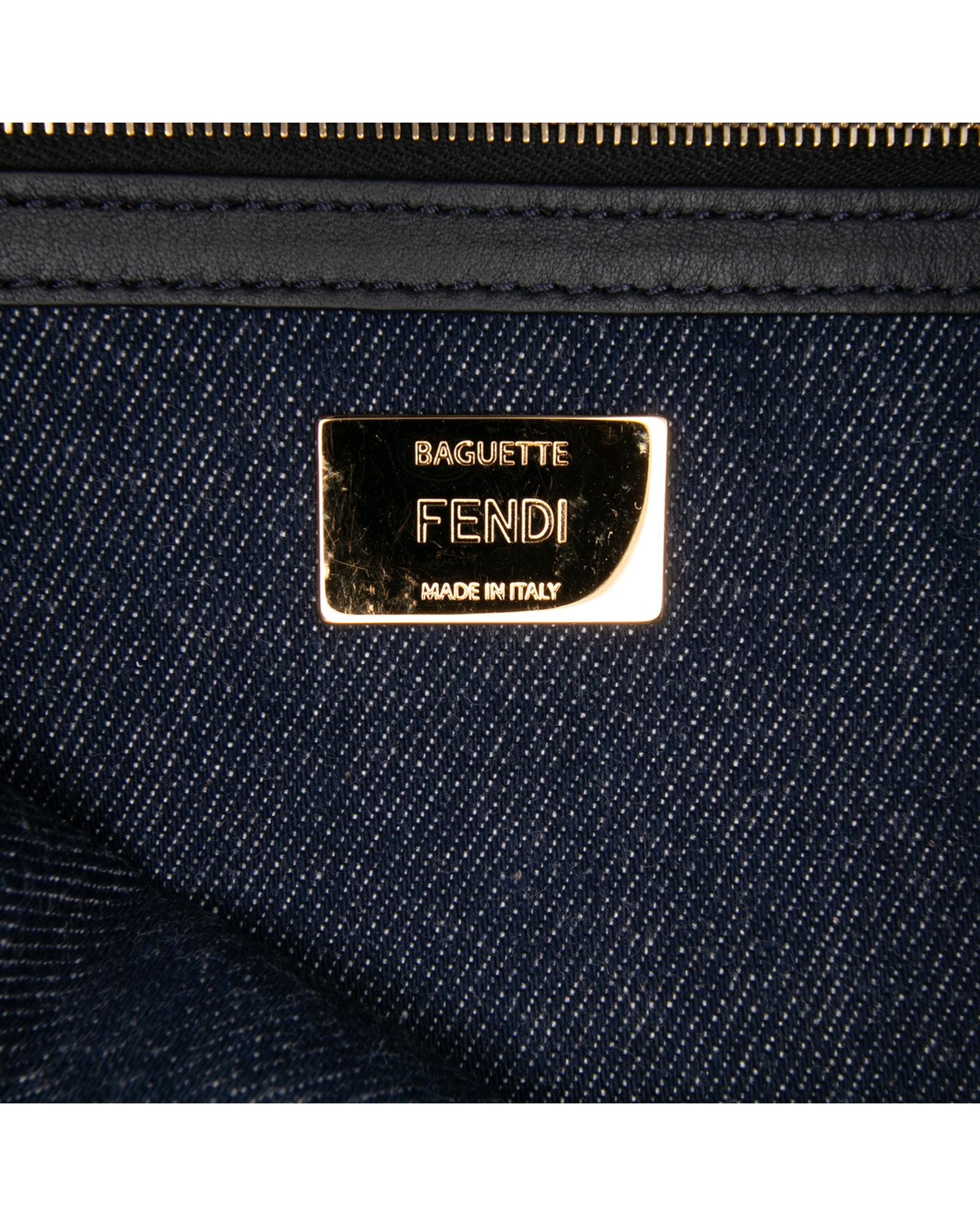 This satchel features a denim body a detachable flat shoulder strap a front flap with a magnetic closure and an interior zip pocket.Brand: Fendi Vintage
