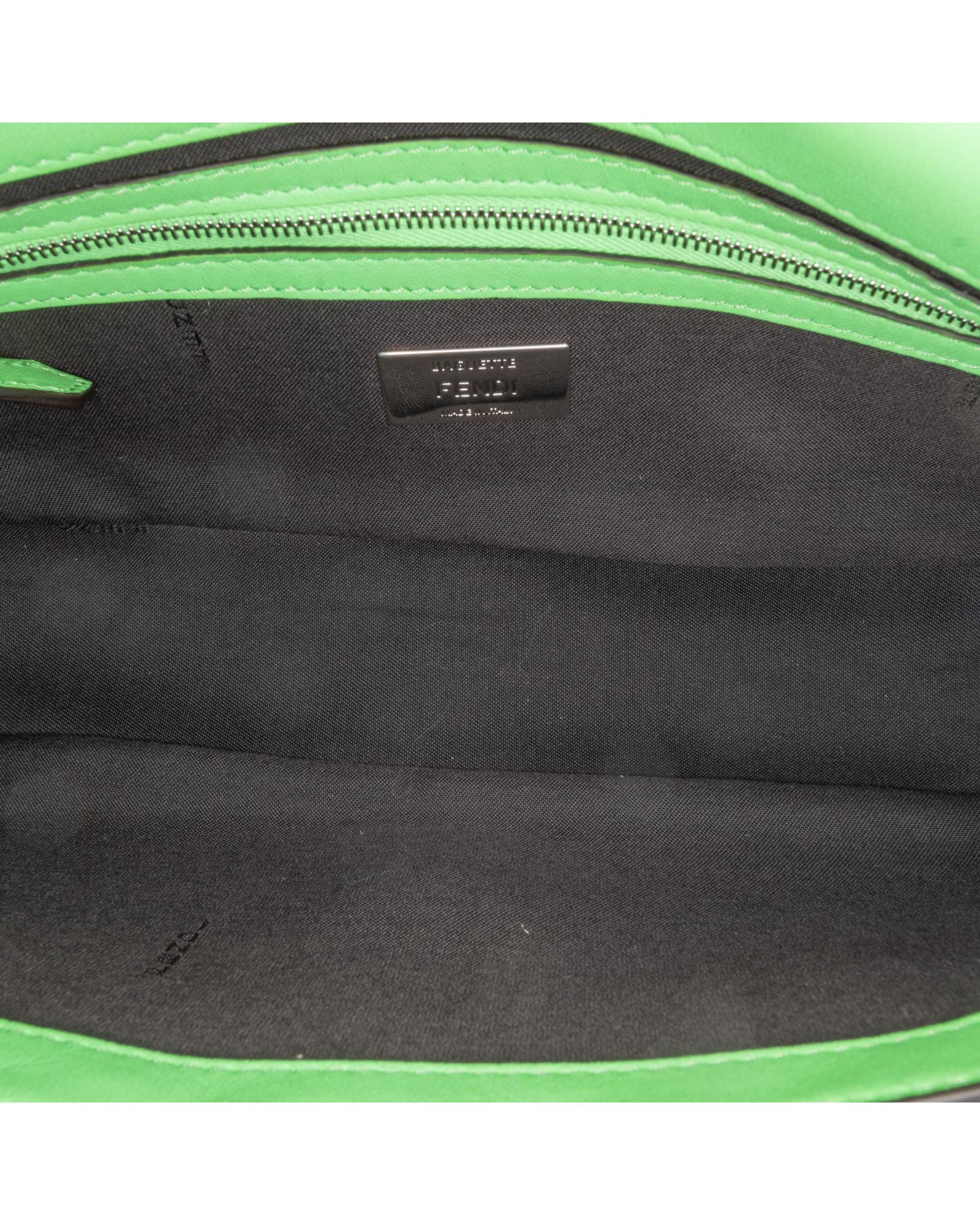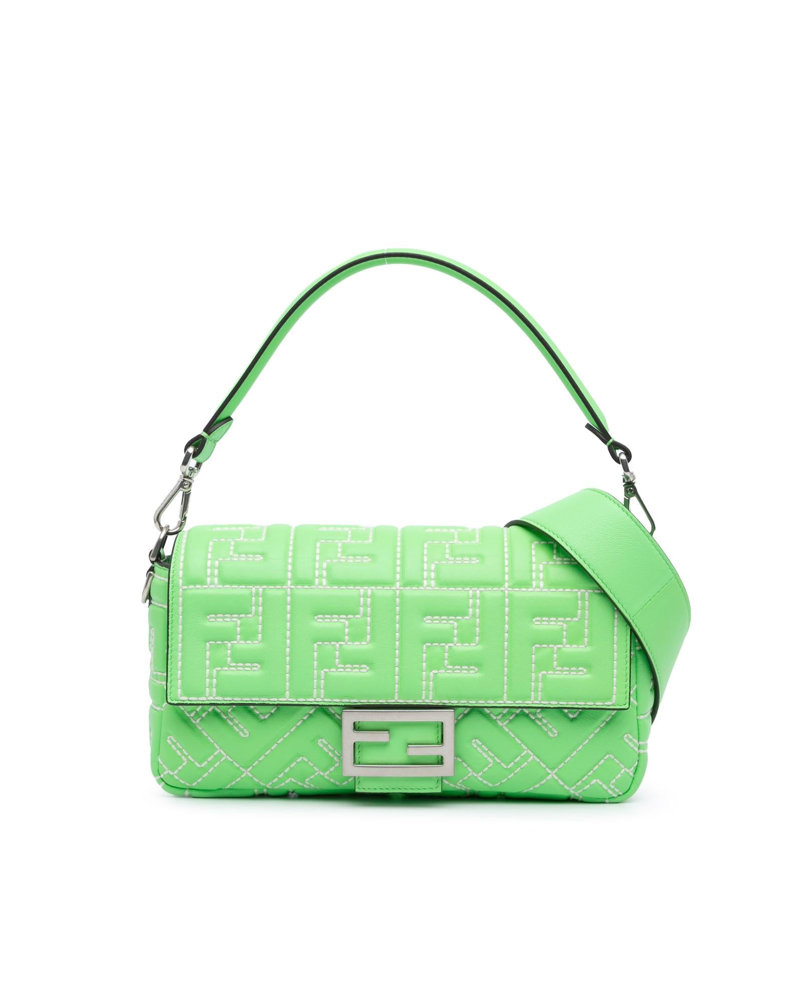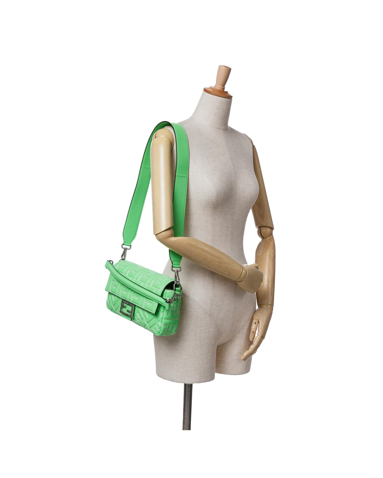 This satchel features an embossed leather body a flat leather handle a detachable strap a front flap with magnetic snap button closure and an interior zip pocket.