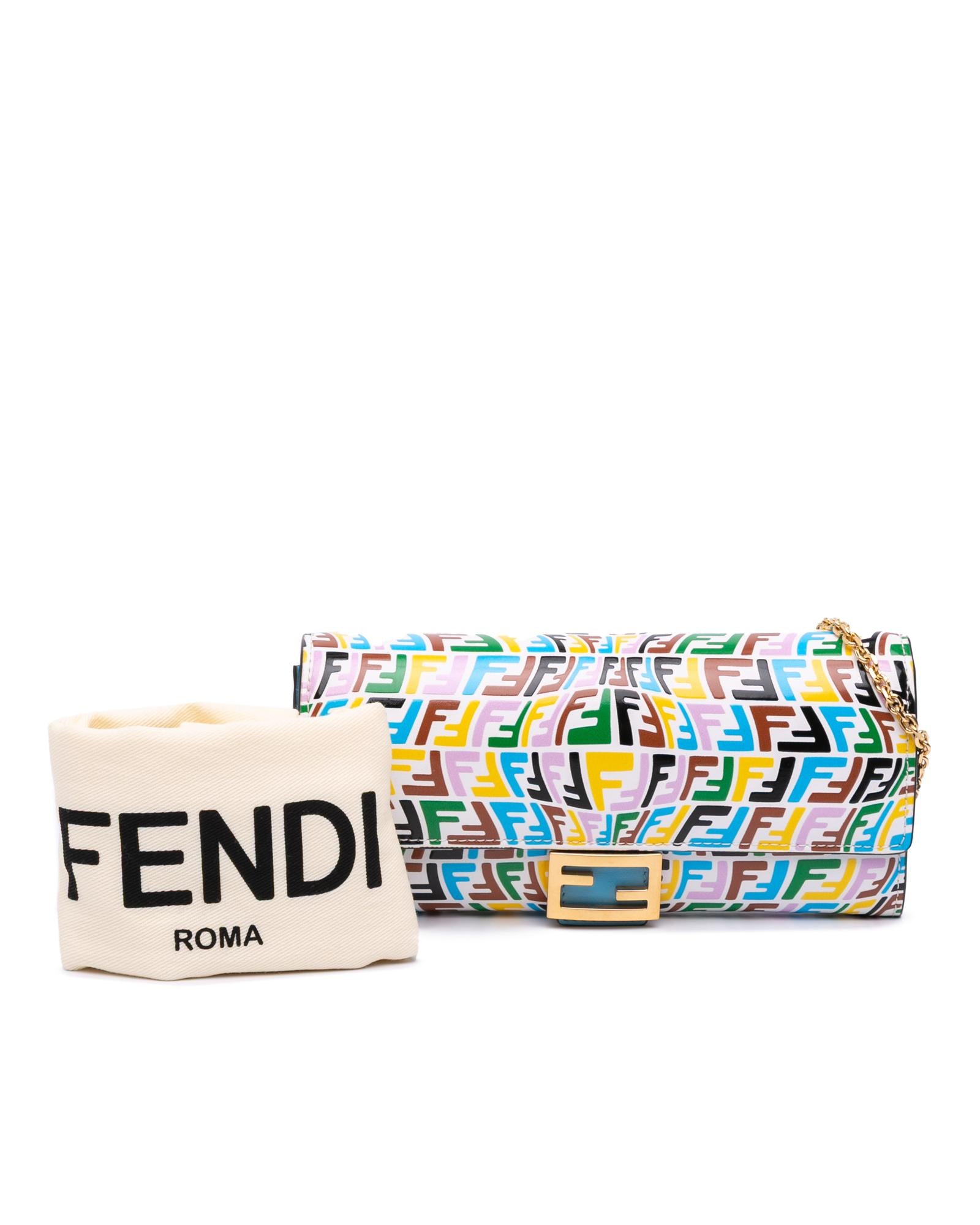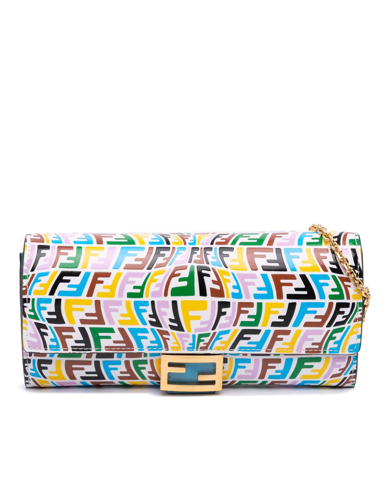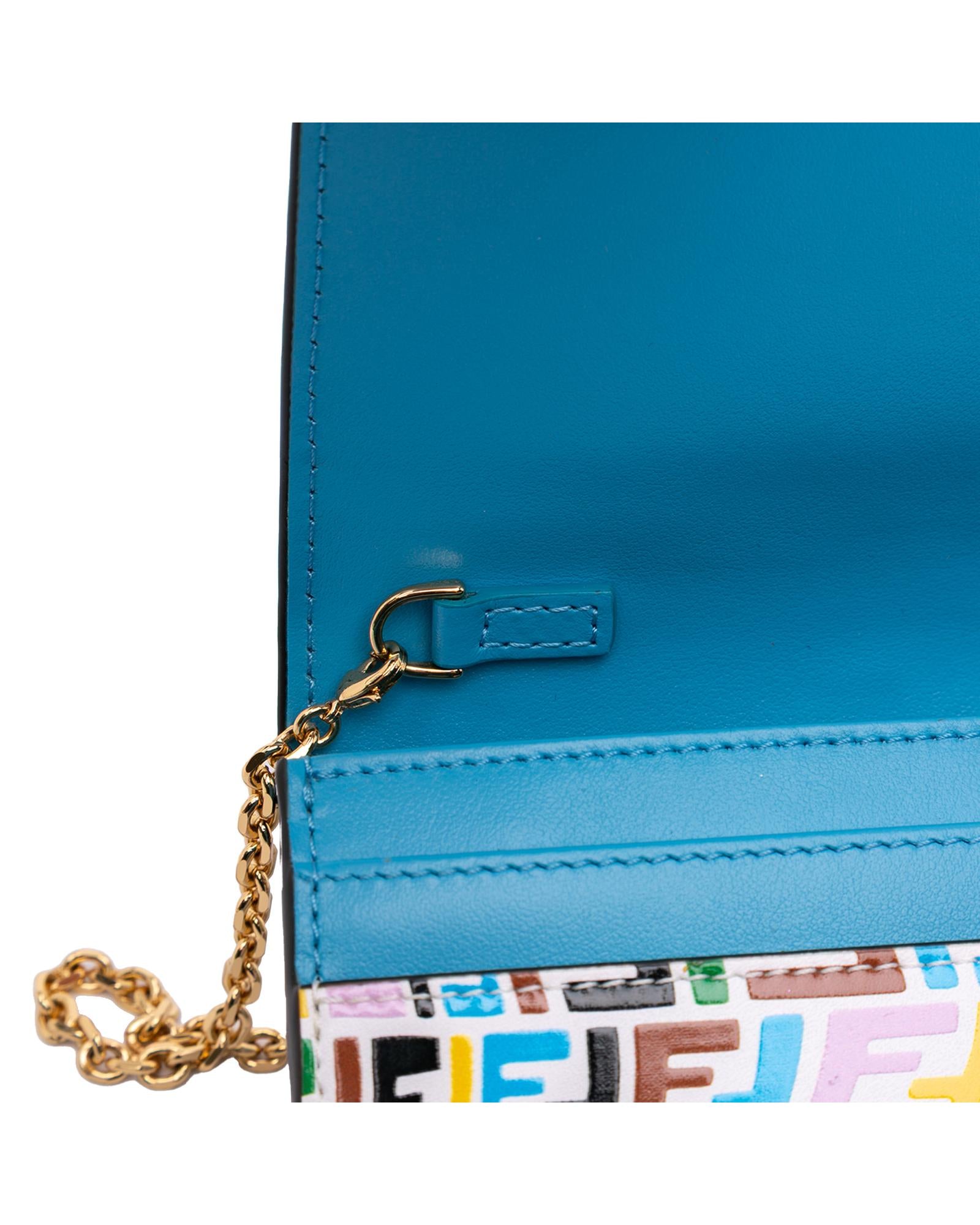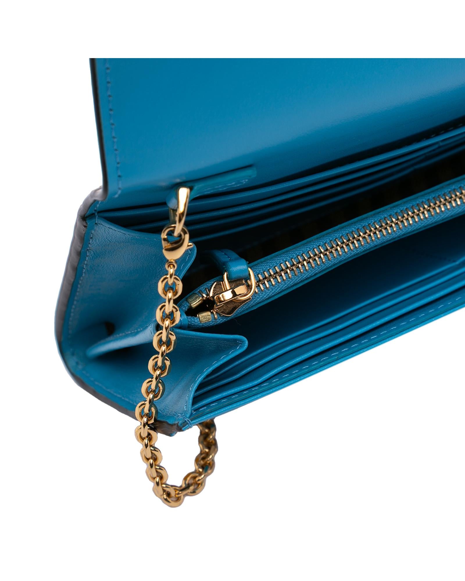 This wallet on chain features an embossed leather body a gold tone chain strap a front flap with magnetic closure and interior zip and slip pockets.Brand: Fendi Vintage