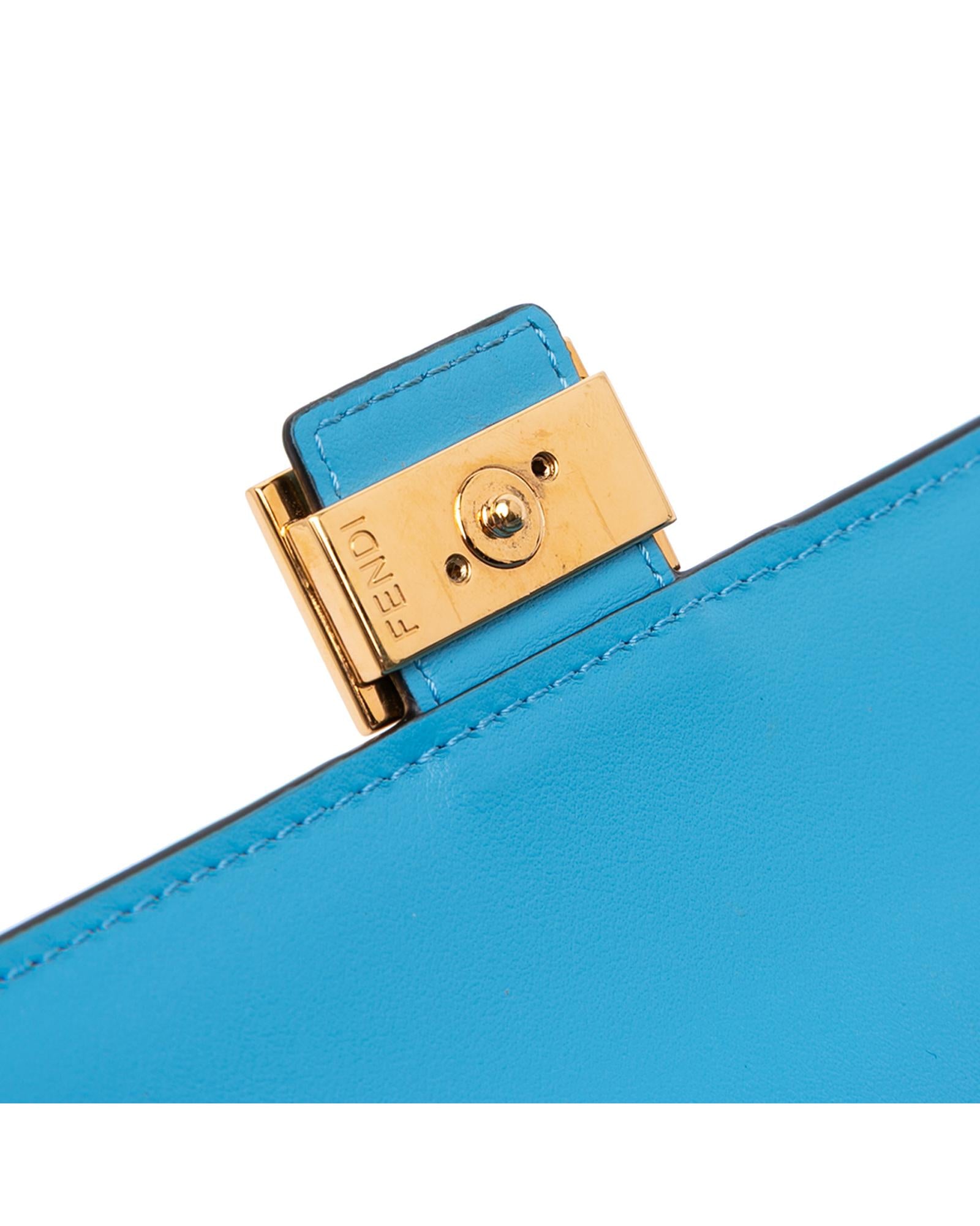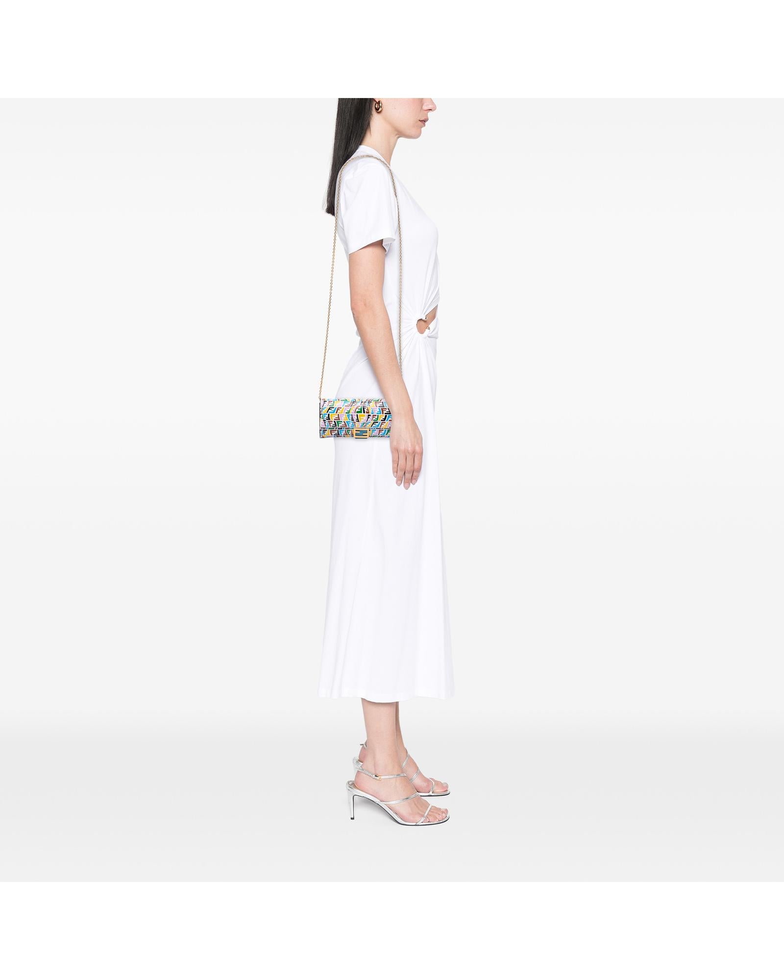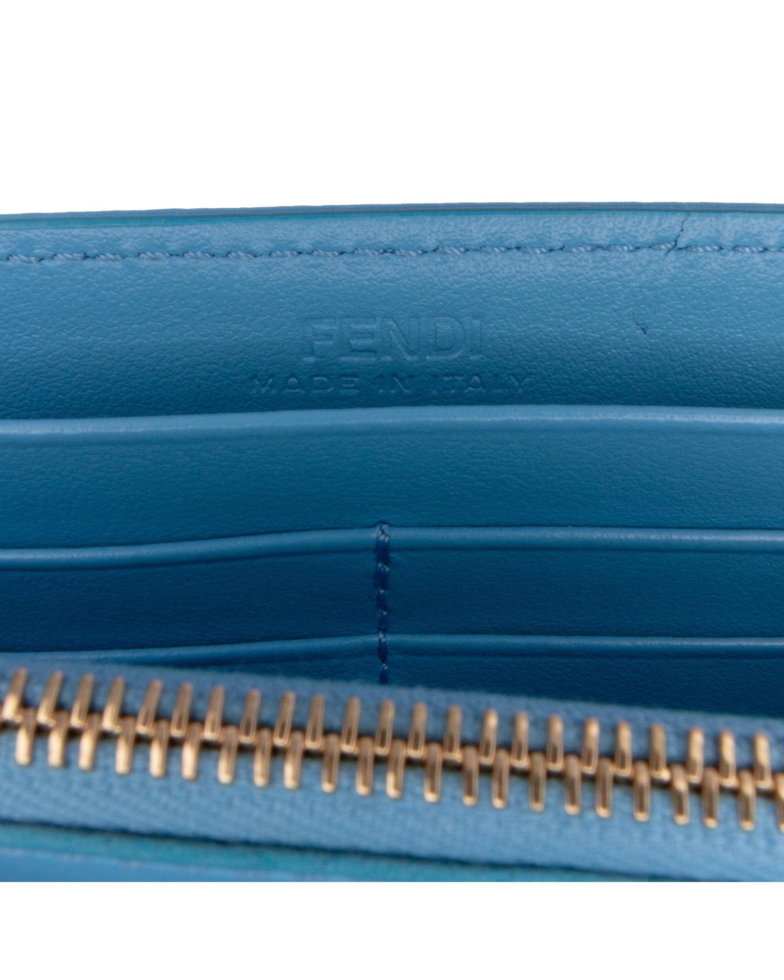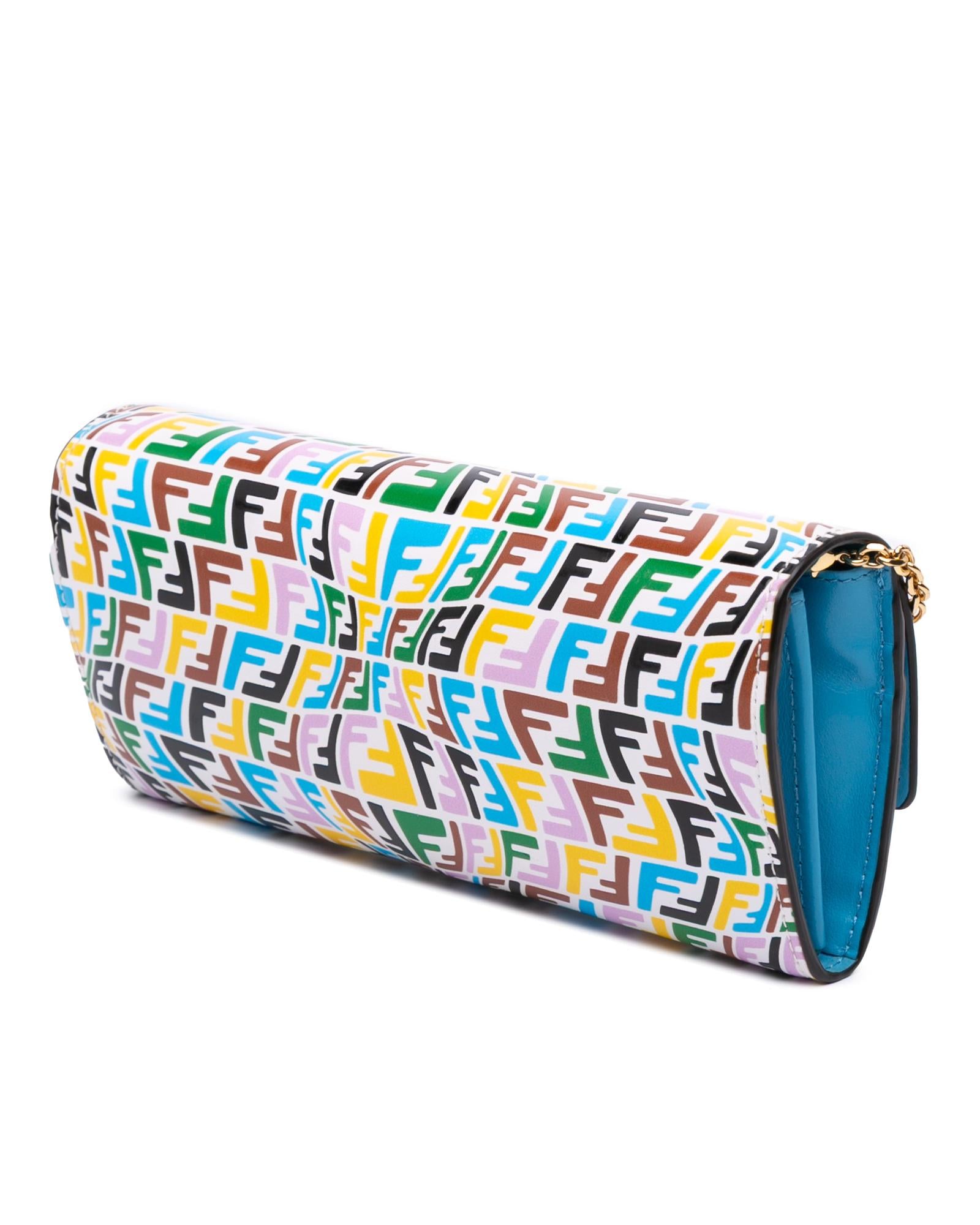 This wallet on chain features an embossed leather body a gold tone chain strap a front flap with magnetic closure and interior zip and slip pockets.Brand: Fendi Vintage