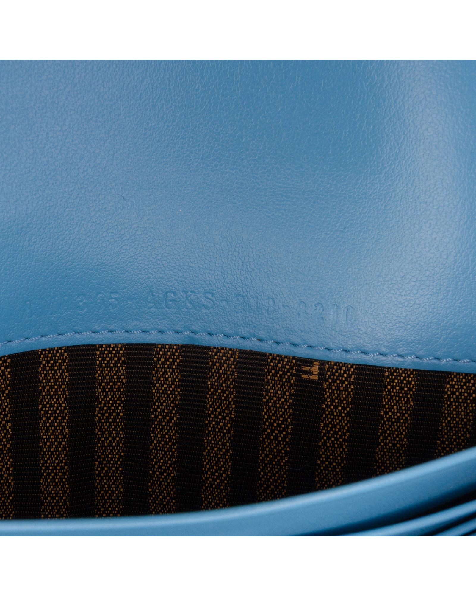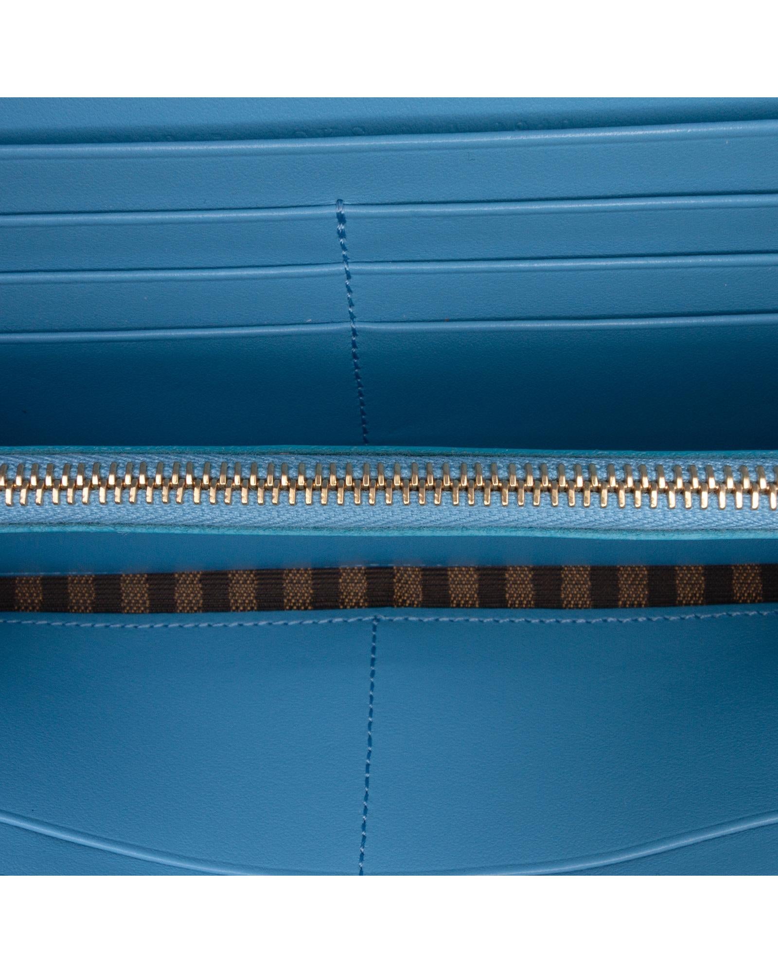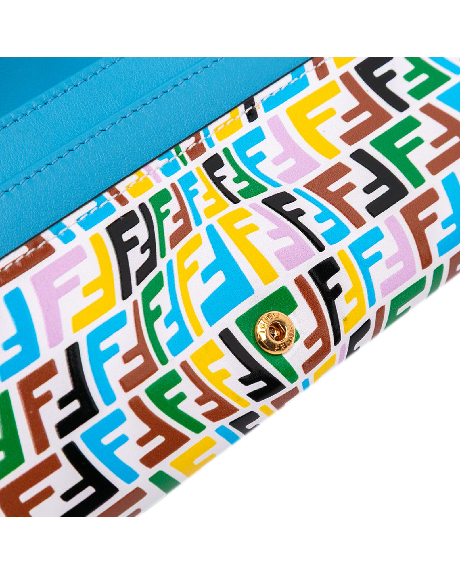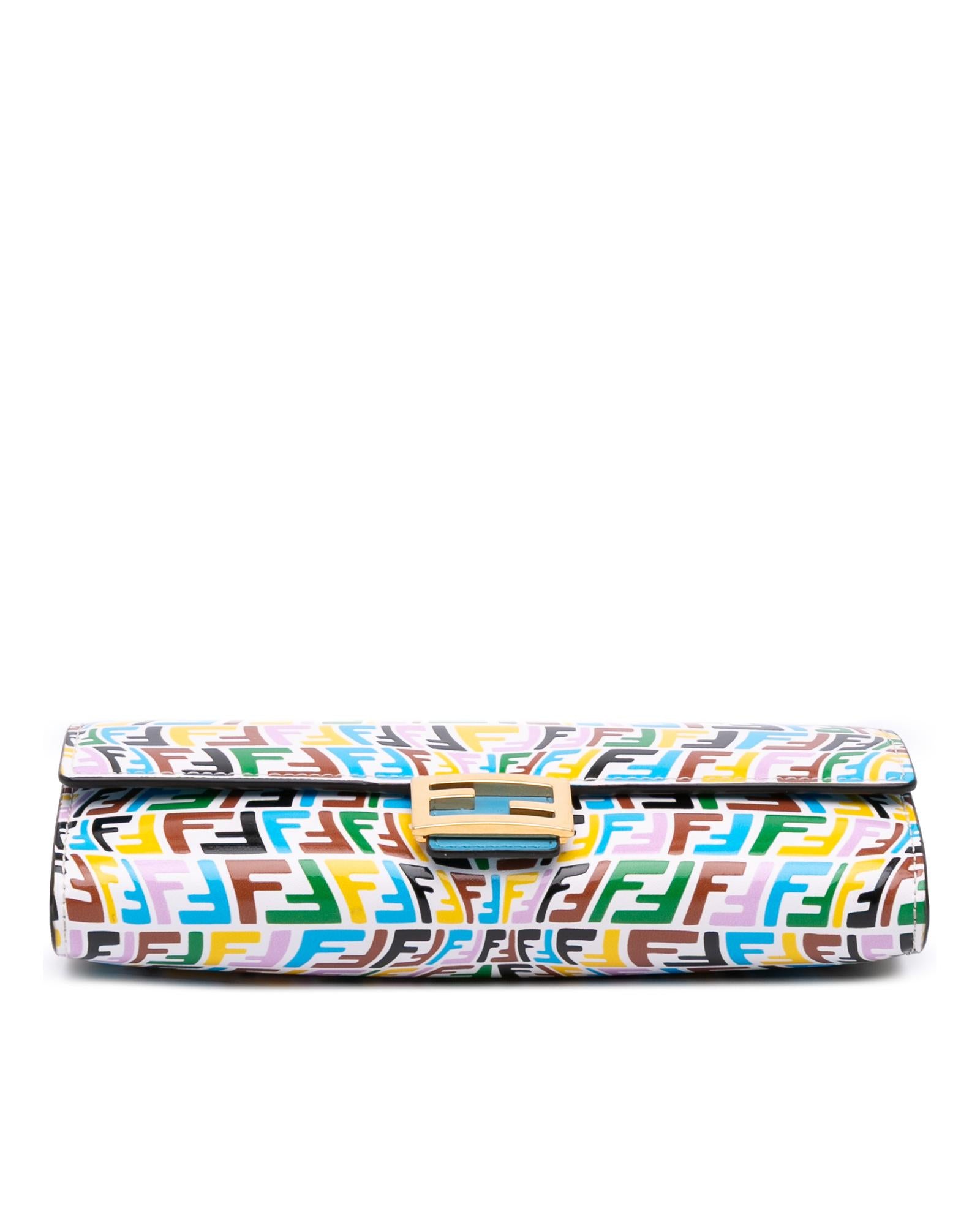 This wallet on chain features an embossed leather body a gold tone chain strap a front flap with magnetic closure and interior zip and slip pockets.Brand: Fendi Vintage