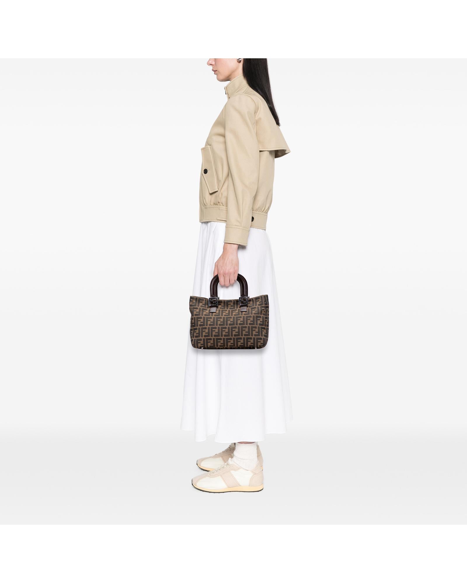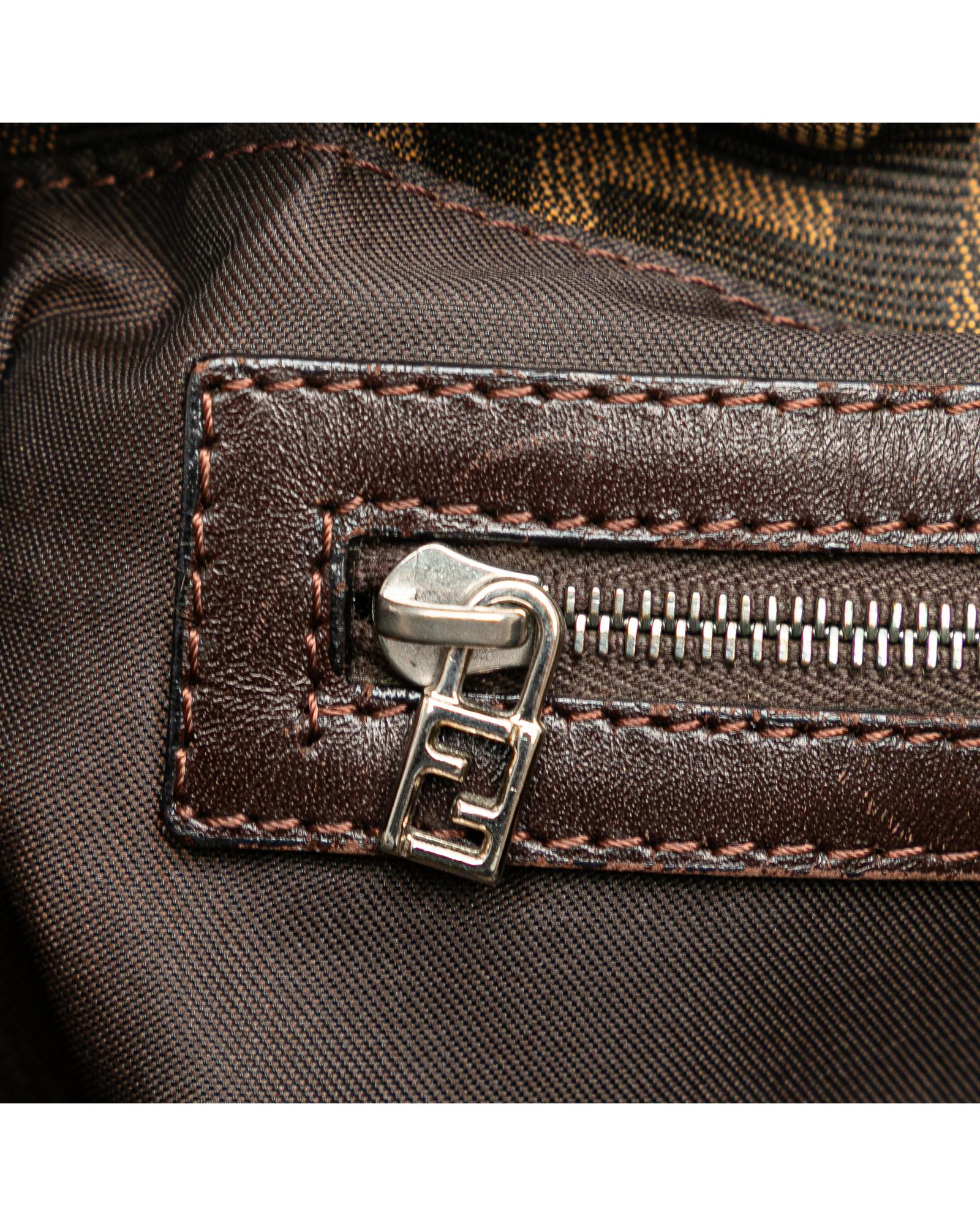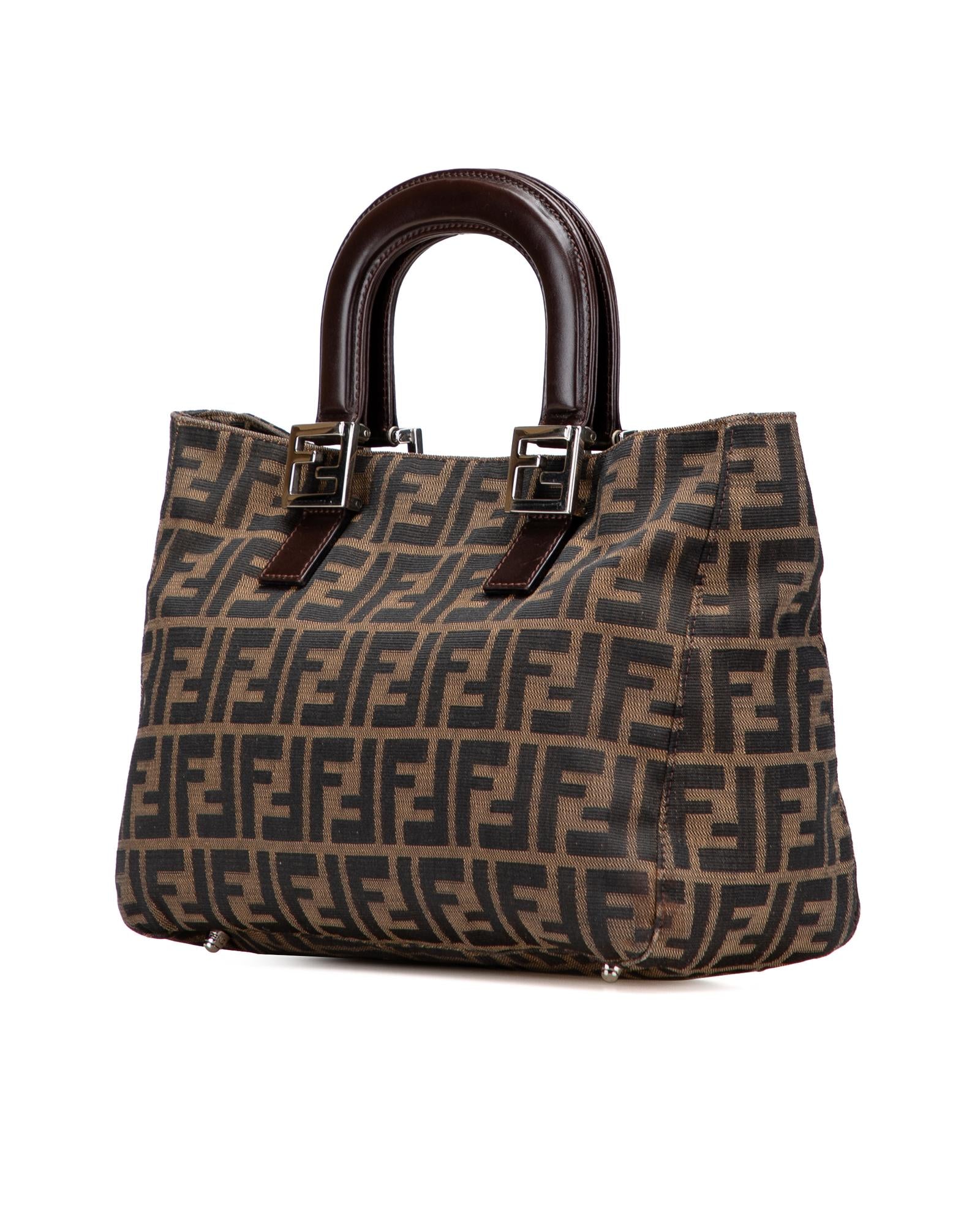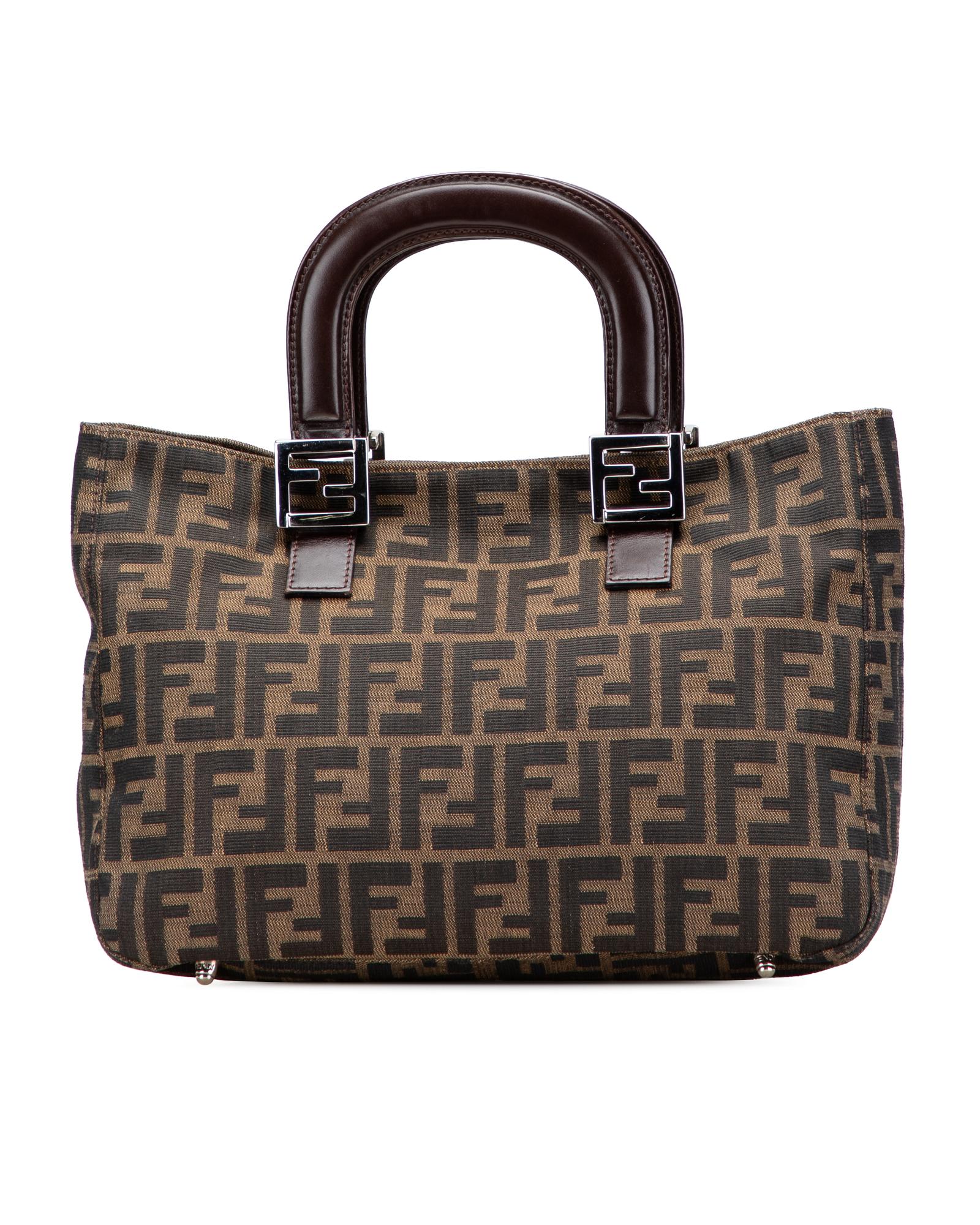 This tote features a canvas body flat leather top handles an open top with magnetic closure and an interior zip pocket.Brand: Fendi Vintage