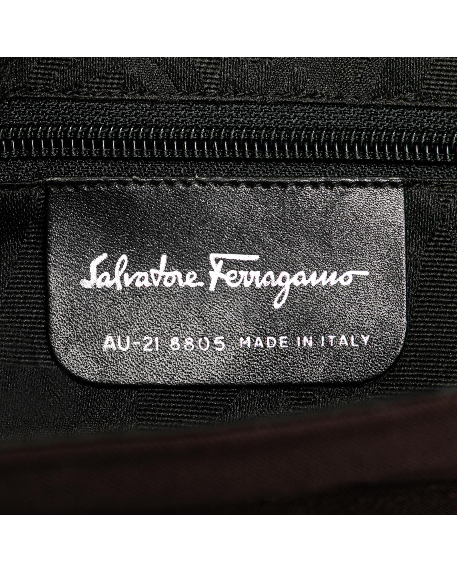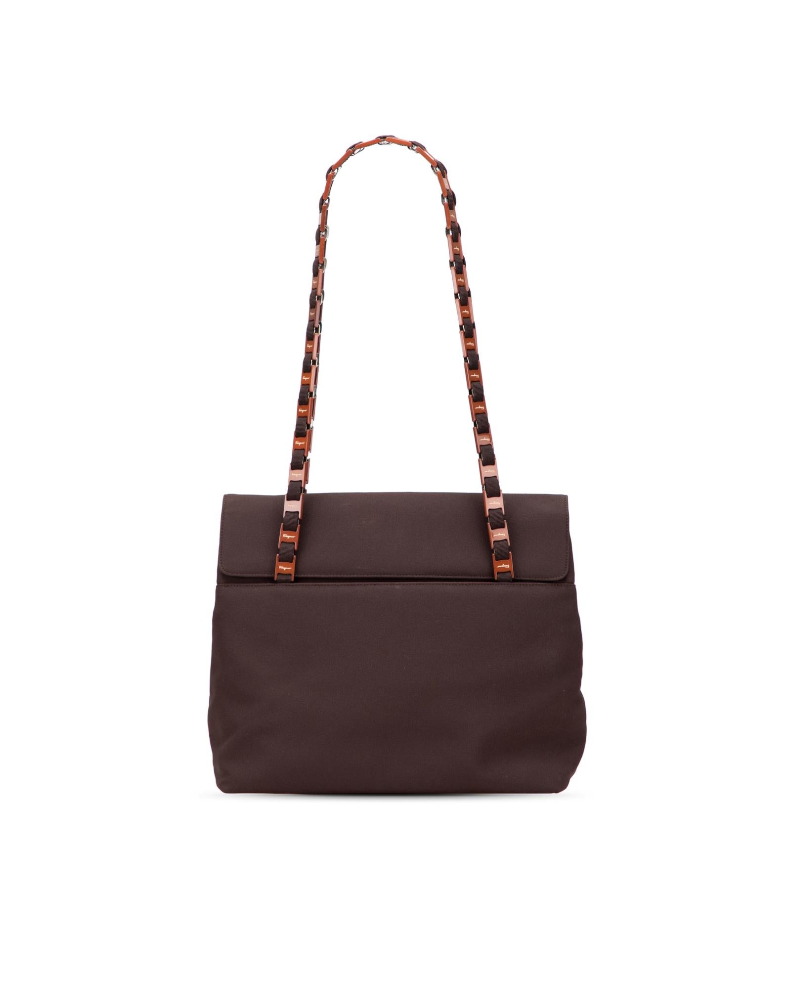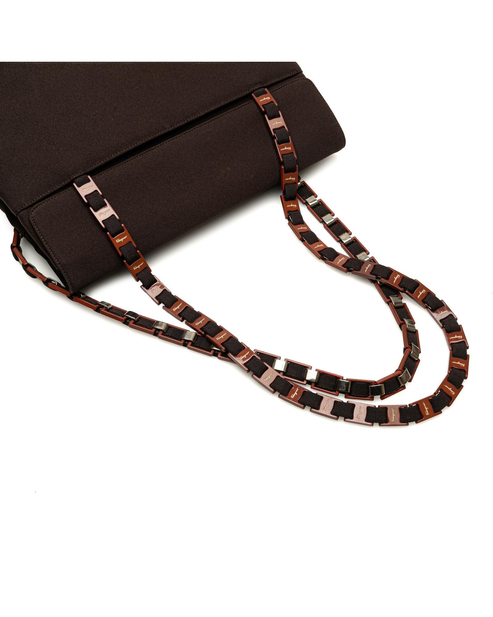 This tote bag features a nylon body chain link straps a flap with magnetic snap closure an exterior slip pocket and an interior zip pocket.Brand: Ferragamo Vintage
