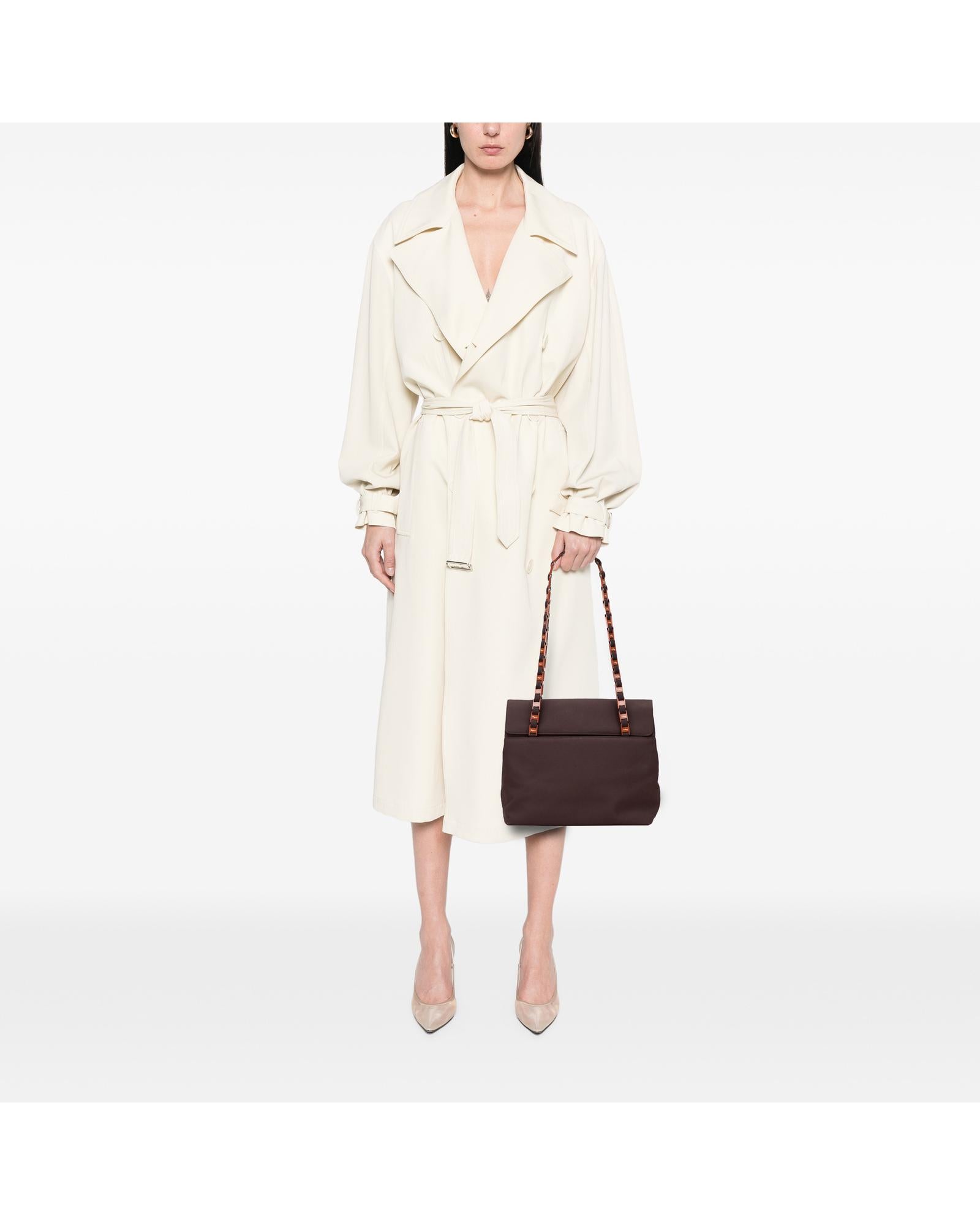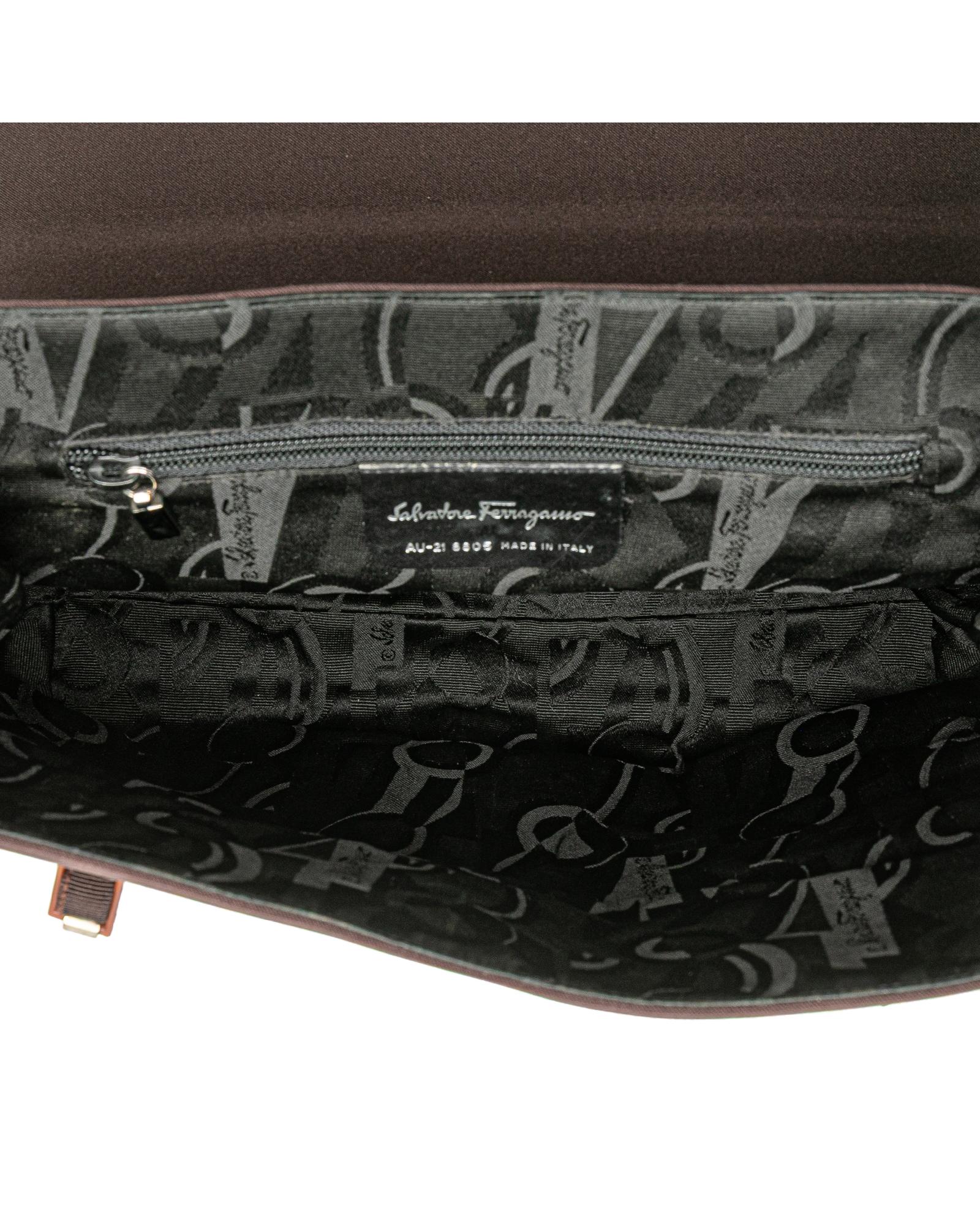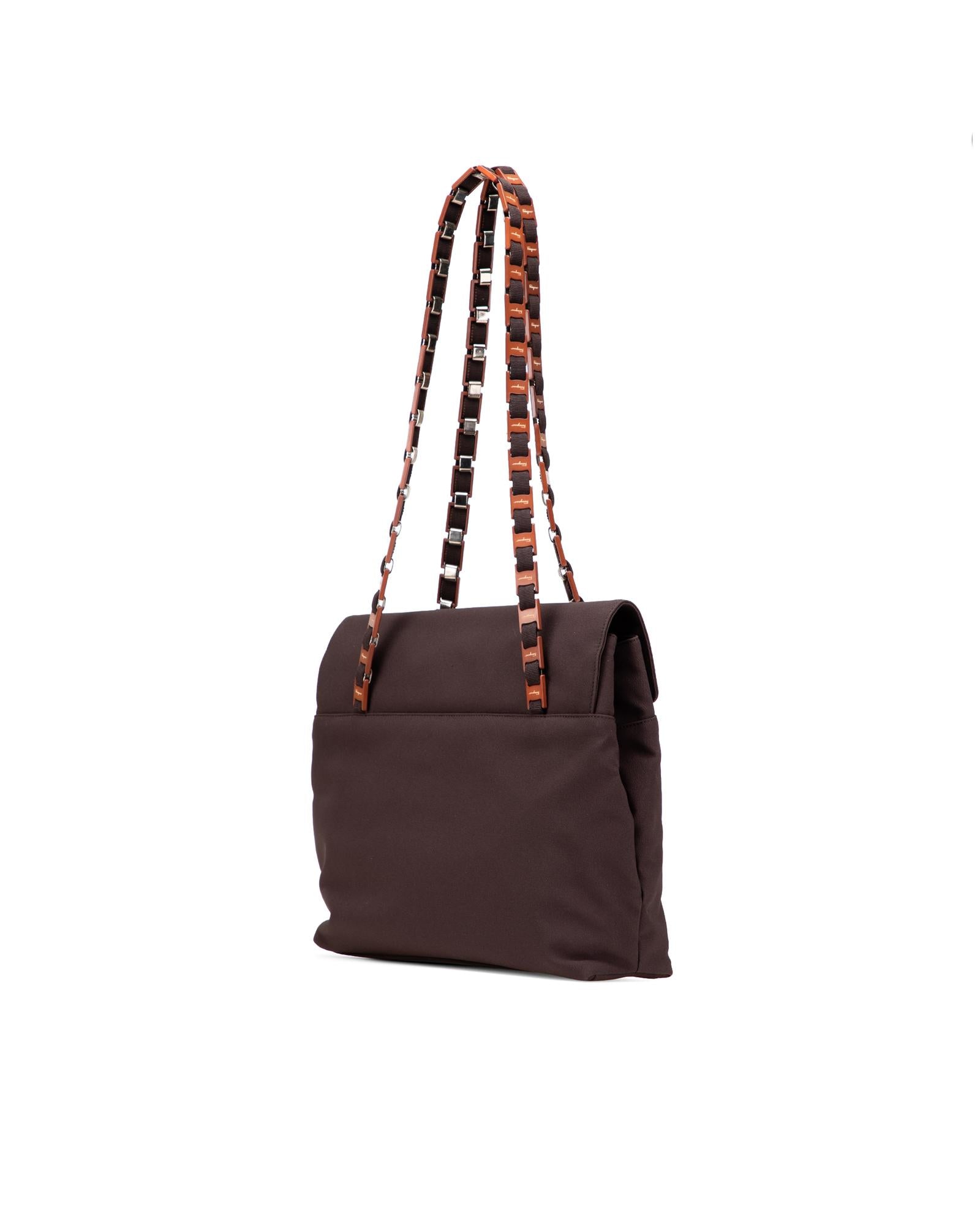 This tote bag features a nylon body chain link straps a flap with magnetic snap closure an exterior slip pocket and an interior zip pocket.Brand: Ferragamo Vintage