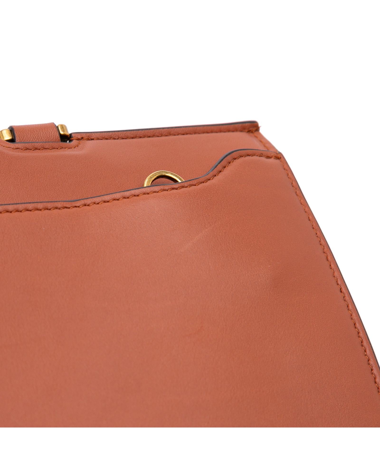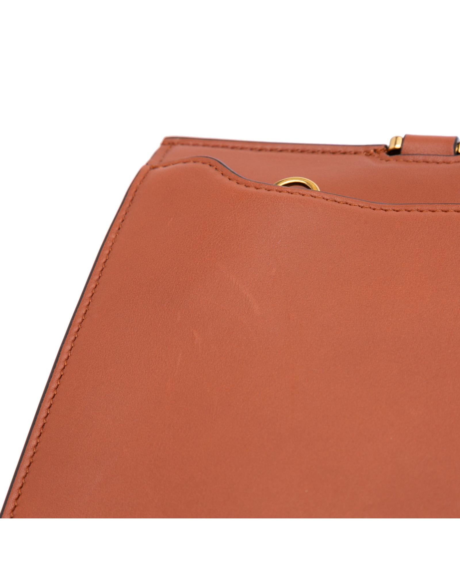 This satchel features a leather body a rolled leather top handle a front flap with a flip lock closure an exterior back slip pocket and interior slip pockets.
