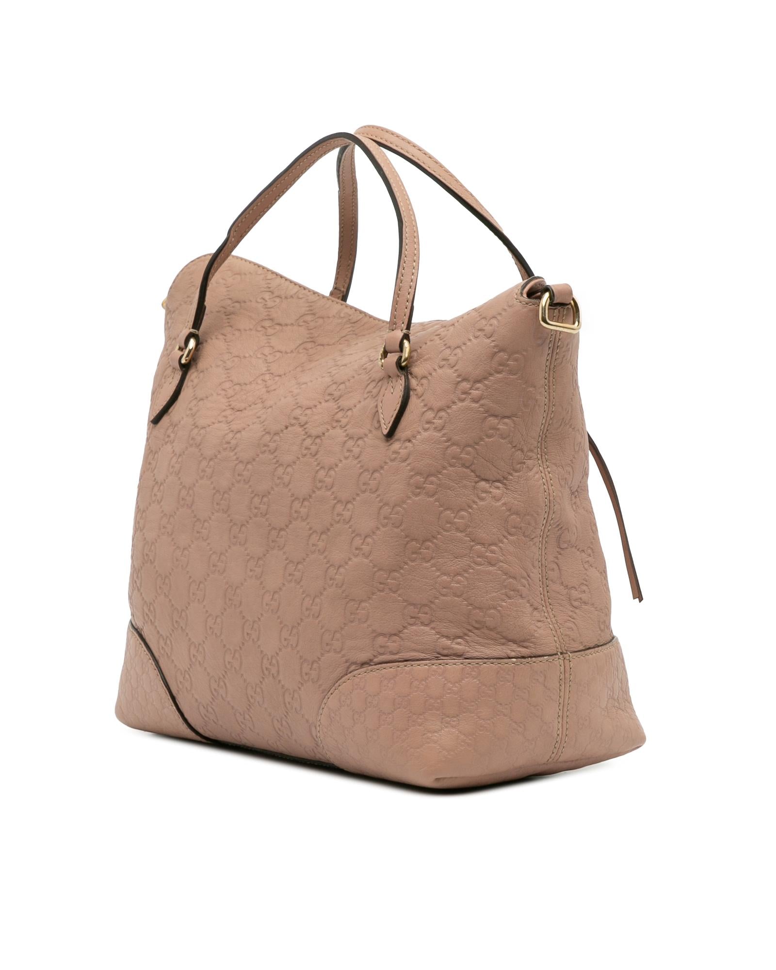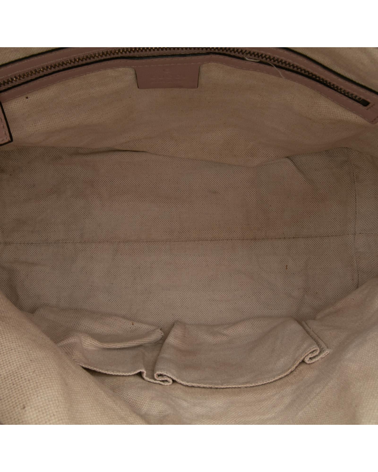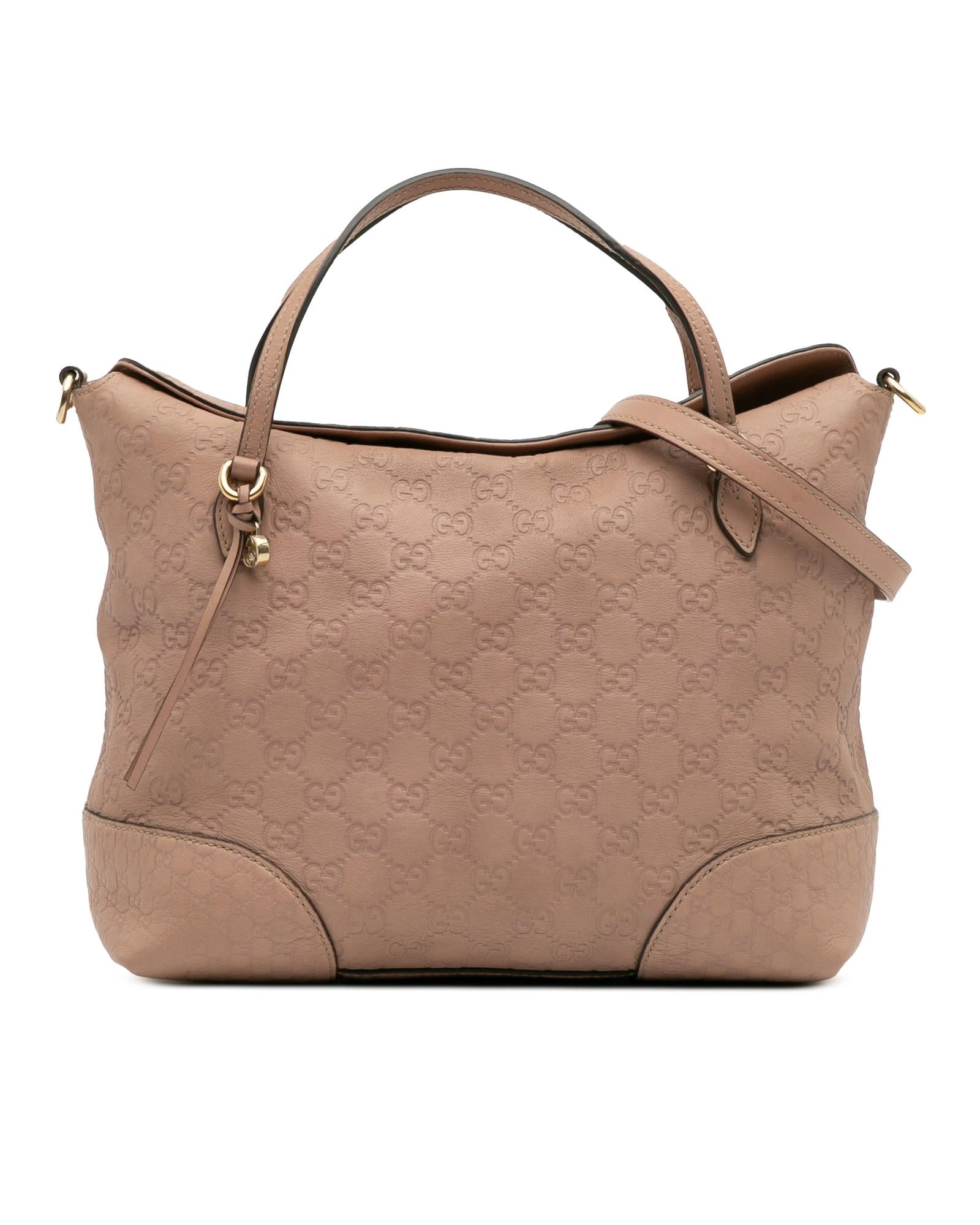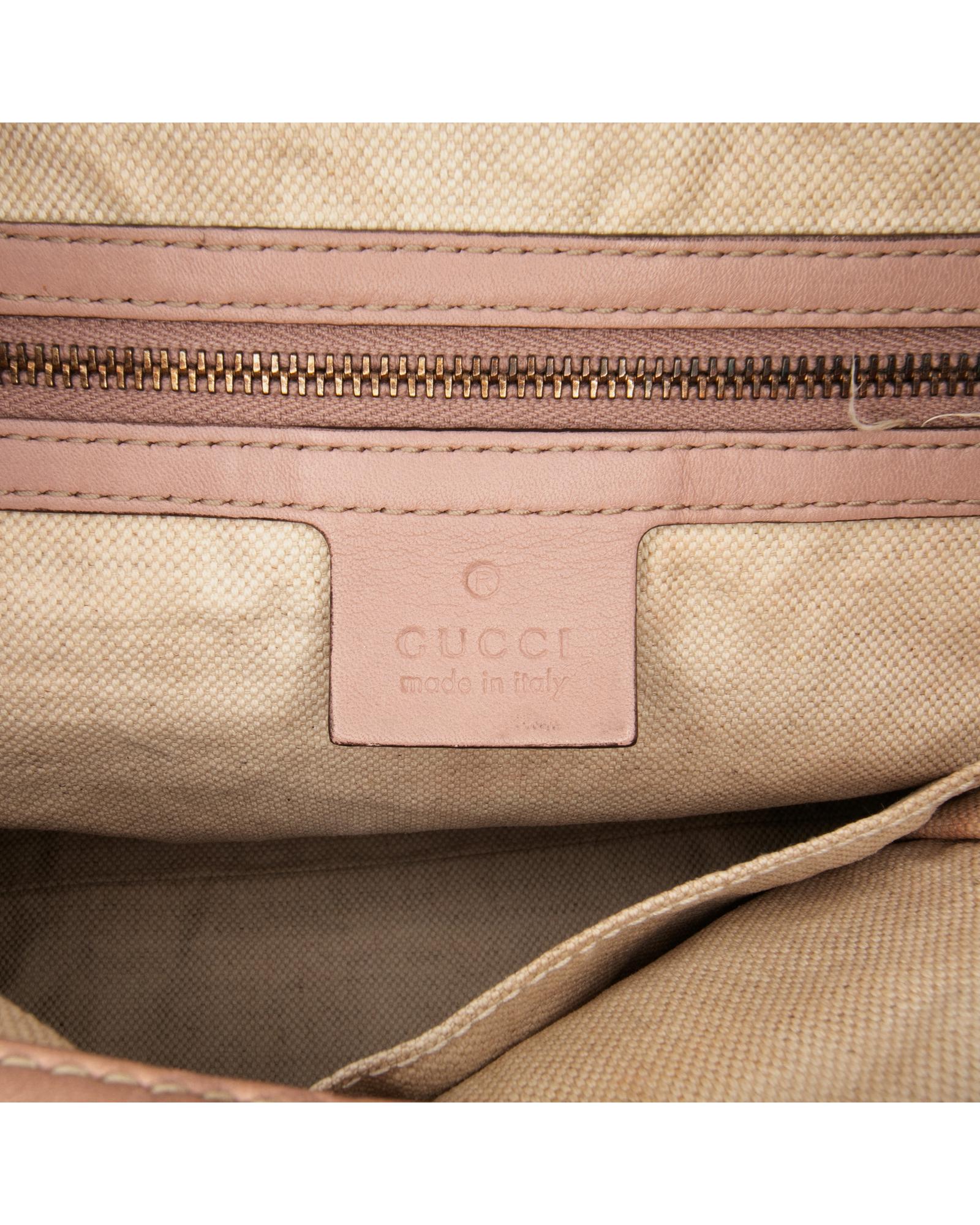 The Bree features an embossed leather body flat leather handles a detachable flat leather strap a fold-over top and interior zip and slip pockets. The corners were repainted.Brand: Gucci Vintage