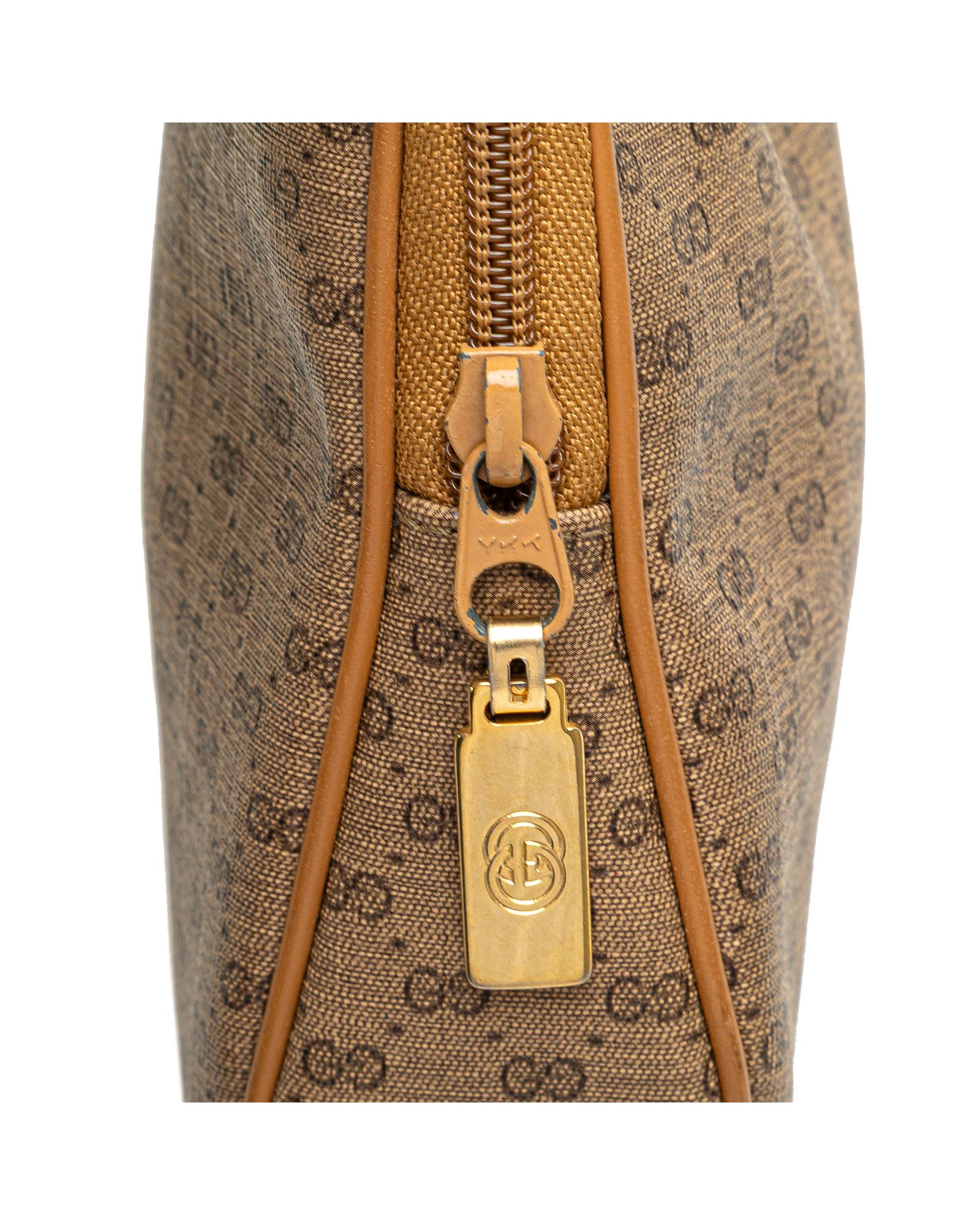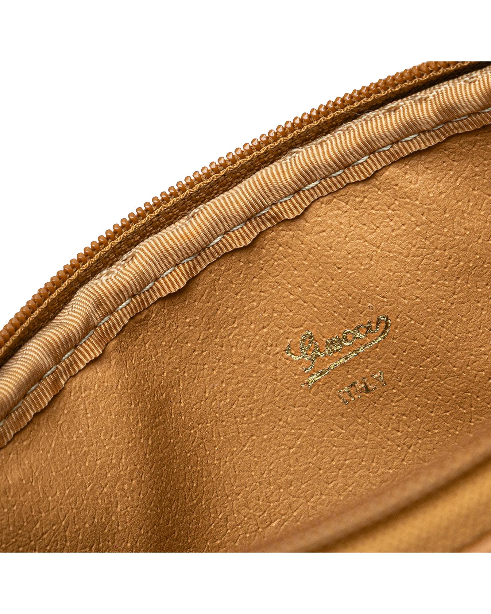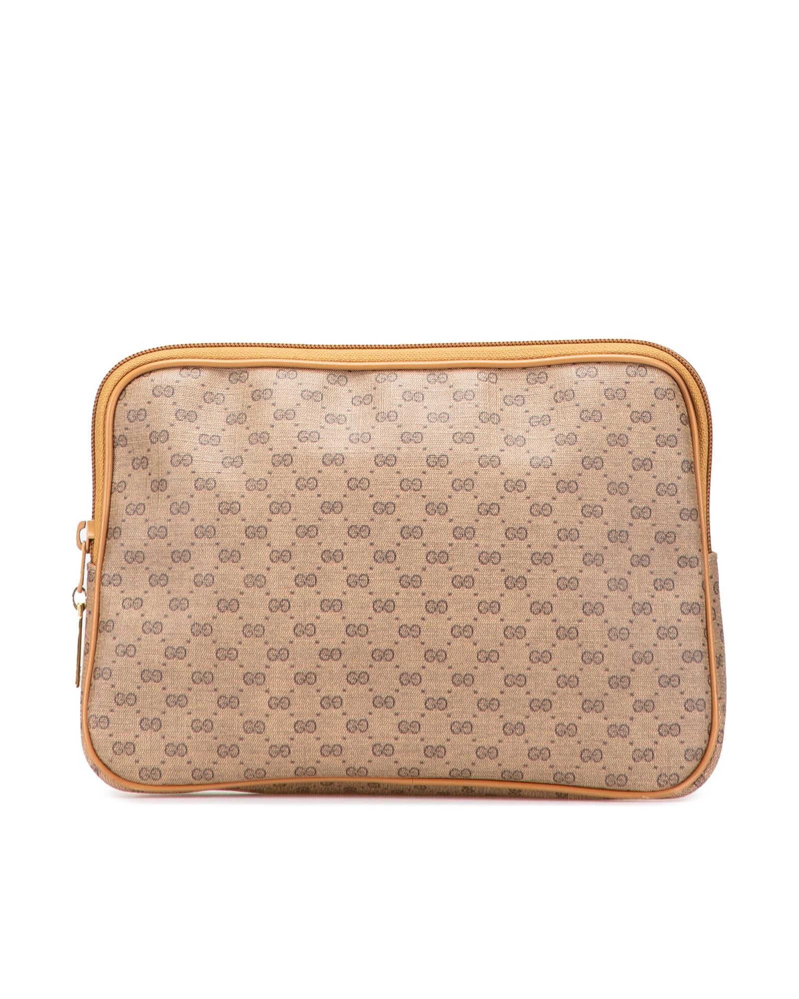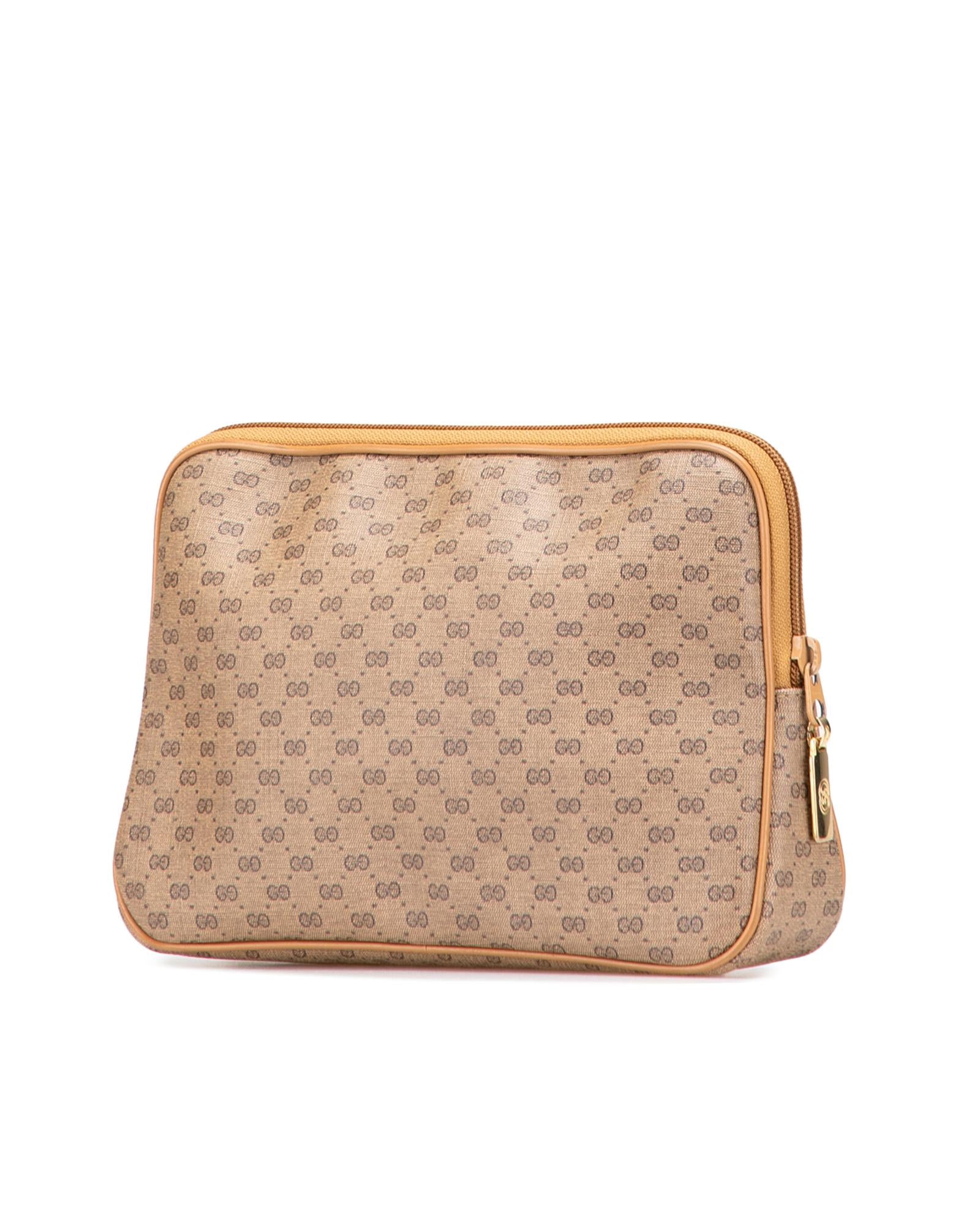 This clutch bag features a coated canvas body with leather trim a top zip closure and an interior slip pocket.Brand: Gucci Vintage