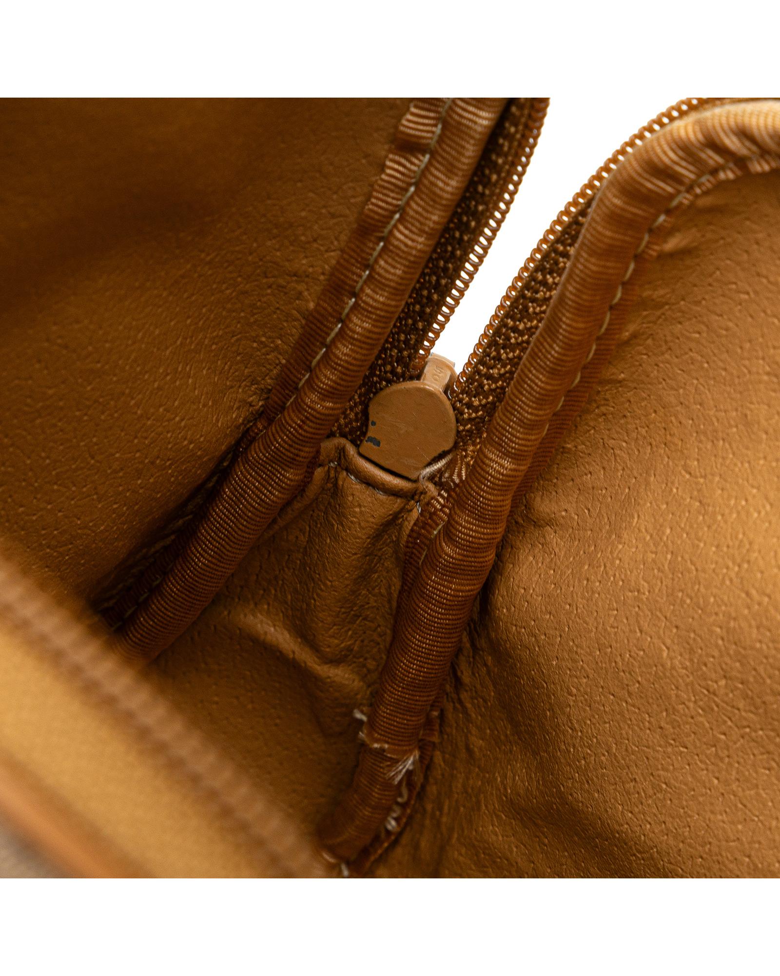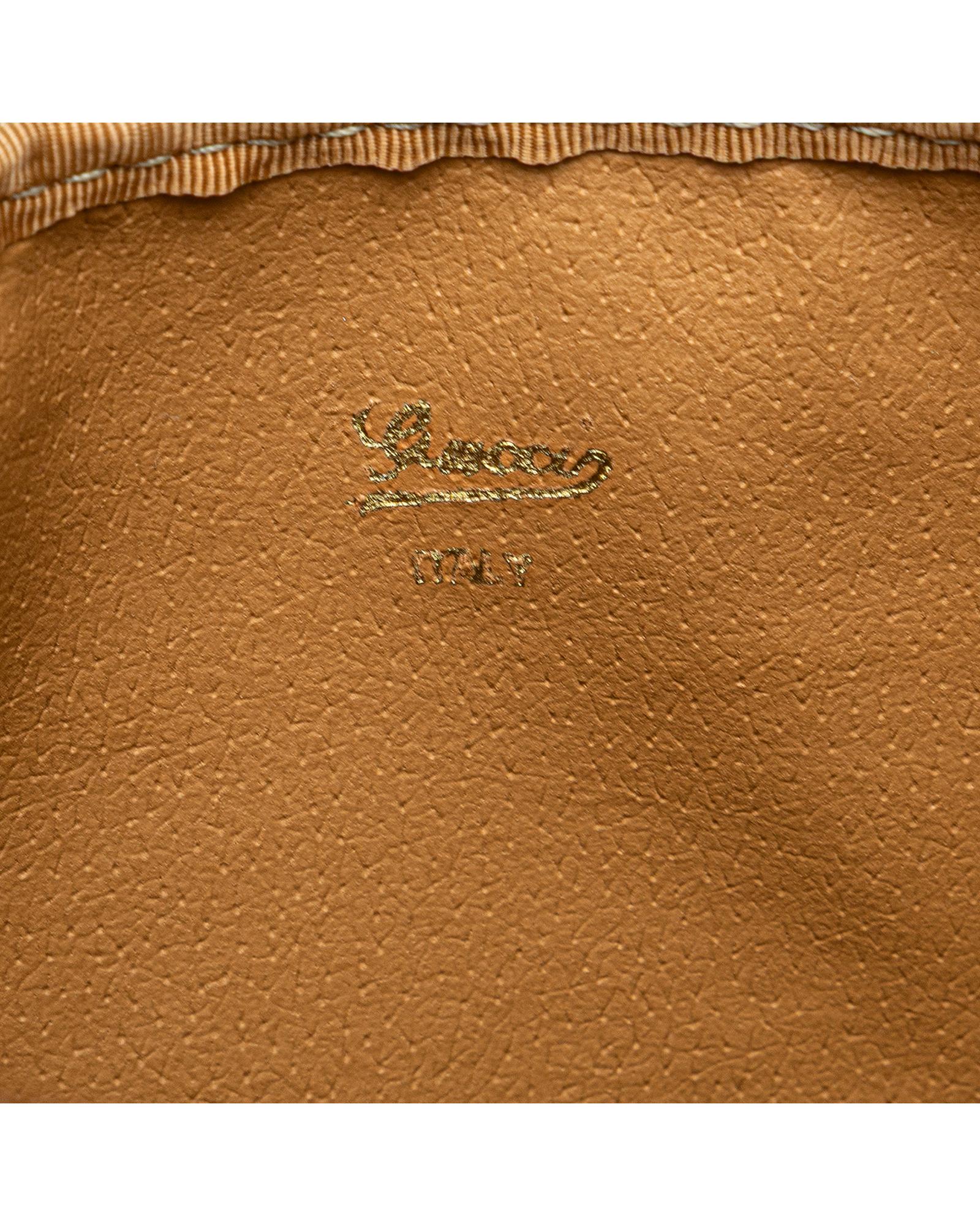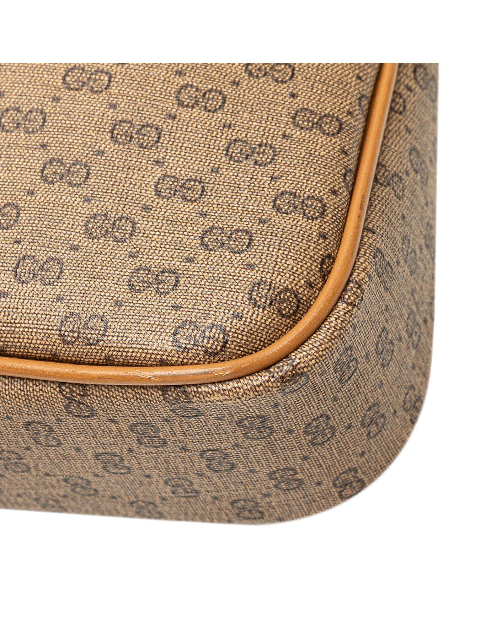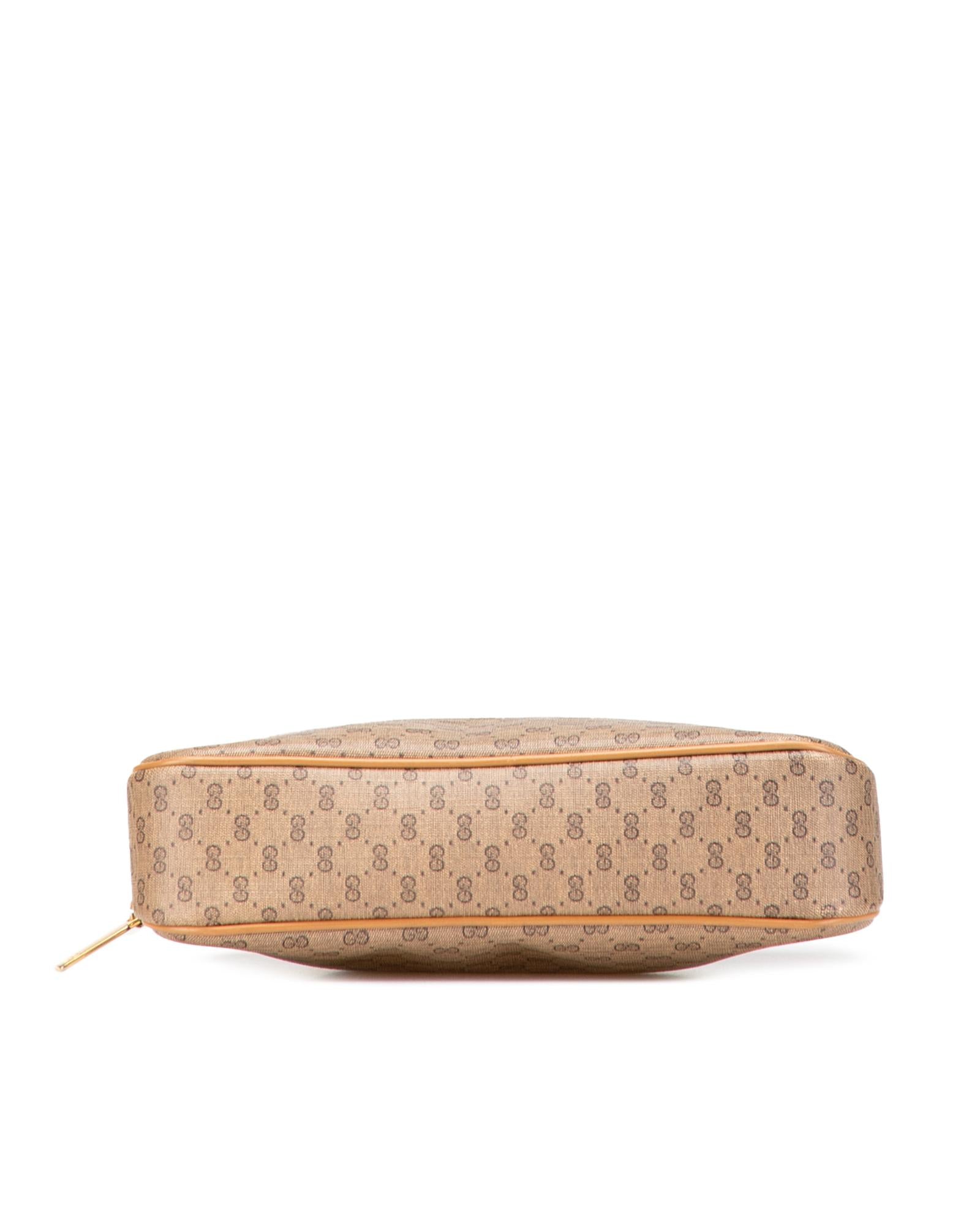 This clutch bag features a coated canvas body with leather trim a top zip closure and an interior slip pocket.Brand: Gucci Vintage