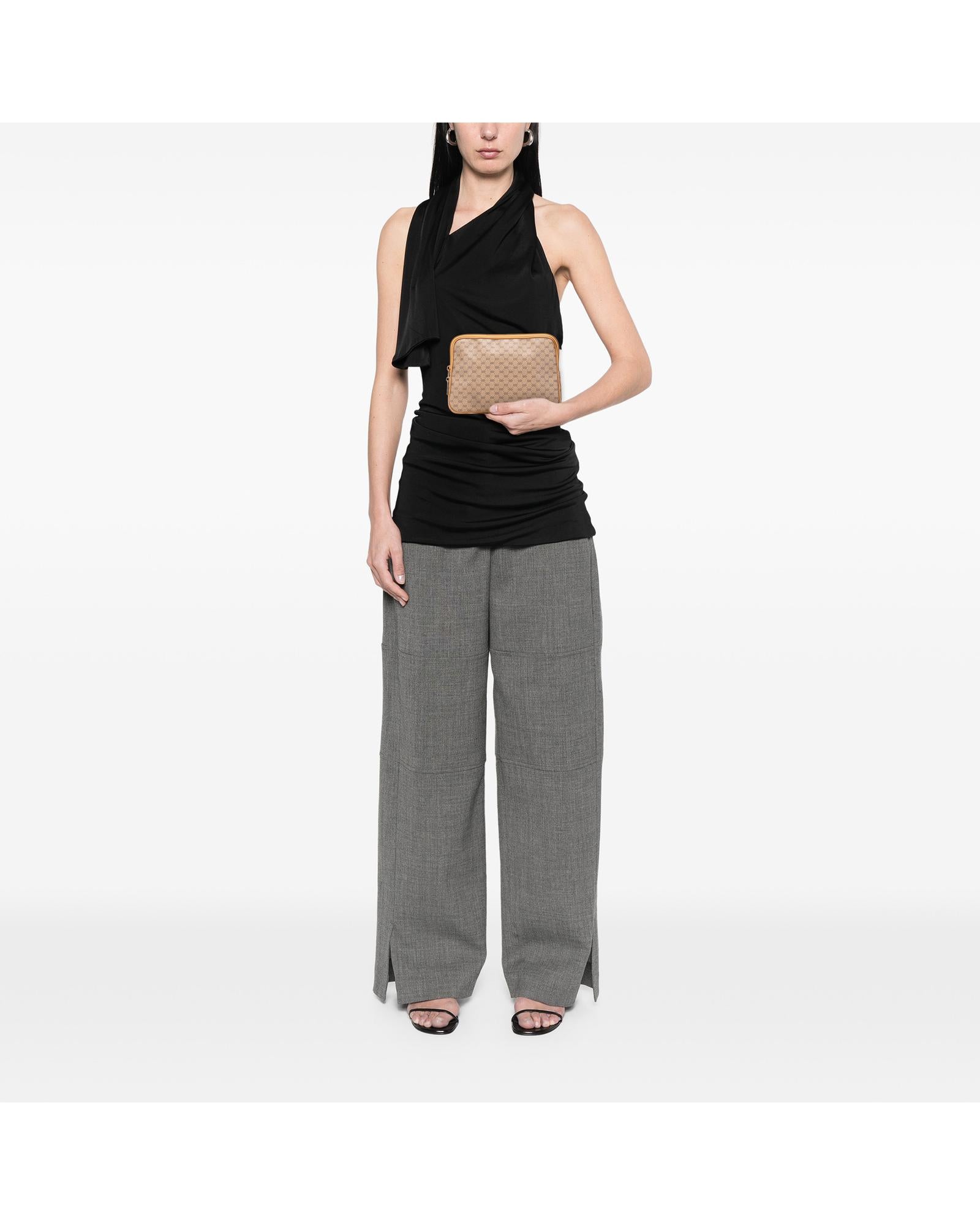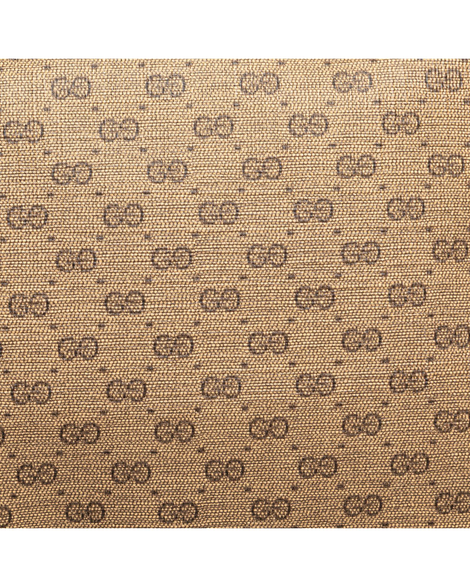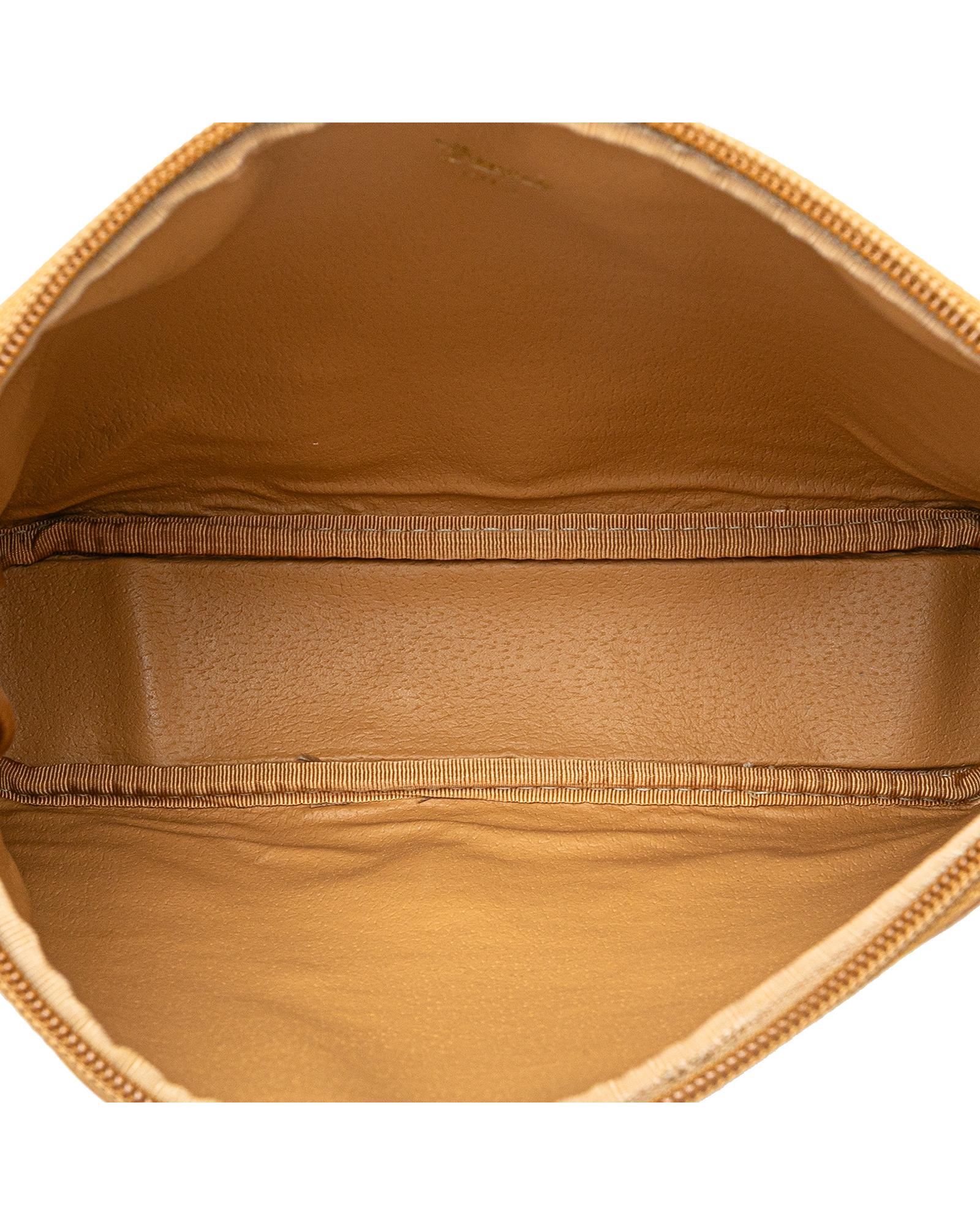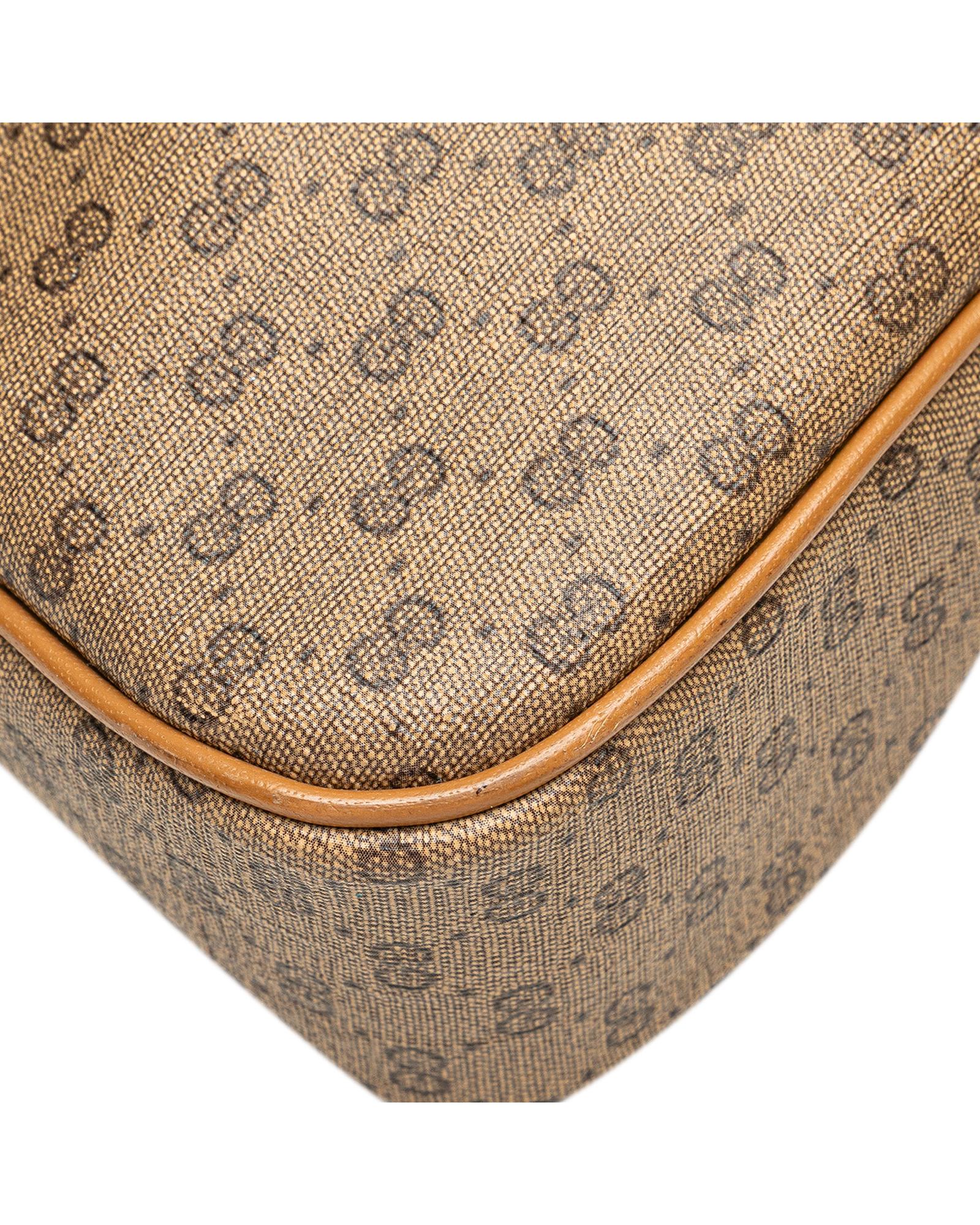 This clutch bag features a coated canvas body with leather trim a top zip closure and an interior slip pocket.Brand: Gucci Vintage
