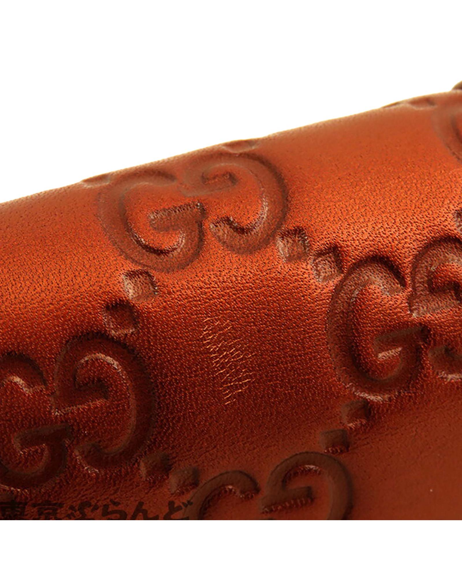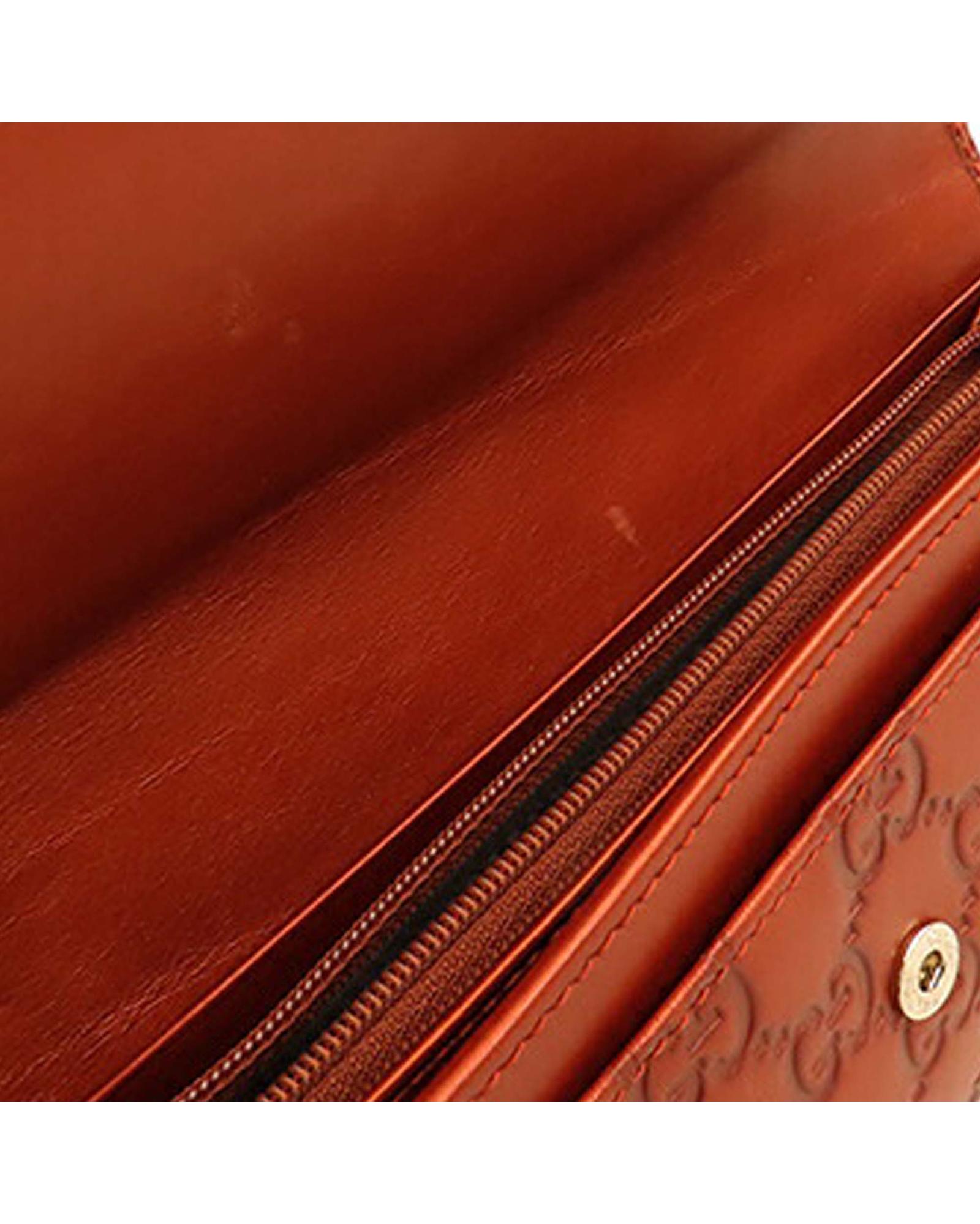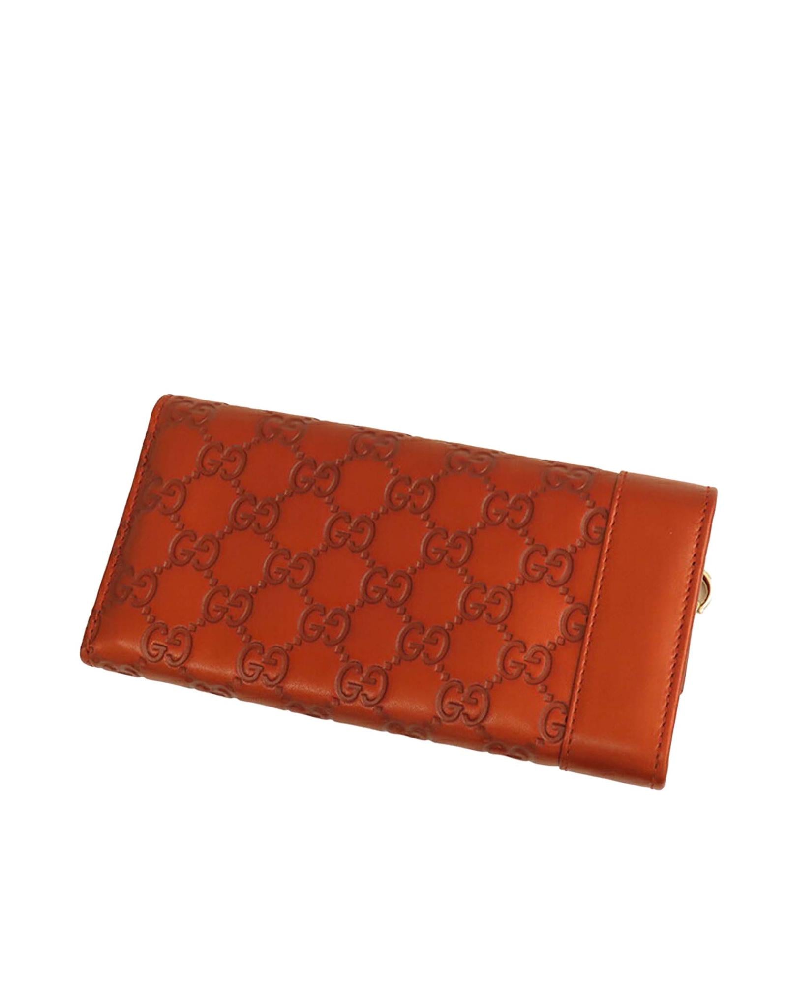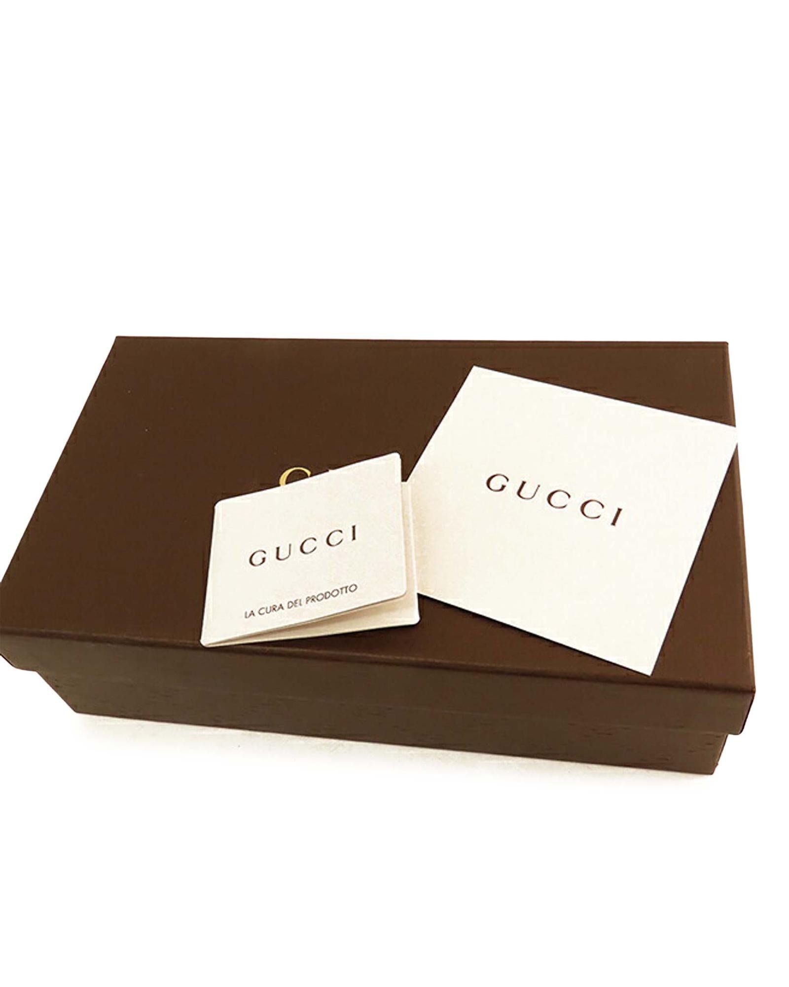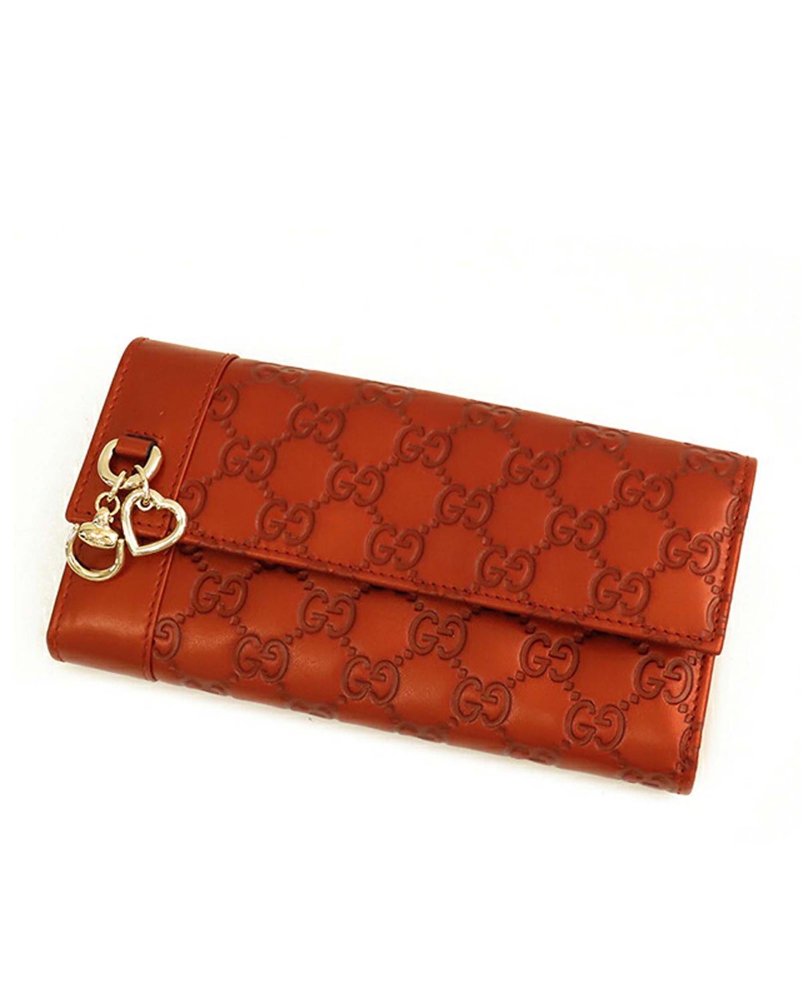 This long wallet features an embossed leather body with heart charms a front flap with snap button closure bill compartments and interior zip and slip pockets.Brand: Gucci Vintage