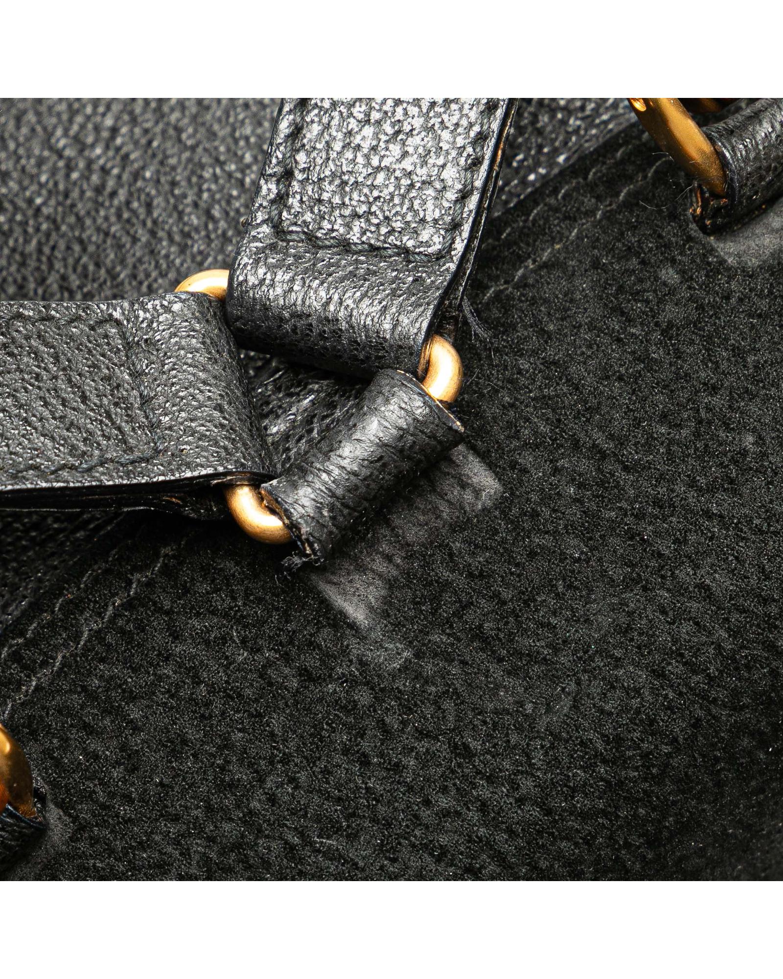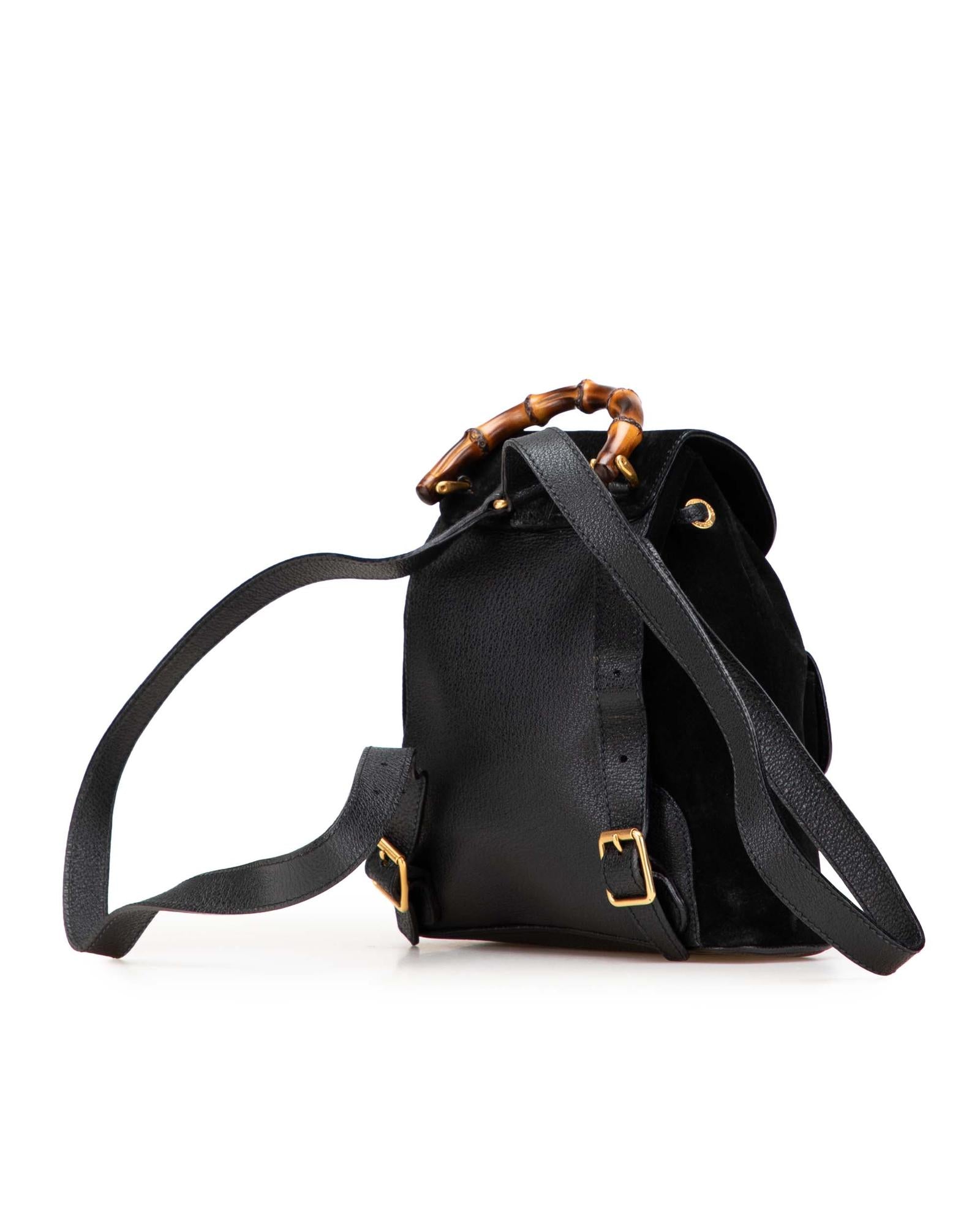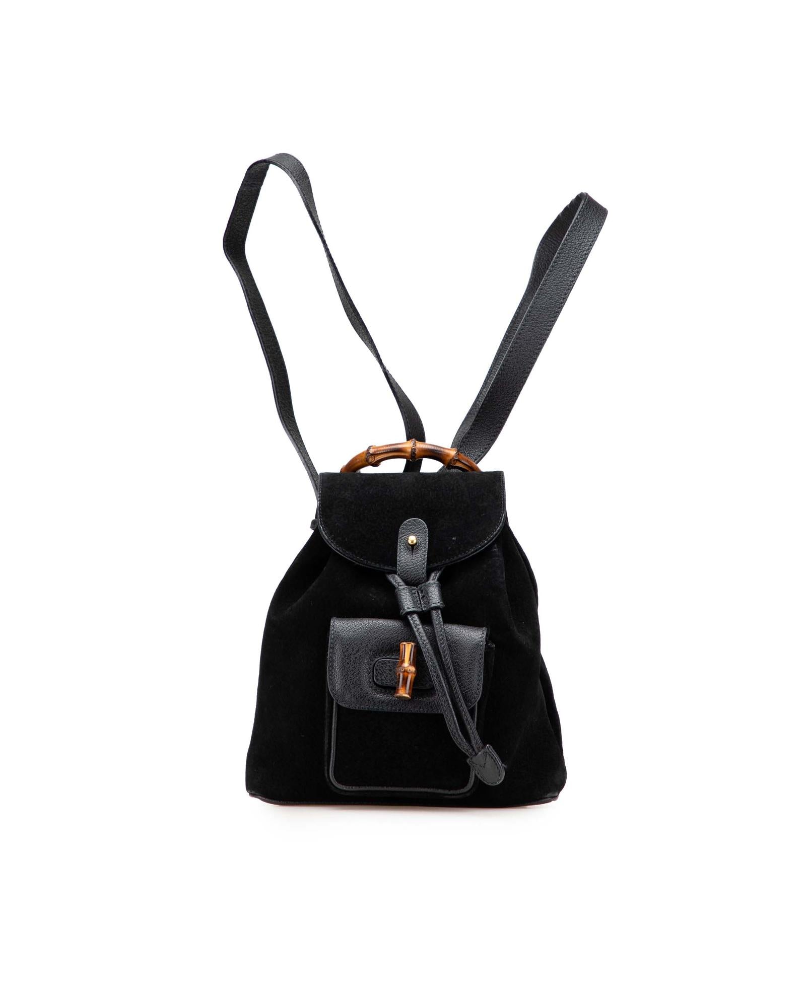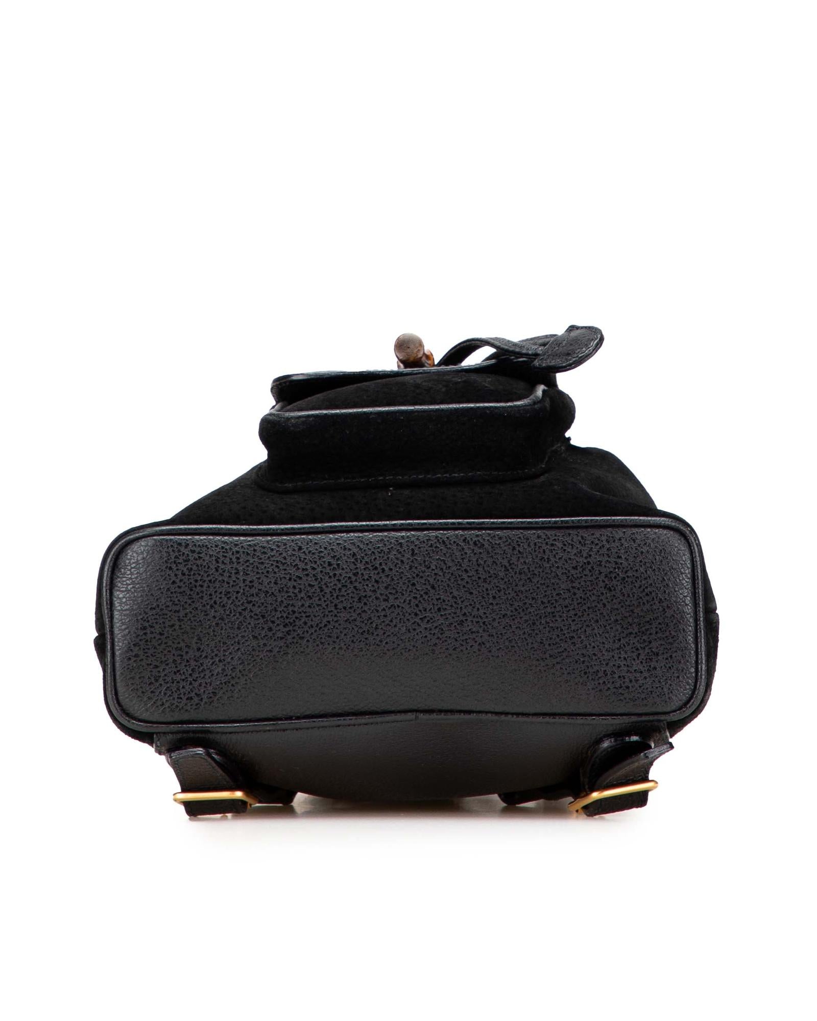 This backpack features a suede body with leather trim flat leather back straps a bamboo top handle a top flap with buckle closure drawstring closure an exterior front flap pocket with bamboo twist lock closure and an interior zip pocket.Brand: Gucci Vintage