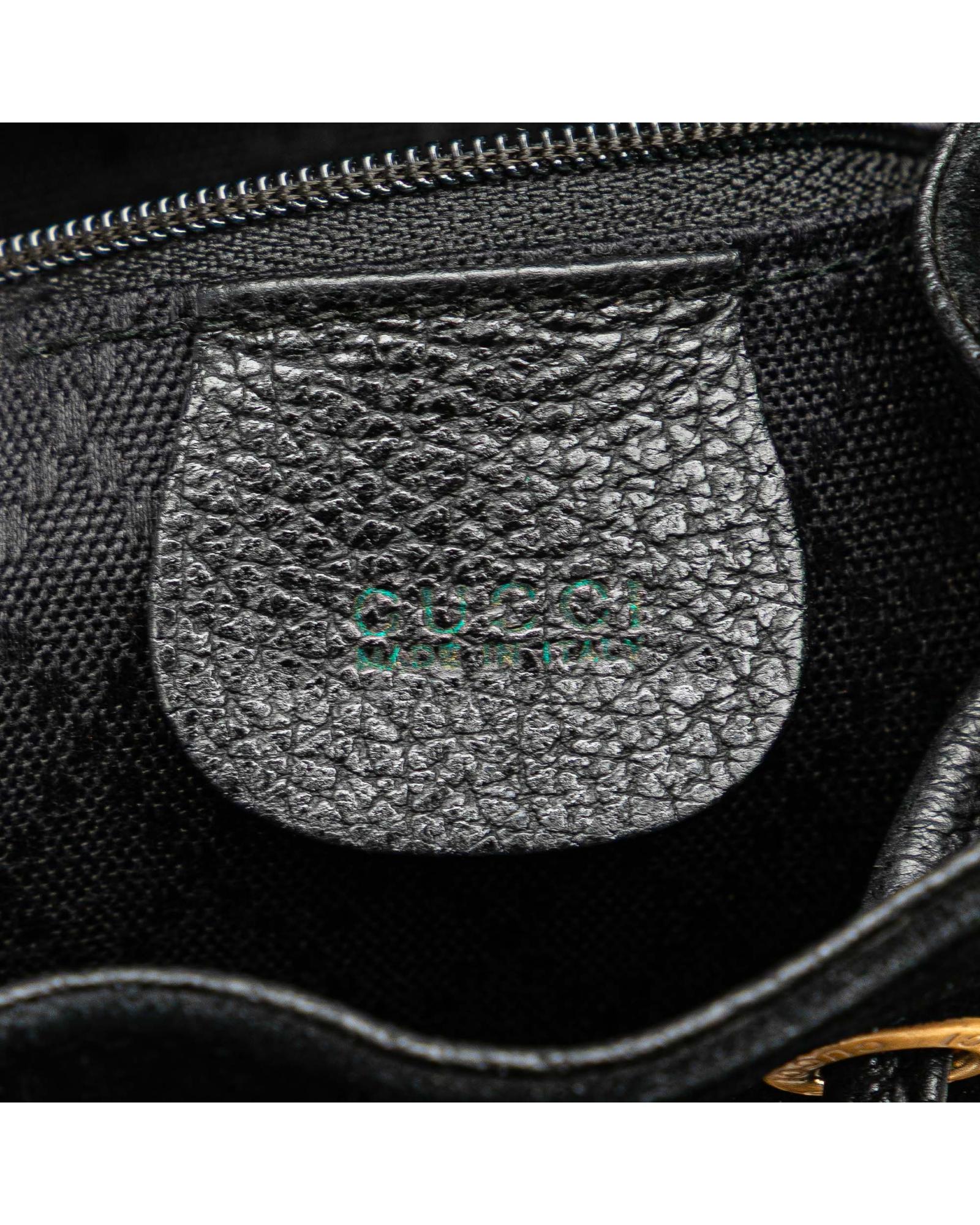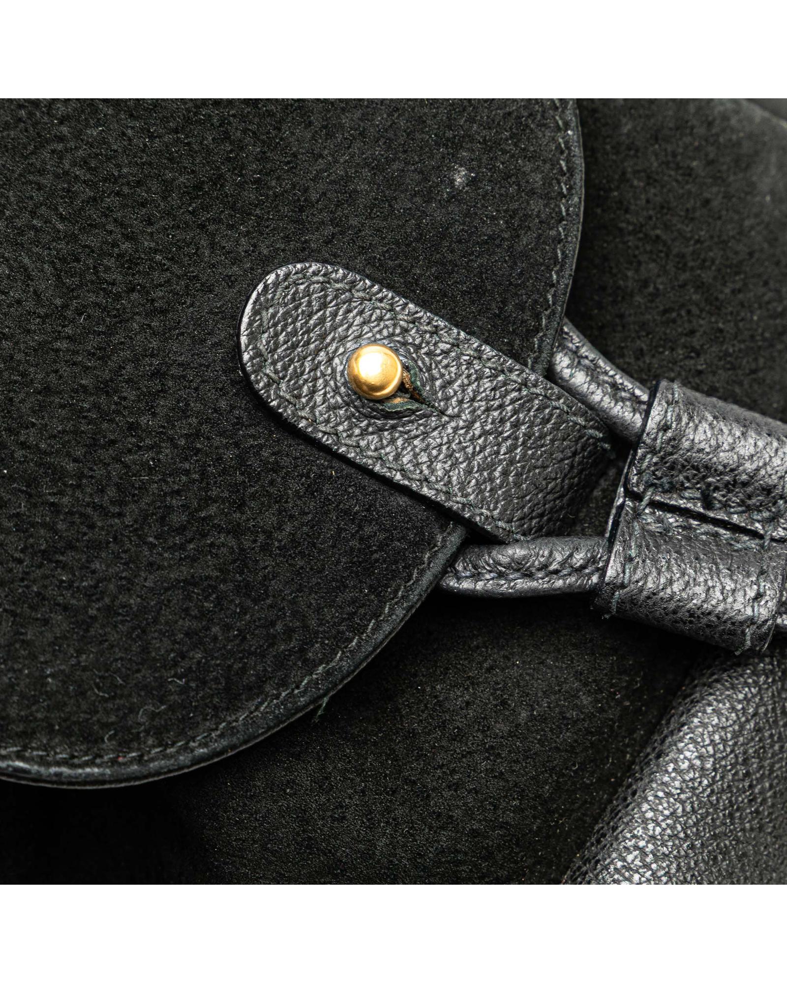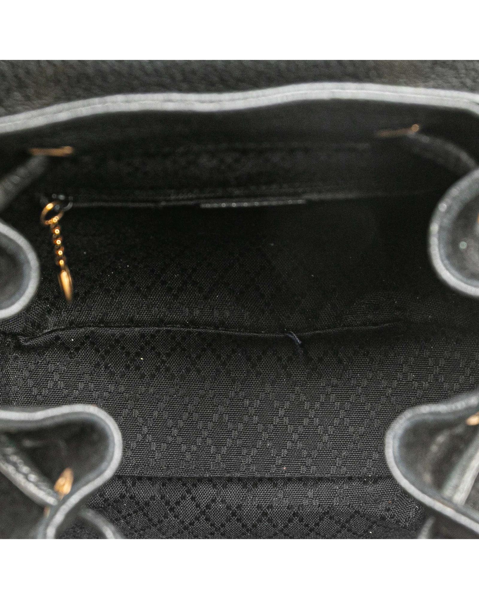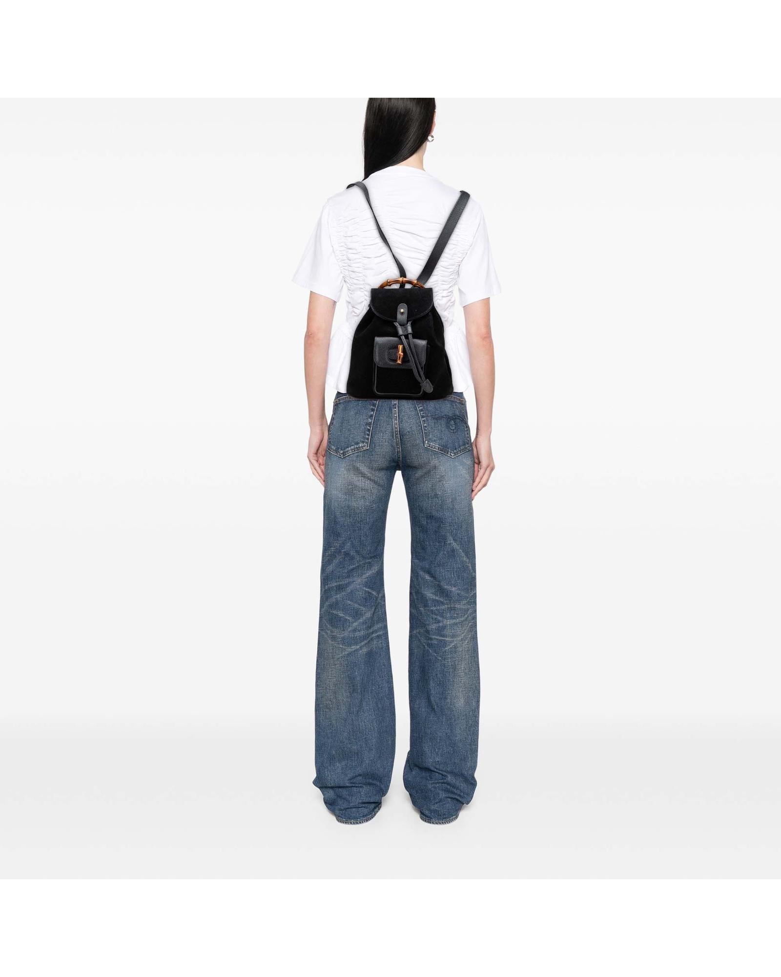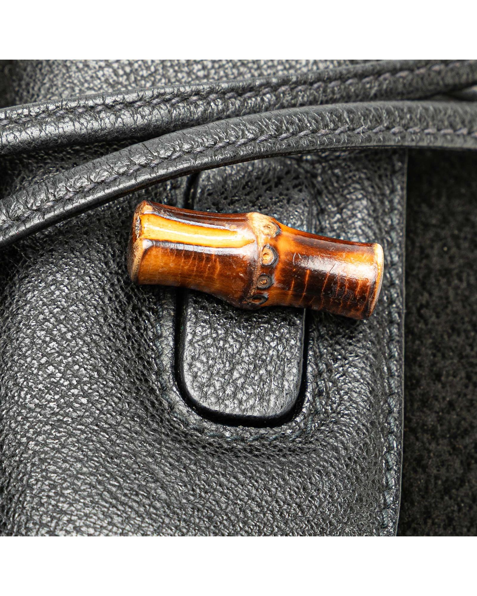 This backpack features a suede body with leather trim flat leather back straps a bamboo top handle a top flap with buckle closure drawstring closure an exterior front flap pocket with bamboo twist lock closure and an interior zip pocket.Brand: Gucci Vintage