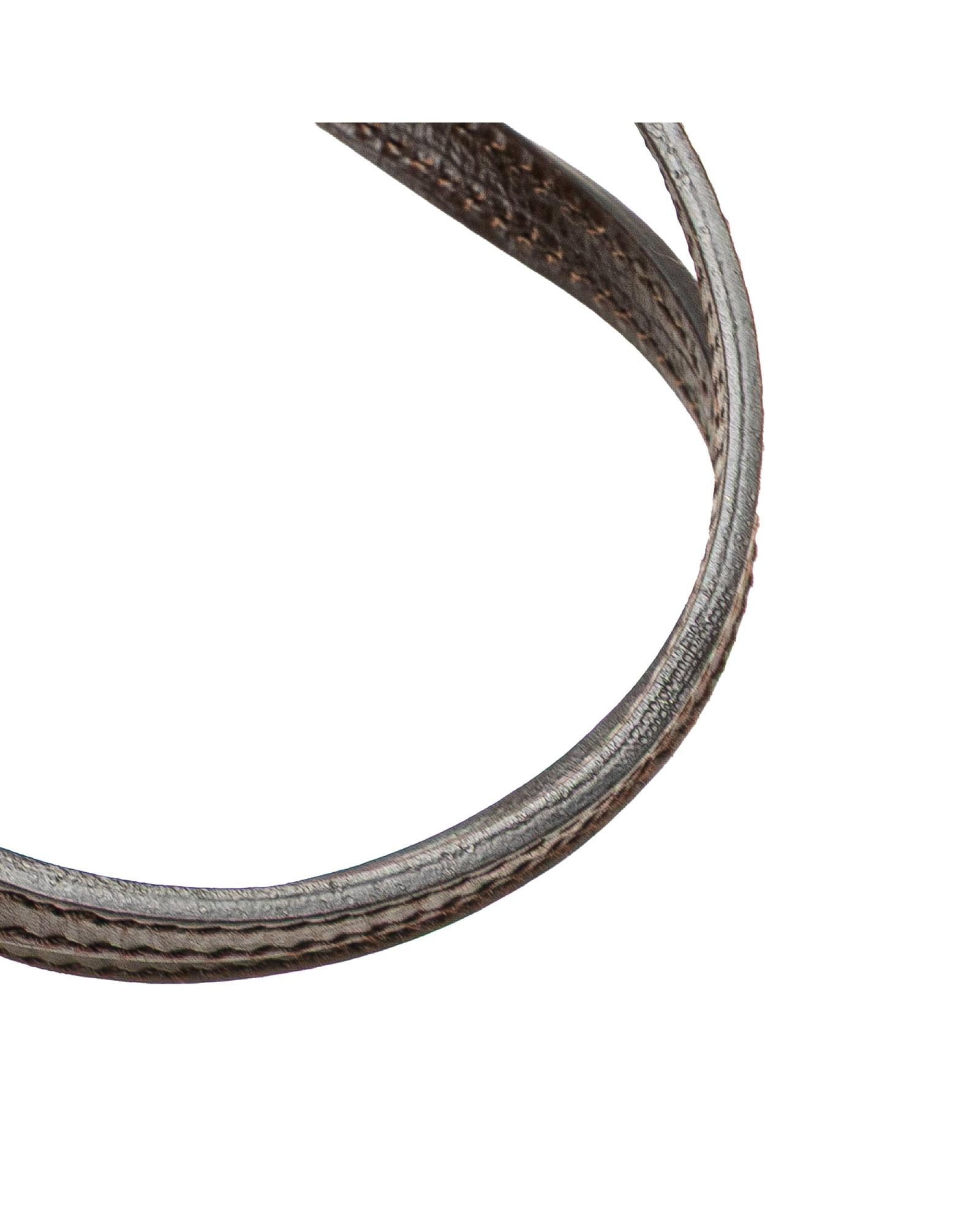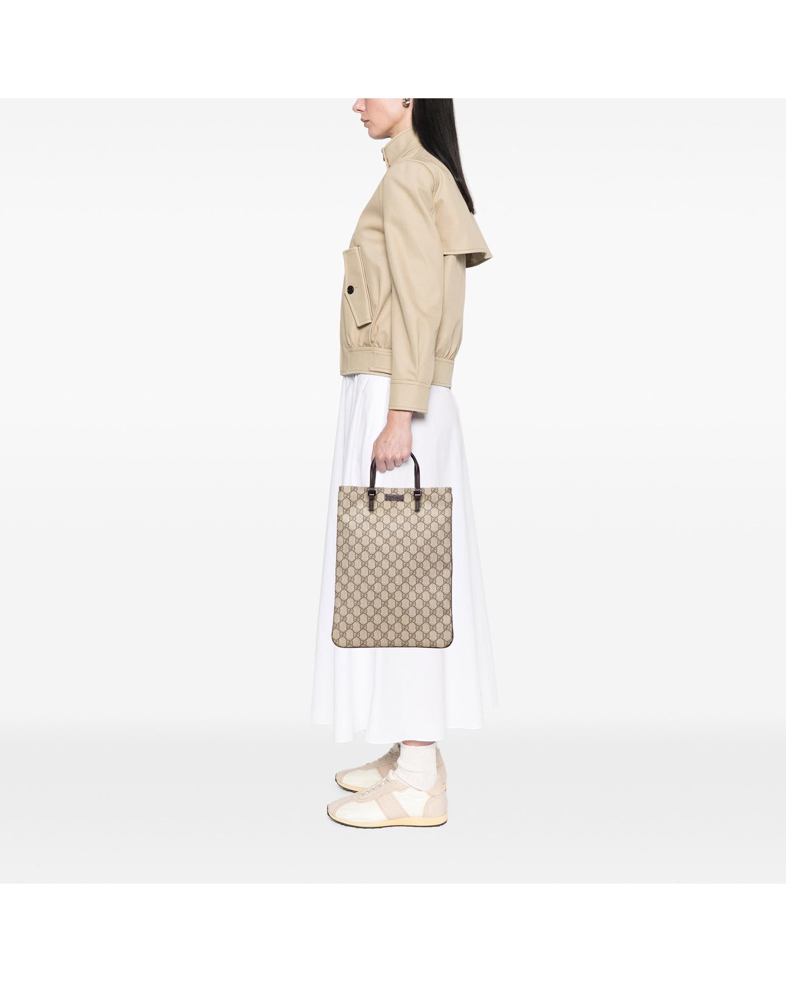 This tote bag features a coated canvas body with leather trim flat leather straps an open top with magnetic snap closure and an interior zip pocket.