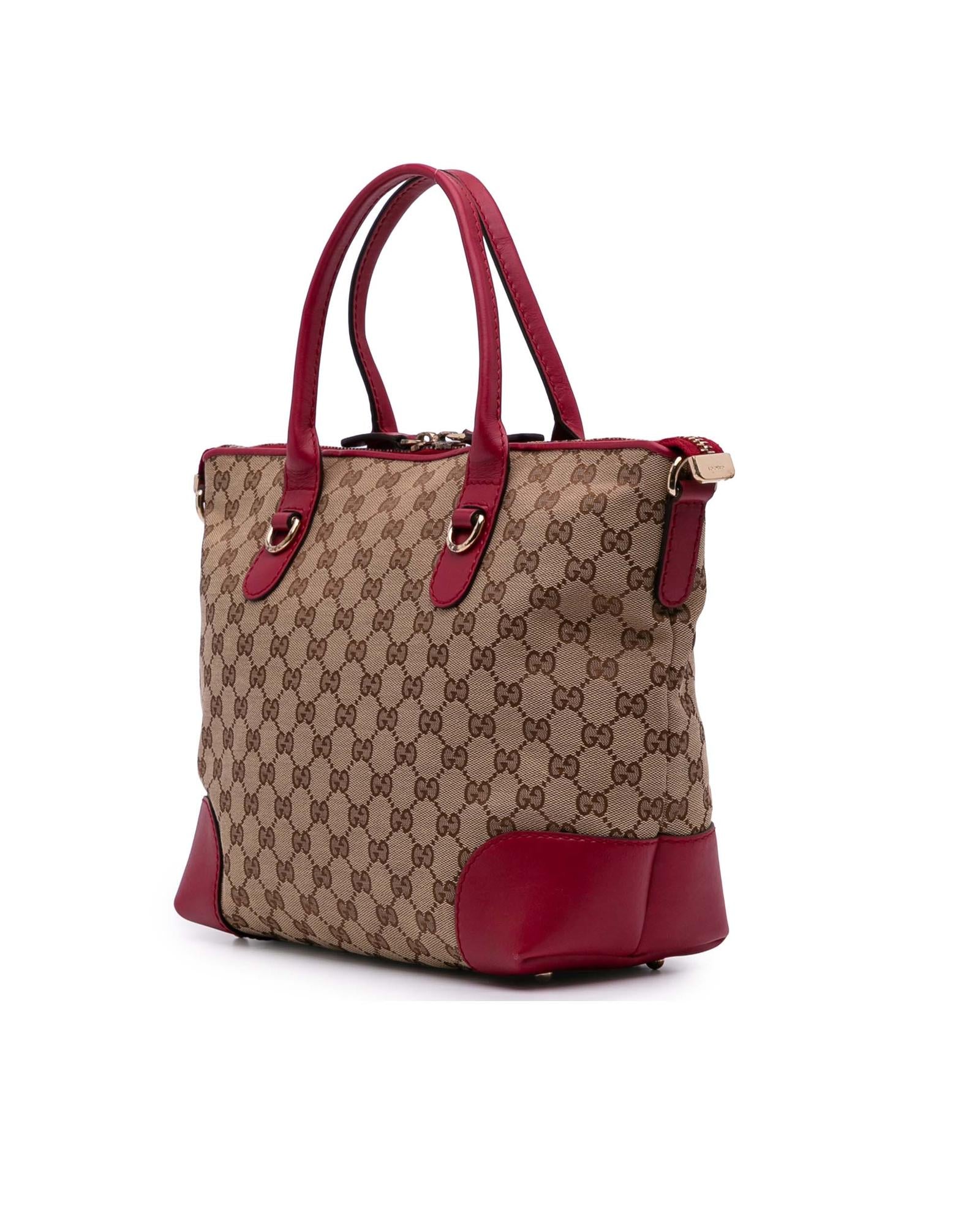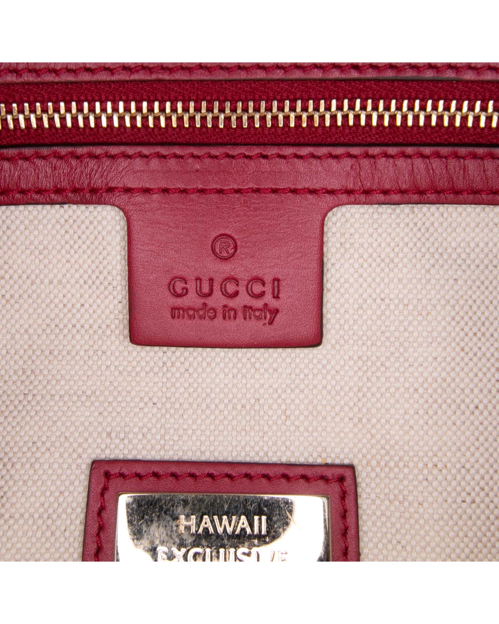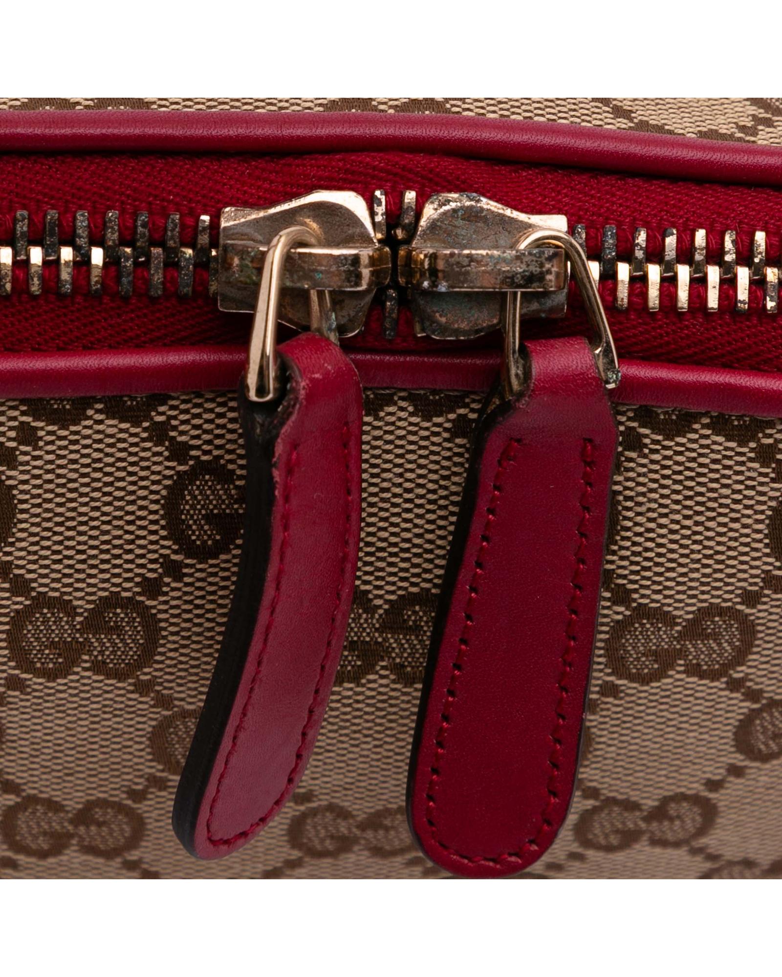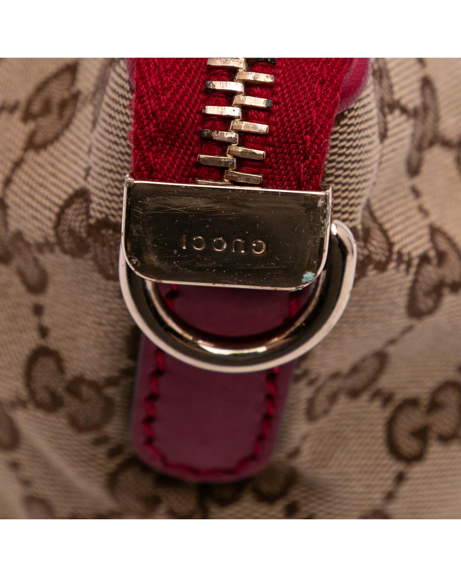 This satchel features a canvas body with leather trim flat leather handles a top zip closure and interior zip and slip pockets.Brand: Gucci Vintage