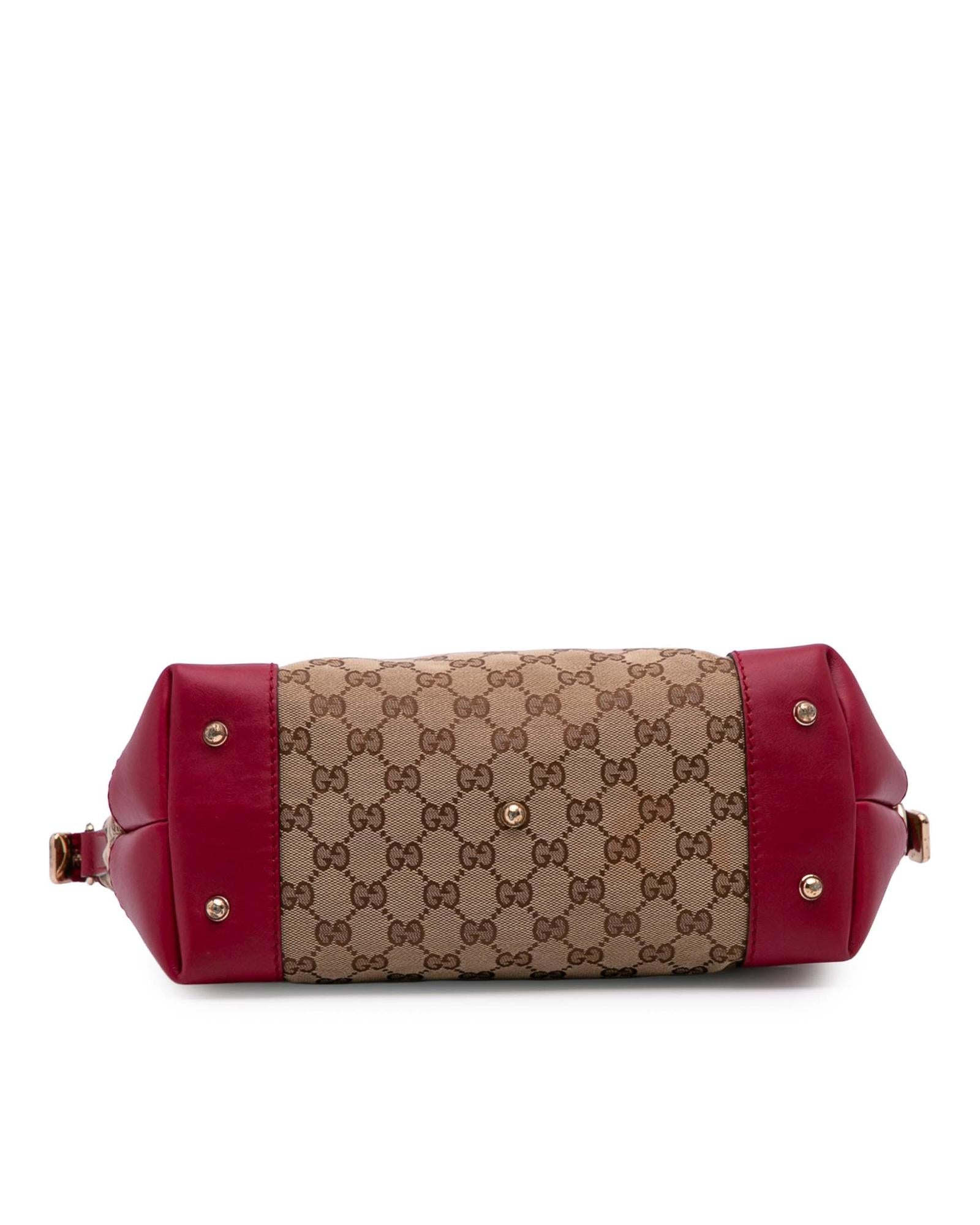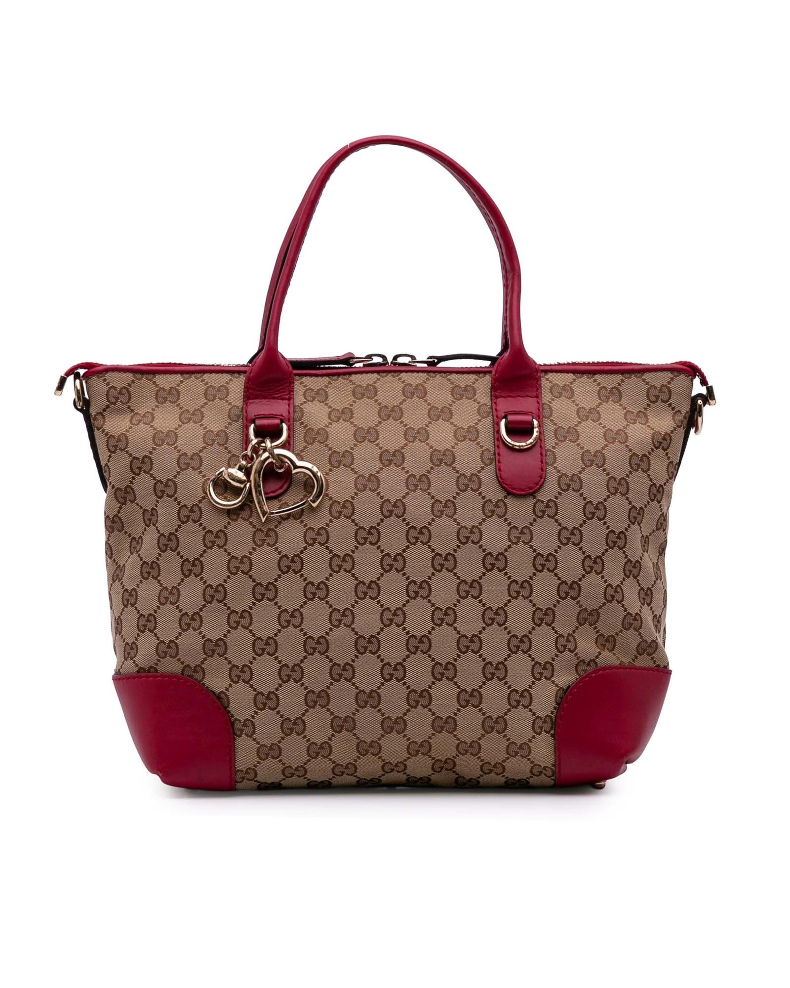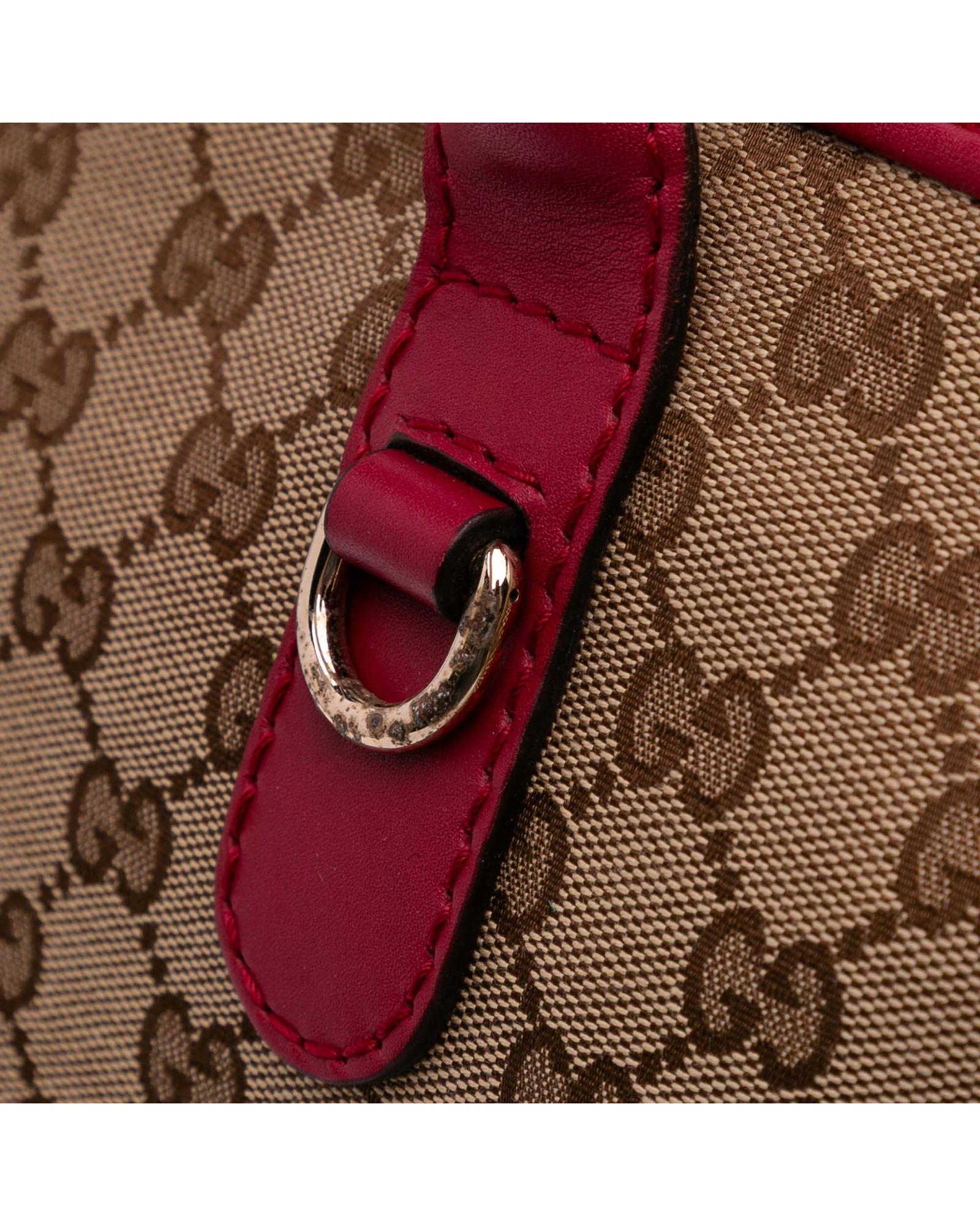 This satchel features a canvas body with leather trim flat leather handles a top zip closure and interior zip and slip pockets.Brand: Gucci Vintage