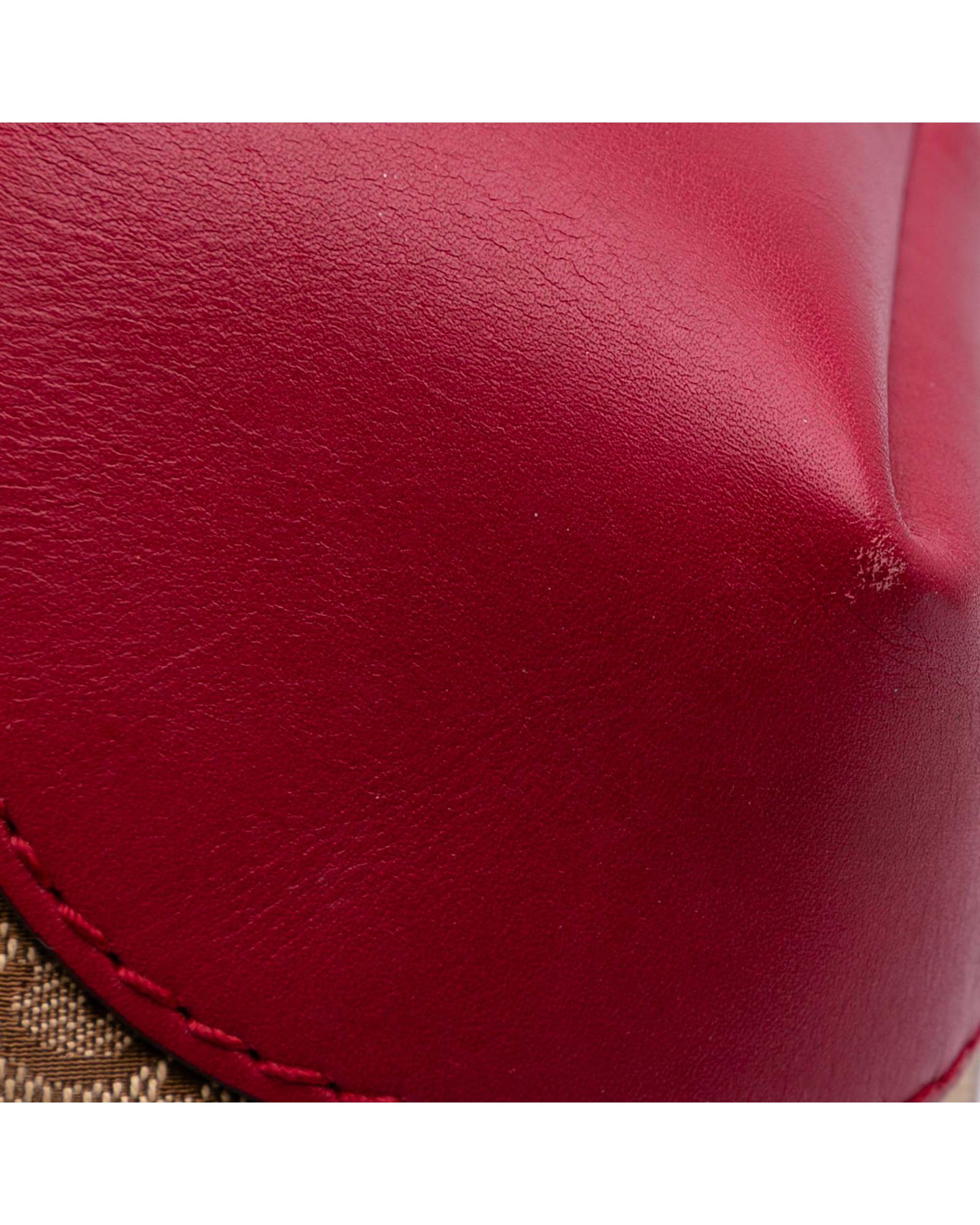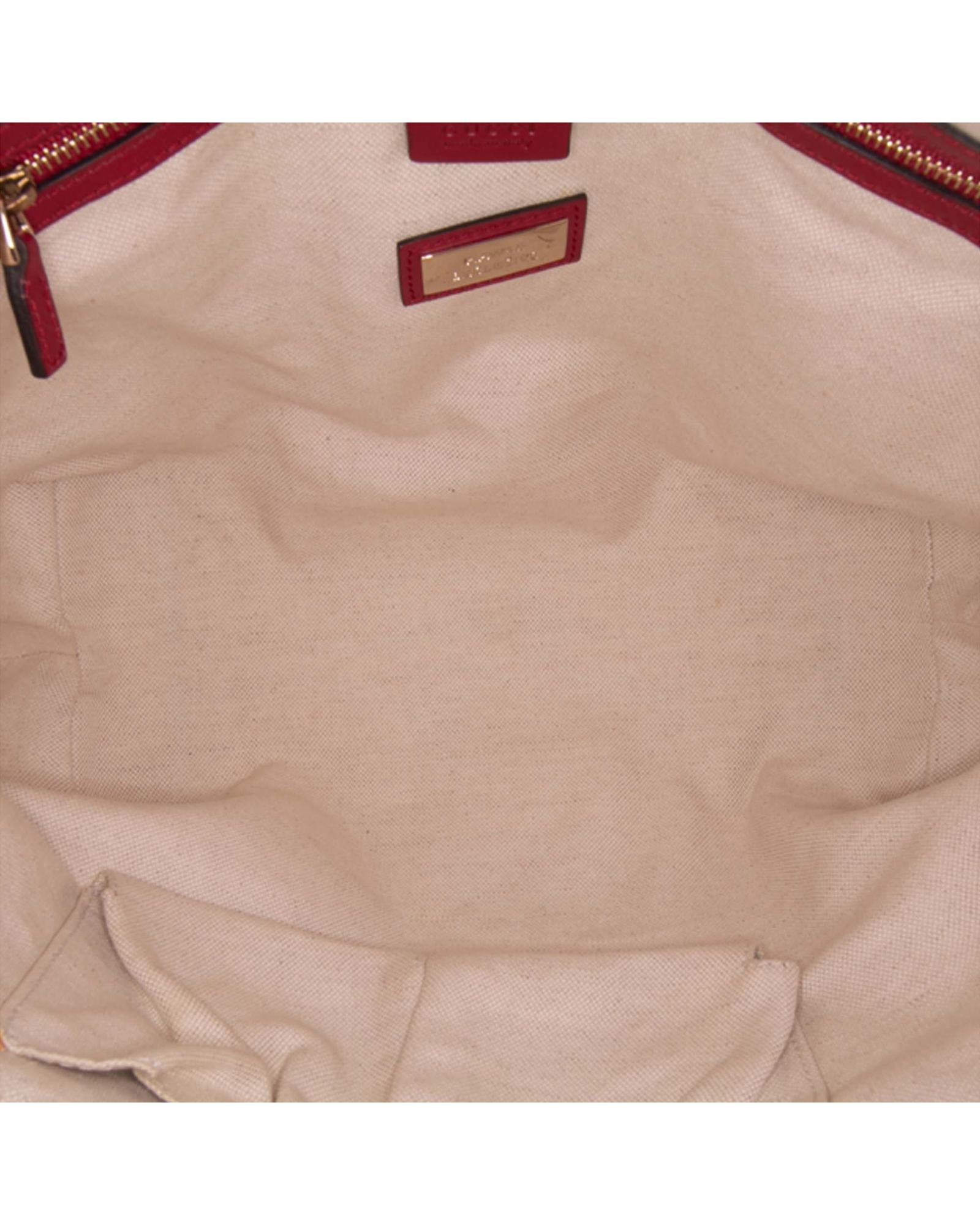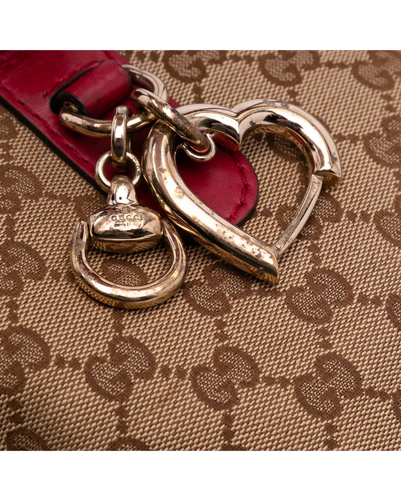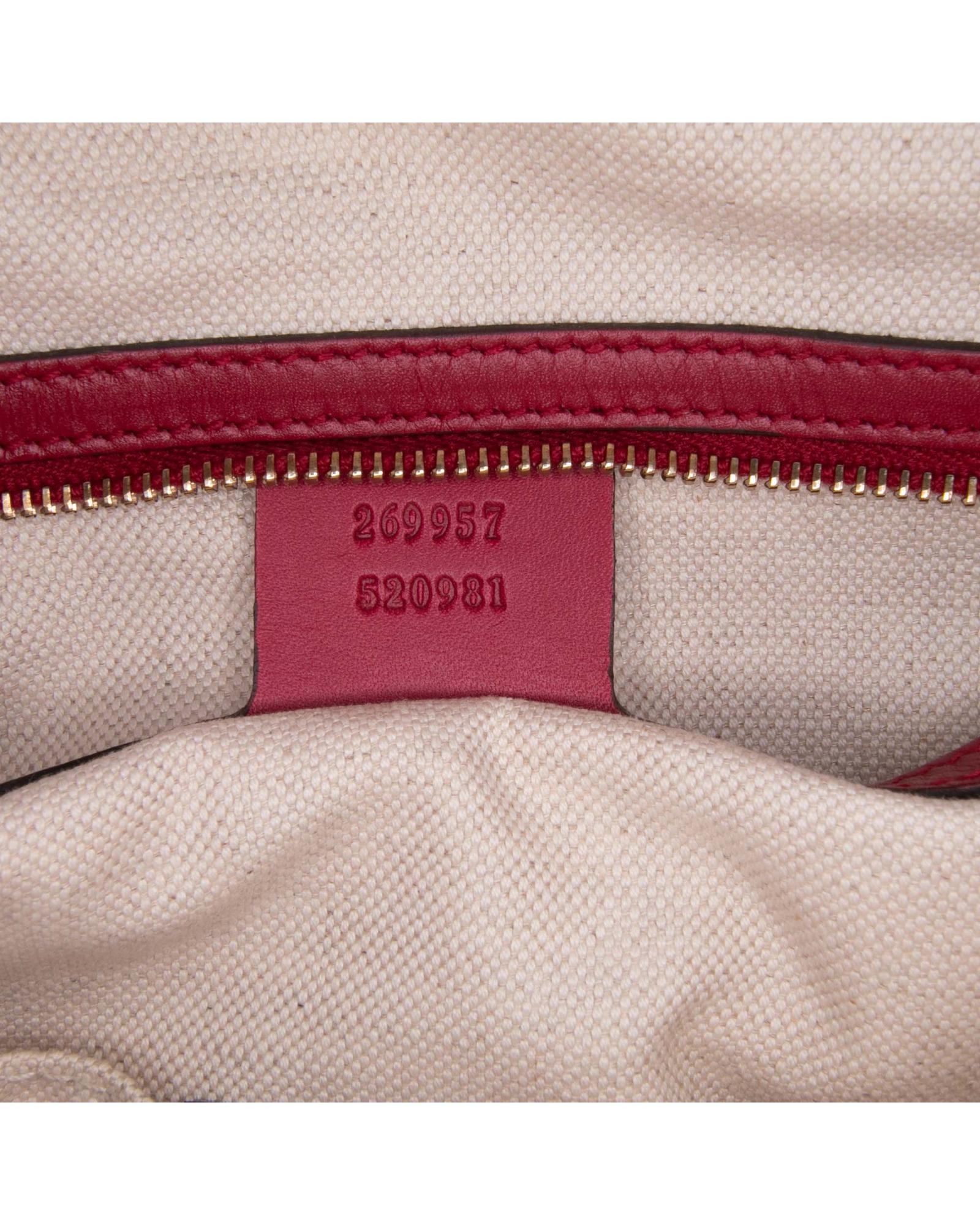 This satchel features a canvas body with leather trim flat leather handles a top zip closure and interior zip and slip pockets.Brand: Gucci Vintage