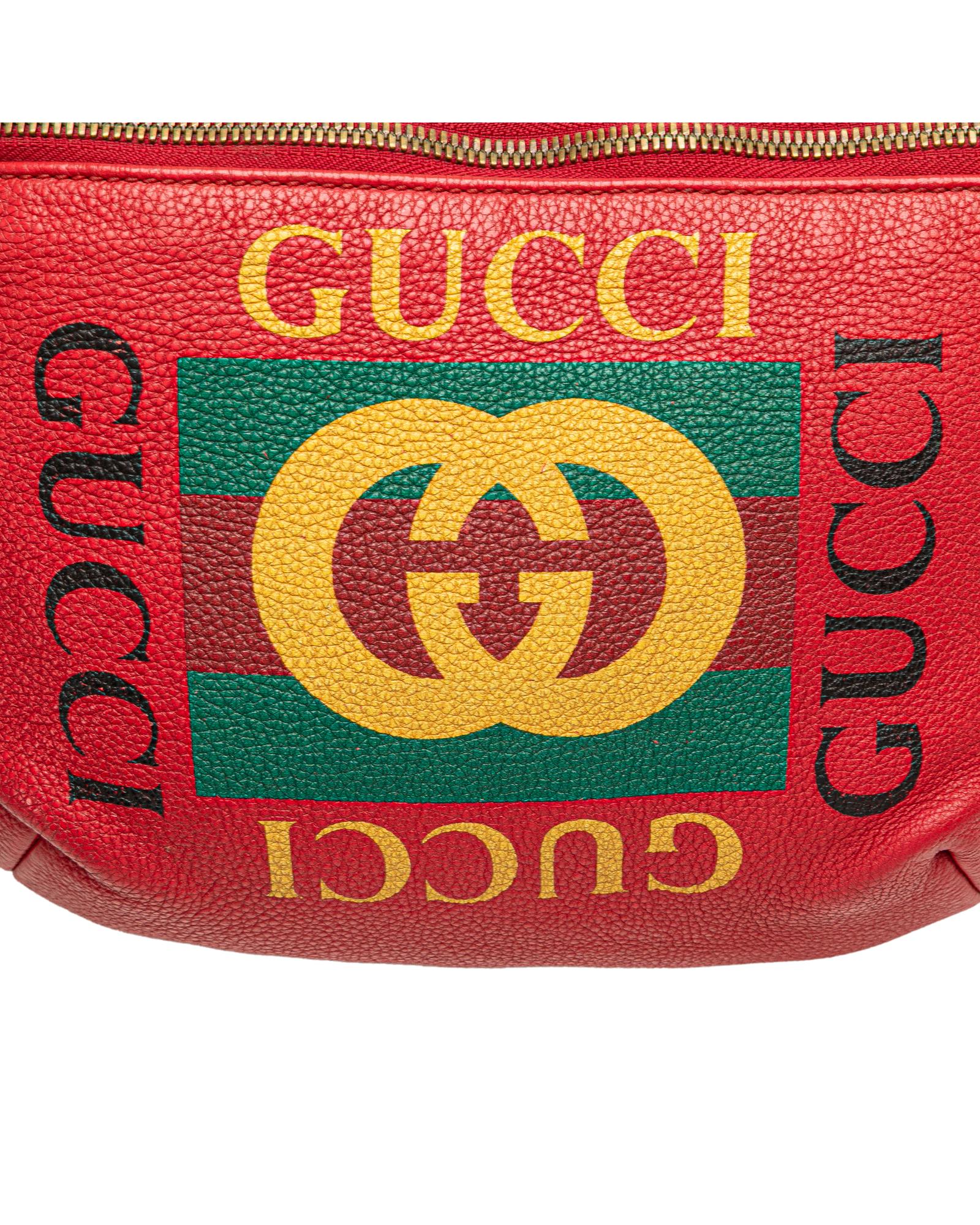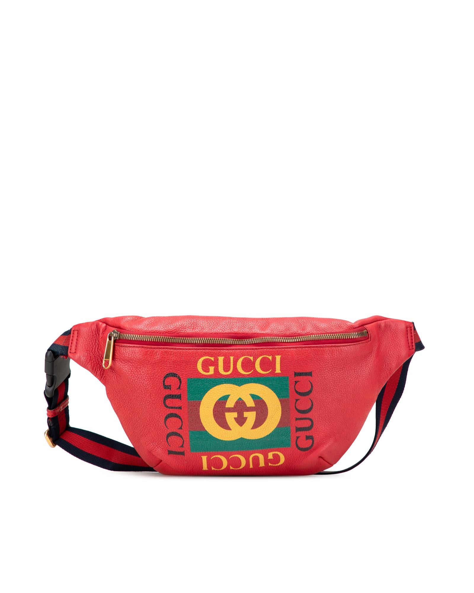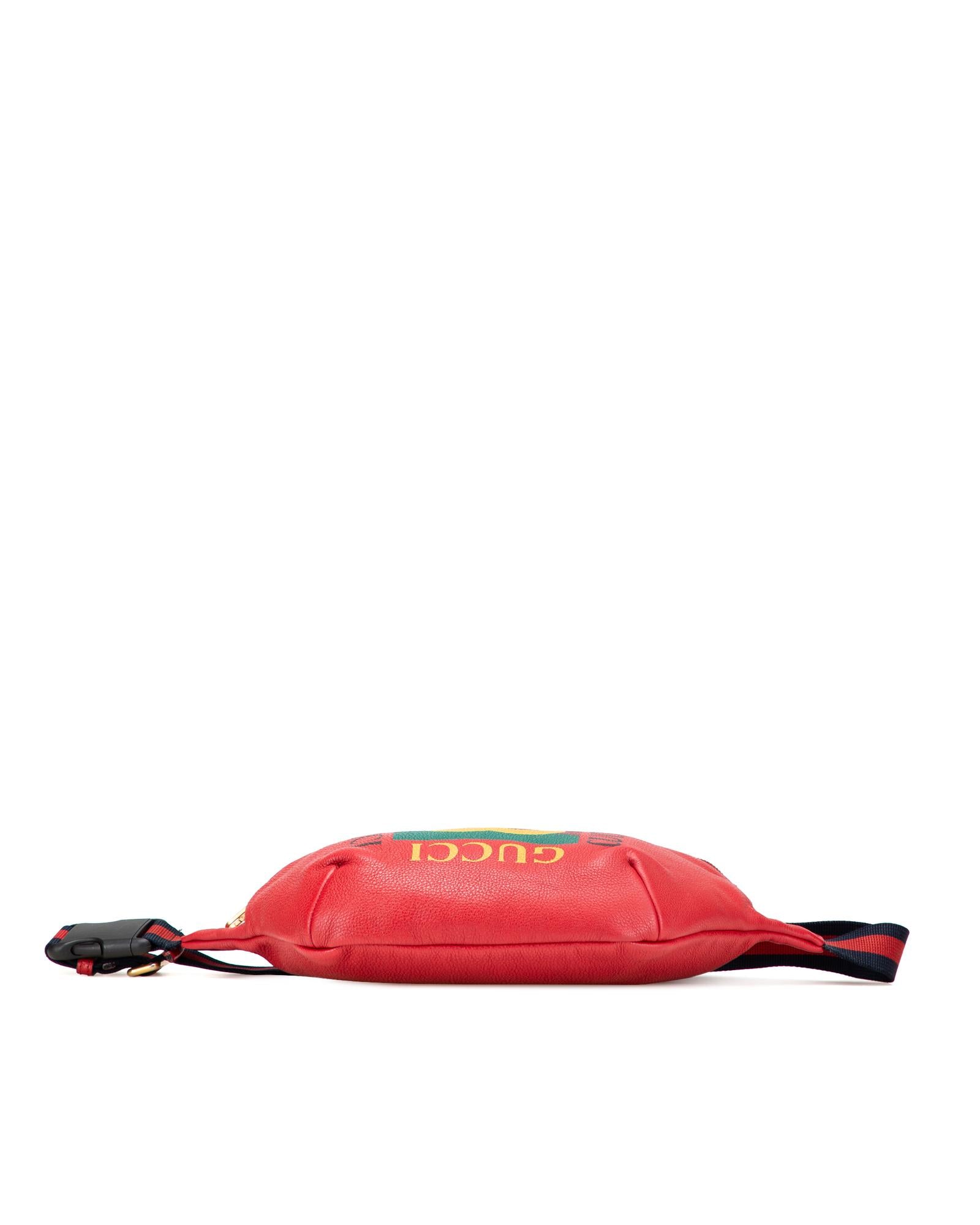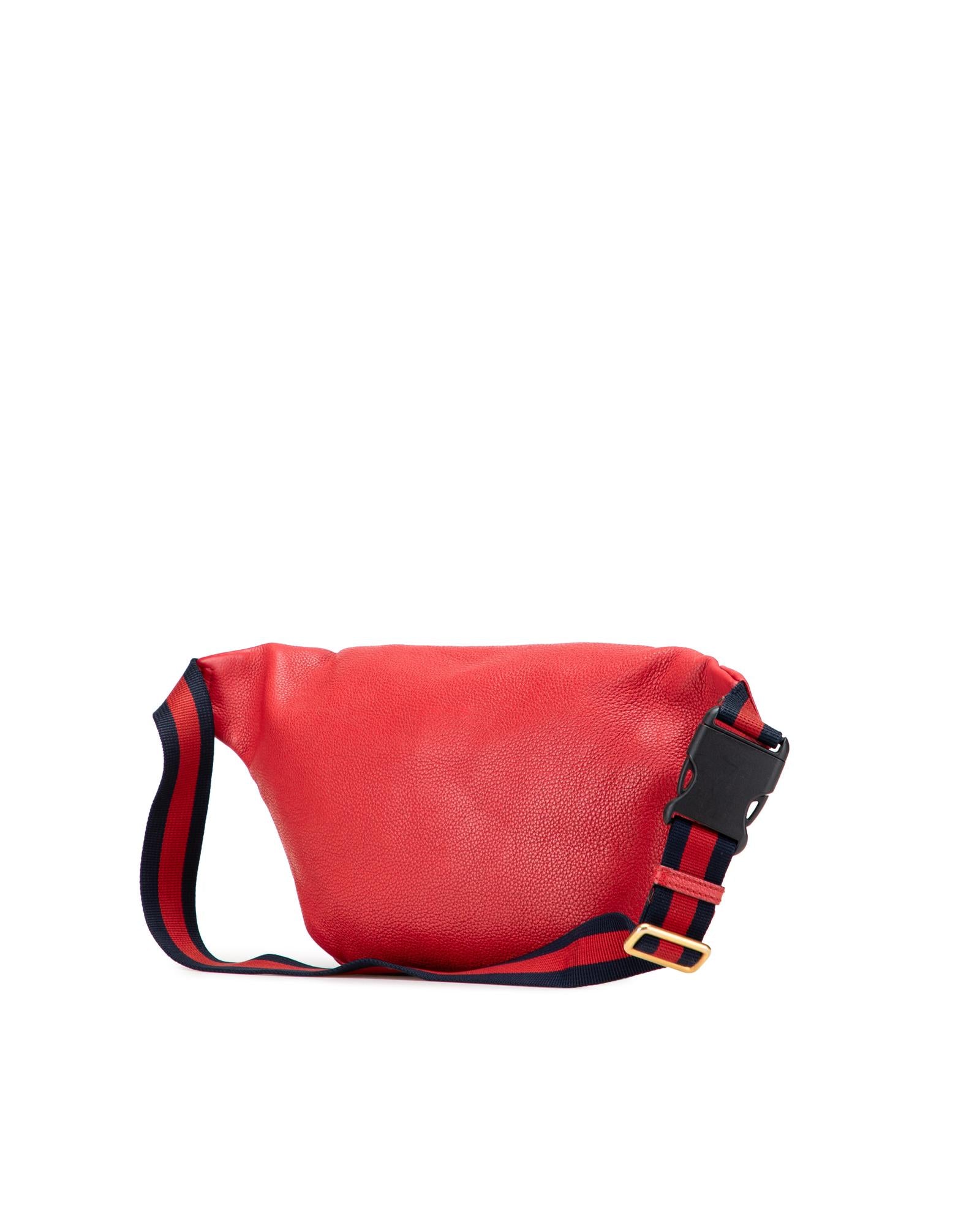This belt bag features a grained calf leather body a flat canvas waist strap with buckle closure and a front zip closure.Brand: Gucci Vintage
