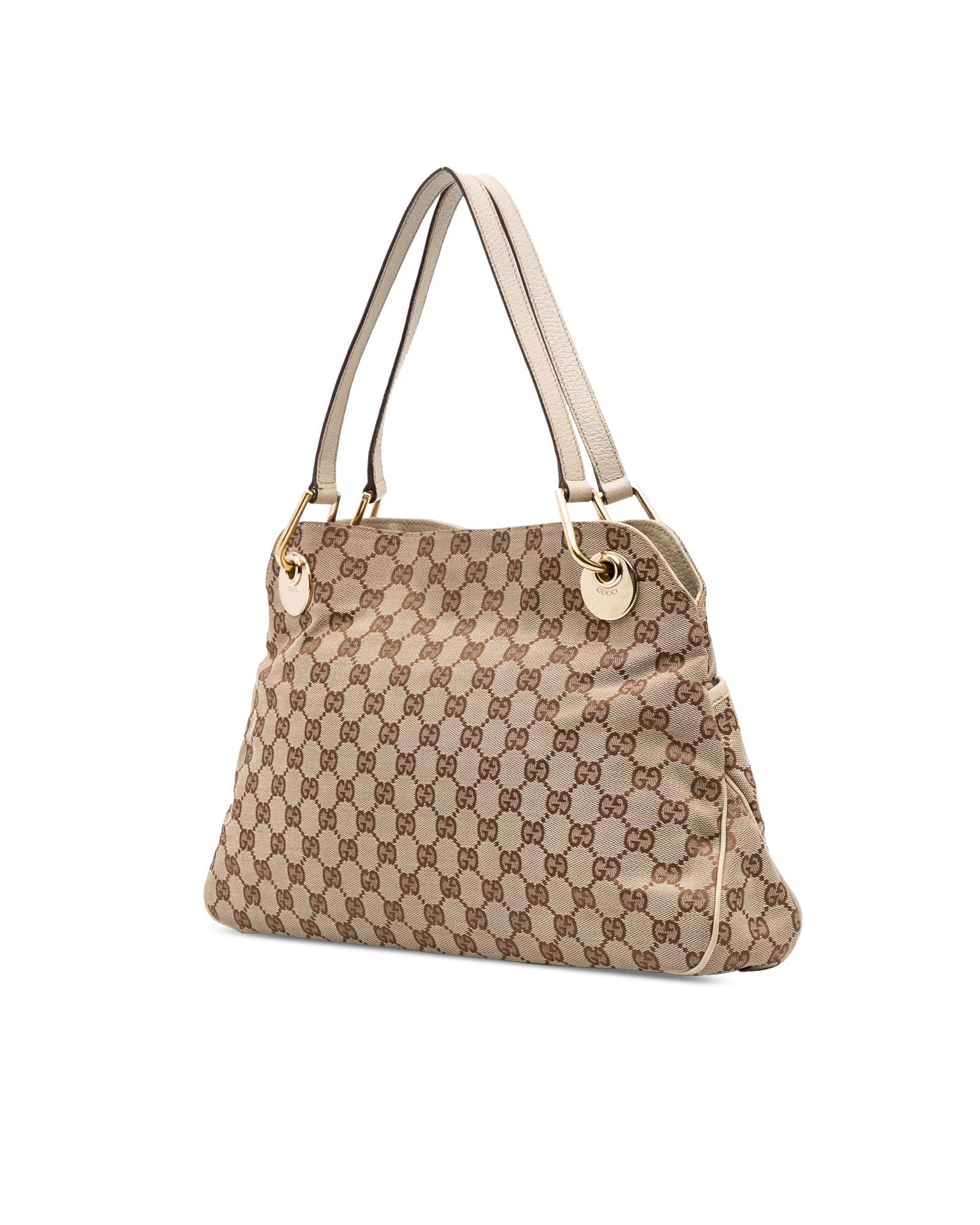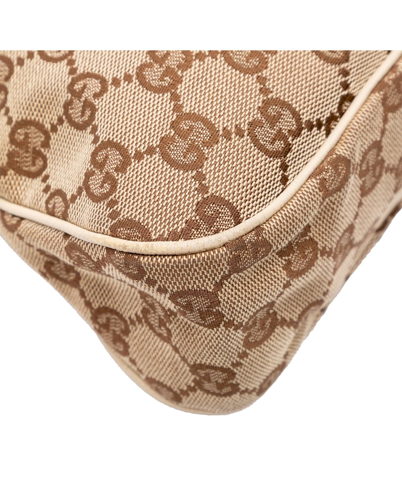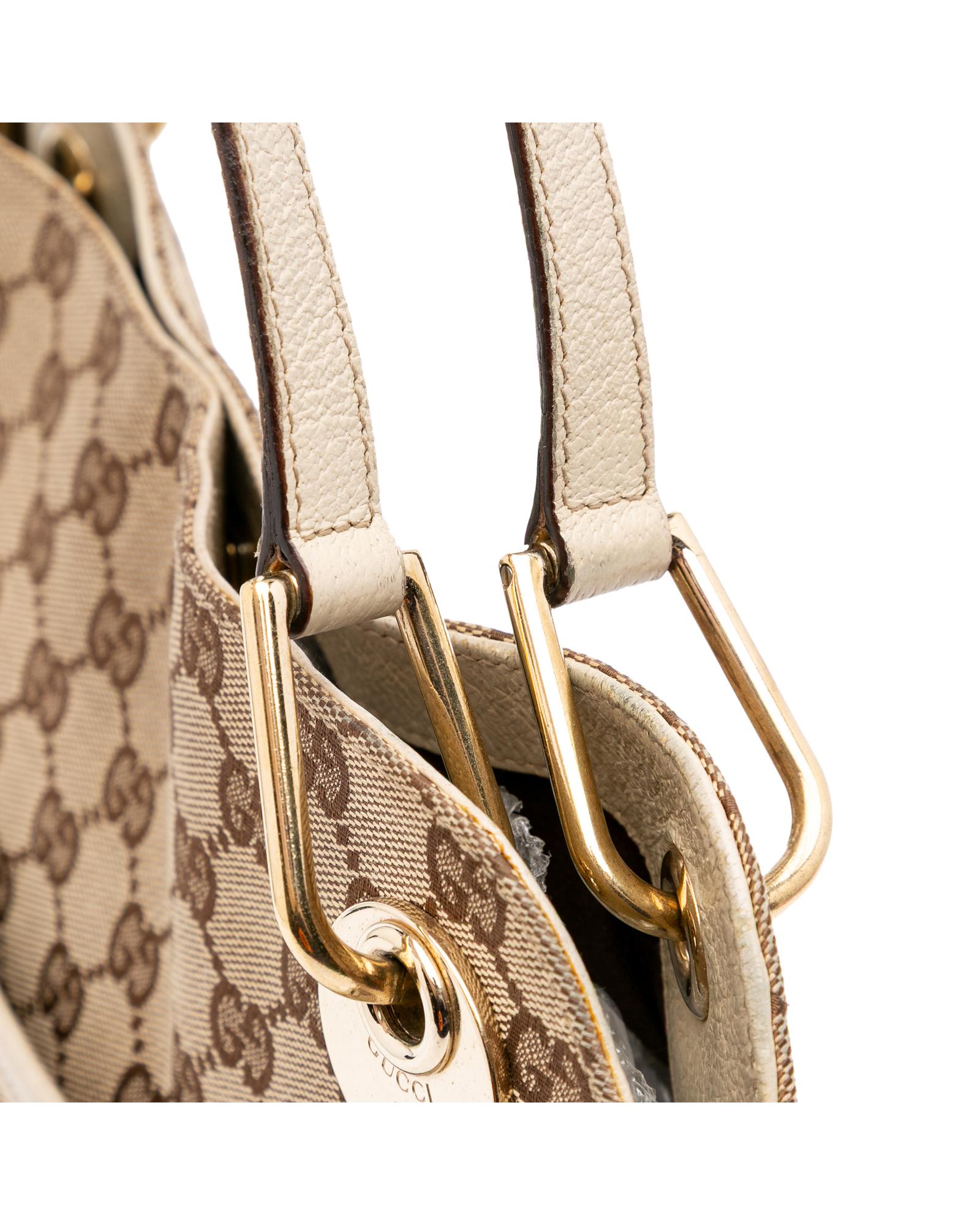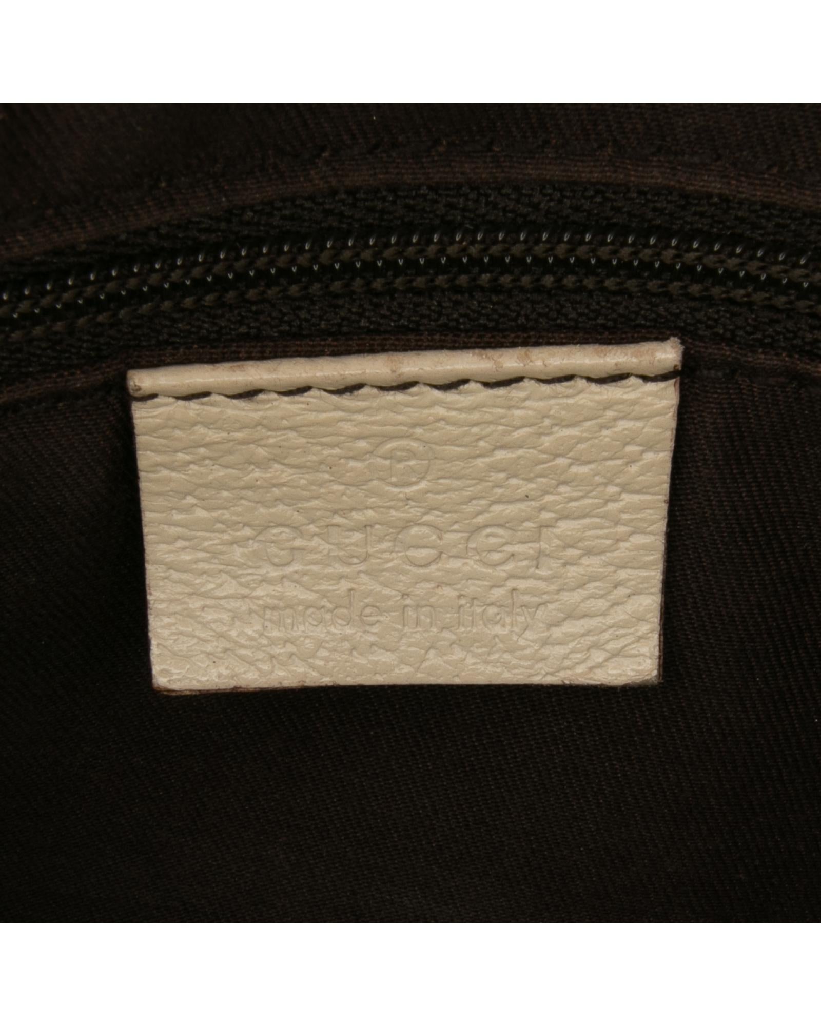 This shoulder bag features a canvas body with leather trim flat leather straps an open top with a magnetic closure an exterior front slip pocket and interior zip and slip pockets.Brand: Gucci Vintage